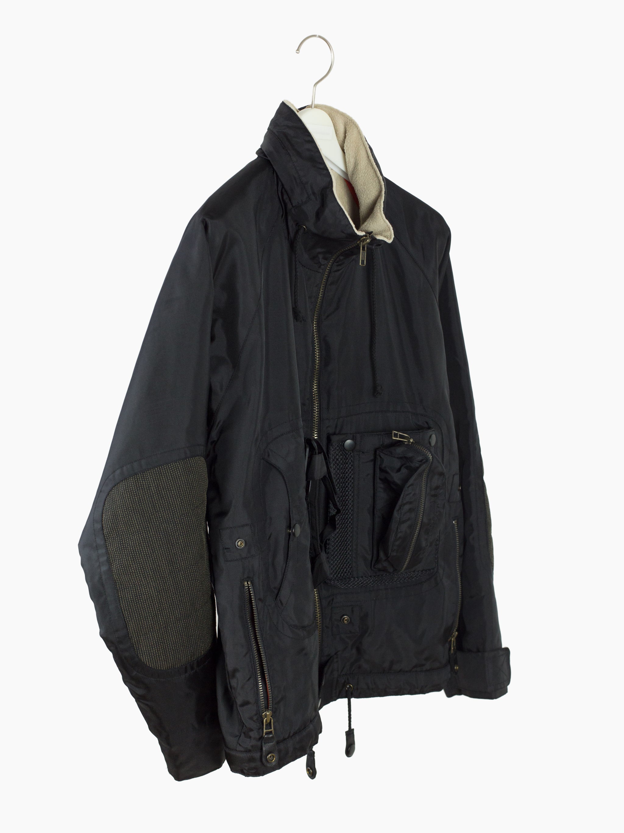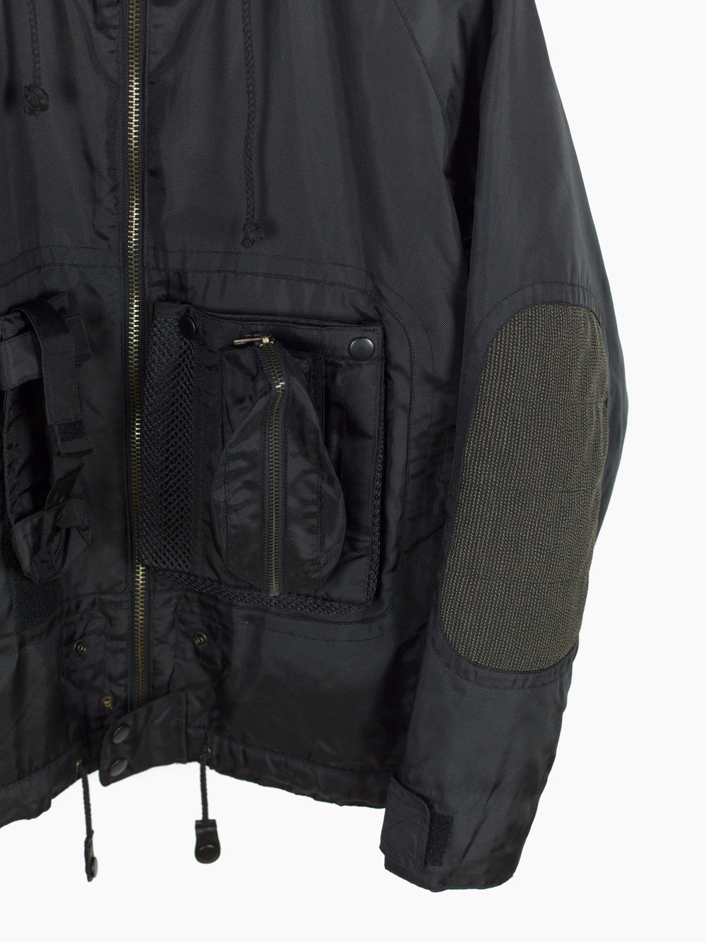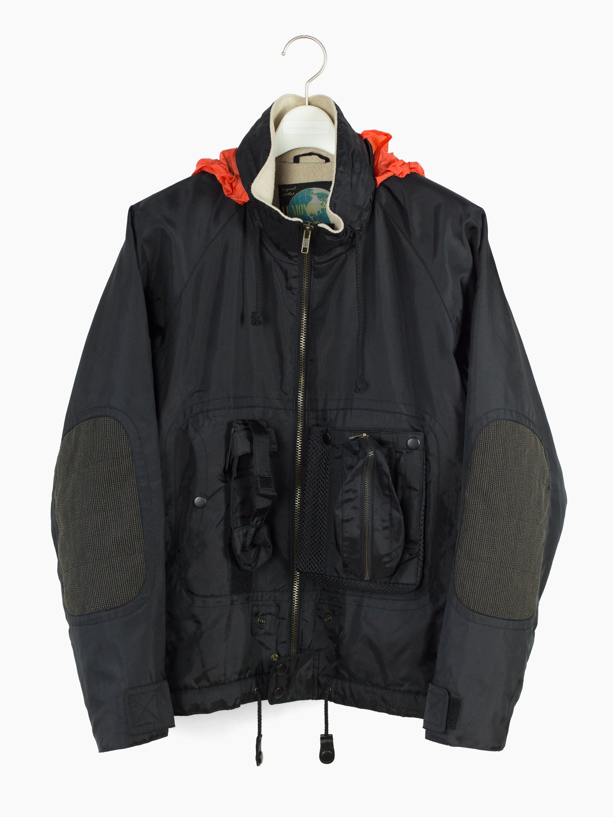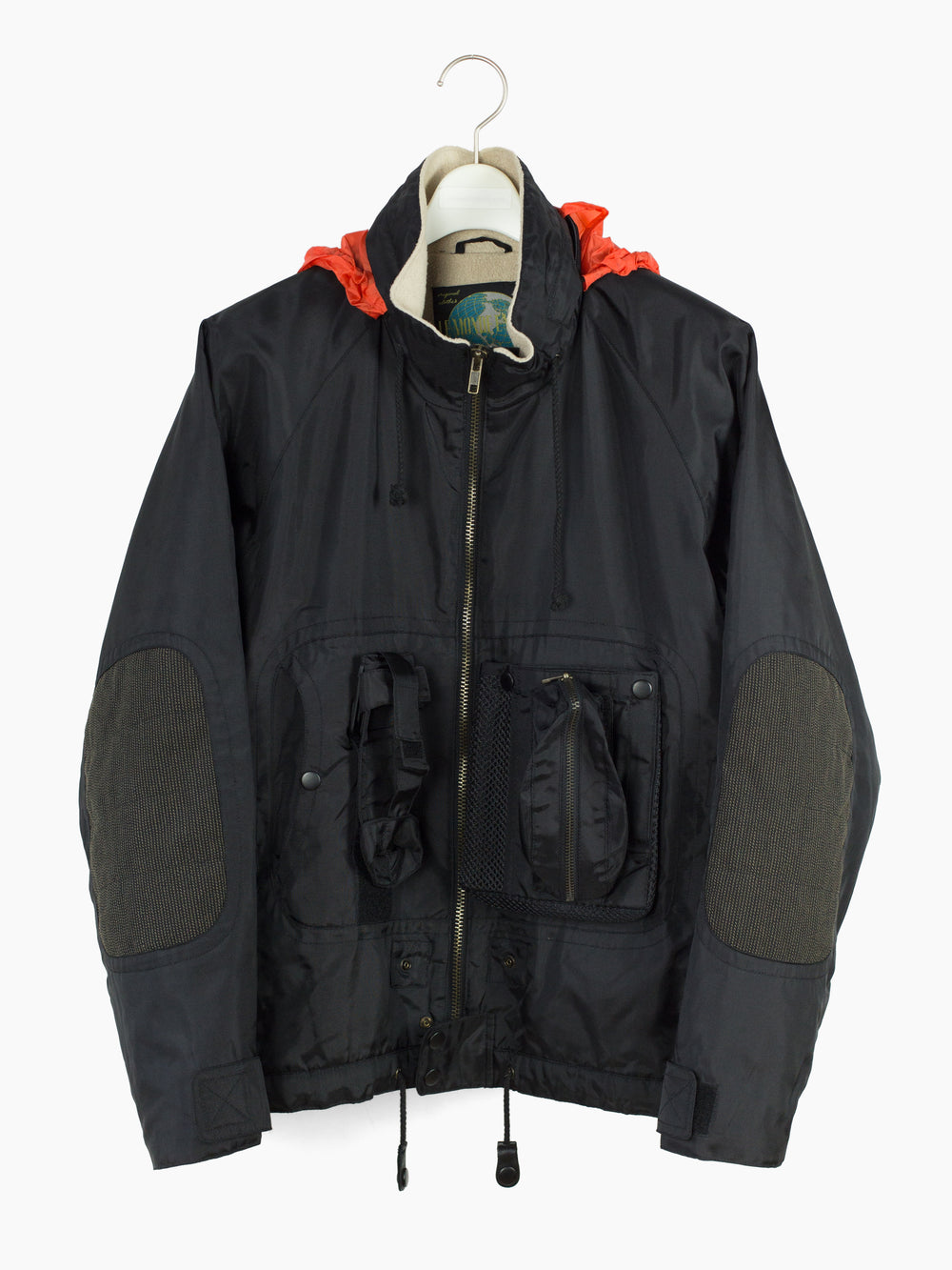 Utility jacket from 90s vintage brand Le Monde Entier. Toothy ballistic nylon outer with asymmetrical fishing pocket array at center chest. Features velcro-openable and removable pockets. Sashiko-esque stitched reinforcement panels at the elbows for a graphic and textural contrast.