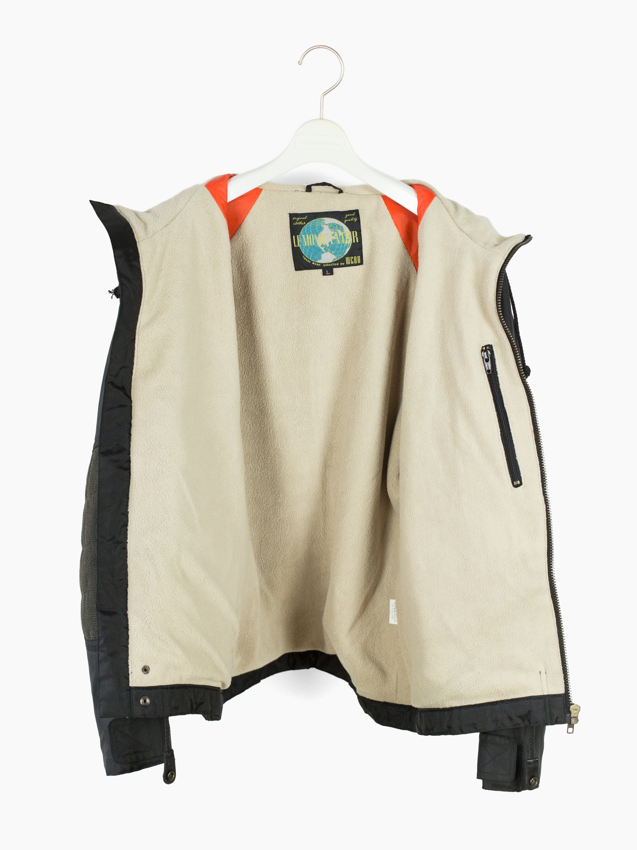 Finished with two zippered waist pockets and center front zip closure. Body is lined in fleece while sleeves are insulated and lined in orange polyester for ease of donning/doffing. Single zippered interior pocket. Contrast orange polyester hood stowable in zippered collar.