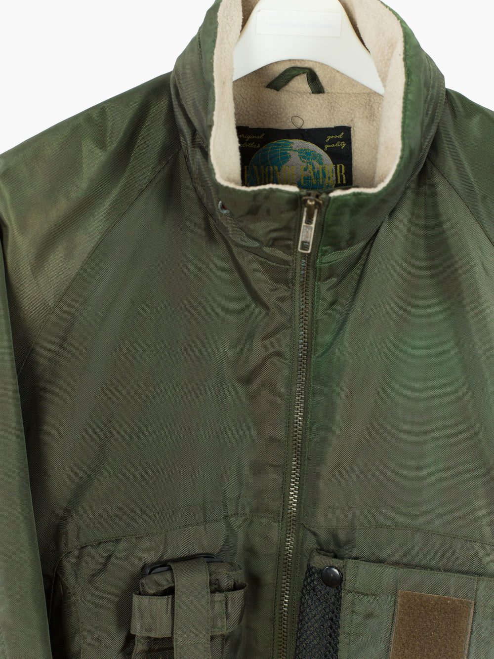 Utility jacket from 90s vintage brand Le Monde Entier. Toothy ballistic nylon outer with asymmetrical fishing pocket array at center chest. Features velcro-openable and removable pockets. Sashiko-esque stitched reinforcement panels at the elbows for a graphic and textural contrast.