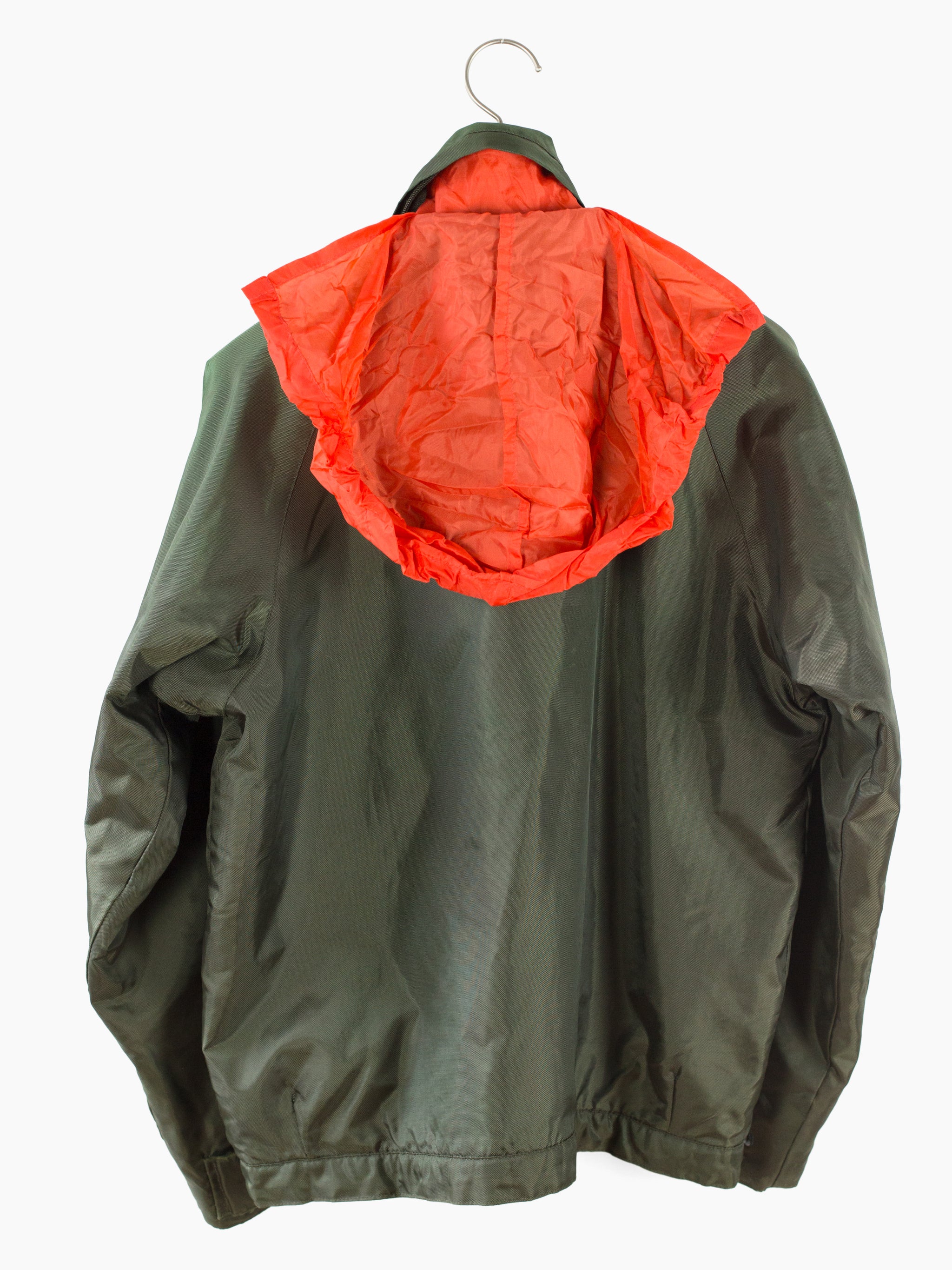 Finished with two zippered waist pockets and center front zip closure. Body is lined in fleece while sleeves are insulated and lined in orange polyester for ease of donning/doffing. Single zippered interior pocket. Contrast orange polyester hood stowable in zippered collar.