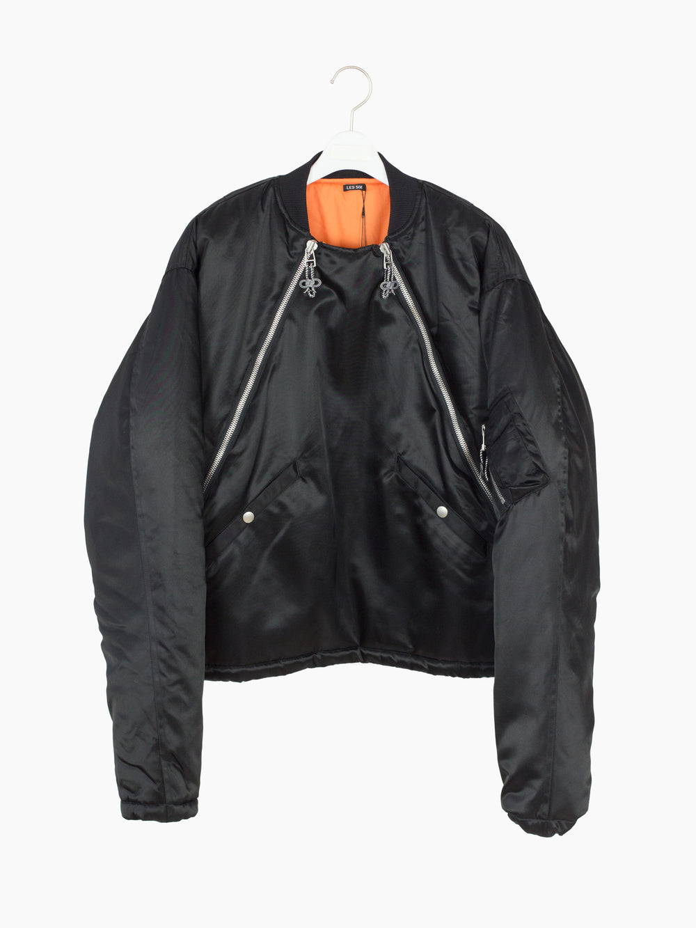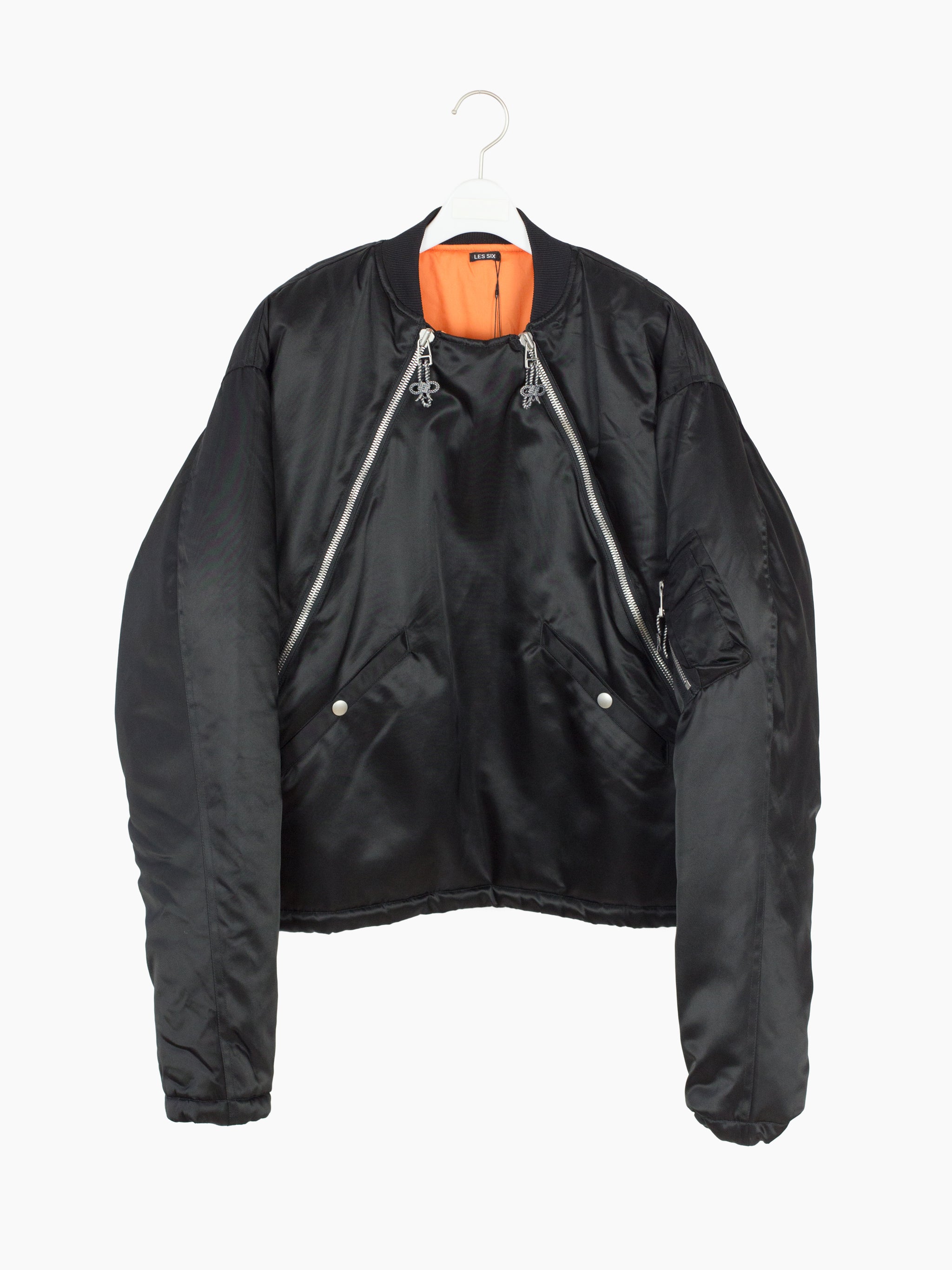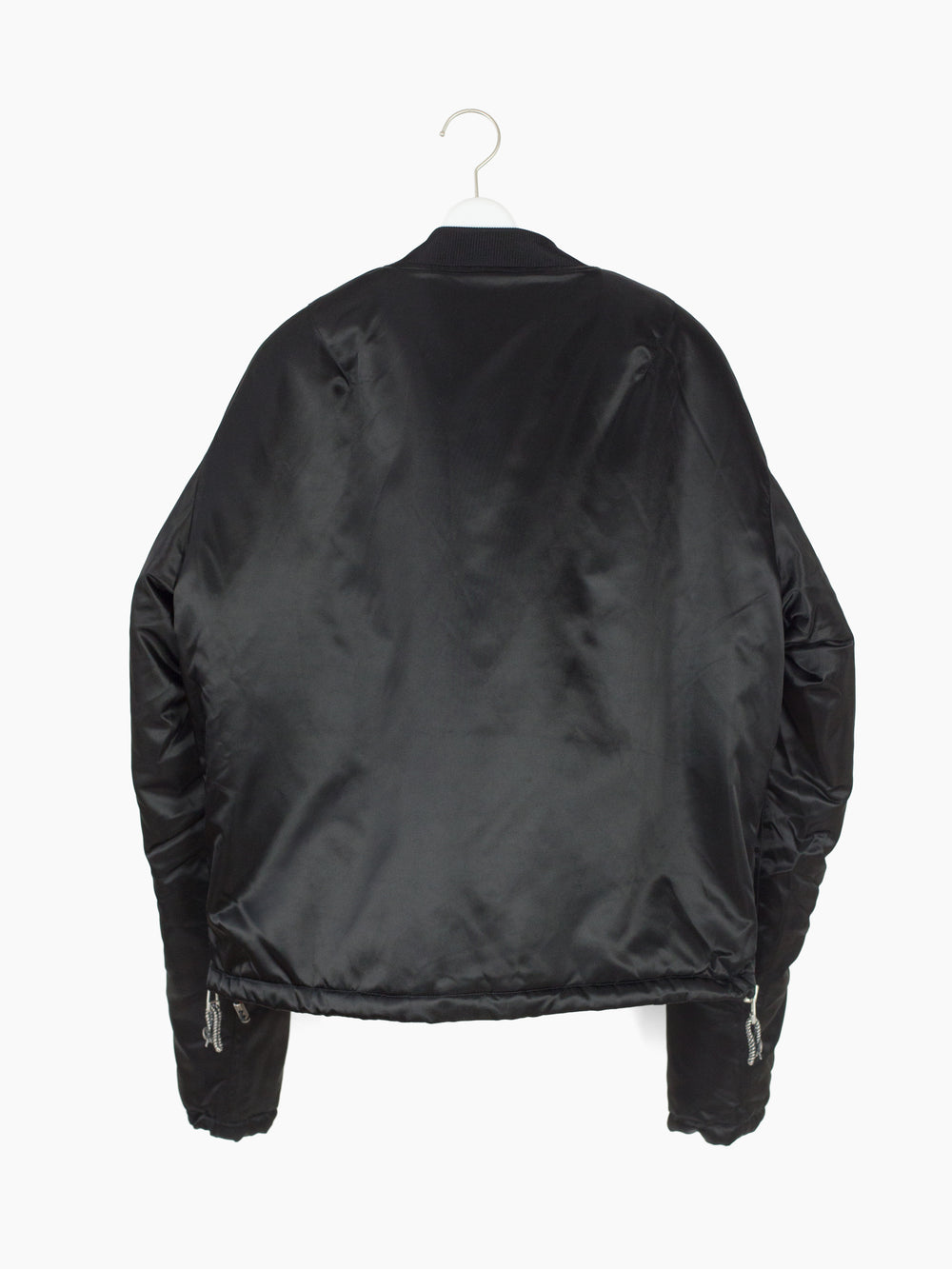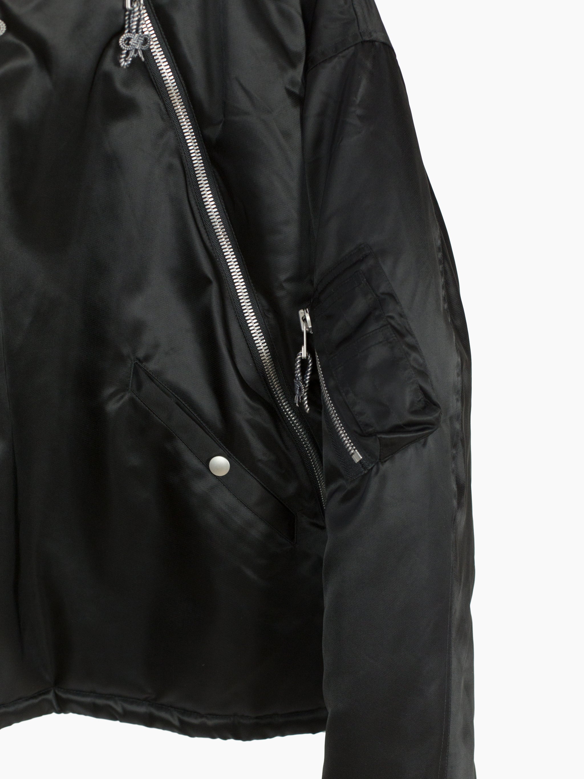 Black nylon satin bomber jacket that revisits the classic MA-1. Here done with two oversized diagonal two-way zip closure that creates a protective, pullover-style appearance. The design omits ribbing at cuffs and hem, opting for shockcord toggle cinches to create a stripped back, brutalist feel highlighting the heavy nylon face fabric. Traditional MA-1 orange lining is cut in superfine shirting weight cotton for improved next to skin comfort. Finished with two snap-closed front waist pockets and single zip-closed ma-1 sleeve pocket at wearer's left.