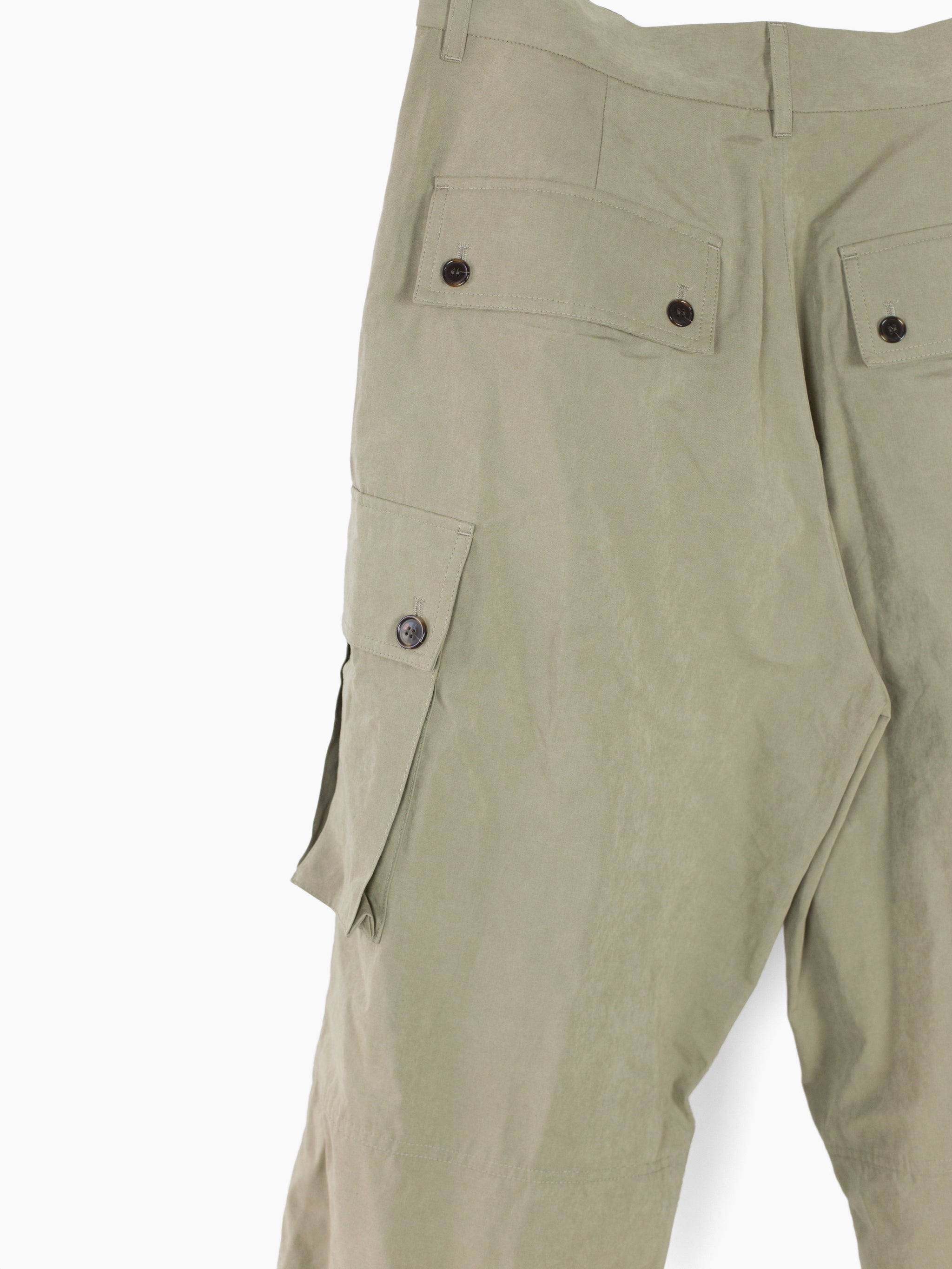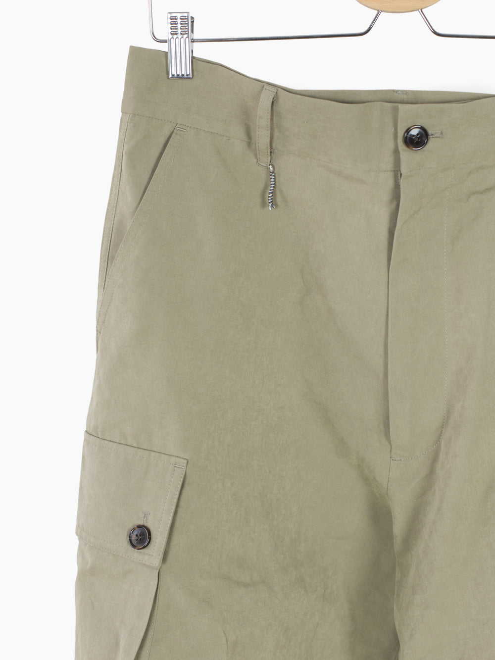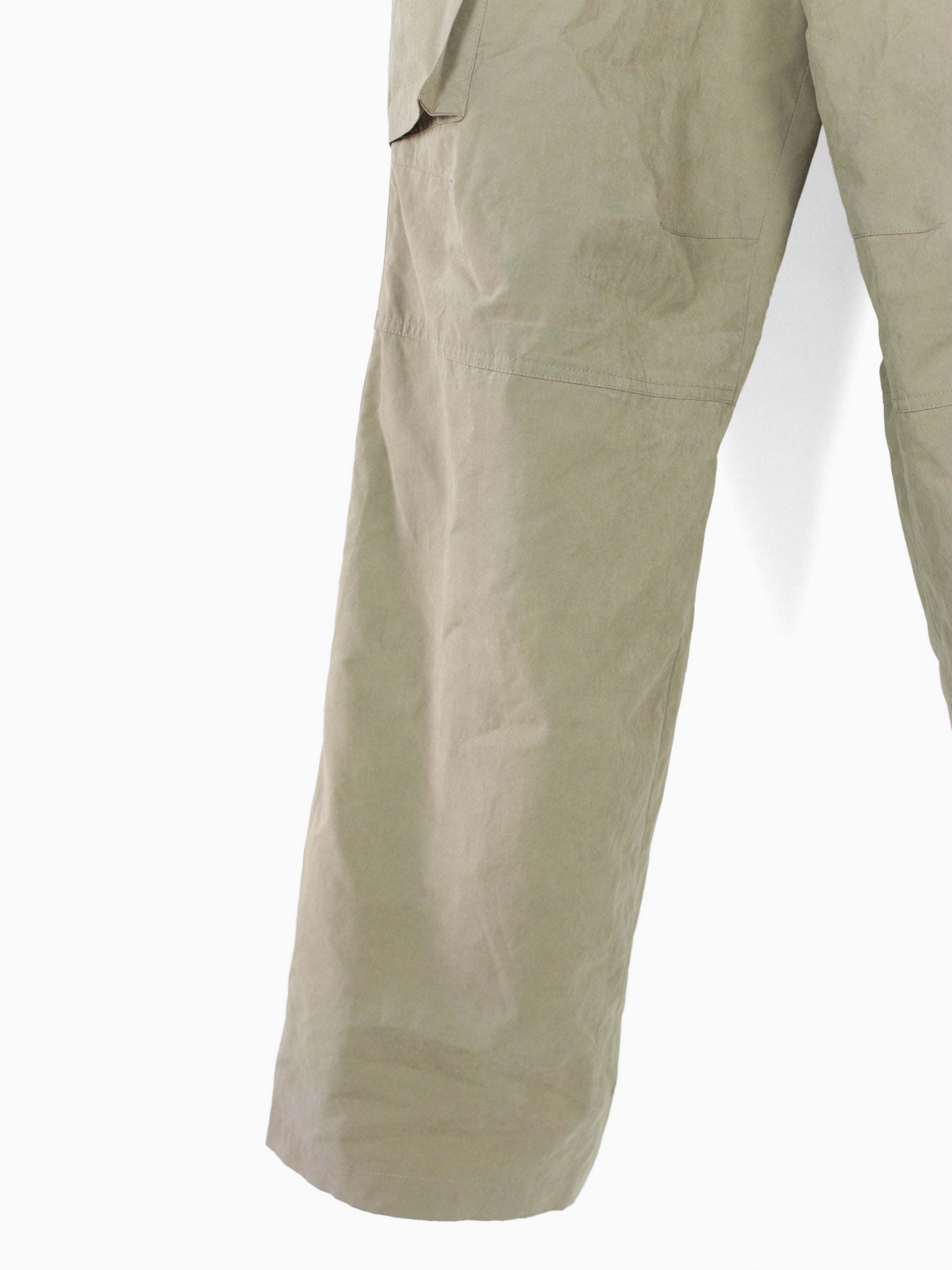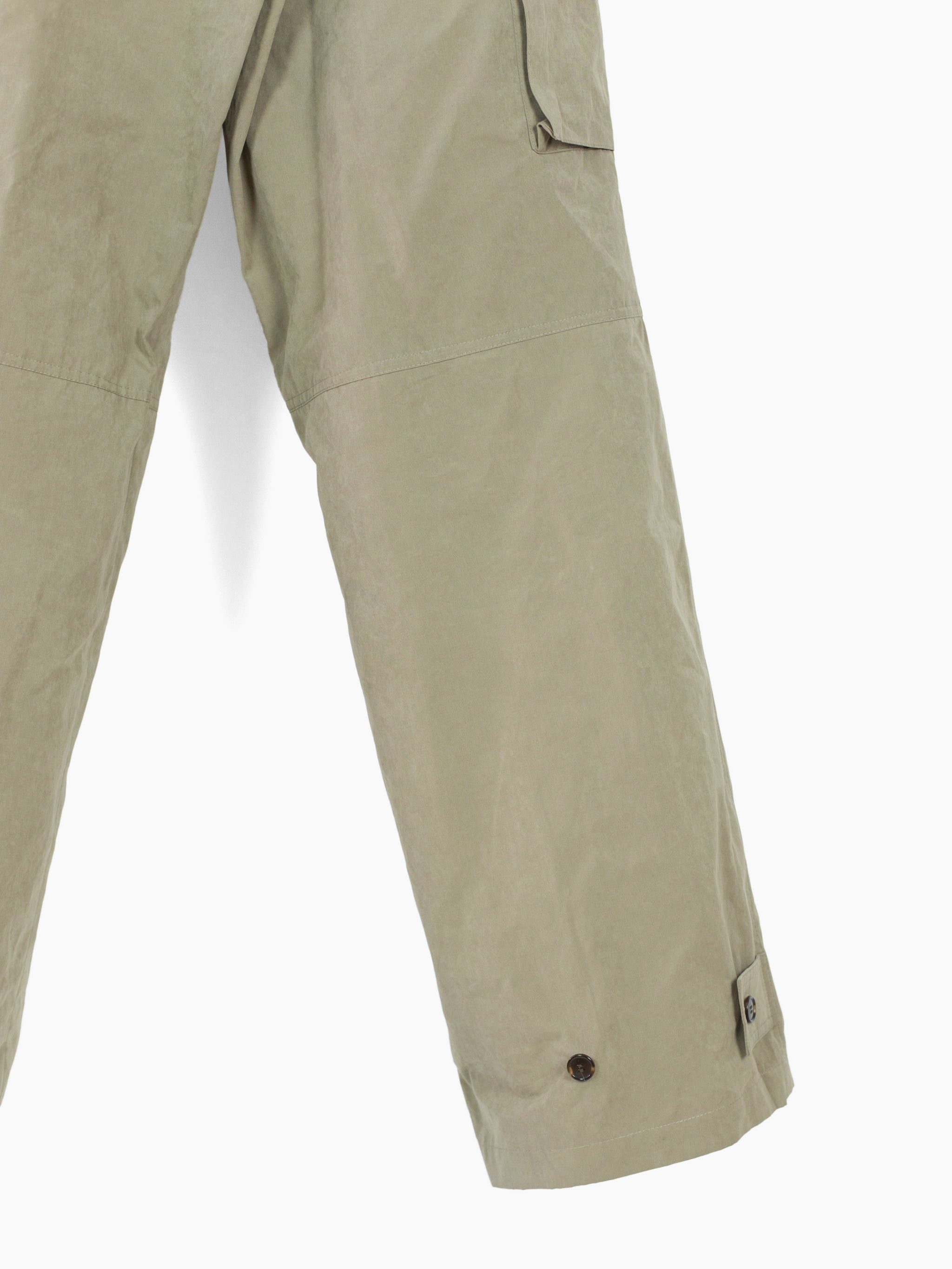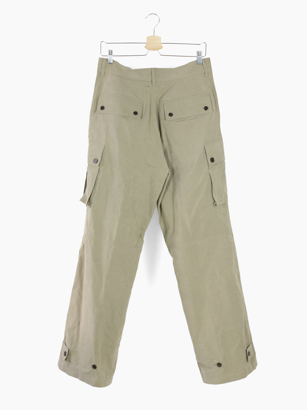 Relaxed fit cargo pants in poly/cotton/nylon blend plainweave with a waxed finish for structure, shape, and water repellency. Single dart construction at knees for a subtlely articulated, bent leg look and lateral thigh flap-closed gusseted cargo pockets in an asymmetrical configuration (2 pockets on wearer's left leg, single pocket on wearer's right leg). Flap and button lower leg cinch tab allows for both straight leg and balloon styling. Finished with double button waist closure and zipper fly, seasonal signature sterling silver braided charm at wearer's right front belt loop, two flash front pockets, and two flap-closed back pockets.