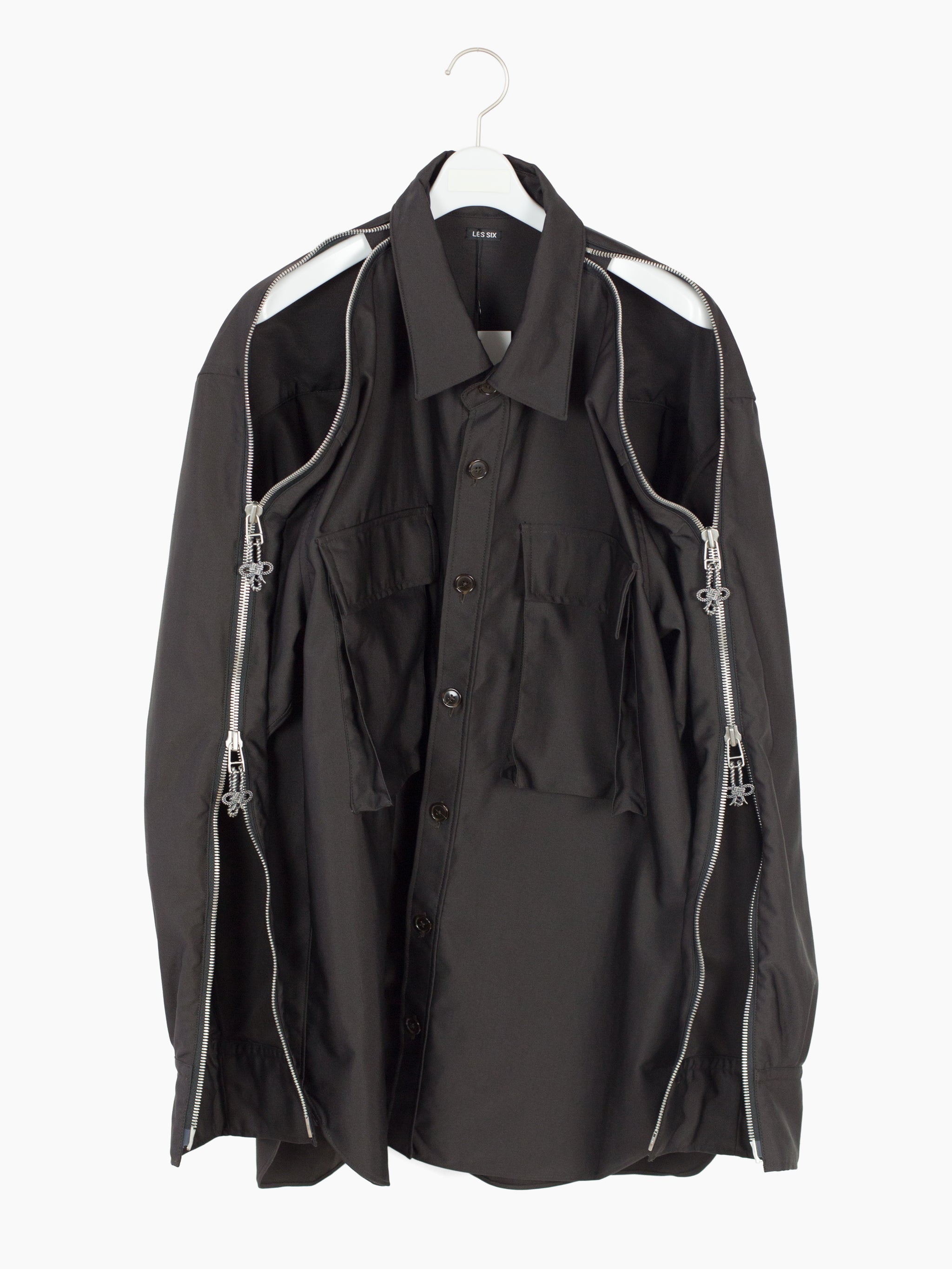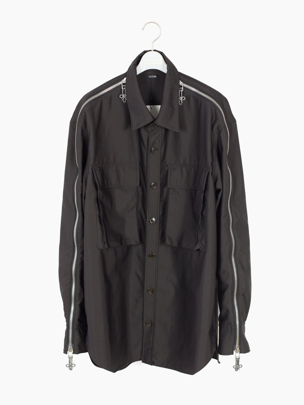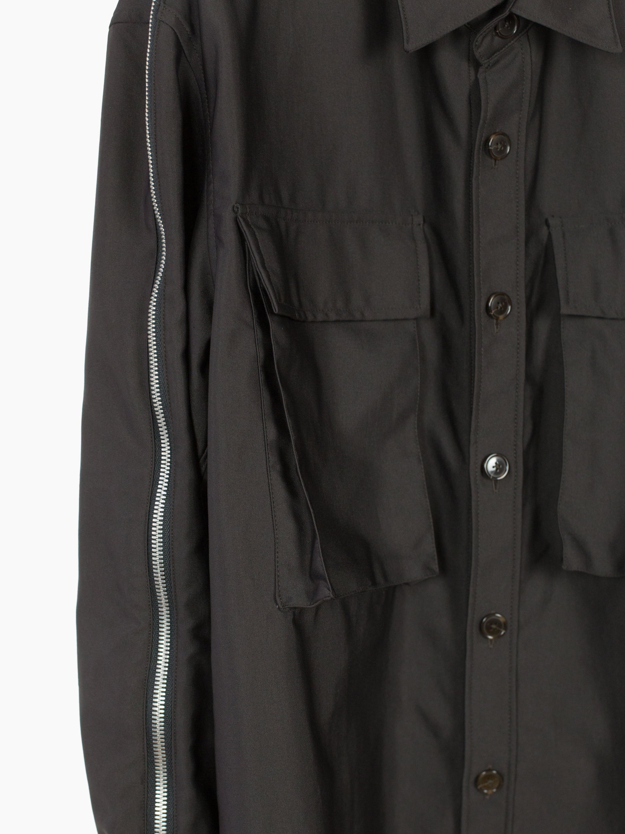 Oversize HBT Military-style shirt with statement chunky double-zipped sleeve detail which allows for a broad range of expressive styling. Open from neckline to wear as a vest or to show layers worn underneath or zip open from the cuff to wear with flared sleeves/as a cape. Cut in a doubleweave nylon/cotton blend with workwear-leaning satin outer finish and brushed interior for next-to-skin comfort. Two cavernous gusseted square pockets at the chest provide ample storage. Finished with oversized button front closure, removable 925 sterling silver braided butterfly knotted zipper pulls, sizeable point collar, and double pleated back yoke construction.