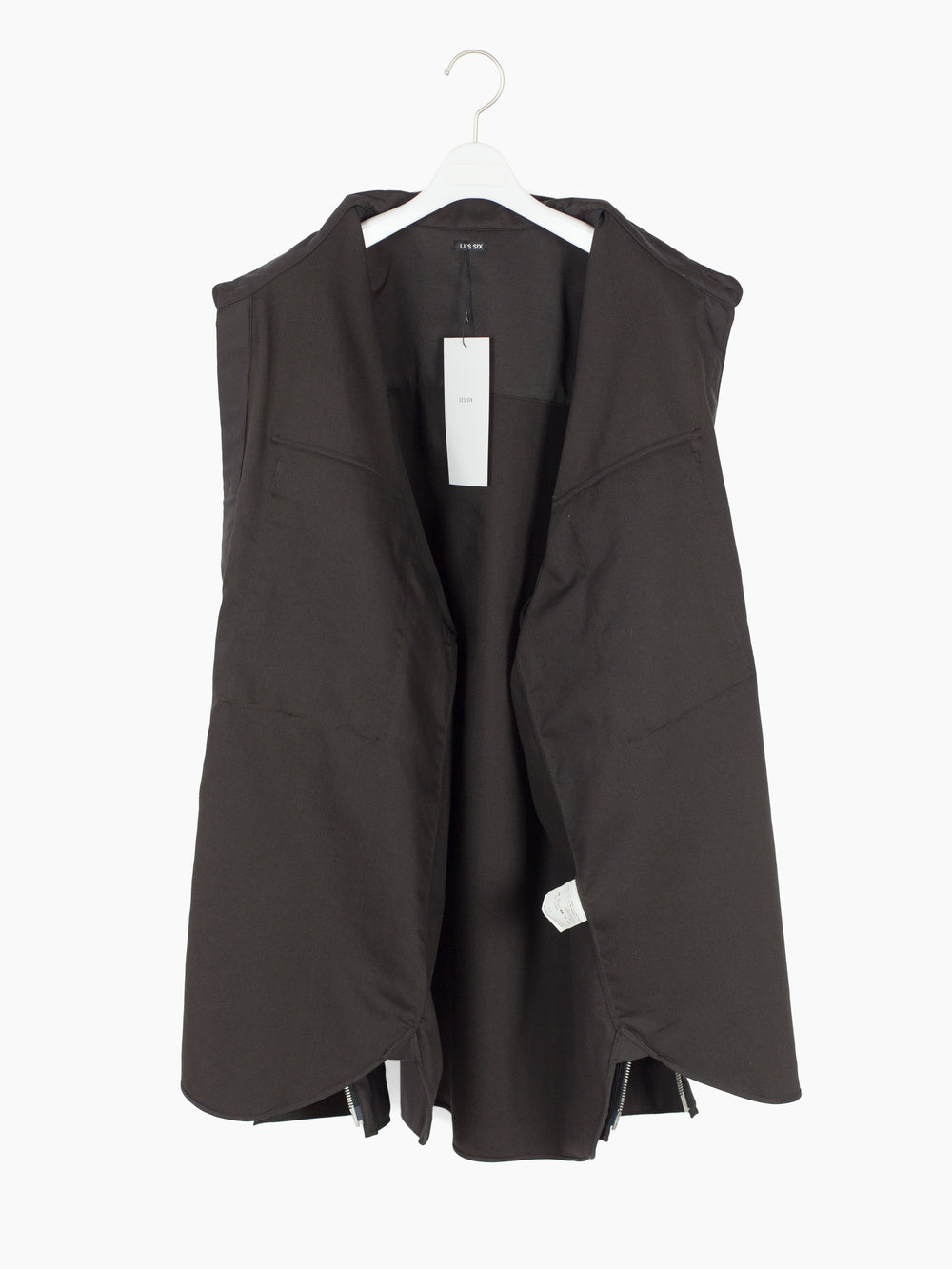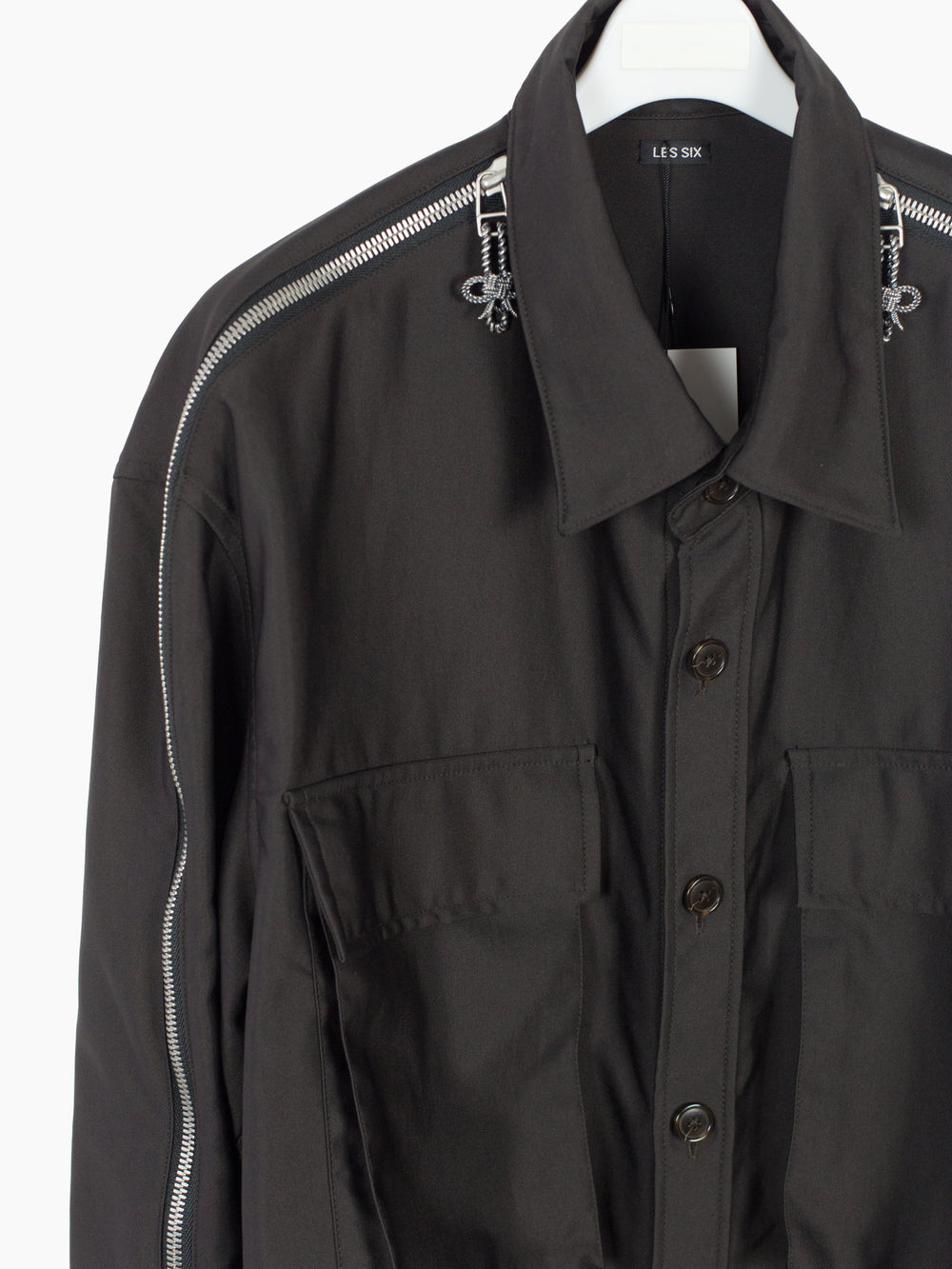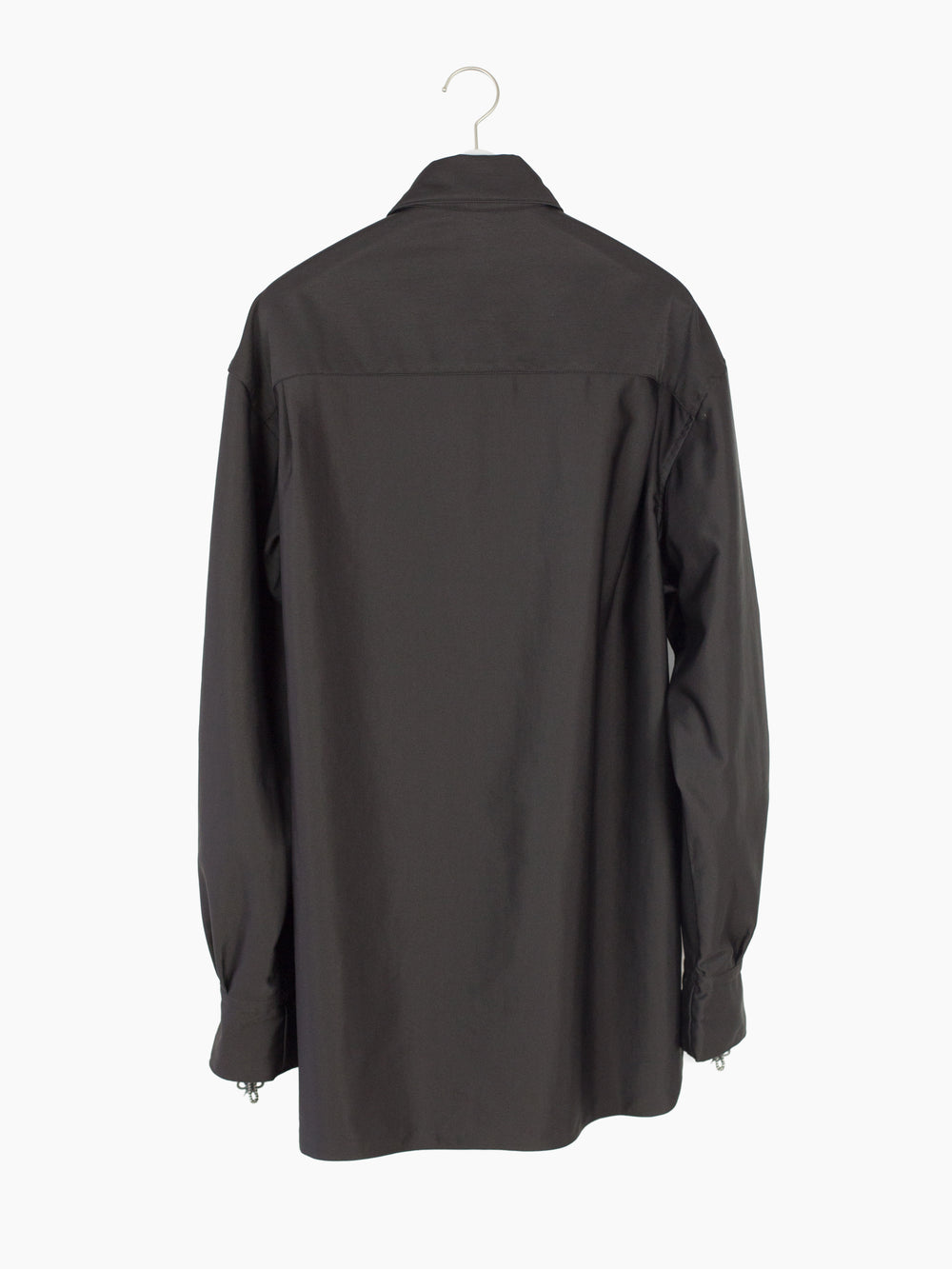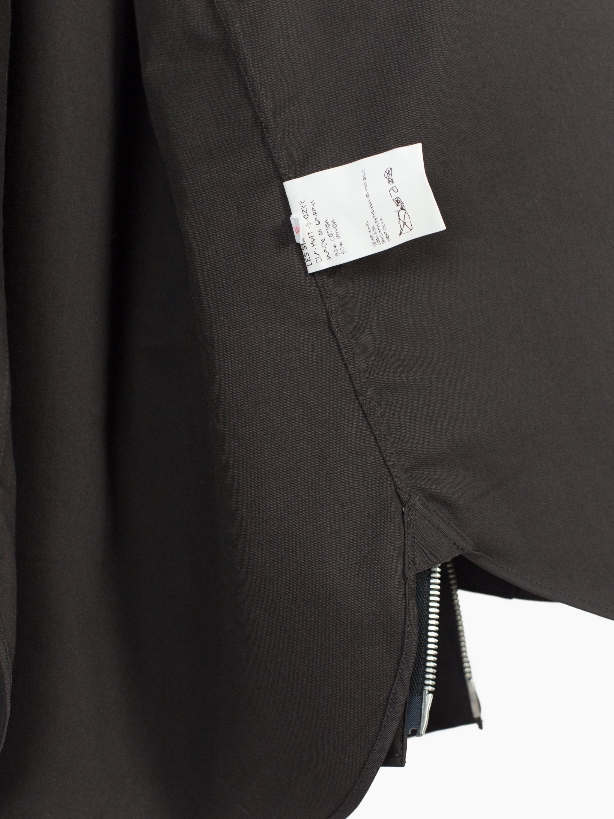 Oversize HBT Military-style shirt with statement chunky double-zipped sleeve detail which allows for a broad range of expressive styling. Open from neckline to wear as a vest or to show layers worn underneath or zip open from the cuff to wear with flared sleeves/as a cape. Cut in a doubleweave nylon/cotton blend with workwear-leaning satin outer finish and brushed interior for next-to-skin comfort. Two cavernous gusseted square pockets at the chest provide ample storage. Finished with oversized button front closure, removable 925 sterling silver braided butterfly knotted zipper pulls, sizeable point collar, and double pleated back yoke construction.