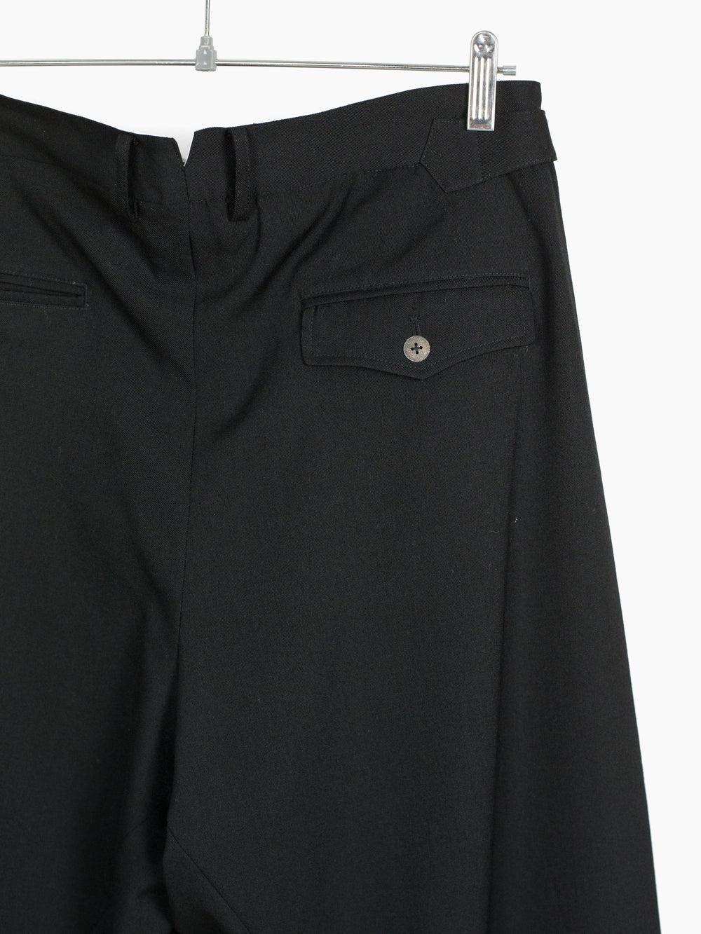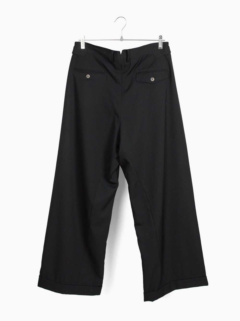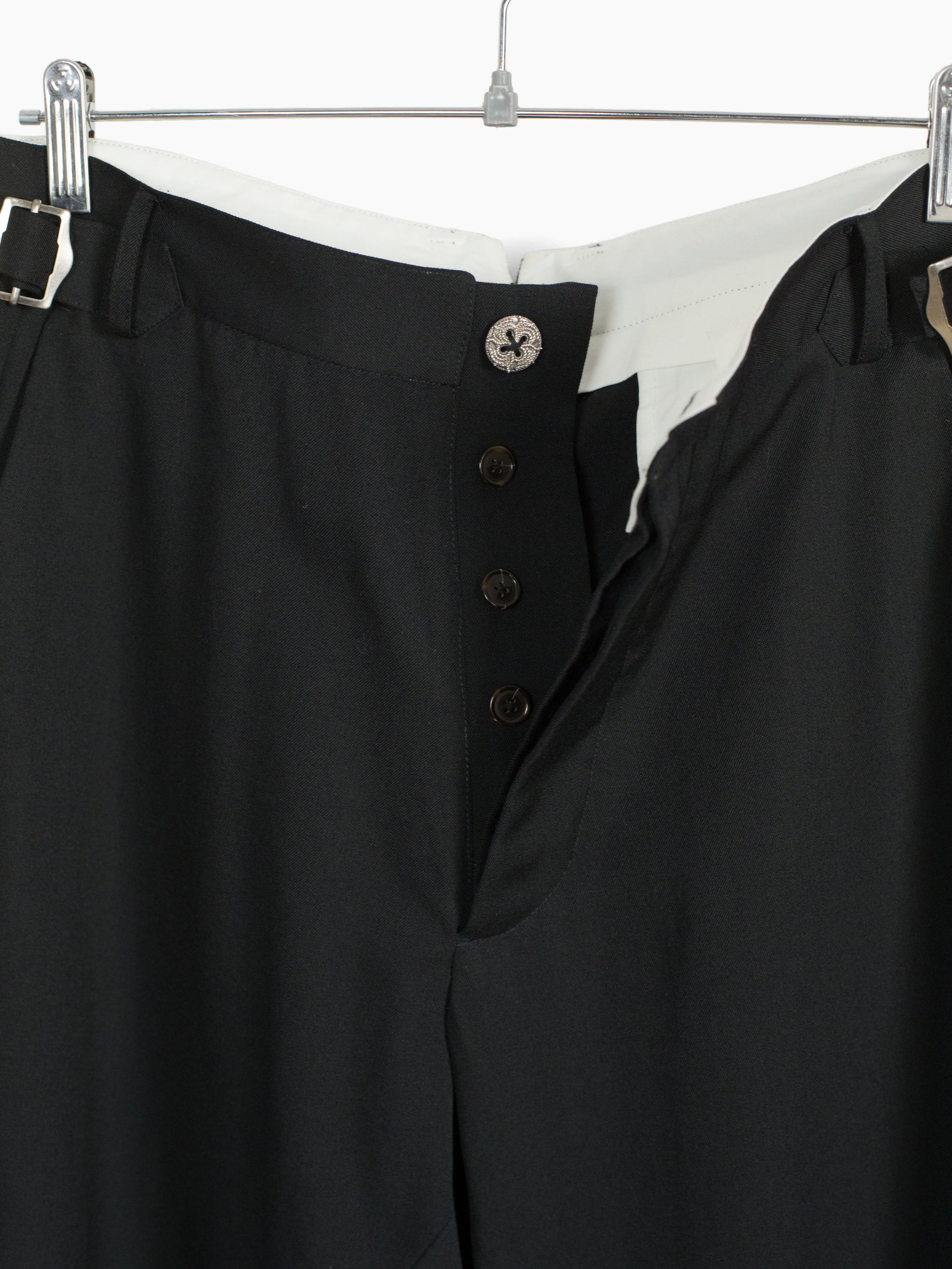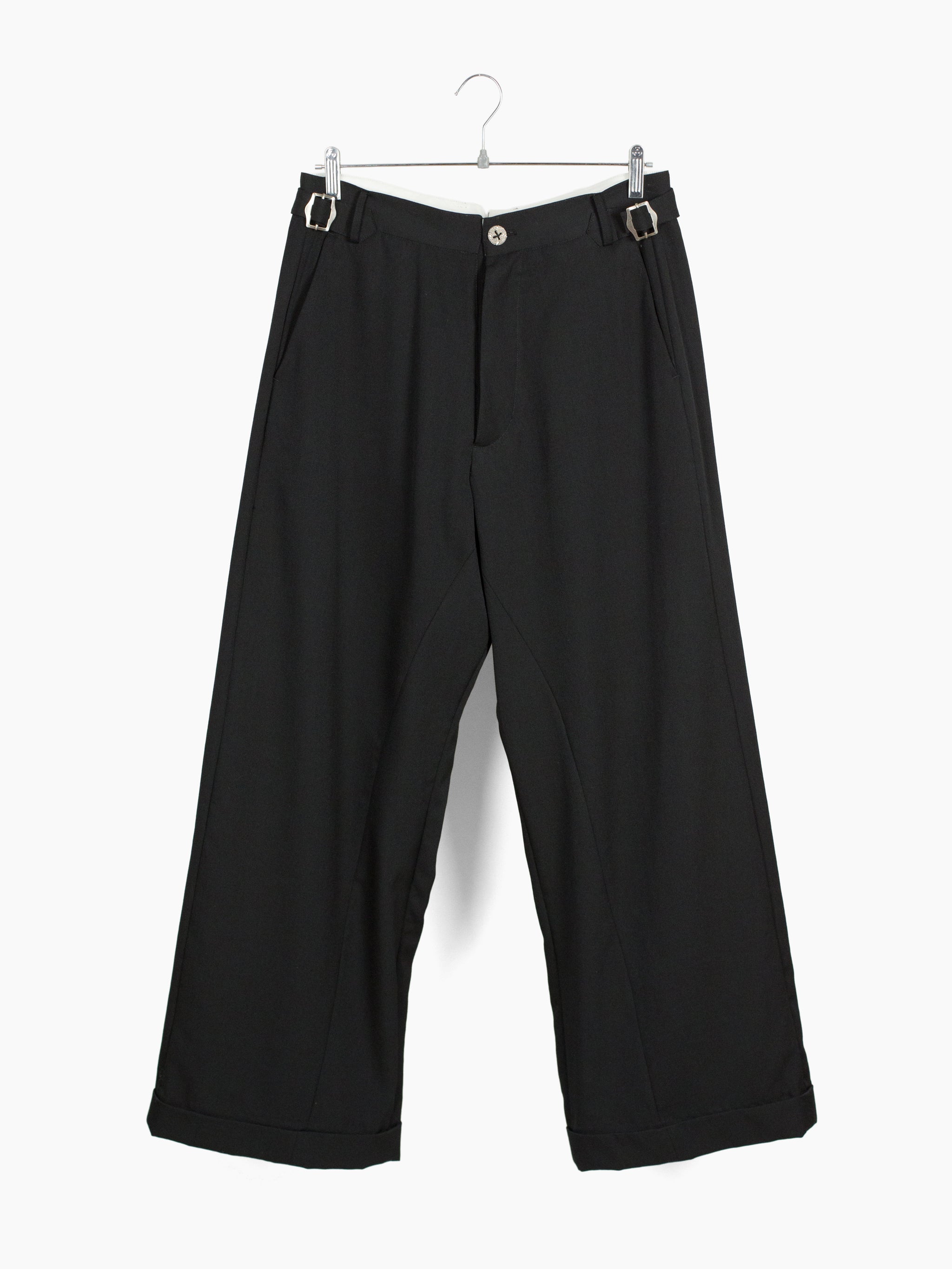 Black wool gabardine tailored trouser, cut with additional inner panels and multi-layered folded hem to mimic modifications made to vintage garments. Waist button and back pocket buttons are cast in detail-rich 925 sterling silver to bring an antique atmosphere. They sit in contrast against modern, oversized hardware at the waist adjust, the end product being a garment whose history and life cycle could be a beautiful mystery had it not been Les Six.
