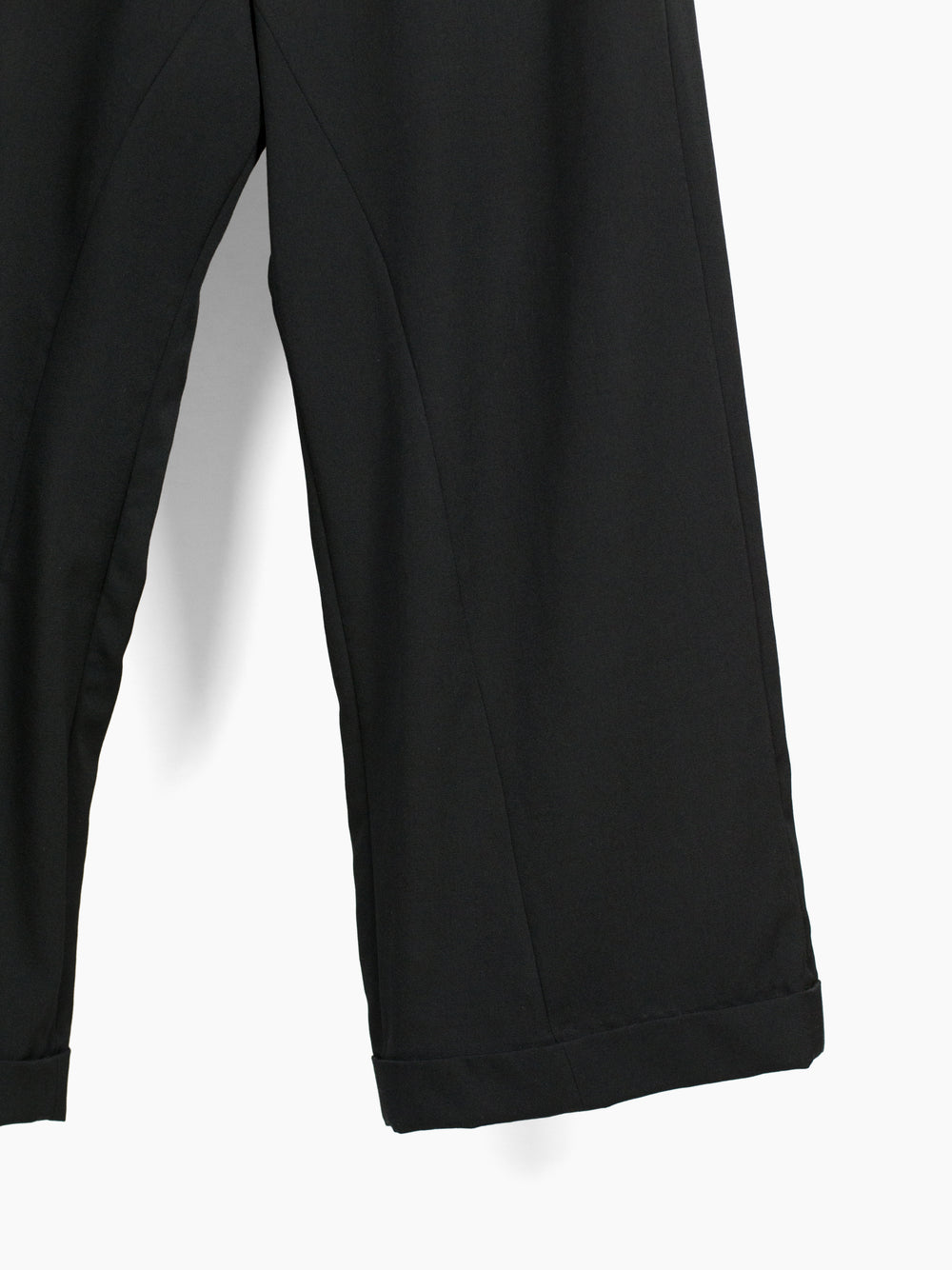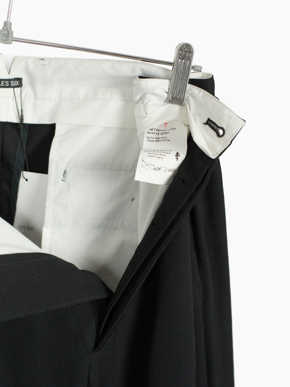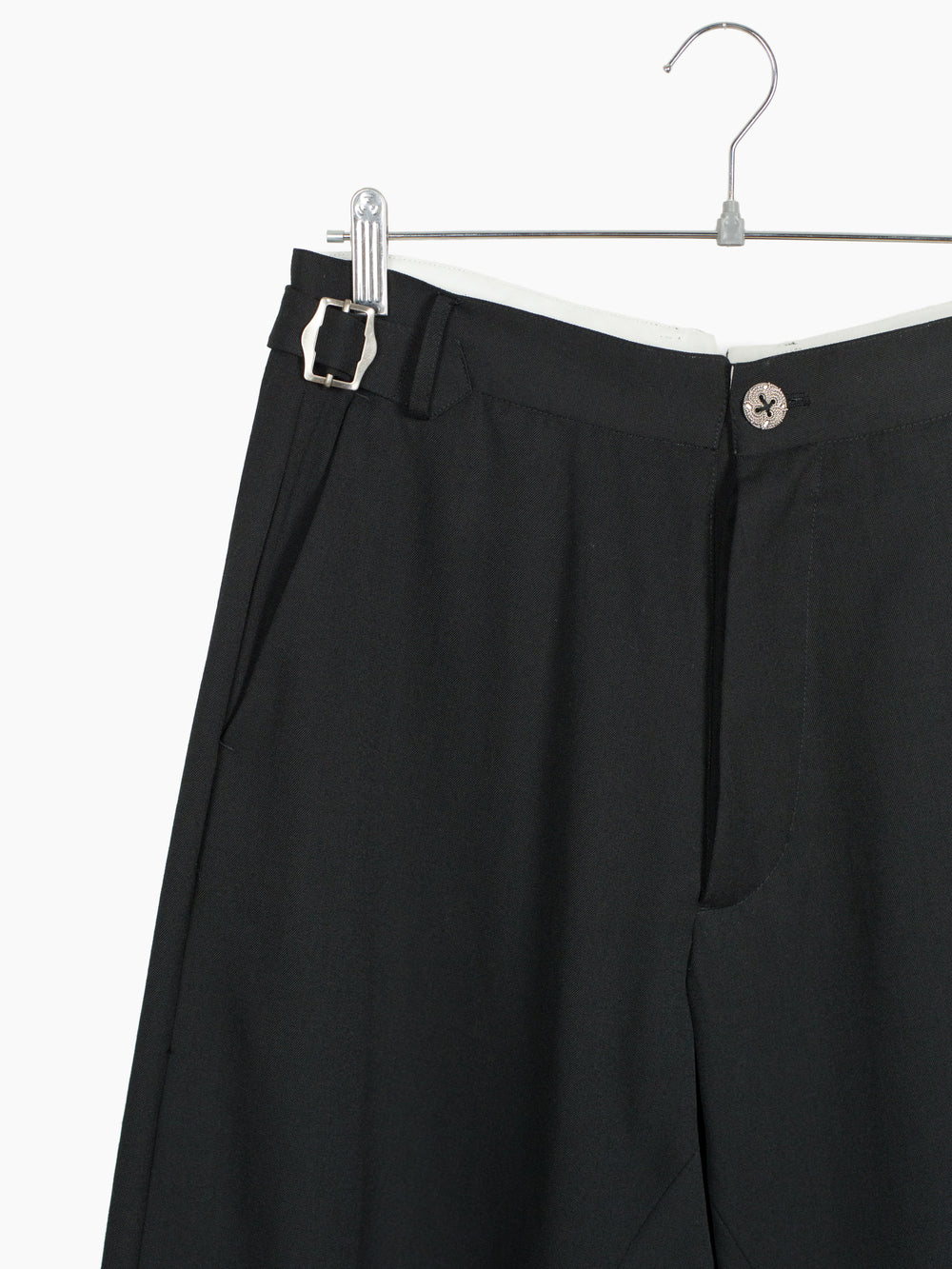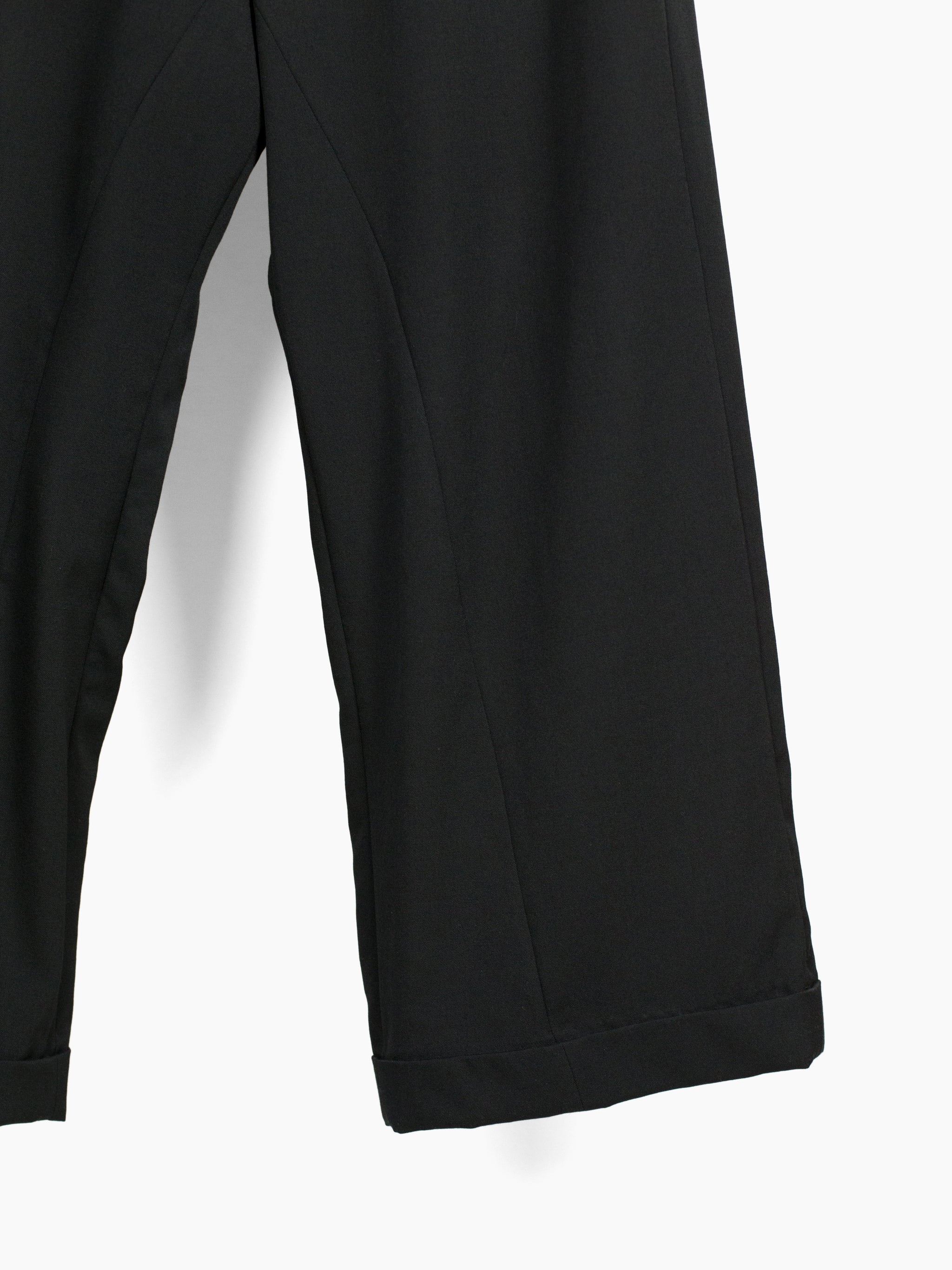 Black wool gabardine tailored trouser, cut with additional inner panels and multi-layered folded hem to mimic modifications made to vintage garments. Waist button and back pocket buttons are cast in detail-rich 925 sterling silver to bring an antique atmosphere. They sit in contrast against modern, oversized hardware at the waist adjust, the end product being a garment whose history and life cycle could be a beautiful mystery had it not been Les Six.