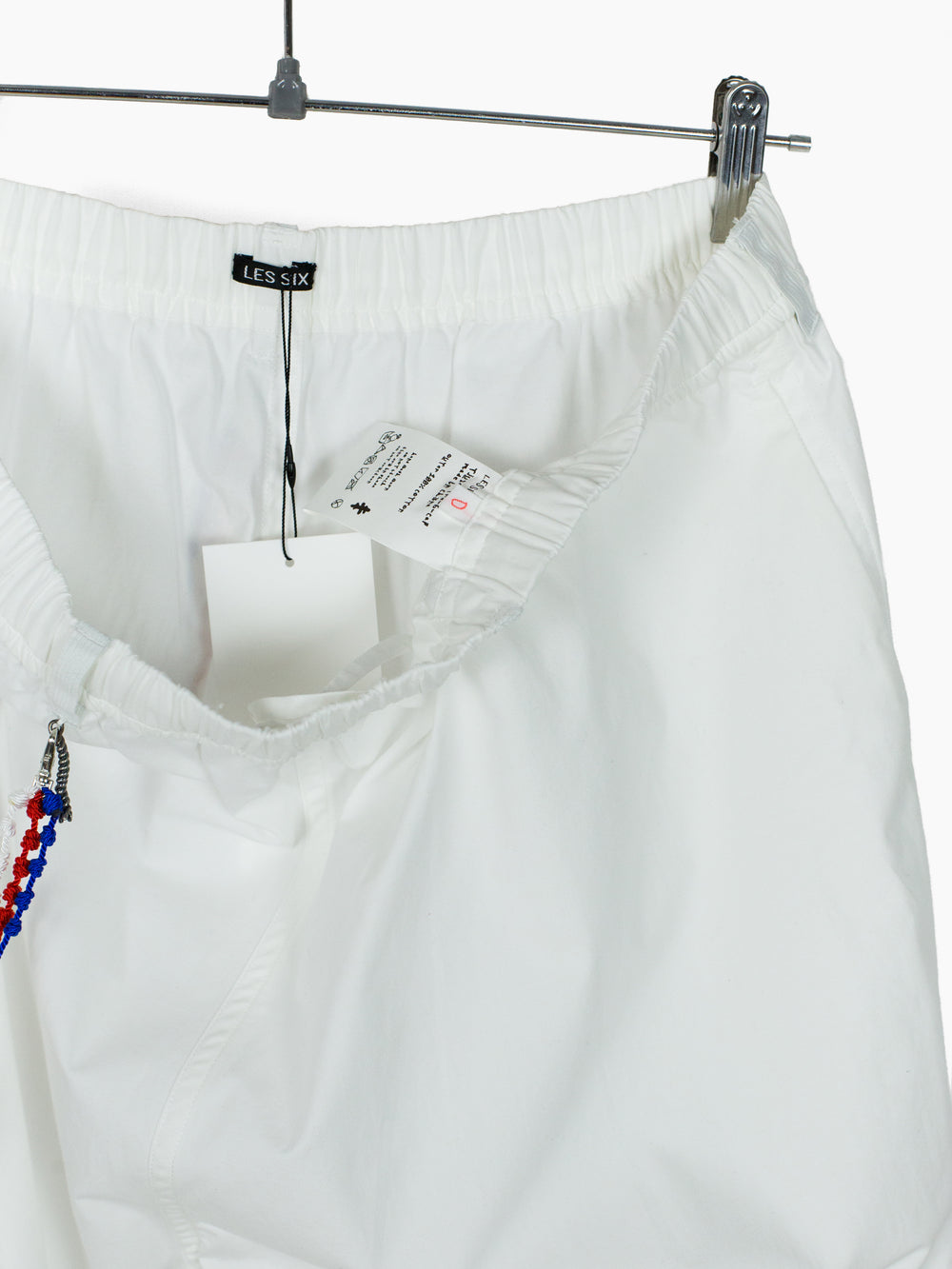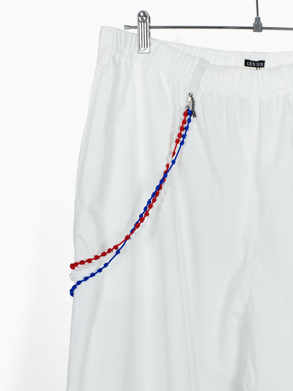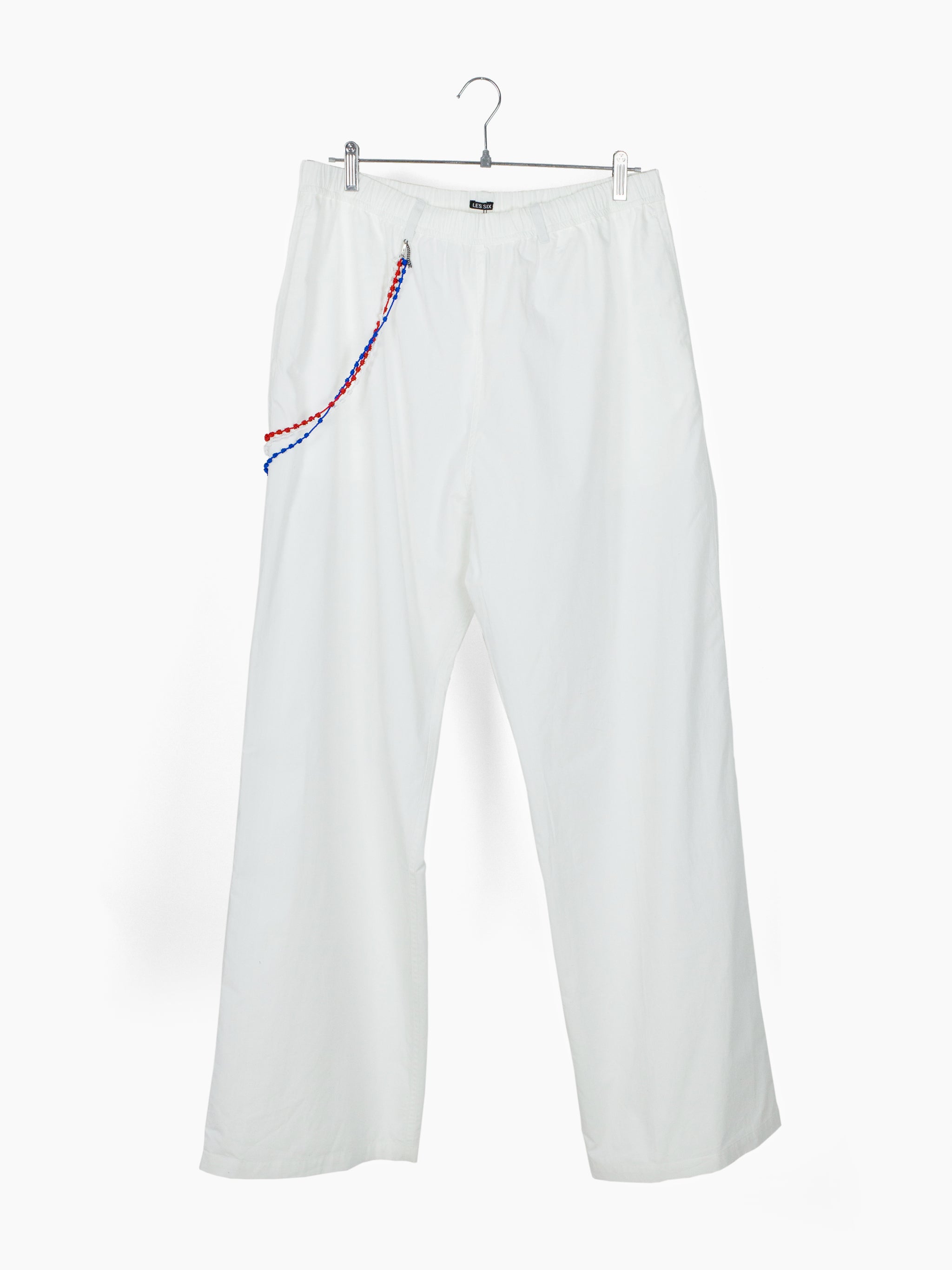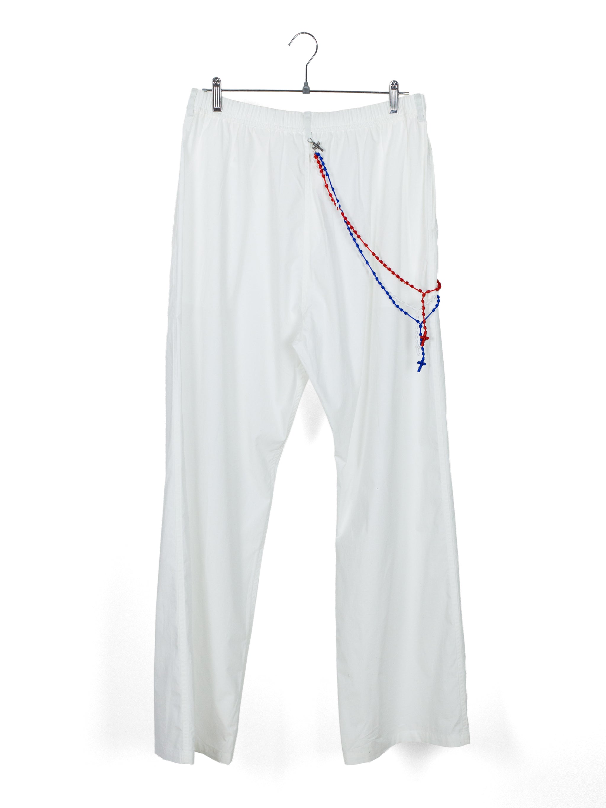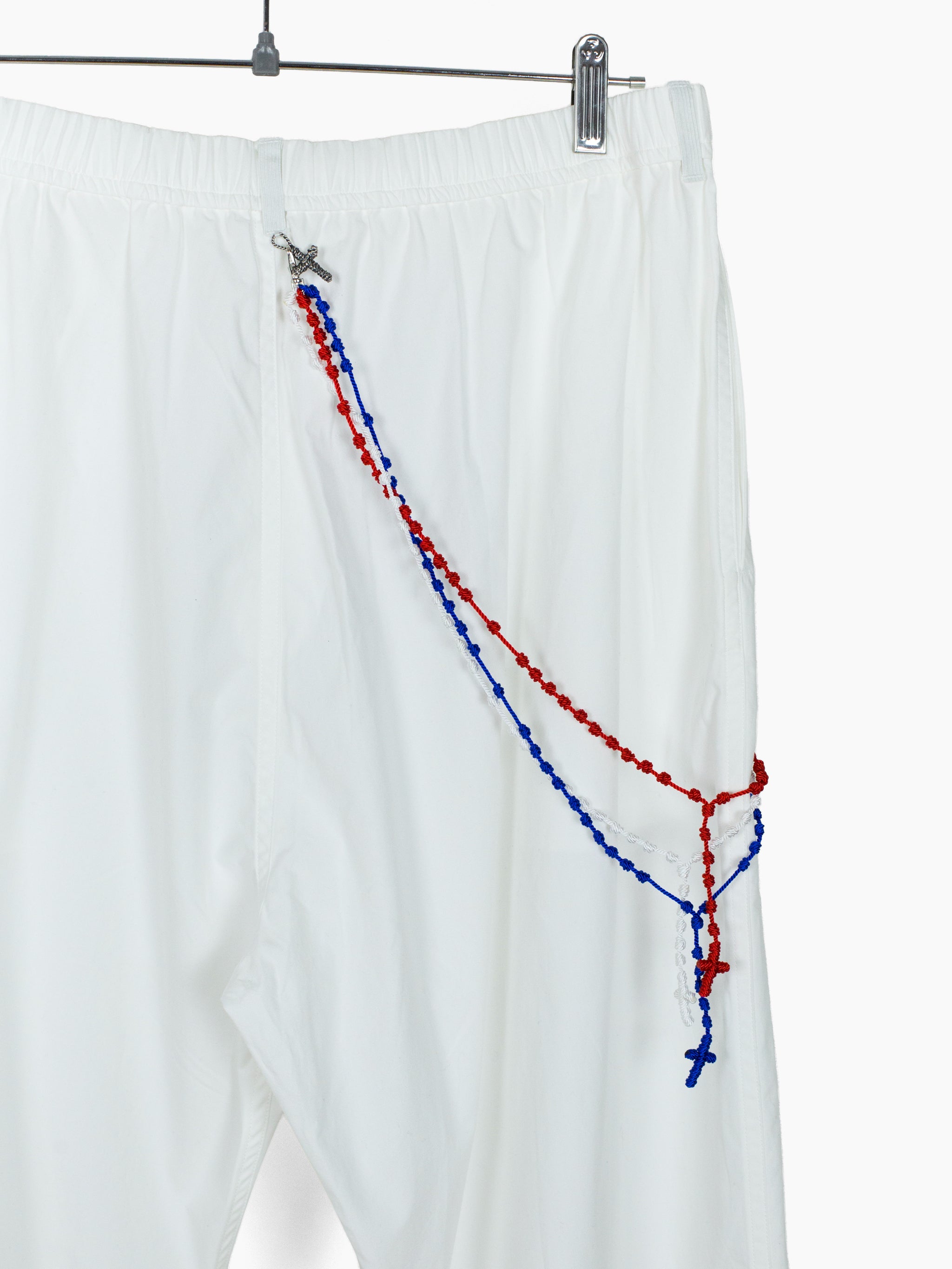 Cotton poplin easy pants with American Flag-palette knotted Santeria cross chain. Features Les Six signature .925 Sterling Silver braided tassel and cross charms at front and back waist respectively.