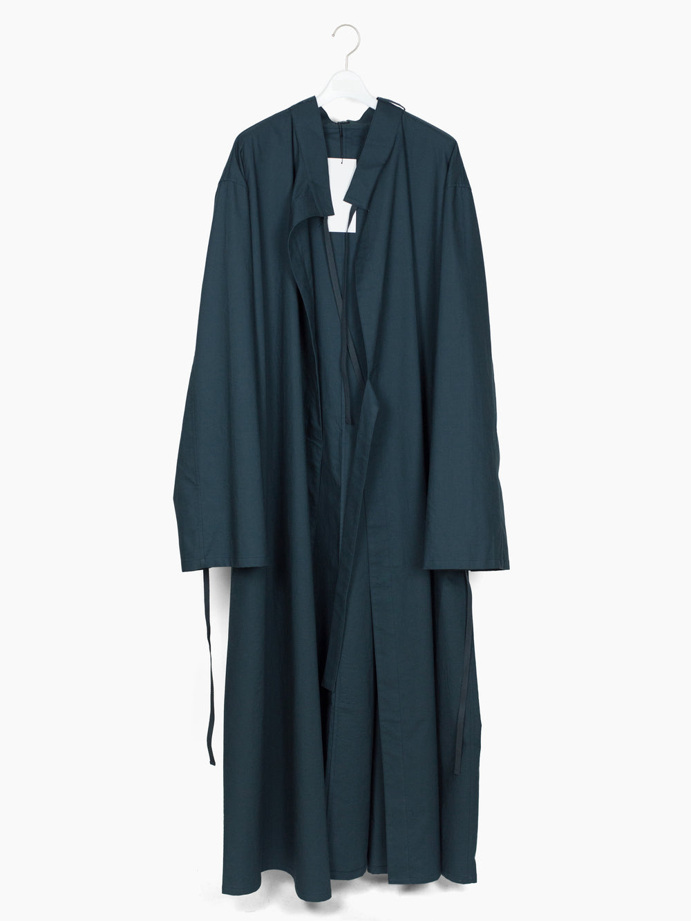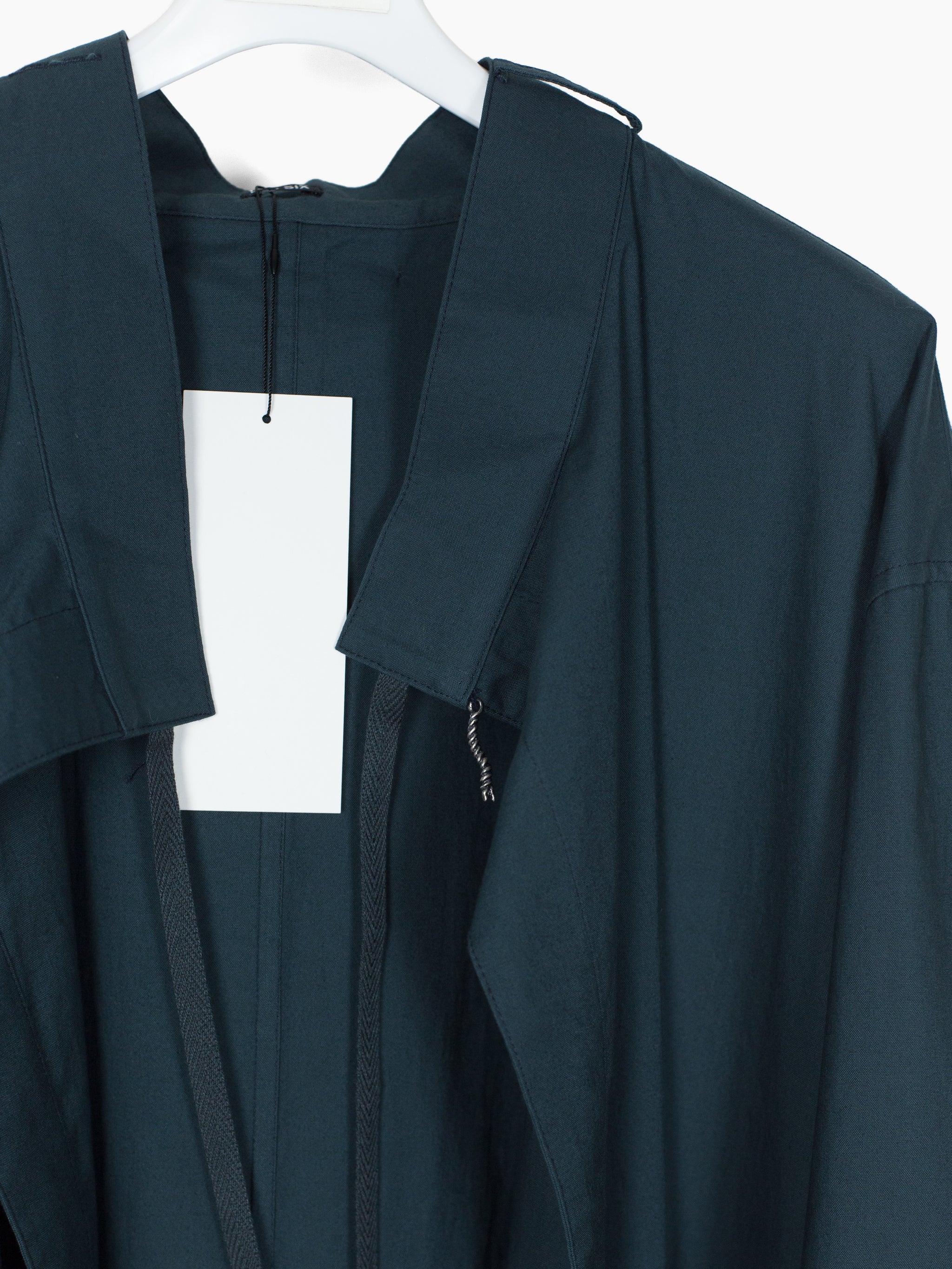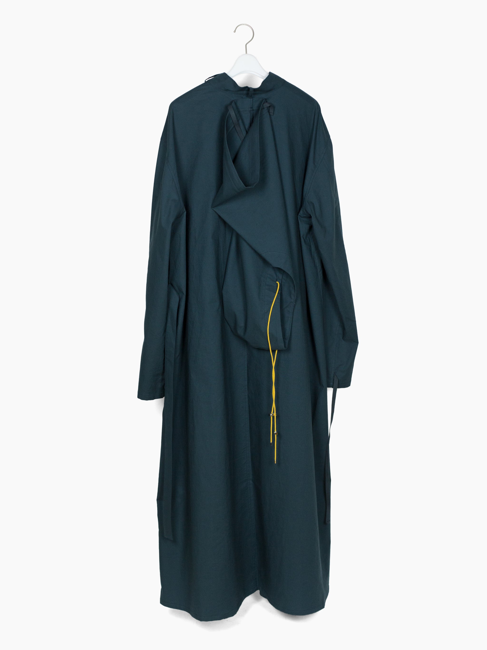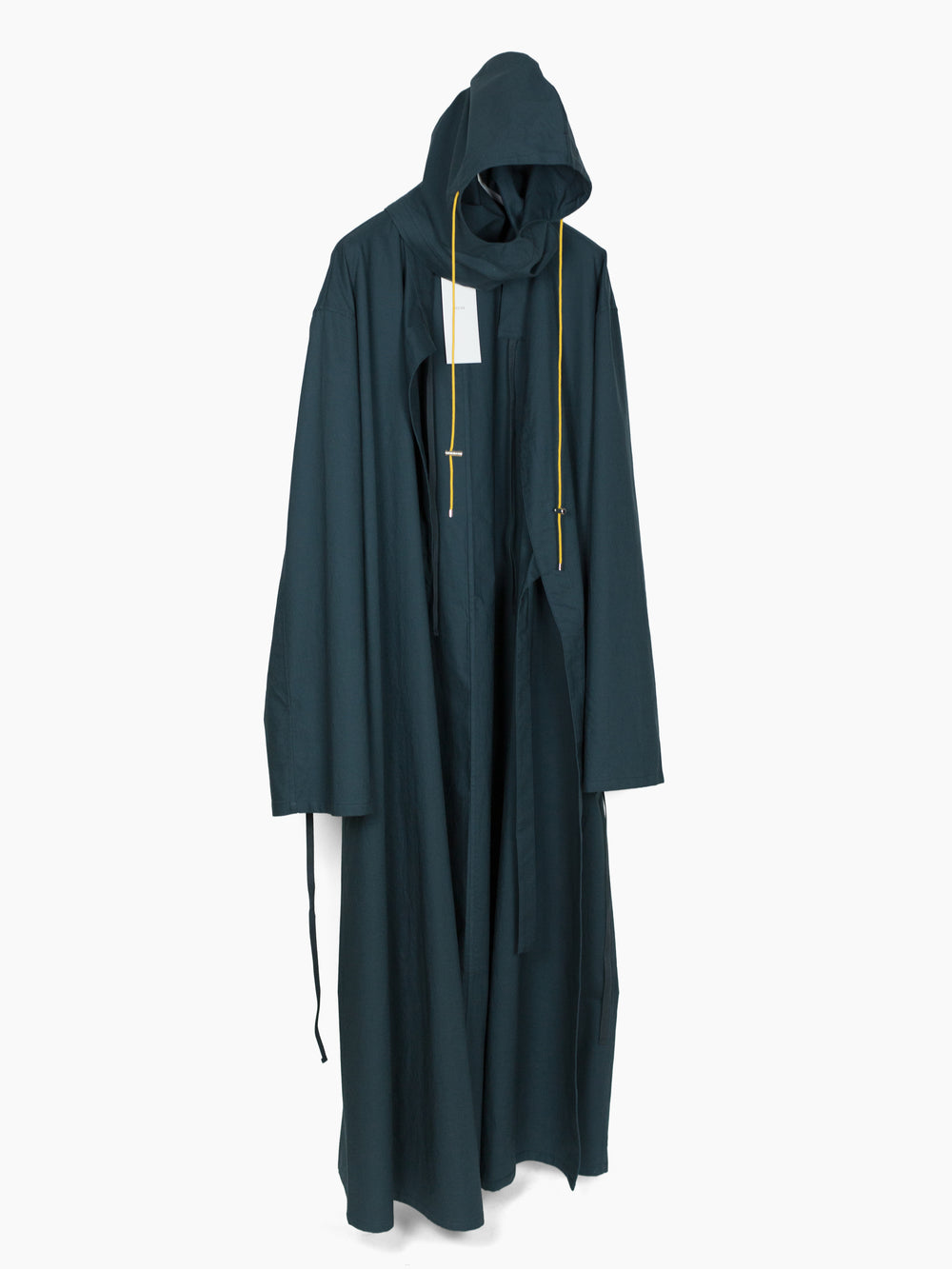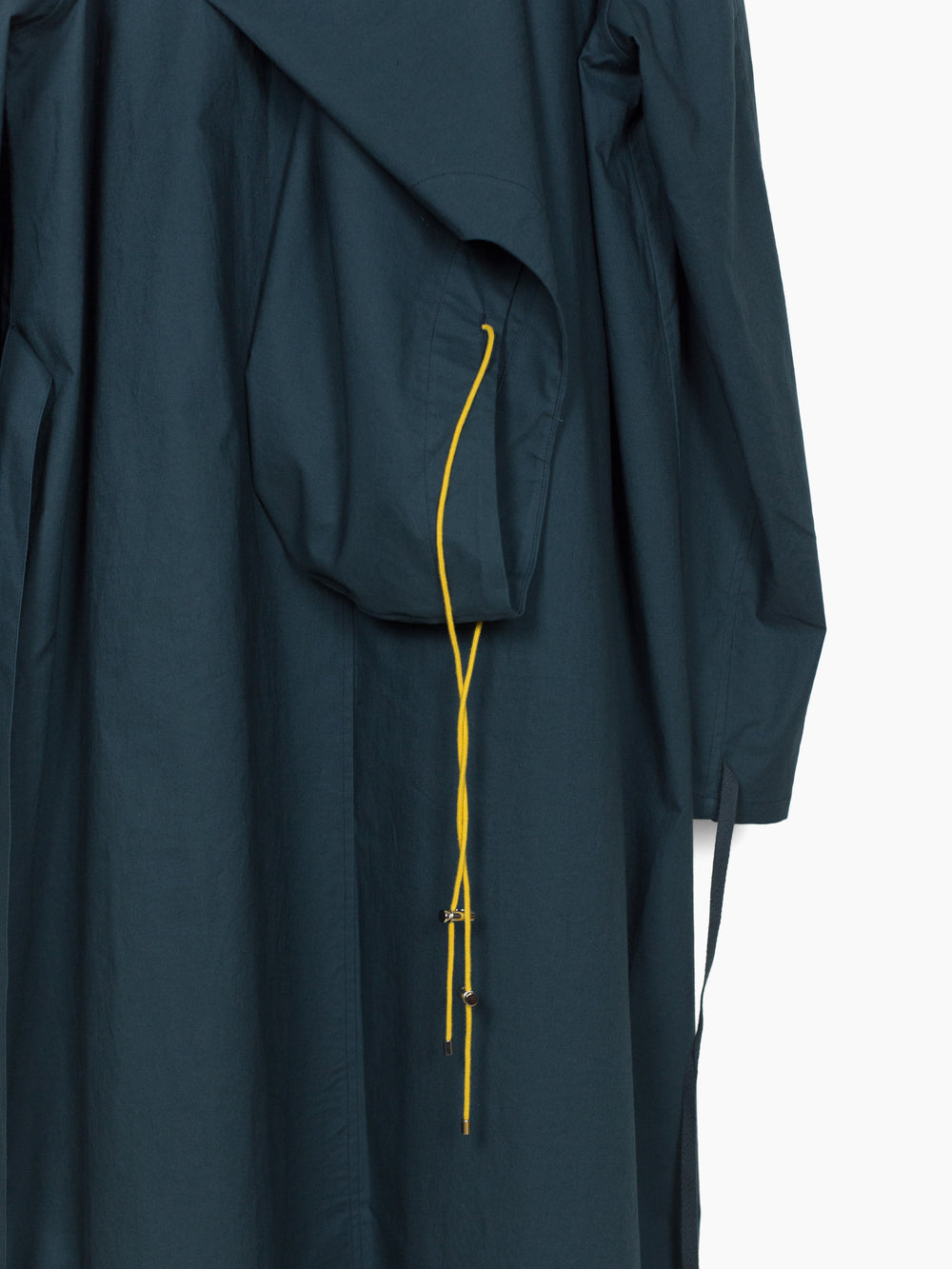 Vintage maxi-length military-inspired gown coat in mid-weight high density water repellent cotton. Features removable storm hood with contrast yellow drawstring and extended neck gaiter. Body is stripped of any hardware aside from the brand signature .925 Sterling Silver braided charm at the collar, meaning waist, collar, and cuff closures are tied with webbing.