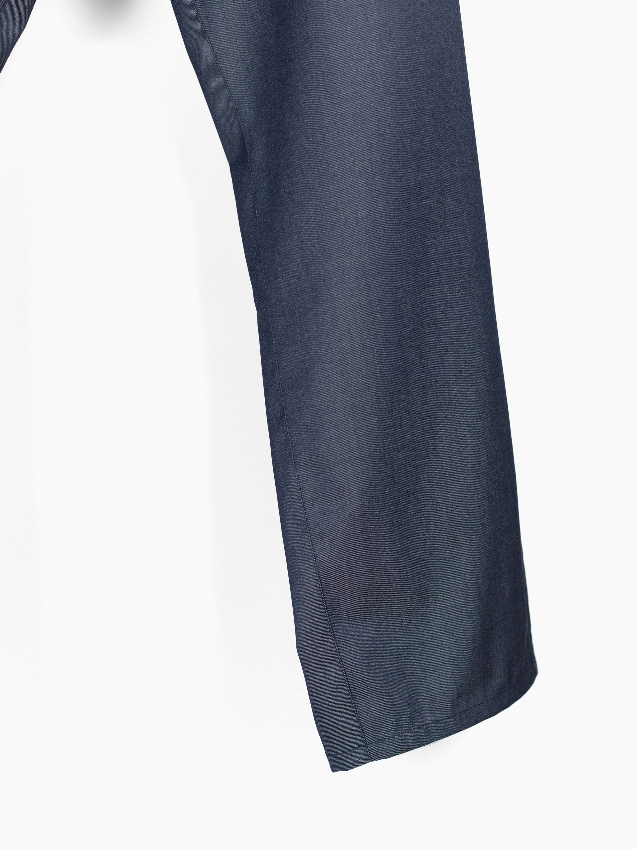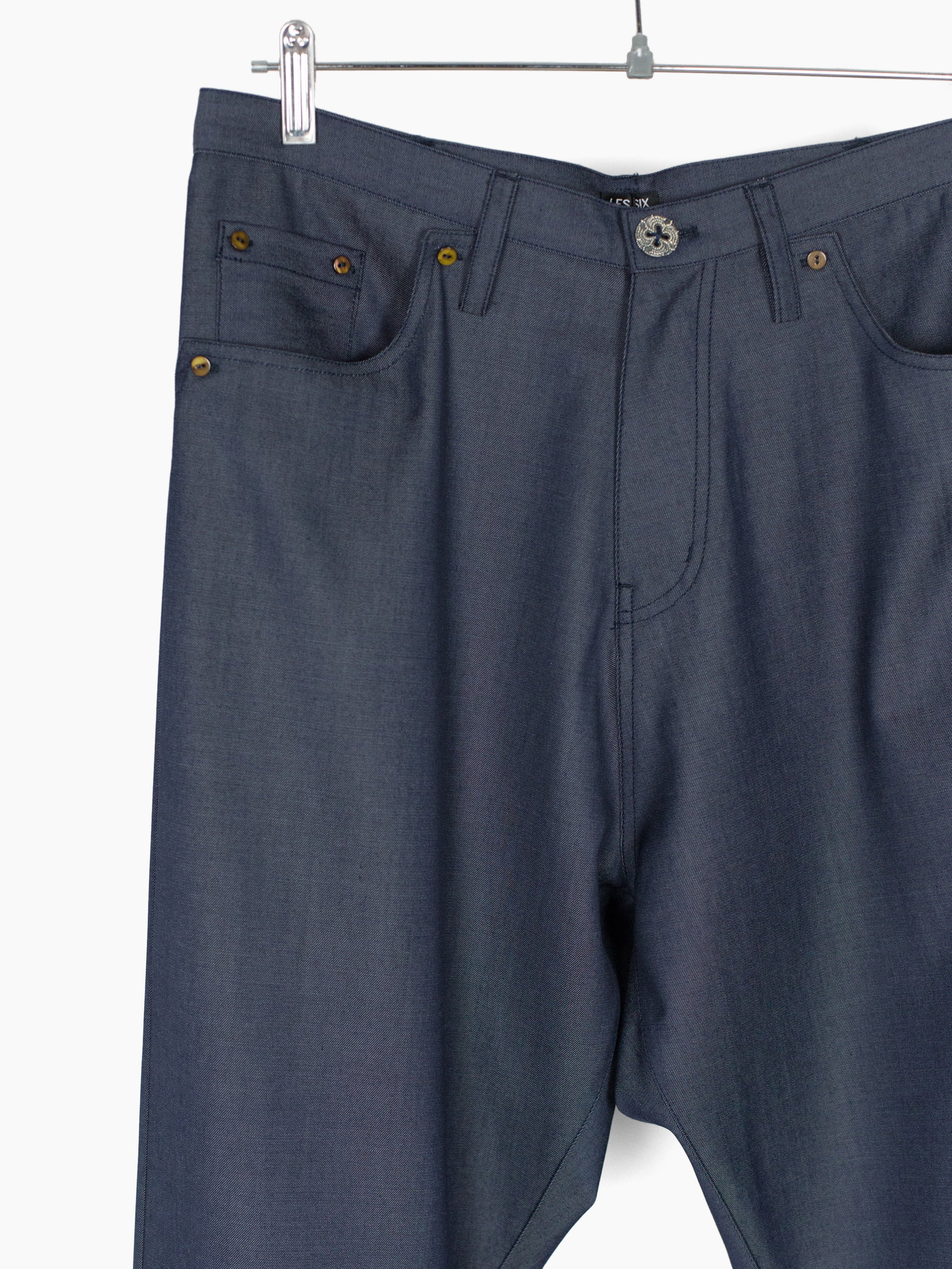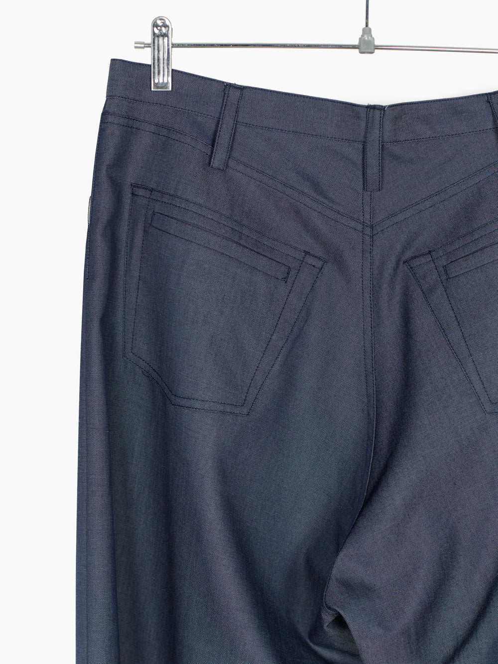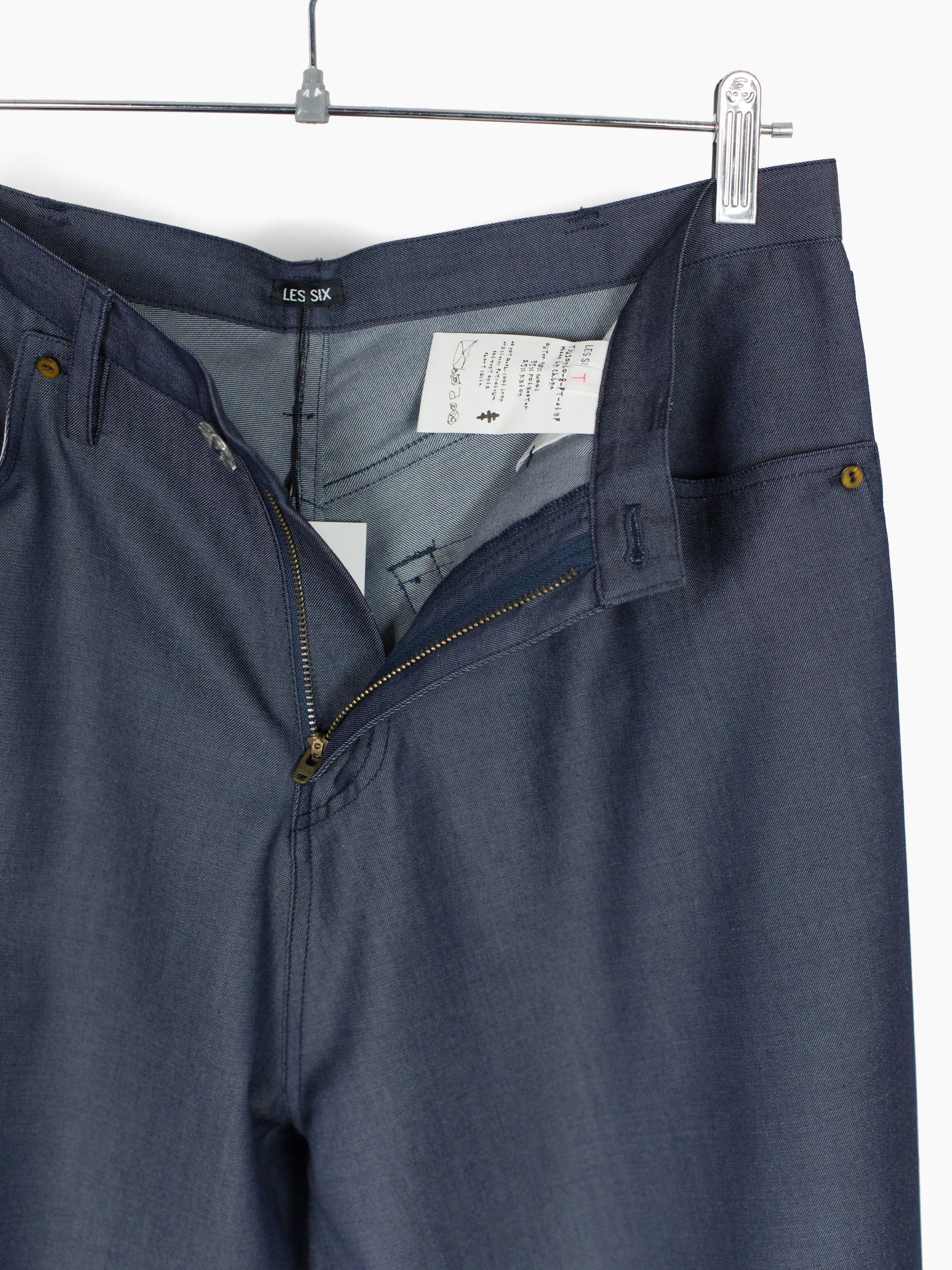 An updated iteration of a Les Six classic, jeans in an indigo wool twill with undyed weft that resembles a traditional cotton denim. This season they use a synthetic-blended cordura twill for added durability. An updated cut features a roomier leg and an elongated, square rise for a slouchy/sagged look. Other details remain similar, like brown functional buttons in place of rivets and constructed welt openings on fully stitched-around back patch pockets.