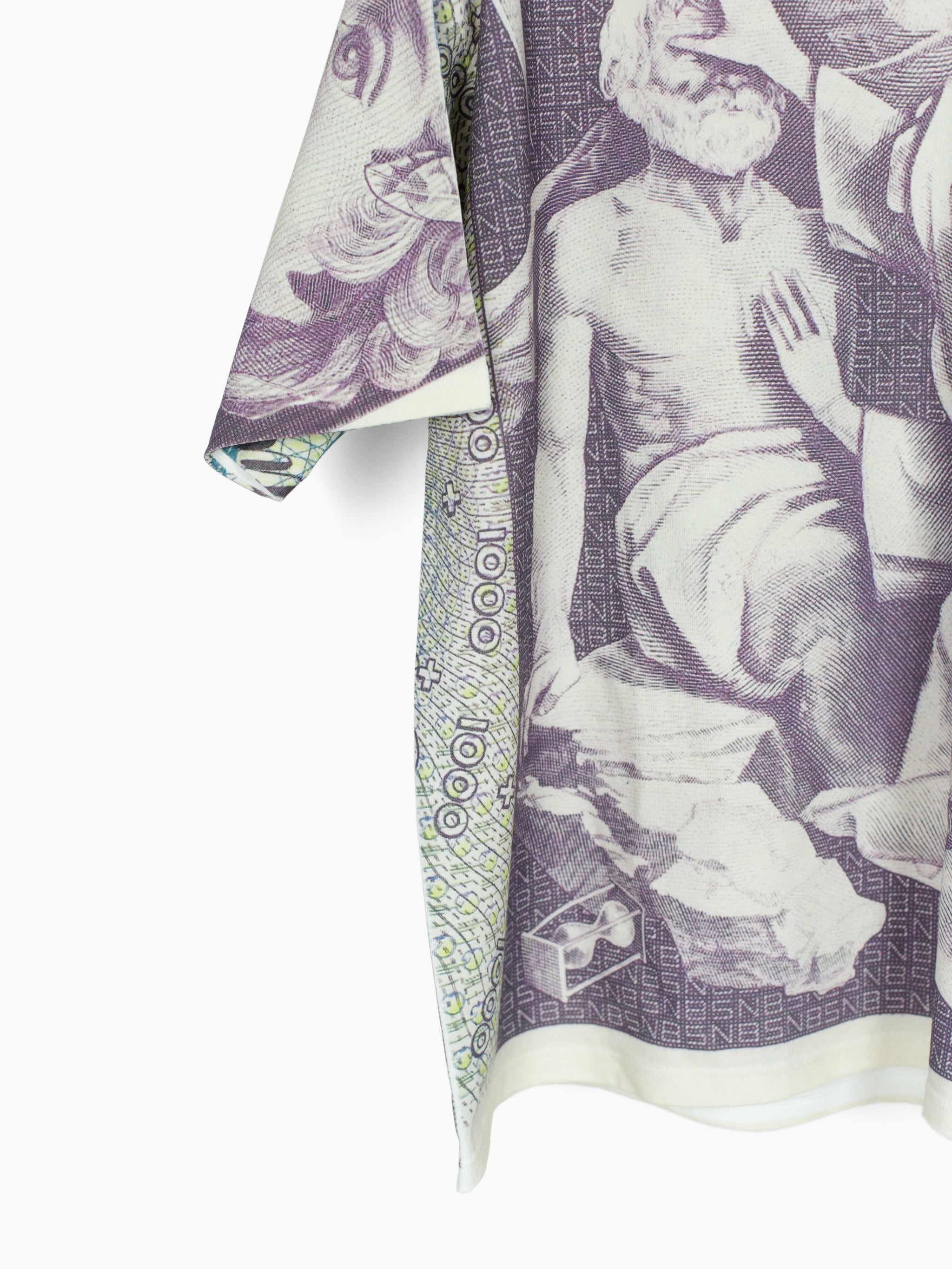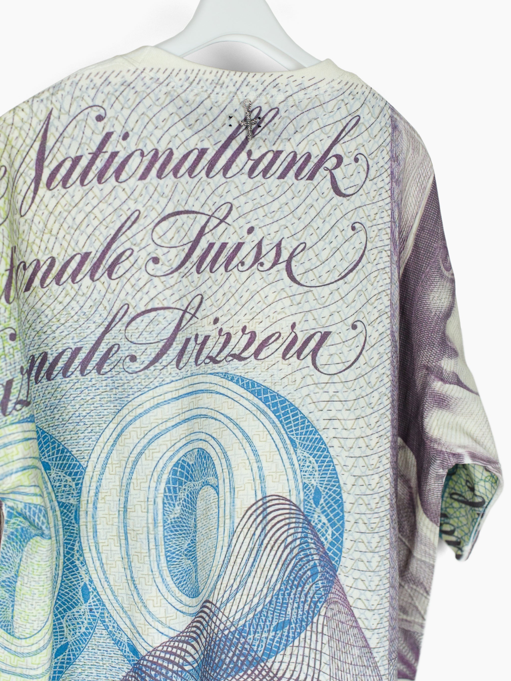 Superheavyweight-oversize-boxy tee with intricate Swiss Franc currency print by Kota Okuda. Get that money.