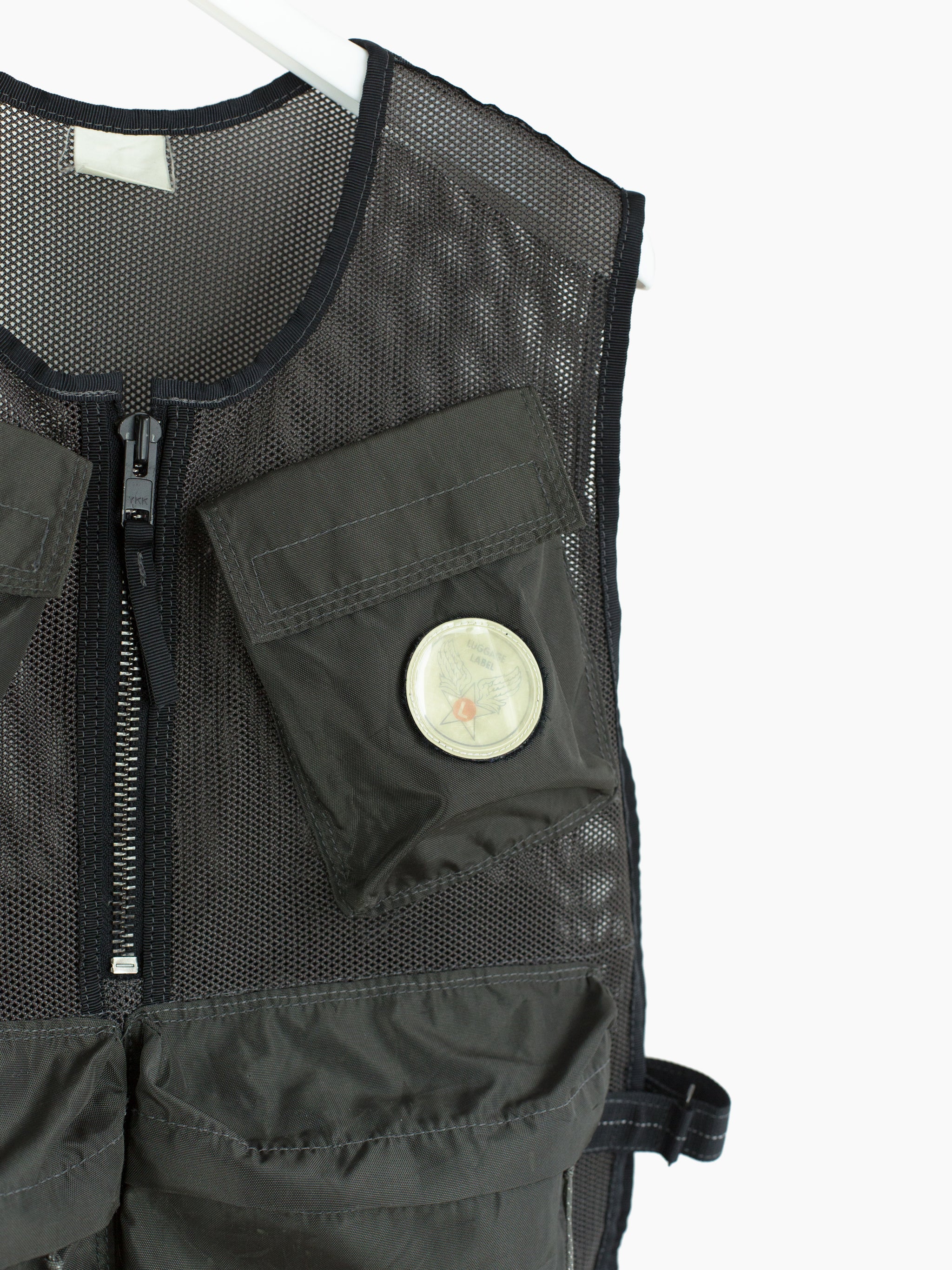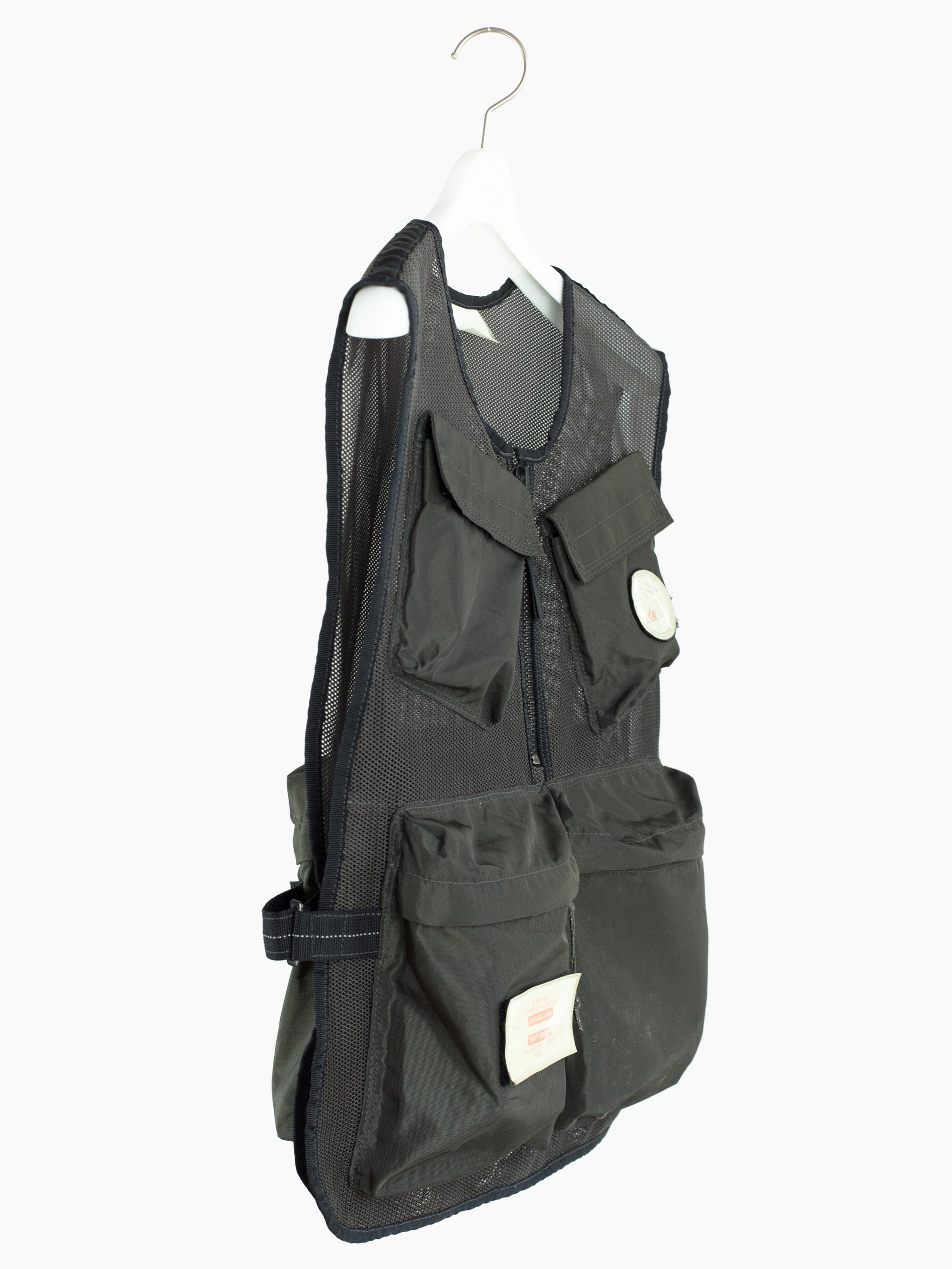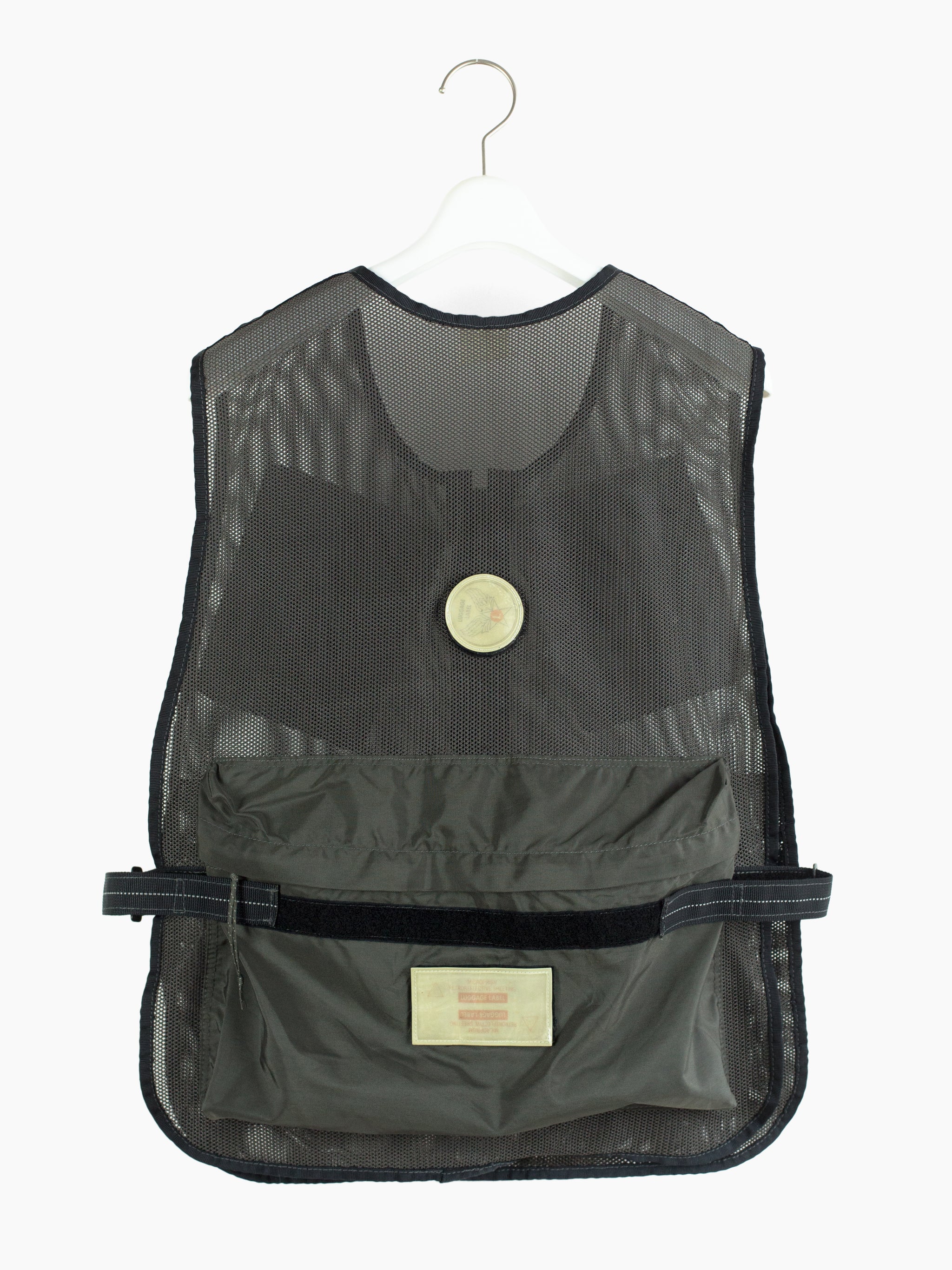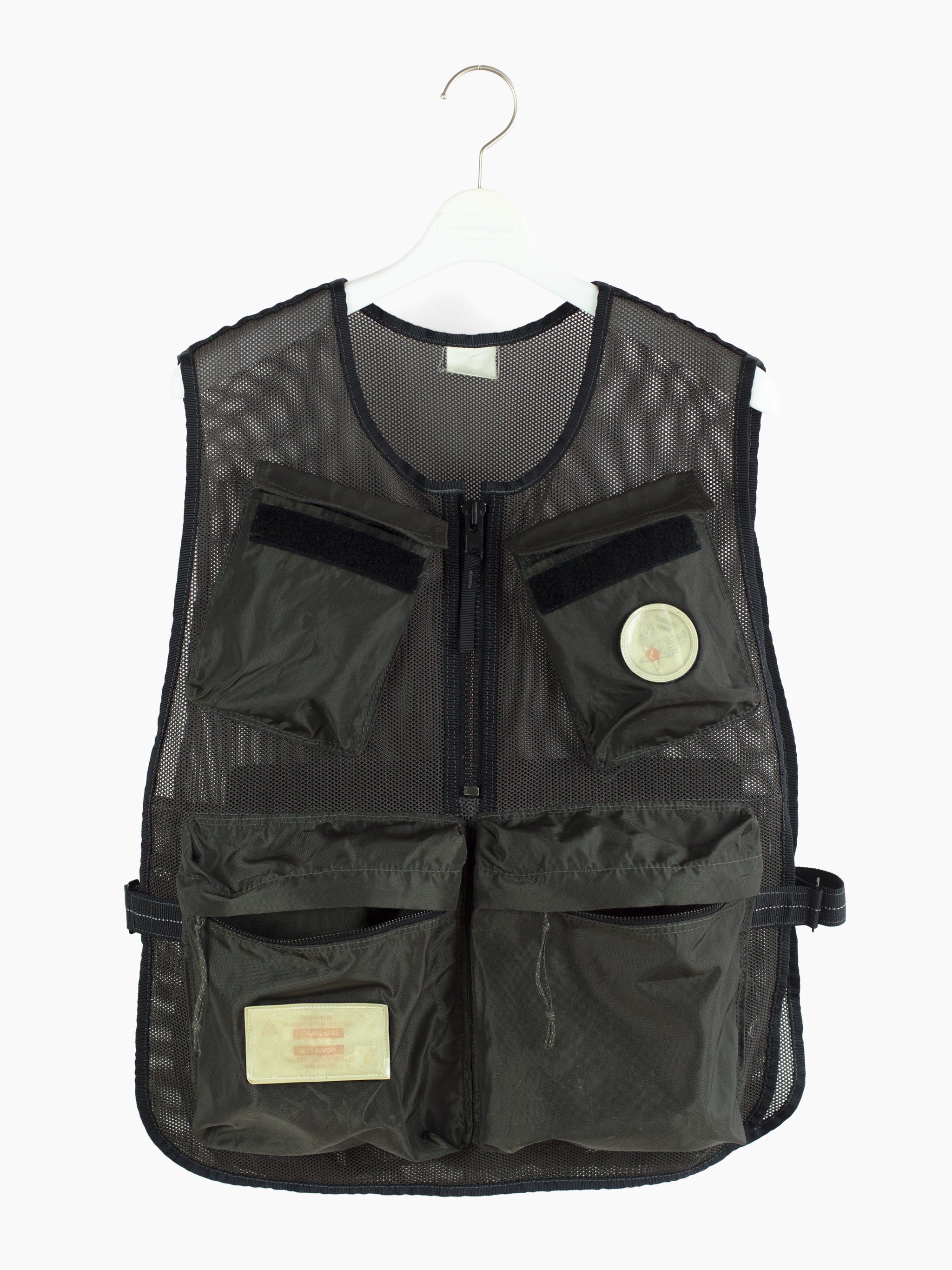 Half-zip pullover mesh cargo vest from bag experts Porter from their subline Luggage Label. Equipped with 5 3D darted pockets in nylon canvas, including two velcro flap-closed chest pockets, two zippered waist dump pockets, and one zippered back game pocket. The vest is fully adjustable with velcro side closures that cinch or expand to accommodate a range of shapes and sizes. Velcro patches in reflective 3M are placed throughout and bring a welcome graphic punch.