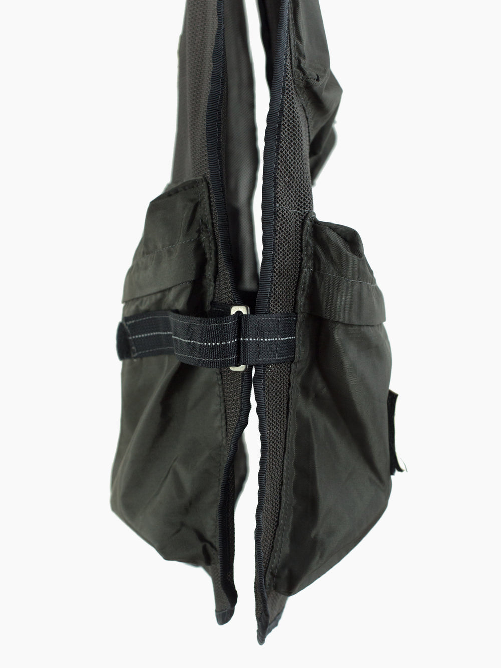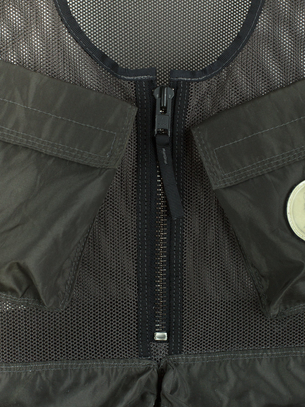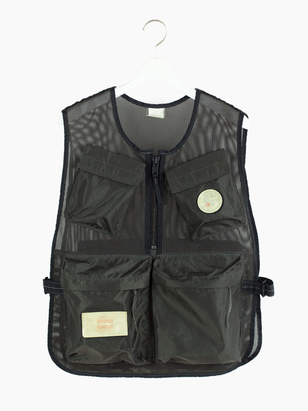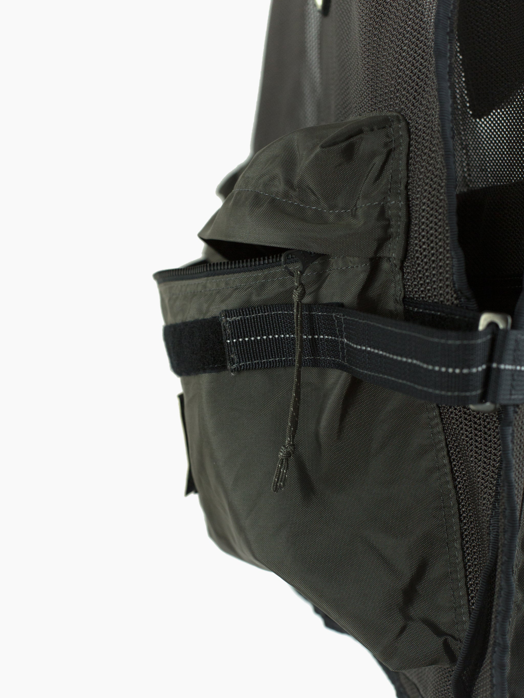 Half-zip pullover mesh cargo vest from bag experts Porter from their subline Luggage Label. Equipped with 5 3D darted pockets in nylon canvas, including two velcro flap-closed chest pockets, two zippered waist dump pockets, and one zippered back game pocket. The vest is fully adjustable with velcro side closures that cinch or expand to accommodate a range of shapes and sizes. Velcro patches in reflective 3M are placed throughout and bring a welcome graphic punch.