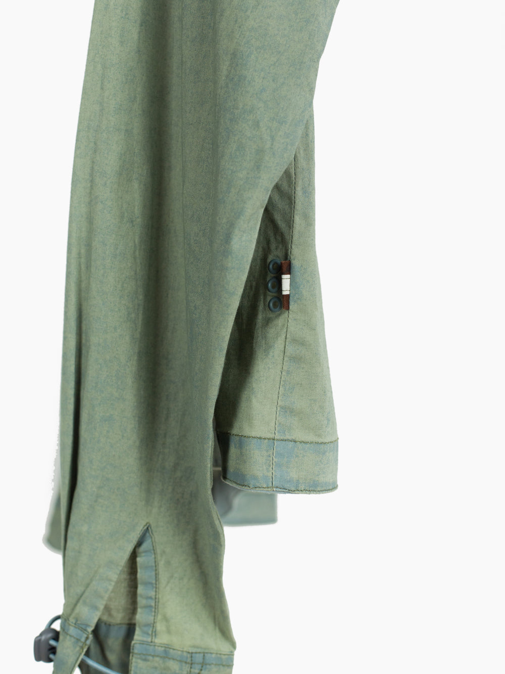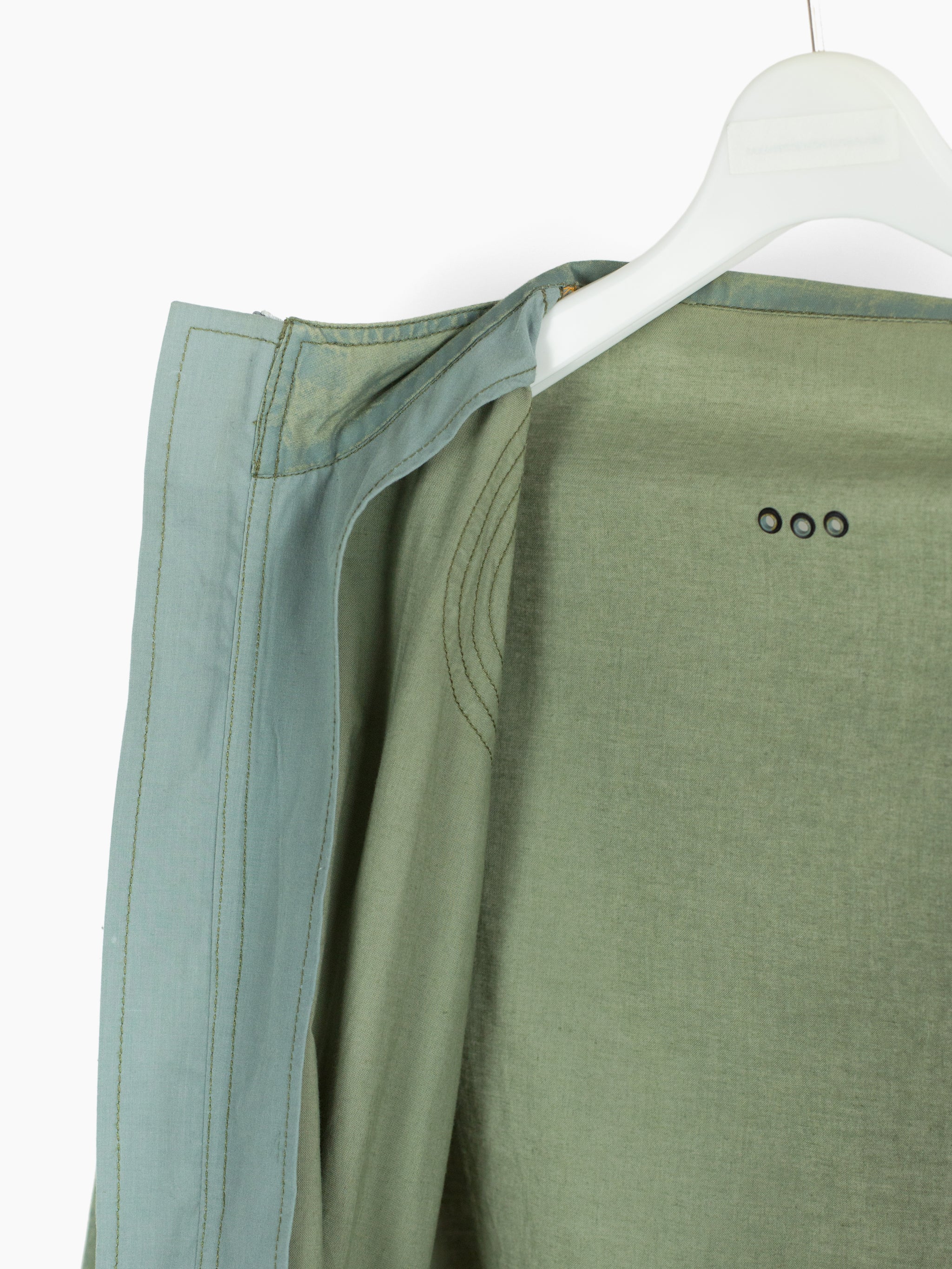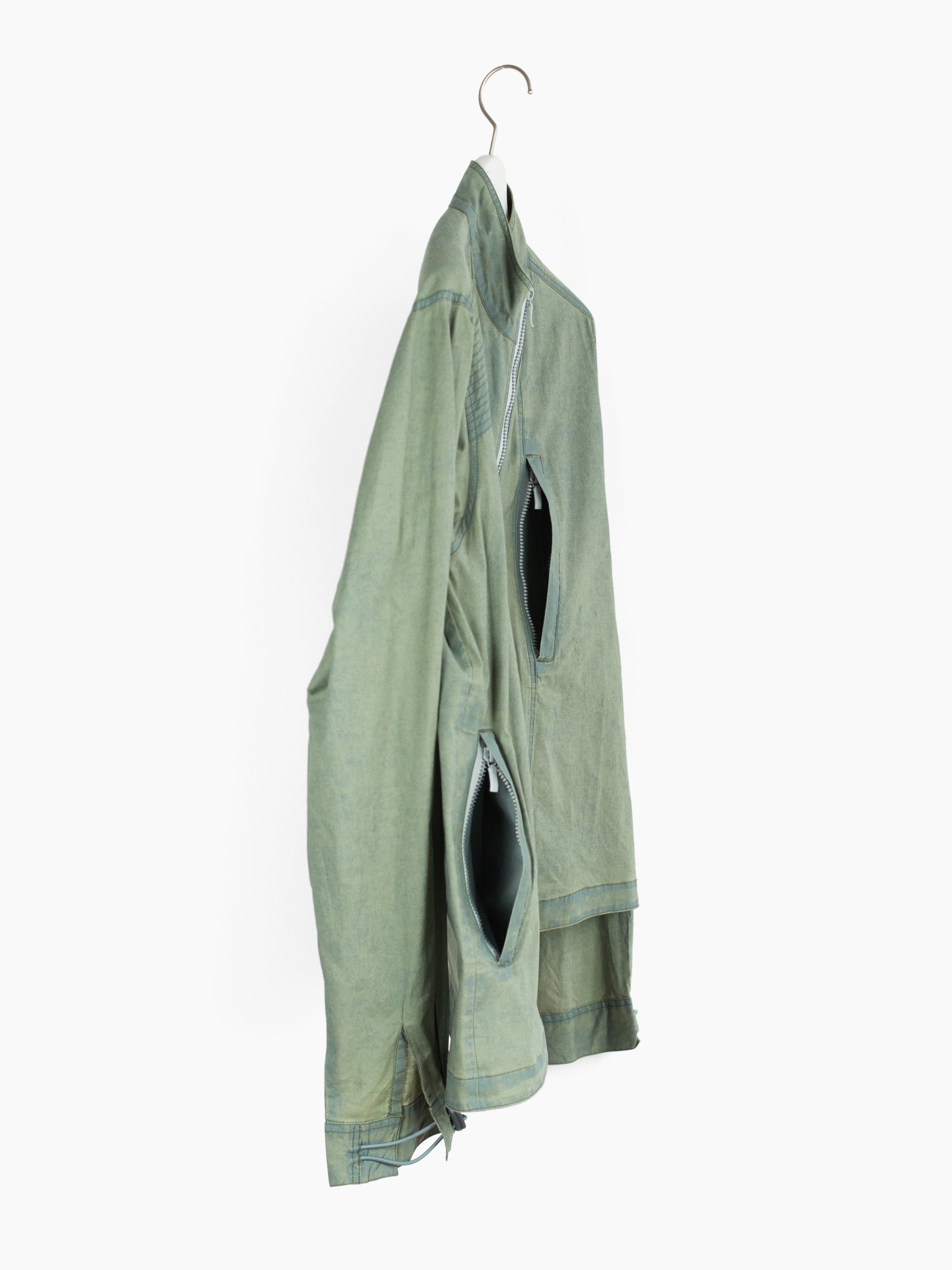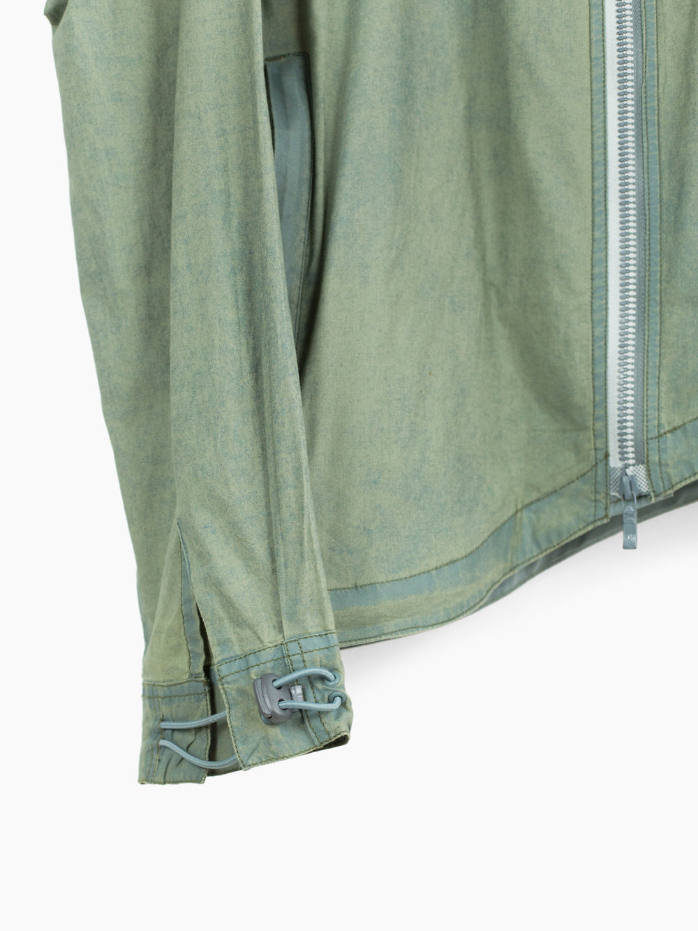 Late 90s/Early 2000s Maharishi shirt jacket in a beautiful aged green finish that invokes rusted copper tones. The feature set incorporates all of the elements that define early Maharishi's utilitarian-yet-forward streetwear design language: Asymmetrical curved hem, eyelet style vents, bi-color double zipper with left and right in contrasting white and blue, and ultra-fast shockcord cuff adjust. This specific one is cut in a lightweight 'showerproof' shirting material for adaptability and light weather resistance.