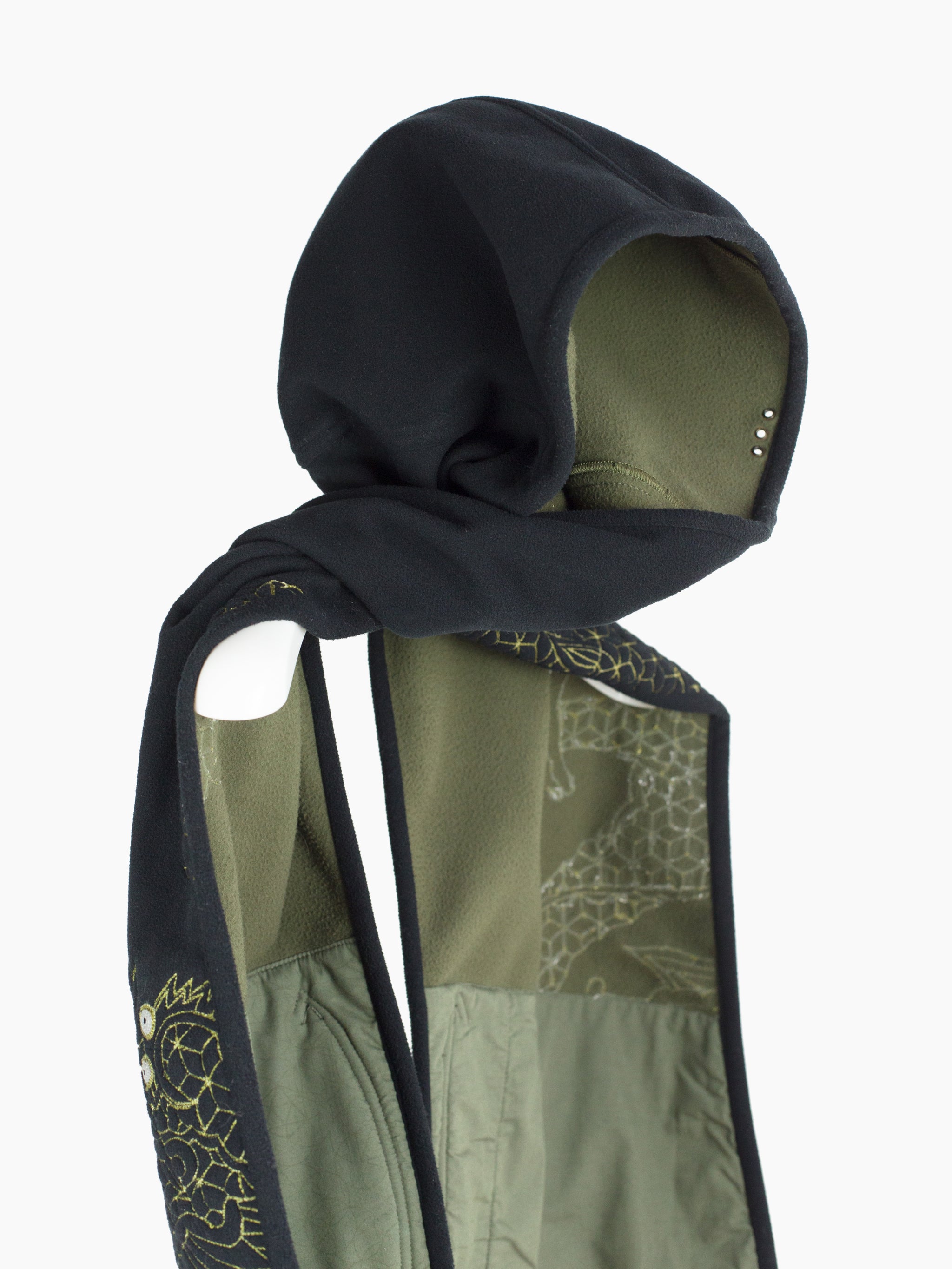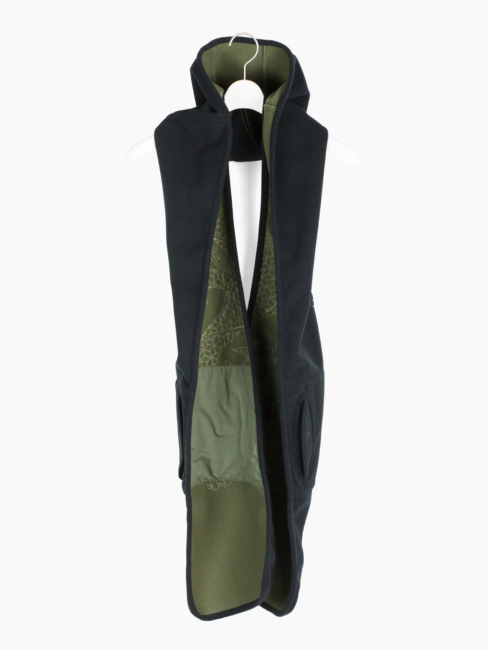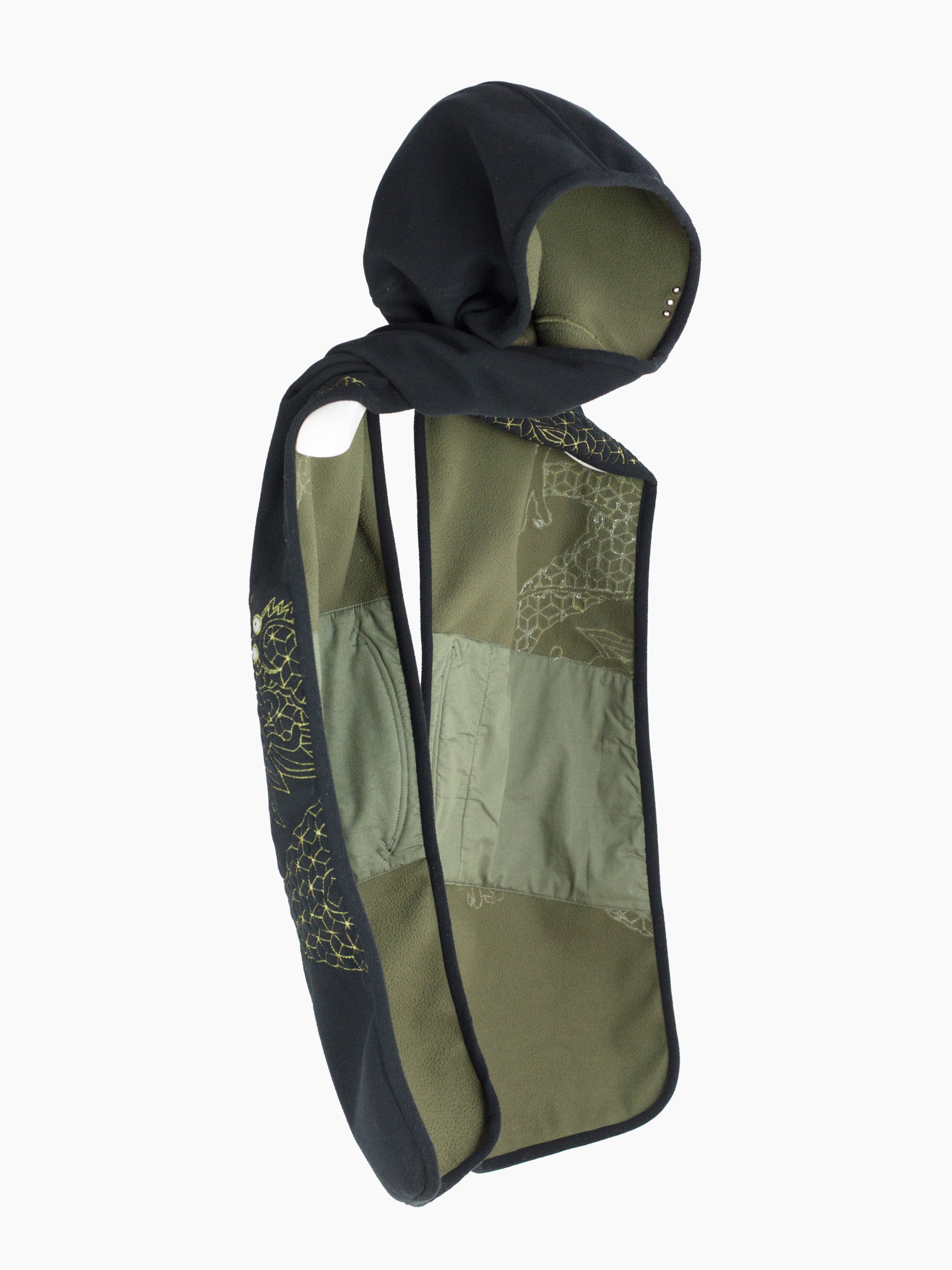 Dense polar fleece hooded scarf accessory from Maharishi with two-tone olive/black front to back design and signature dragon embroidery that comes together when the two scarf tails cross cross. It features an articulated/shaped hood and snap-closed handwarmer pockets on each side. The piece can be worn and layered in a multitude of ways and perfectly balances the functional and ornamental.