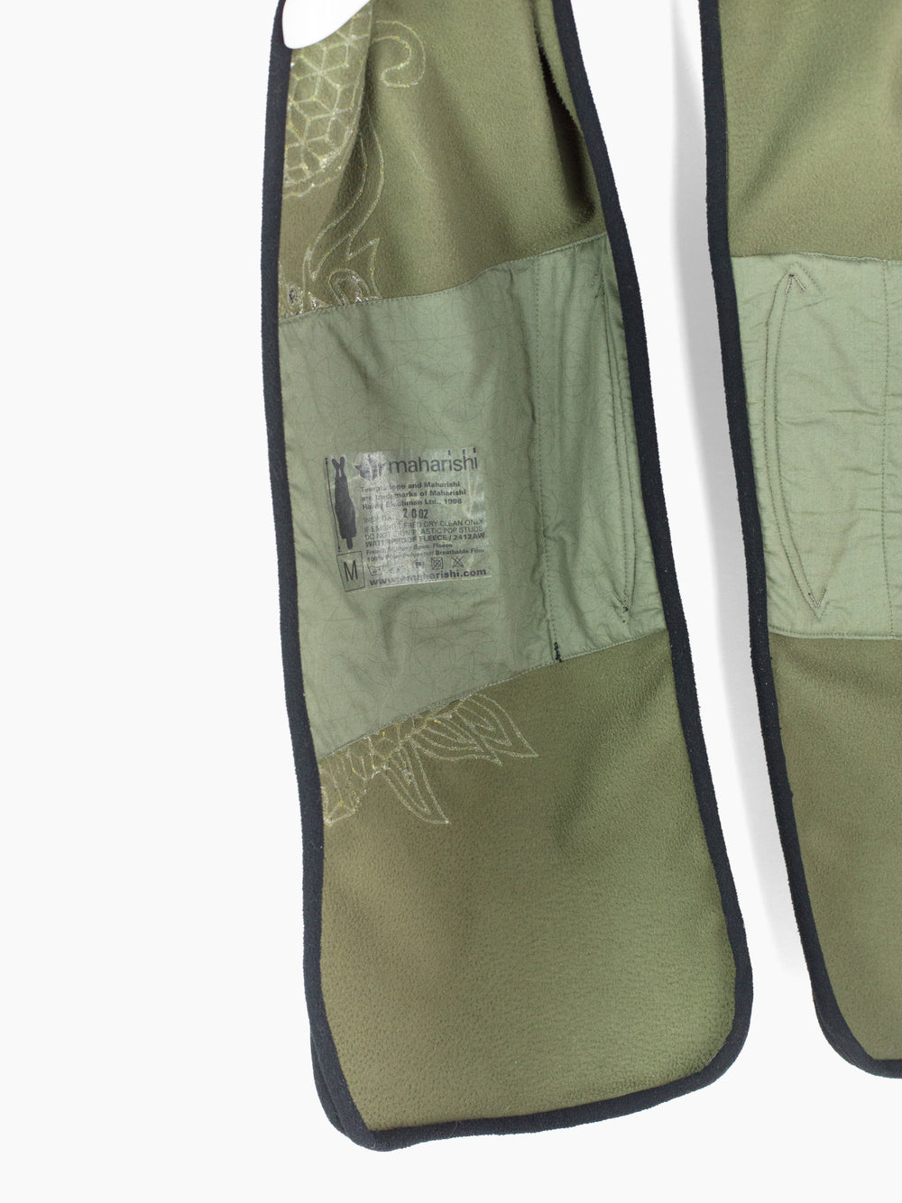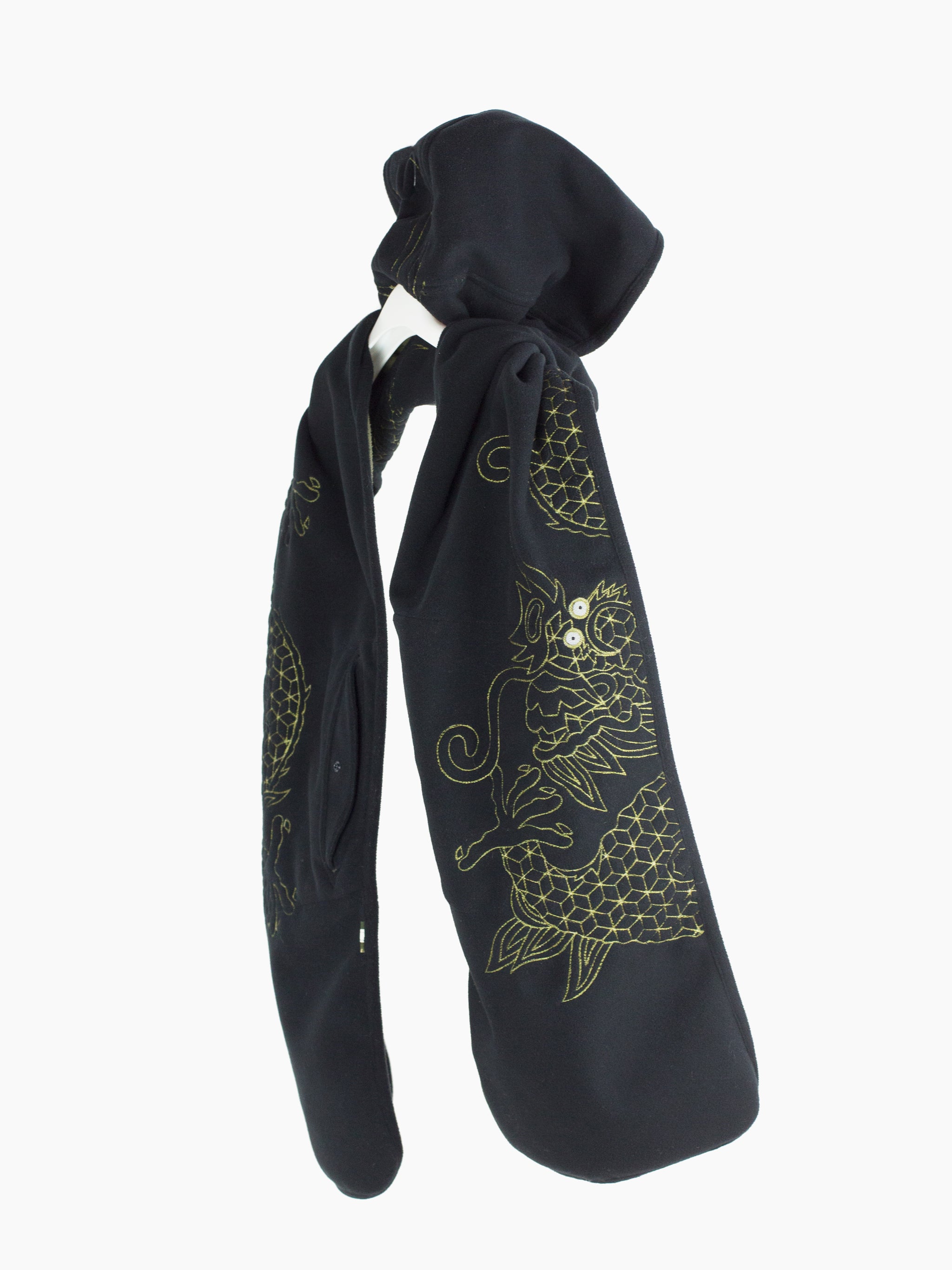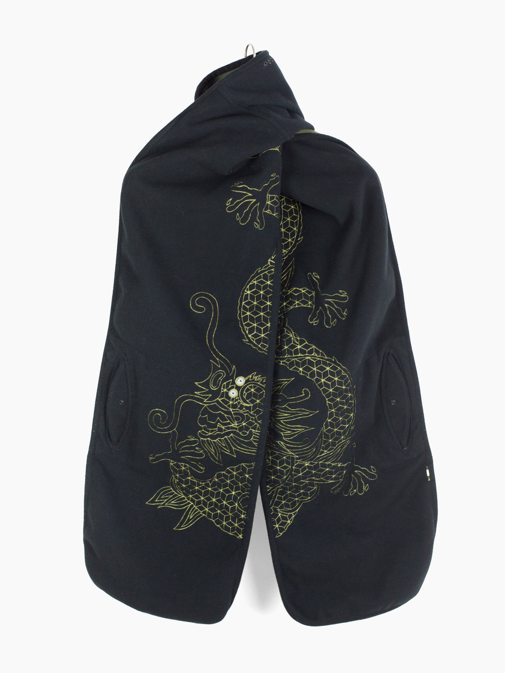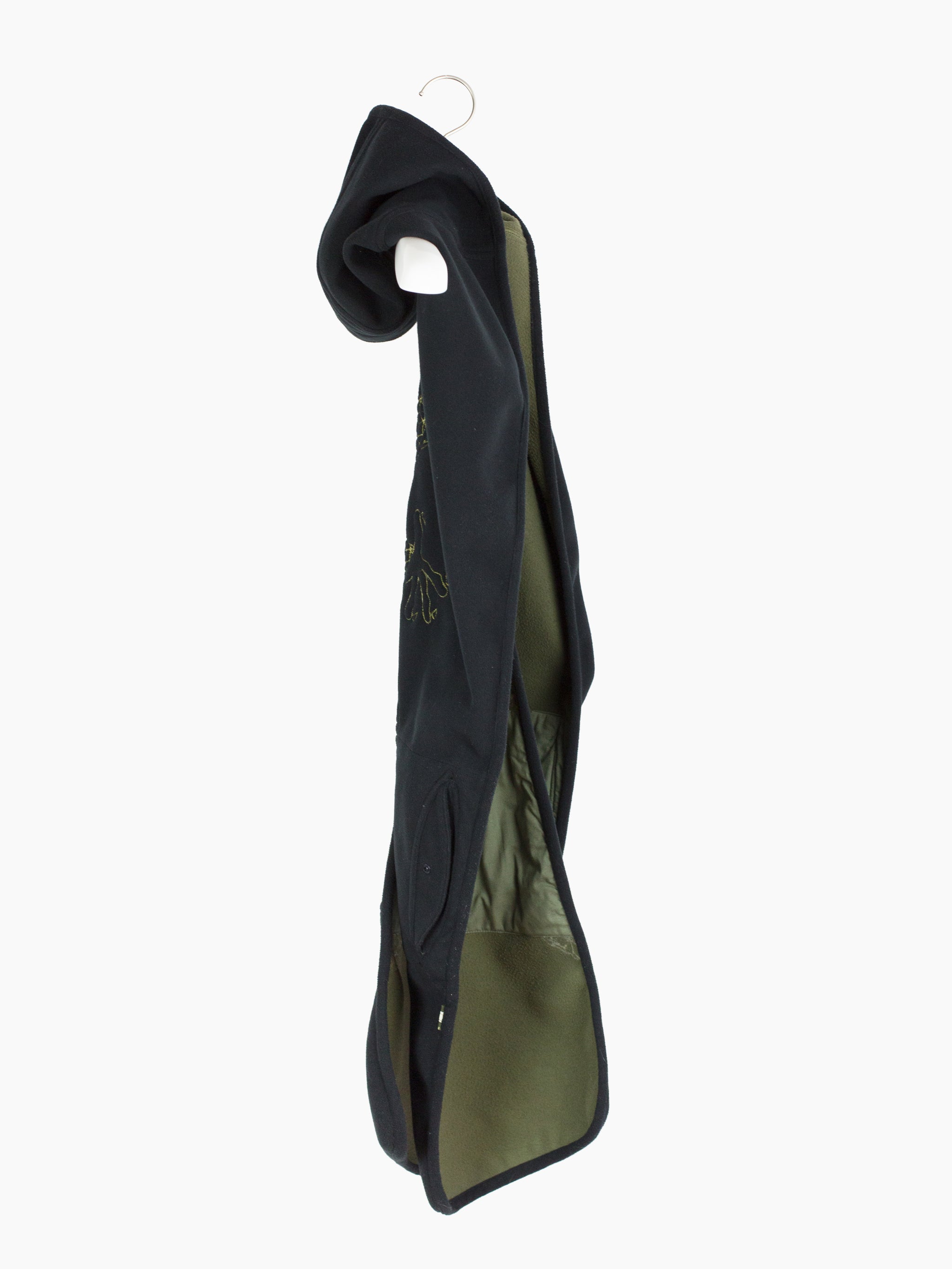 Dense polar fleece hooded scarf accessory from Maharishi with two-tone olive/black front to back design and signature dragon embroidery that comes together when the two scarf tails cross cross. It features an articulated/shaped hood and snap-closed handwarmer pockets on each side. The piece can be worn and layered in a multitude of ways and perfectly balances the functional and ornamental.