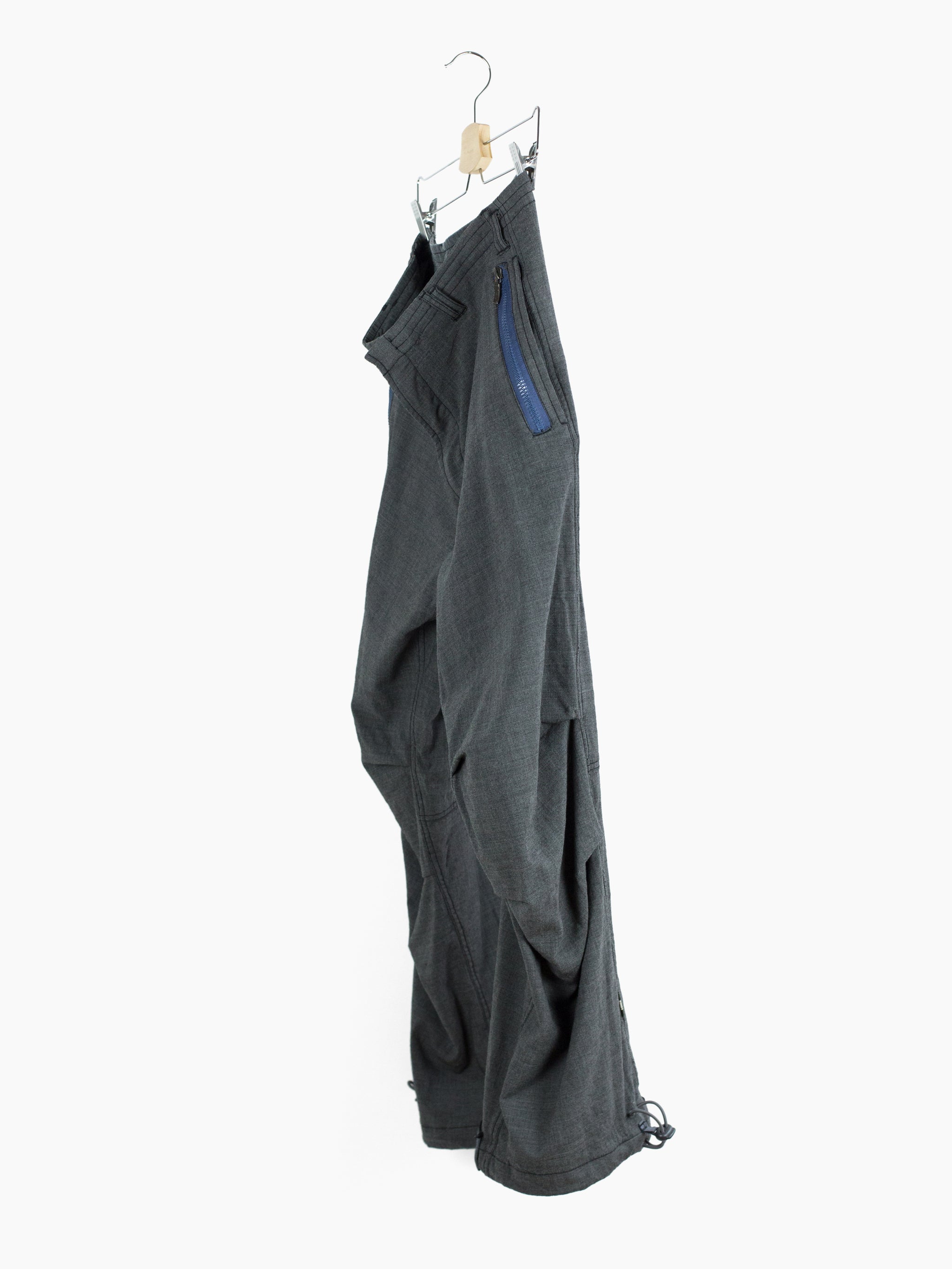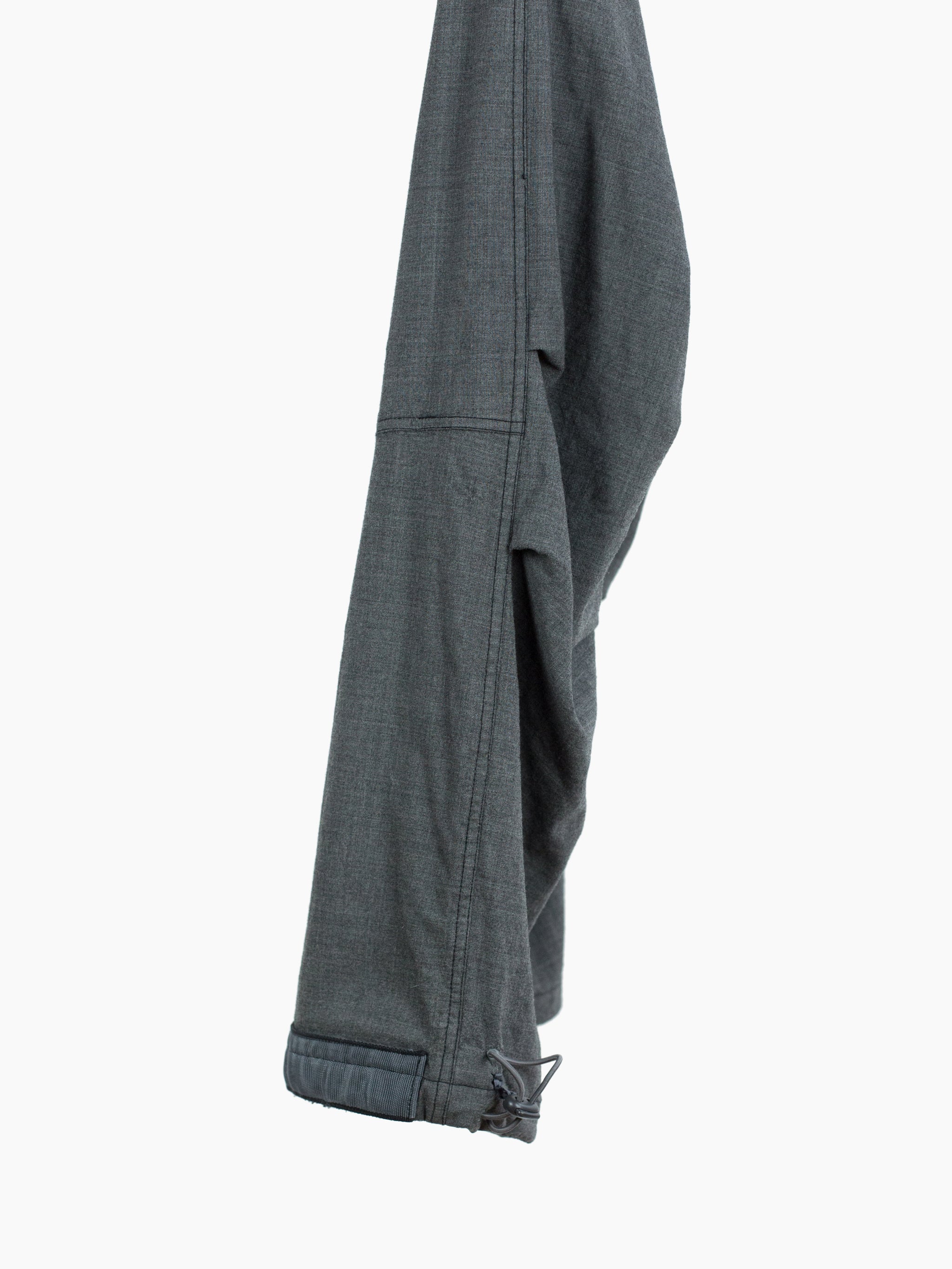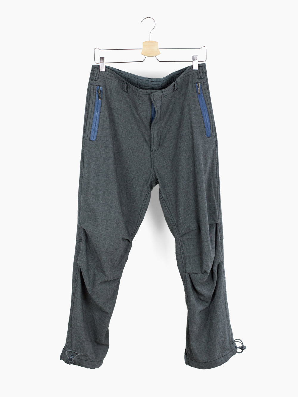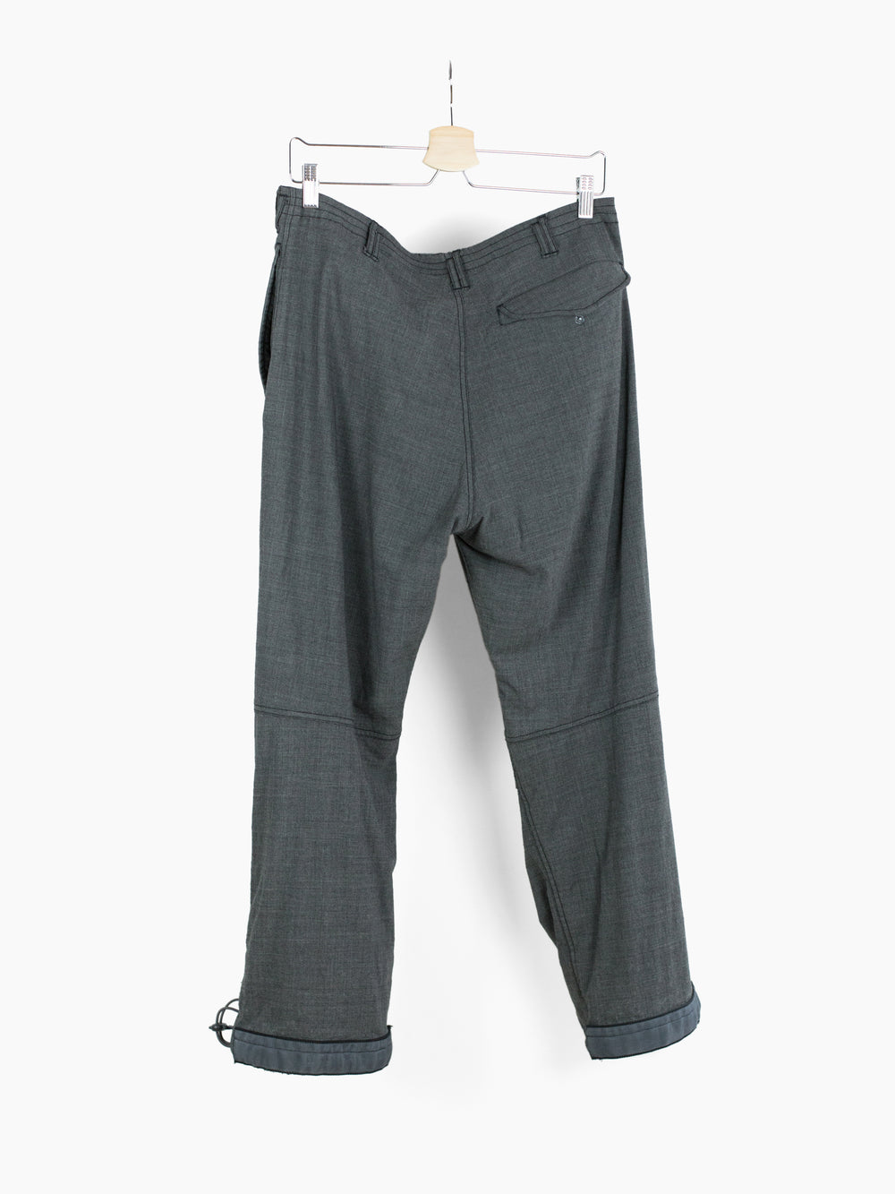 These vintage Maharishi snopants are cut in a rare Loro Piana wool fabric, lending the aggressive utilitarian shape a luxurious, supple drape and showcasing designer Hardy Blechman's expertise in fusing disparate menswear elements into a cutting-edge street-ready package. Draped pleats at the knees draw from military cargo pants, the fine Loro Piana wool outer points towards tailored trousers, and the shockcord hem and technical polyester lining inject a sportswear atmosphere. There are double the pockets at the waist, with a set of secure zippered ones sitting atop more traditional slash pockets and even the belt loops are doubled. The result is a hybrid trouser that artfully fuses form and function, formality and utility.