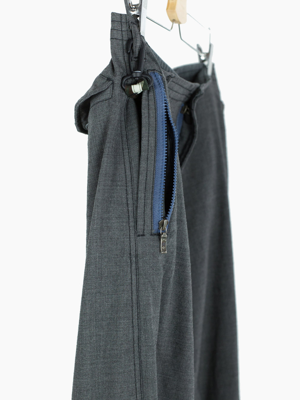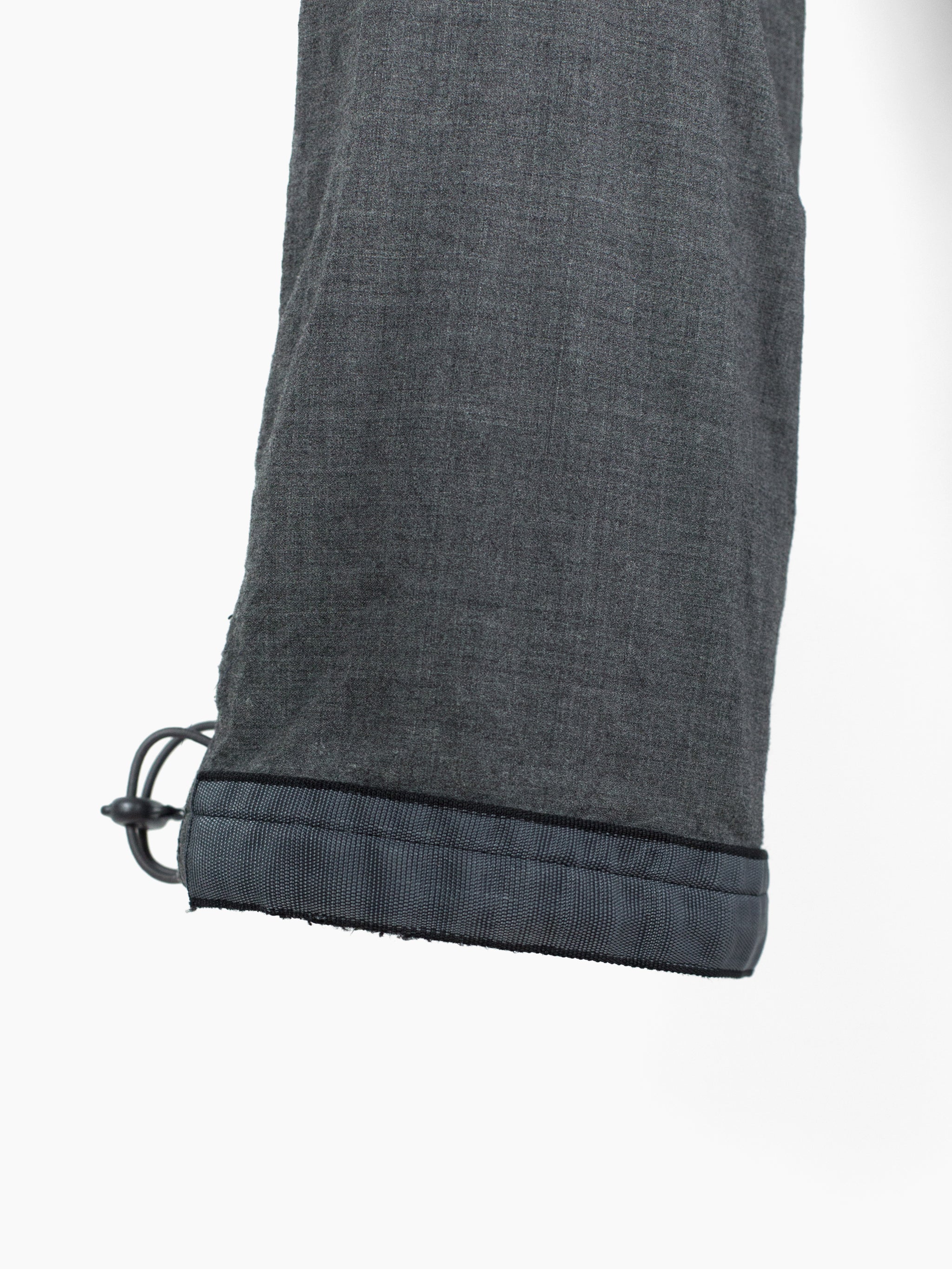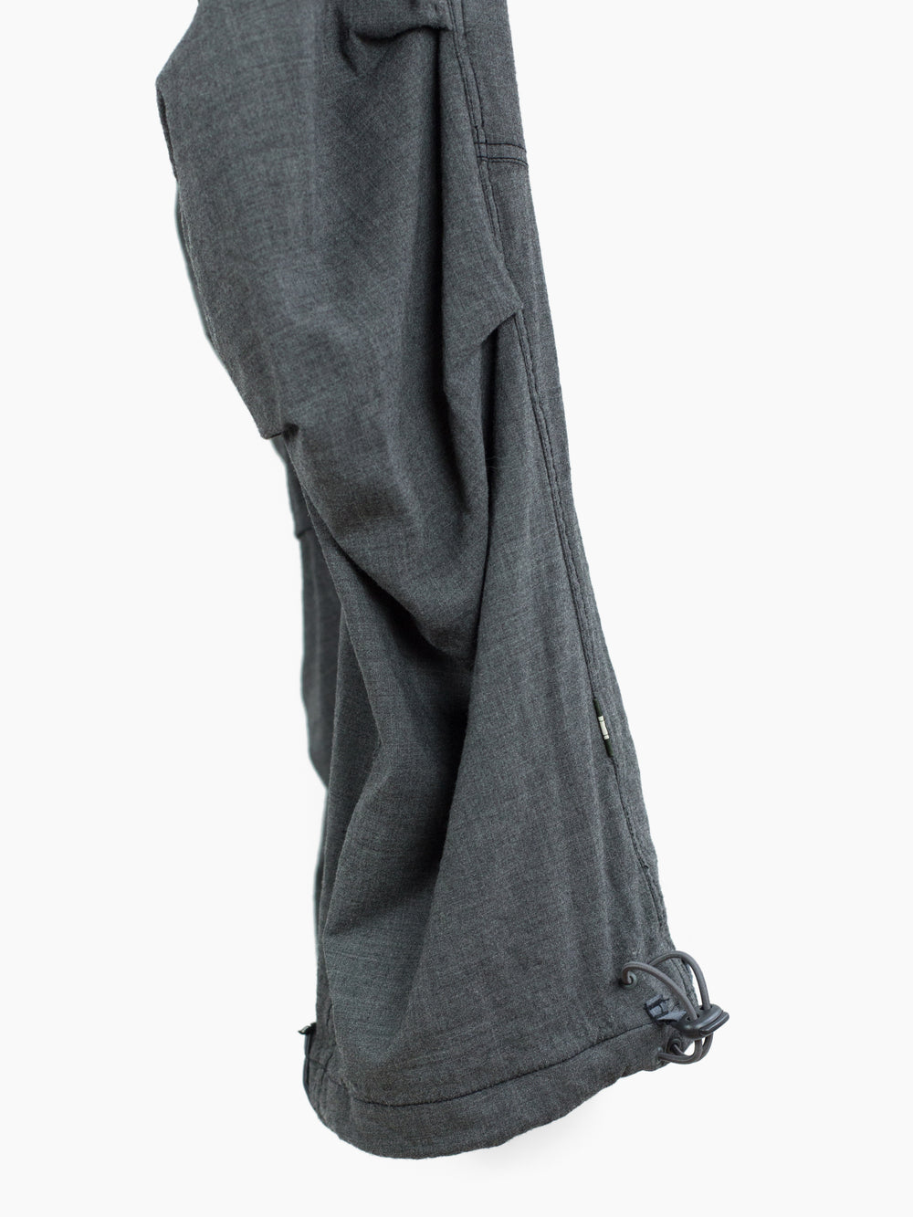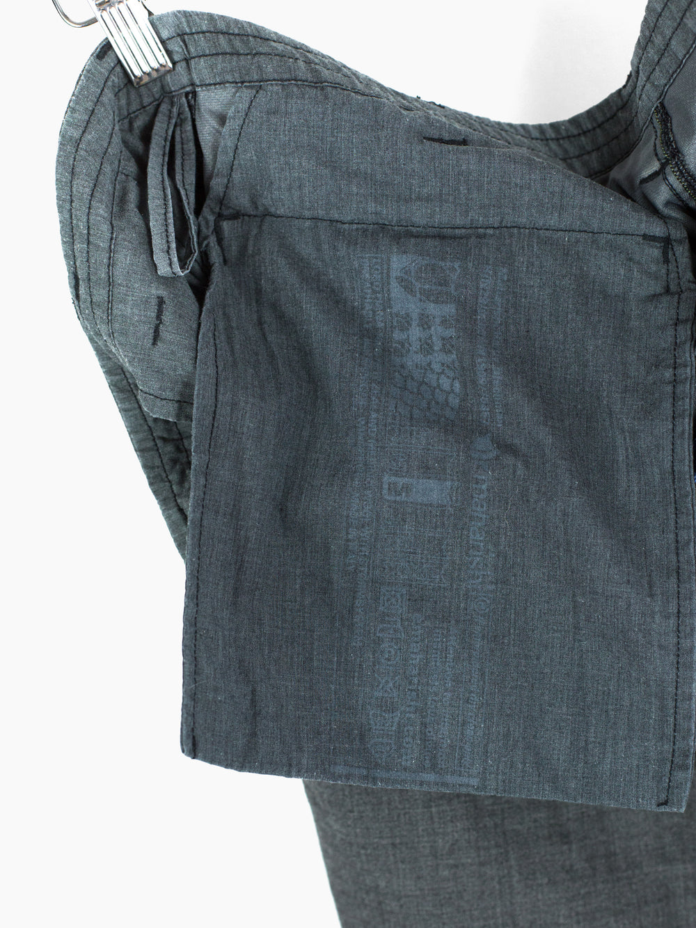 These vintage Maharishi snopants are cut in a rare Loro Piana wool fabric, lending the aggressive utilitarian shape a luxurious, supple drape and showcasing designer Hardy Blechman's expertise in fusing disparate menswear elements into a cutting-edge street-ready package. Draped pleats at the knees draw from military cargo pants, the fine Loro Piana wool outer points towards tailored trousers, and the shockcord hem and technical polyester lining inject a sportswear atmosphere. There are double the pockets at the waist, with a set of secure zippered ones sitting atop more traditional slash pockets and even the belt loops are doubled. The result is a hybrid trouser that artfully fuses form and function, formality and utility.