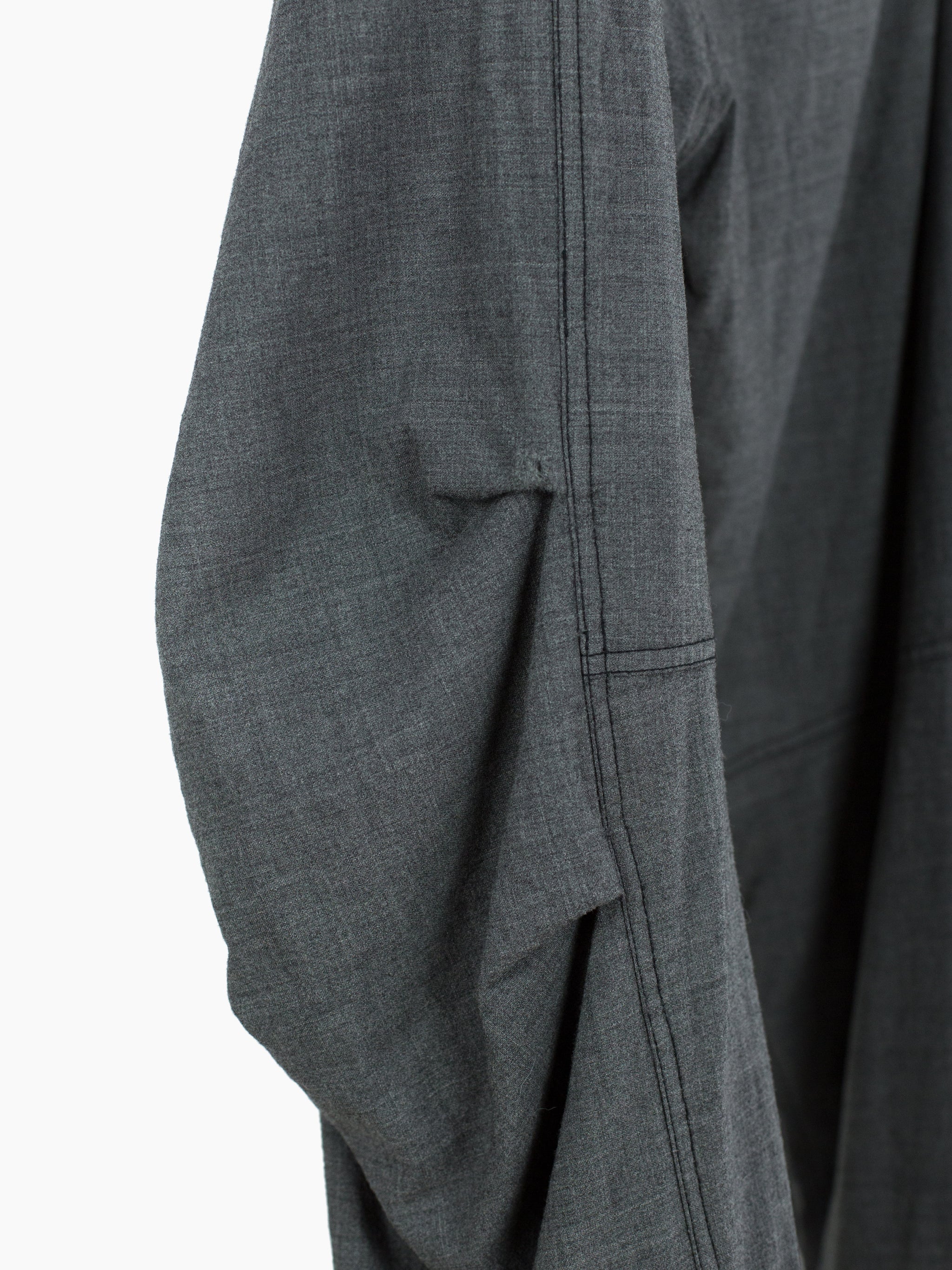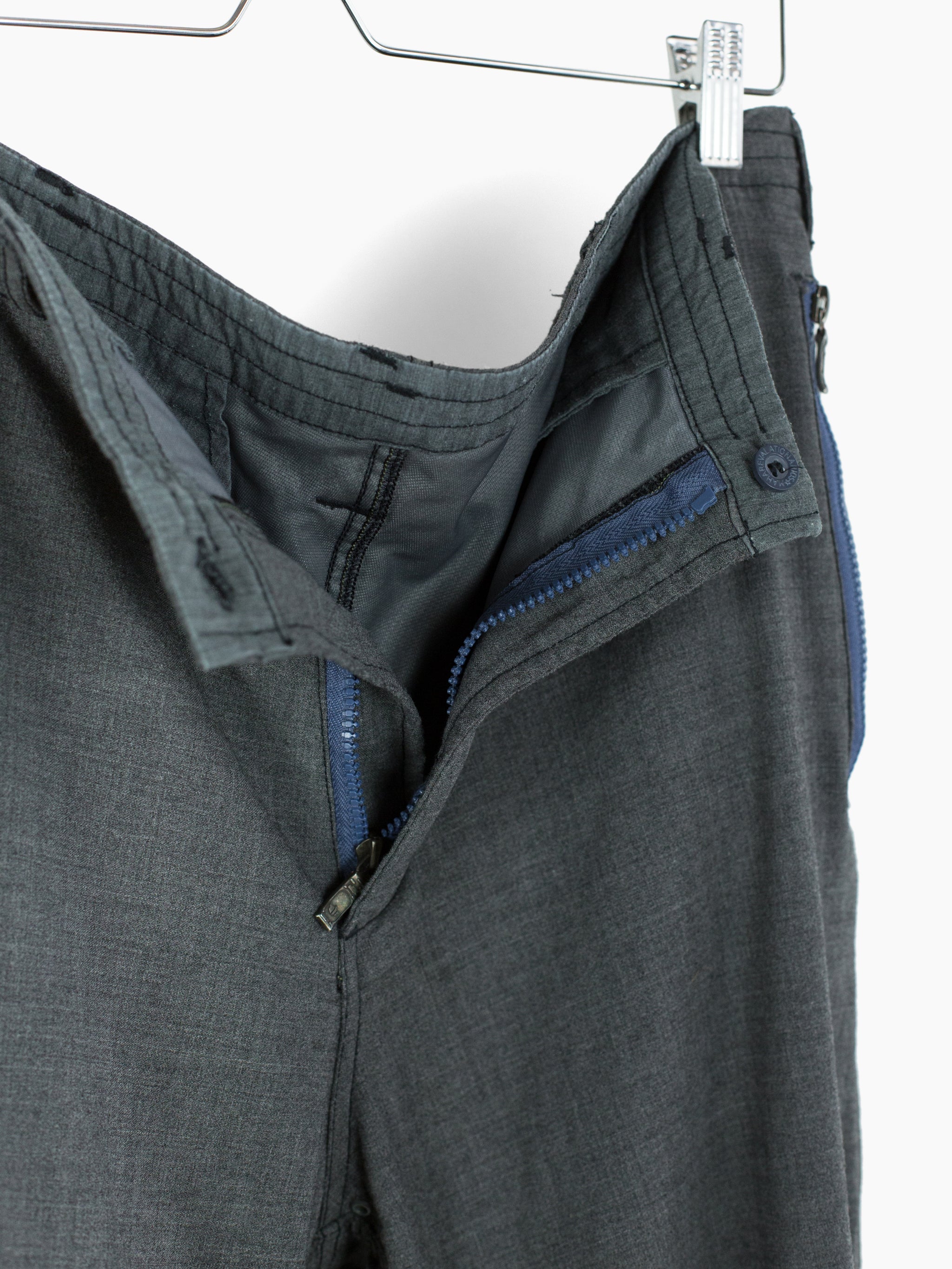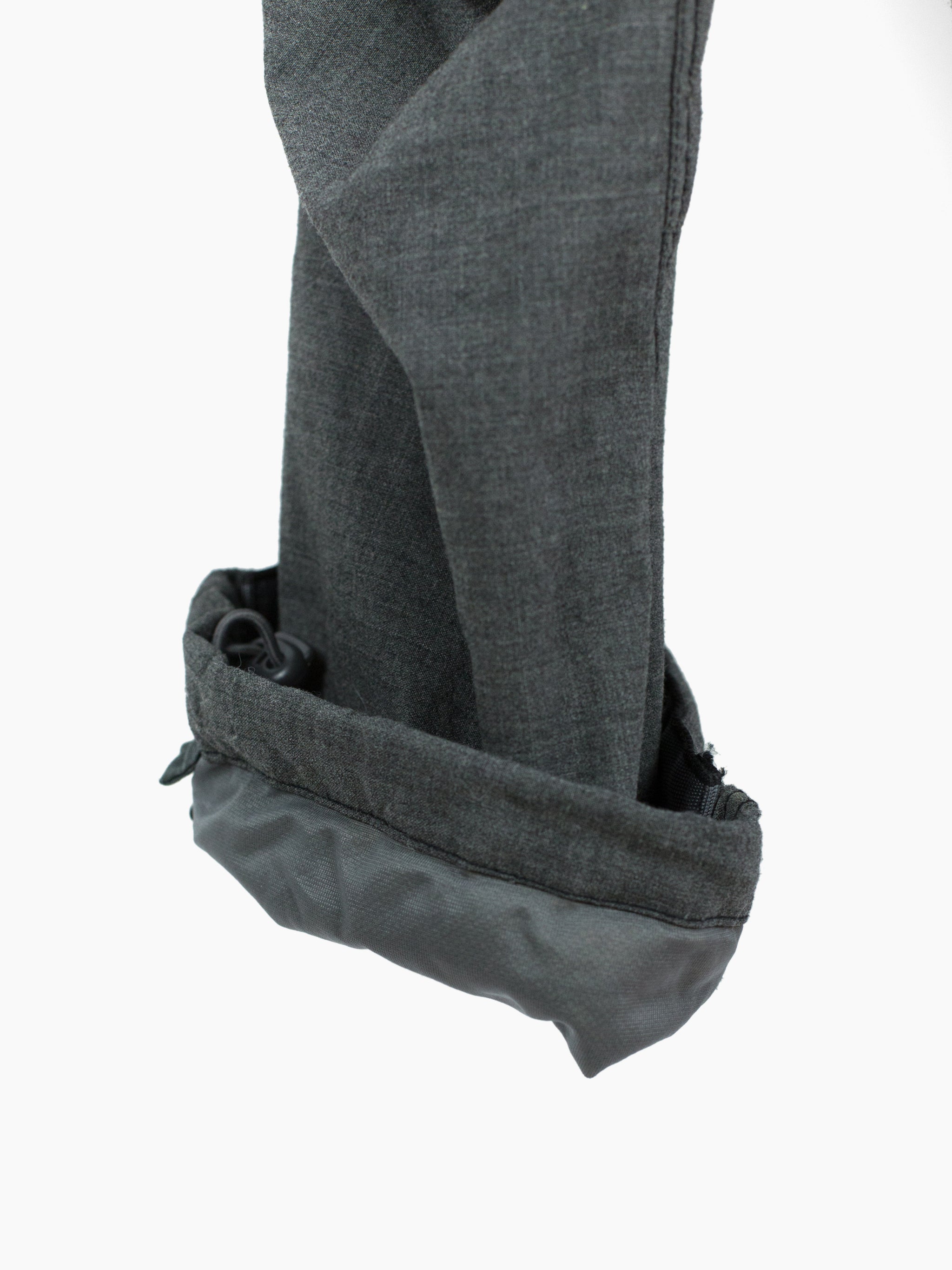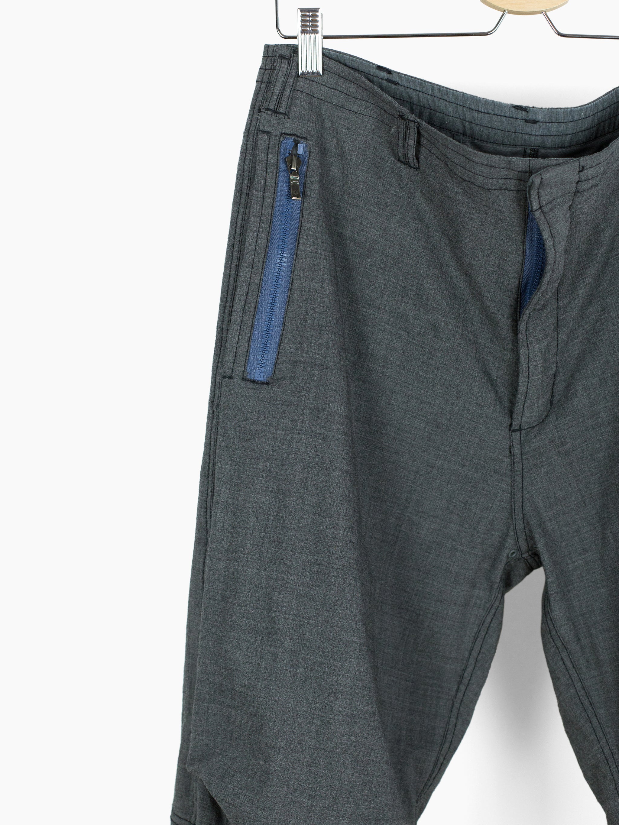 These vintage Maharishi snopants are cut in a rare Loro Piana wool fabric, lending the aggressive utilitarian shape a luxurious, supple drape and showcasing designer Hardy Blechman's expertise in fusing disparate menswear elements into a cutting-edge street-ready package. Draped pleats at the knees draw from military cargo pants, the fine Loro Piana wool outer points towards tailored trousers, and the shockcord hem and technical polyester lining inject a sportswear atmosphere. There are double the pockets at the waist, with a set of secure zippered ones sitting atop more traditional slash pockets and even the belt loops are doubled. The result is a hybrid trouser that artfully fuses form and function, formality and utility.