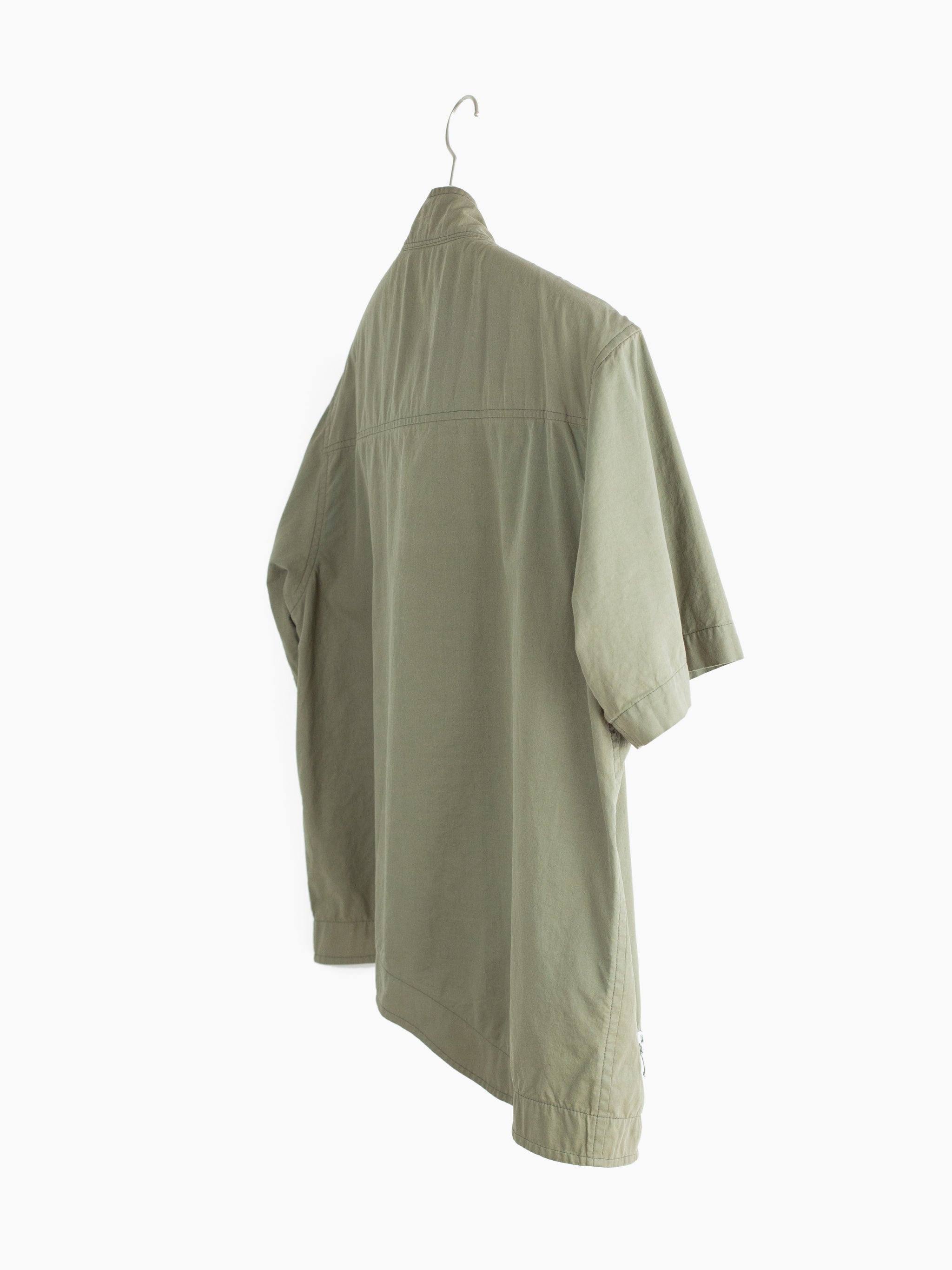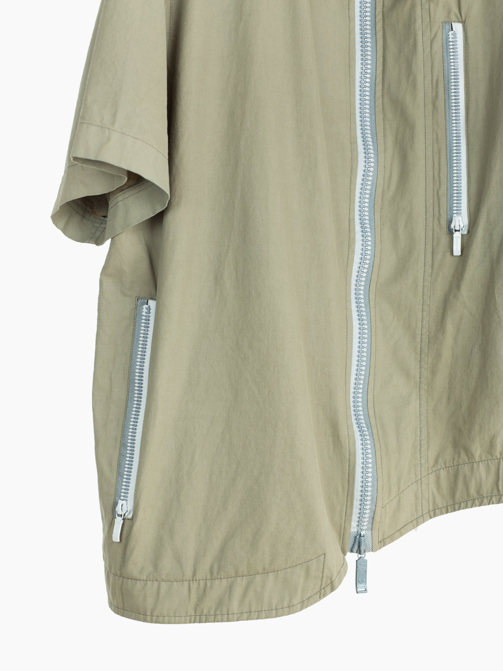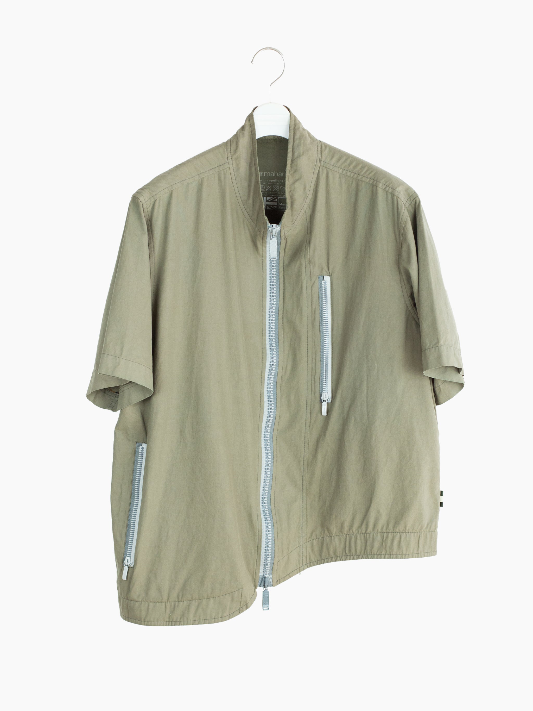 Short sleeve zip-up shirt/jacket from early 2000s Maharishi features the brand's signature duo-tone zippers and asymmetrical curved hem. Functions as a great layering piece, either over something with longer sleeves or under shorter outerwear, letting the hem detail peek out from underneath. This piece opens up a wealth of styling possibilities in a no-nonsense functional and wearable package.