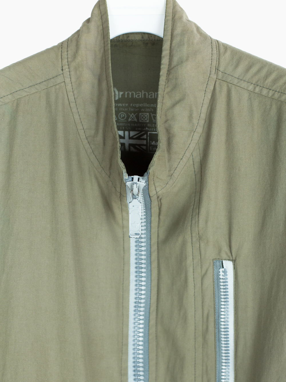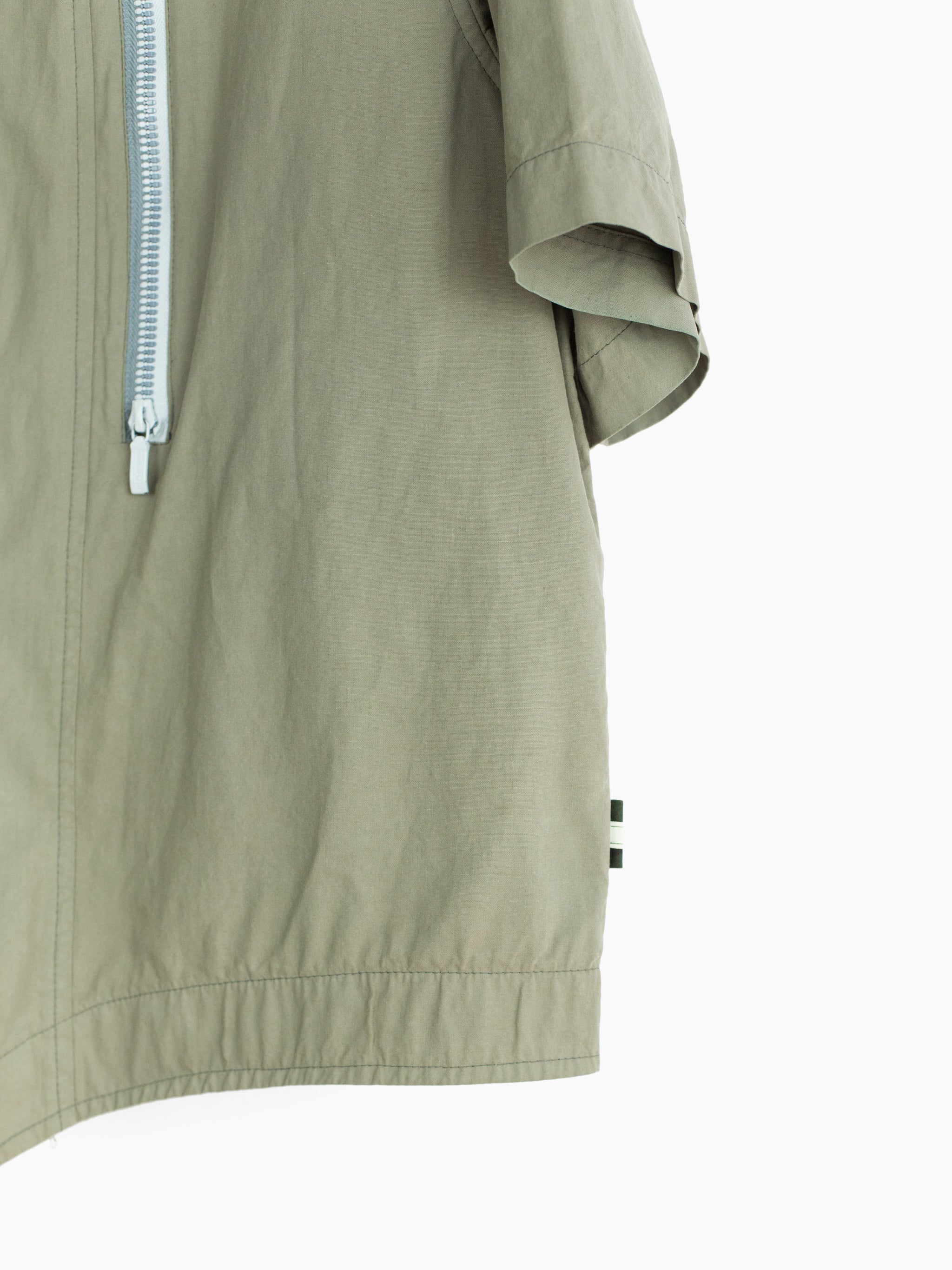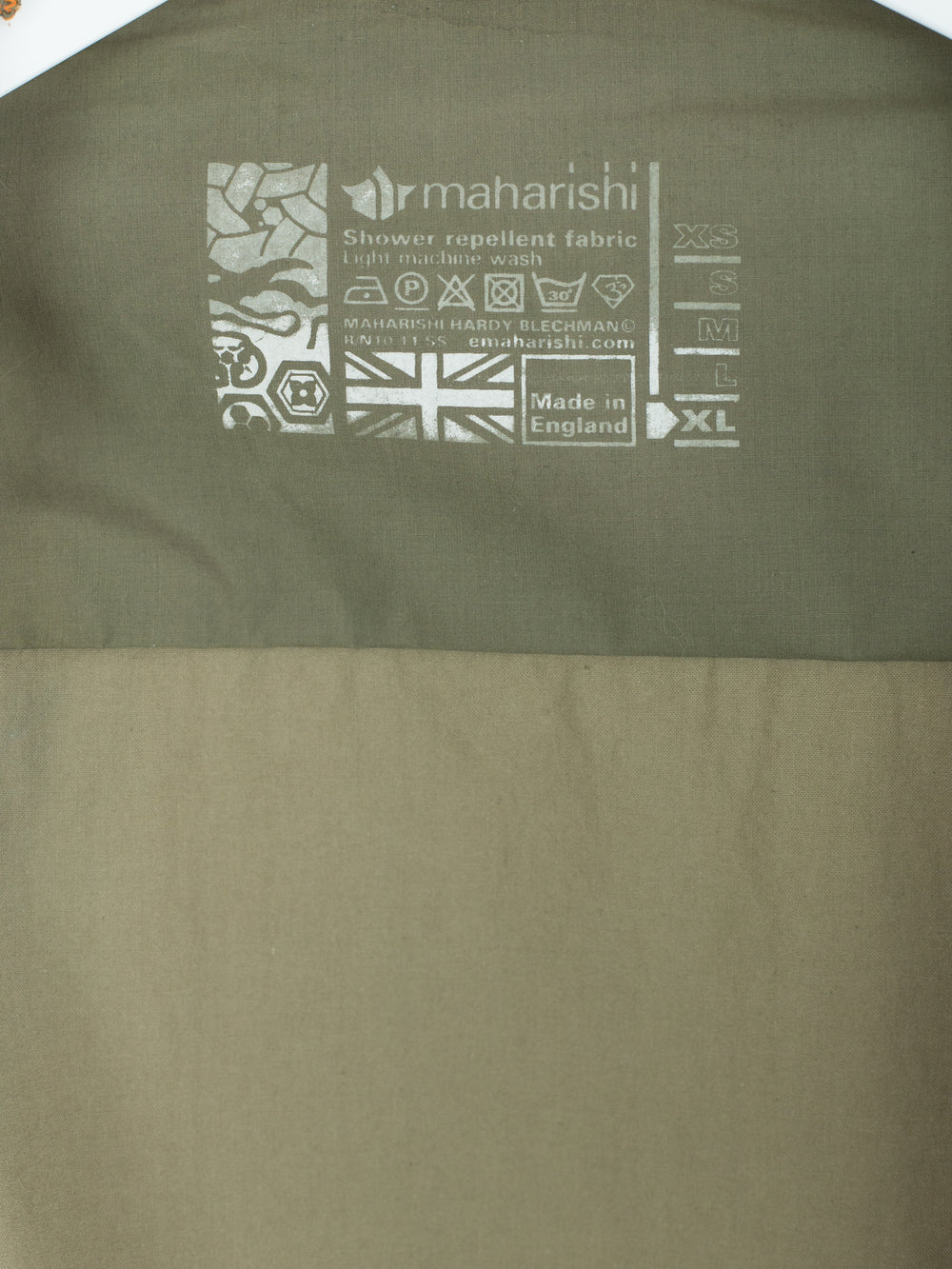 Short sleeve zip-up shirt/jacket from early 2000s Maharishi features the brand's signature duo-tone zippers and asymmetrical curved hem. Functions as a great layering piece, either over something with longer sleeves or under shorter outerwear, letting the hem detail peek out from underneath. This piece opens up a wealth of styling possibilities in a no-nonsense functional and wearable package.