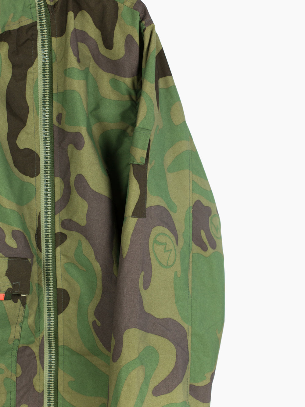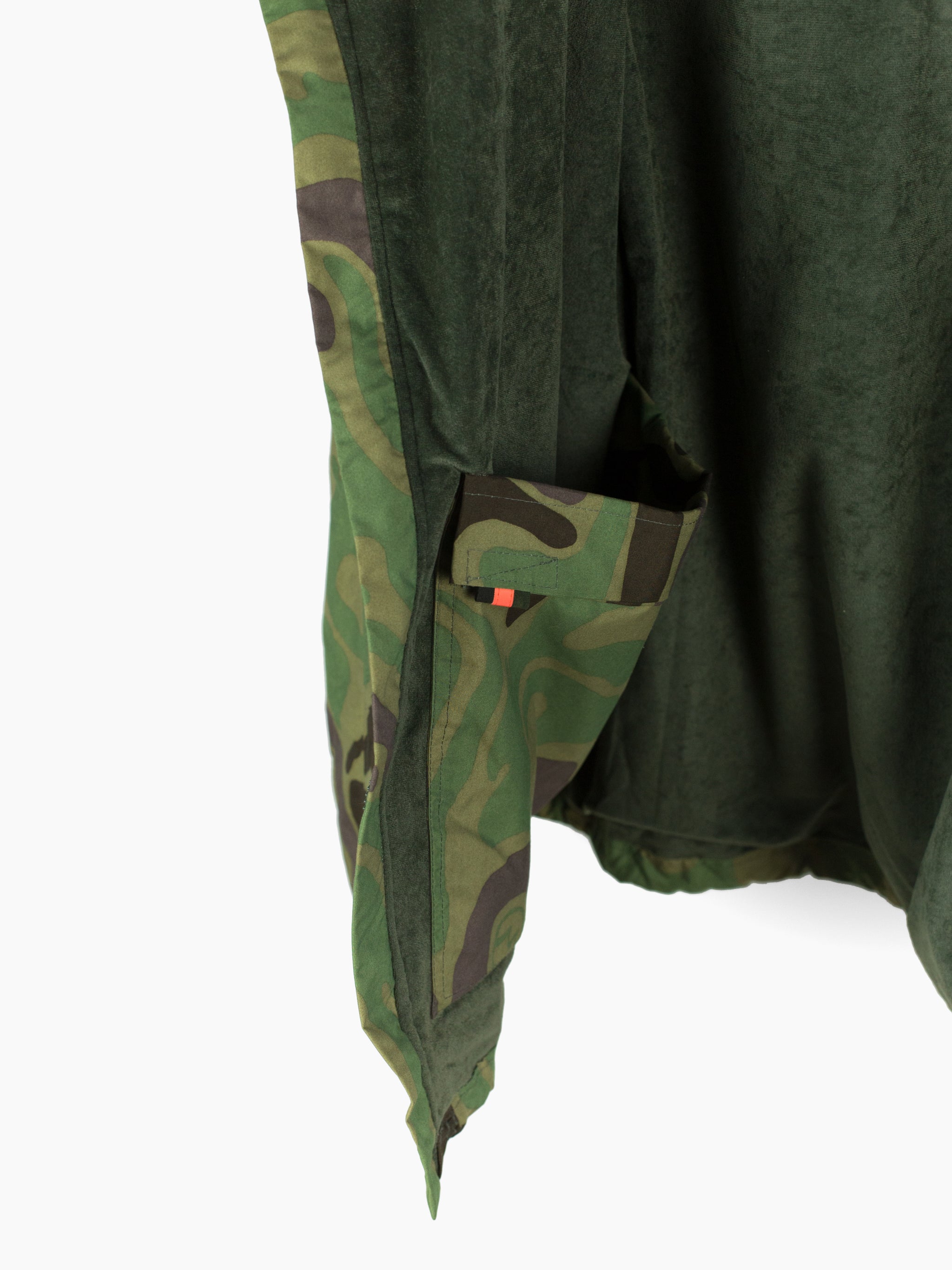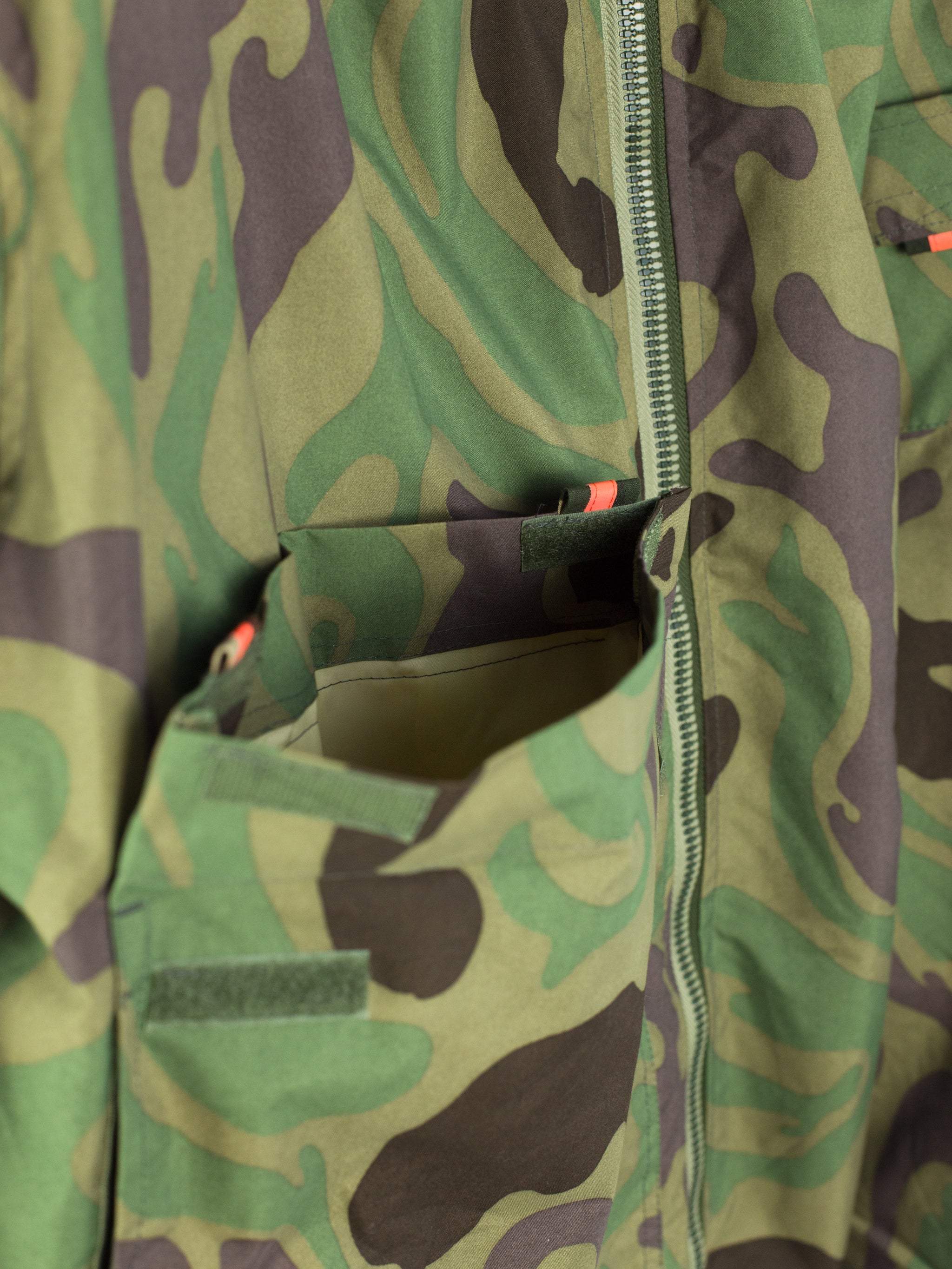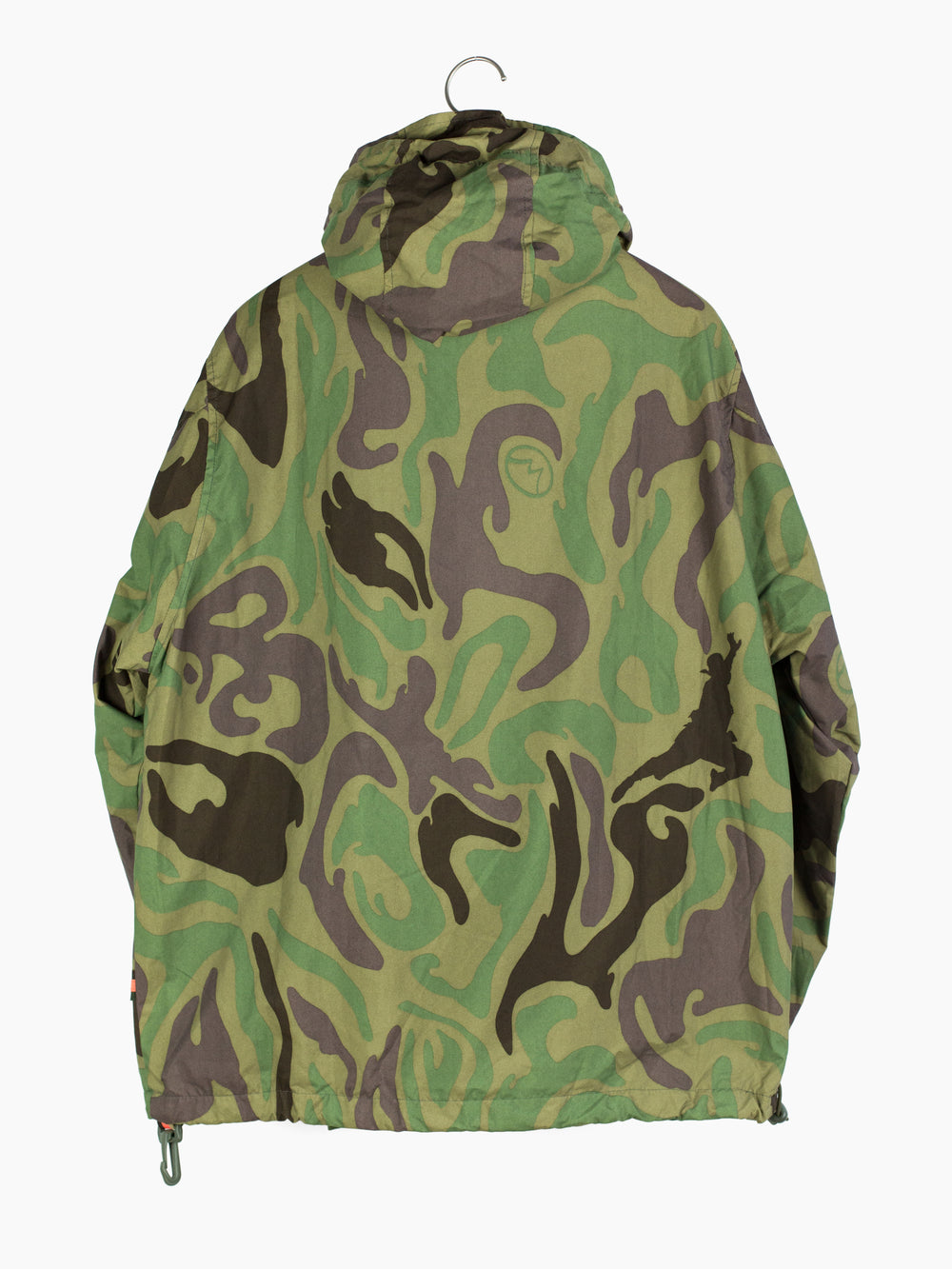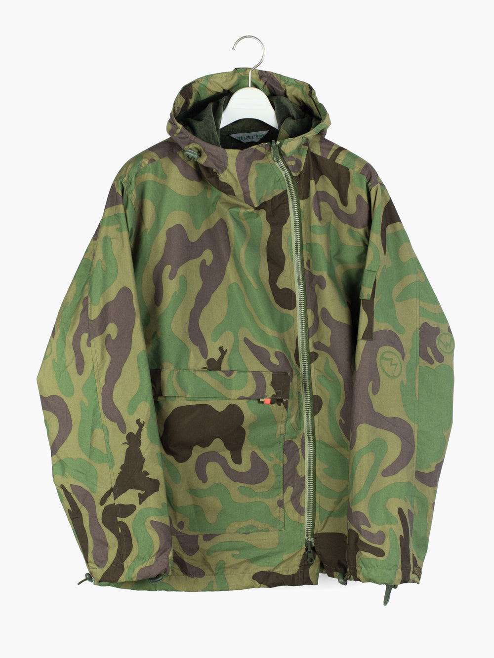 Asymmetrical anorak from early Maharishi (90s) featuring custom 'Maharishi' DPM camouflage that has flying ninjas, scrip logos, and circle 'M' logos hidden throughout. The jacket is cut with a high storm collar/hood with single shockcord toggle adjust, as well as sizeable double closure flap front pocket that has a side waist pocket built underneath. The lightweight face fabric has a crisp, paper-like hand with light water-resistance. Fully lined in a fleecy, lofty polyester that's reminiscent of microfiber with another flap-closed pocket mirroring the one on the outside (the interior one is not stitched at the top, creating two compartments).