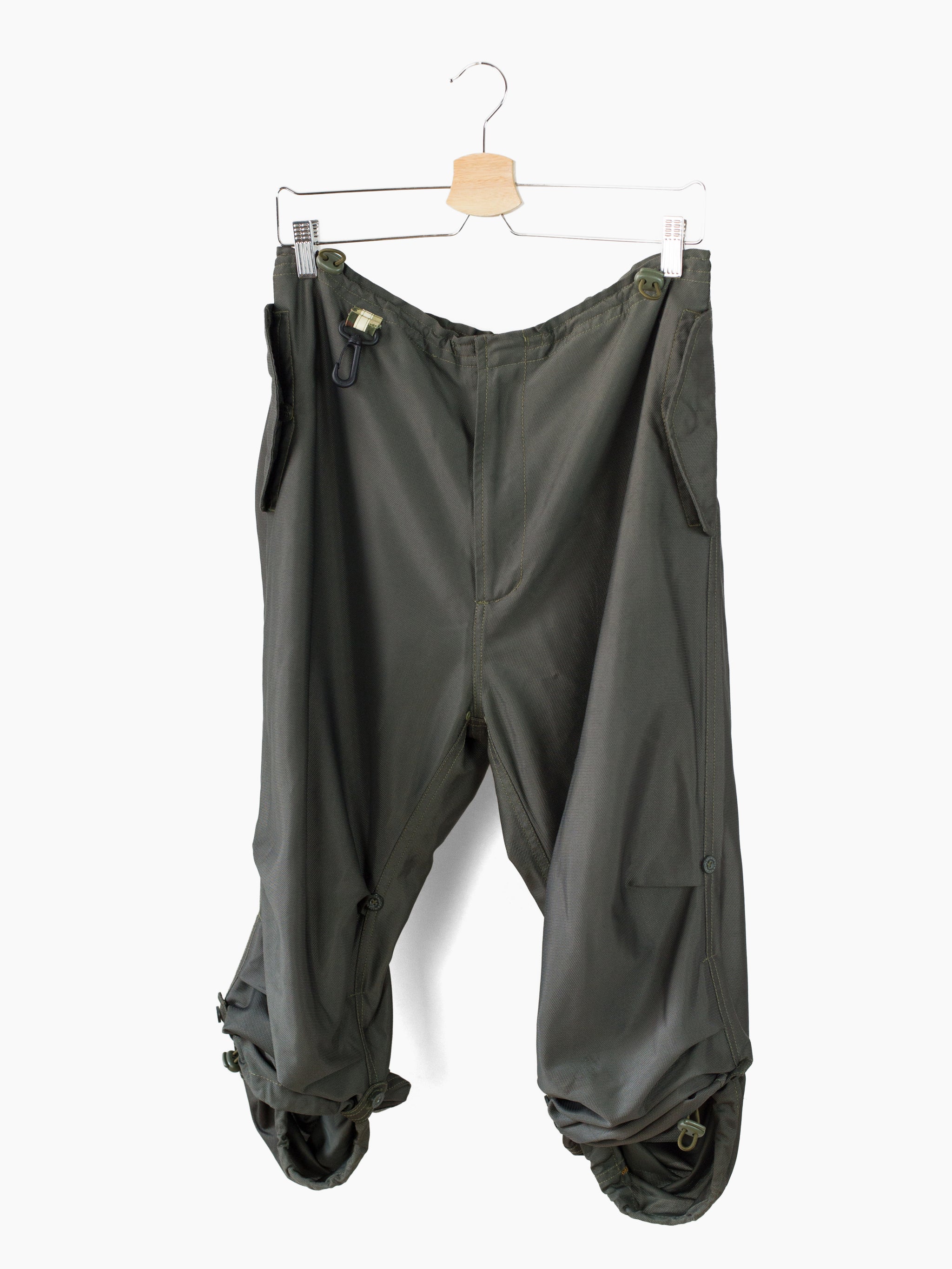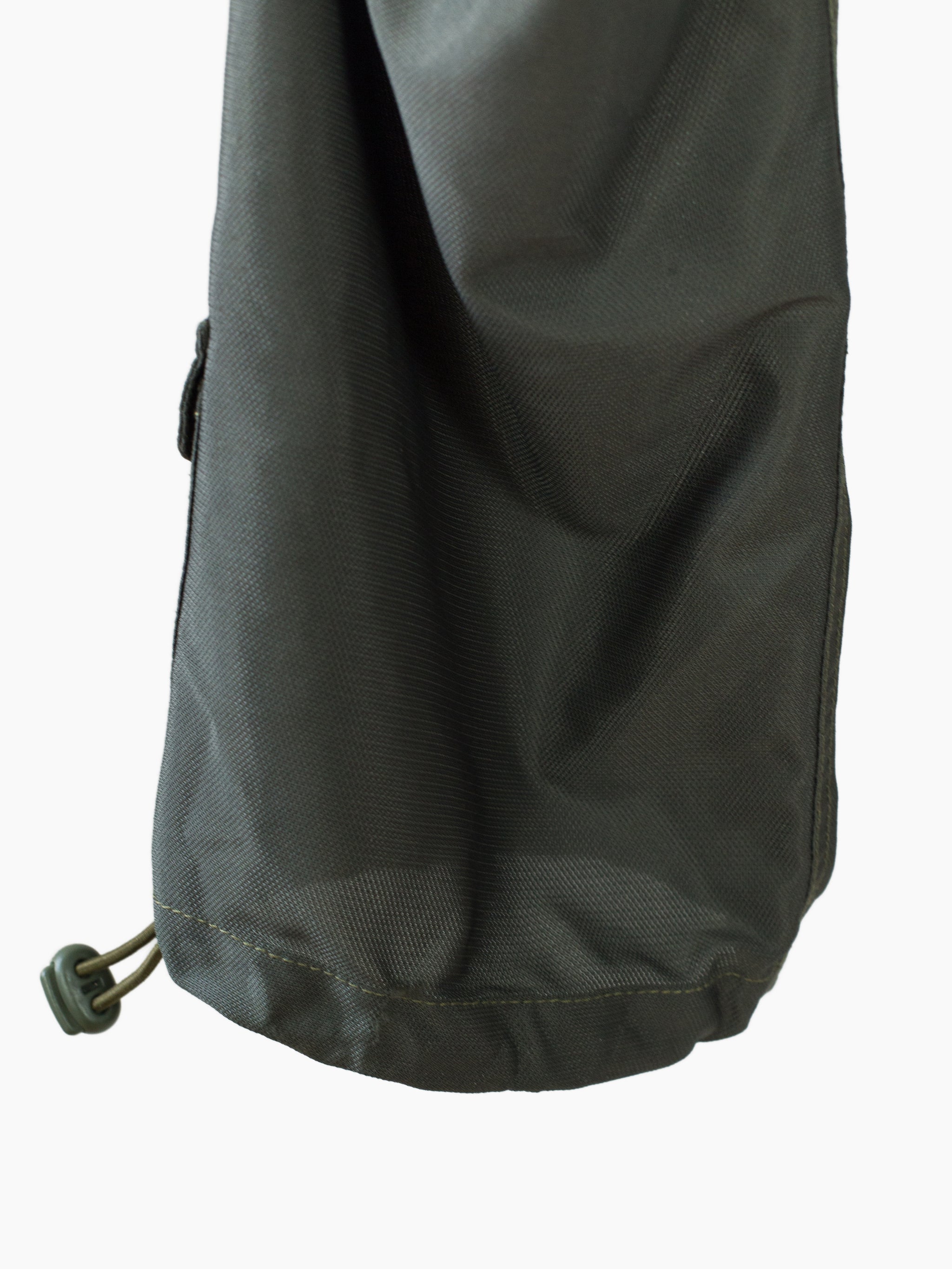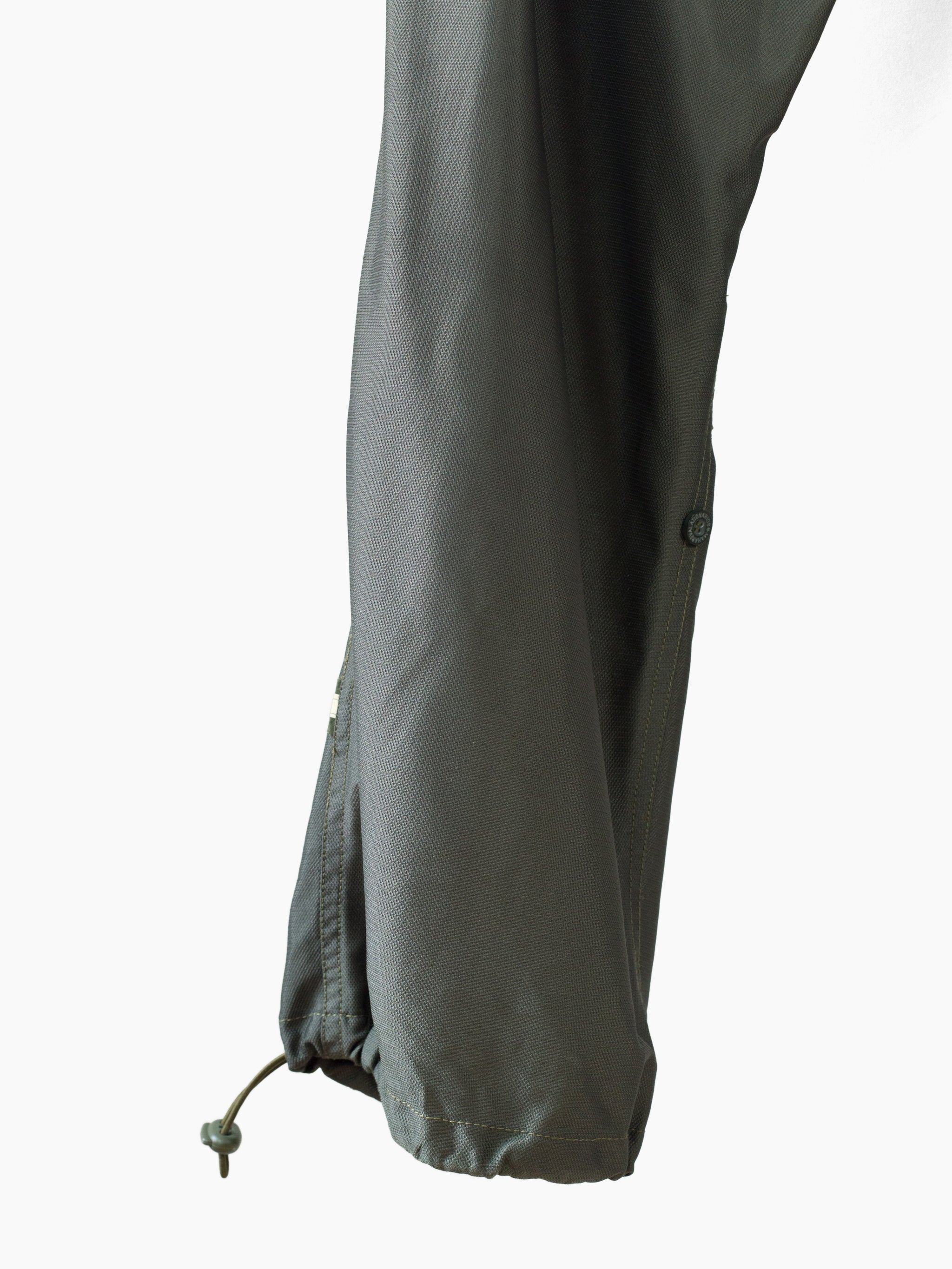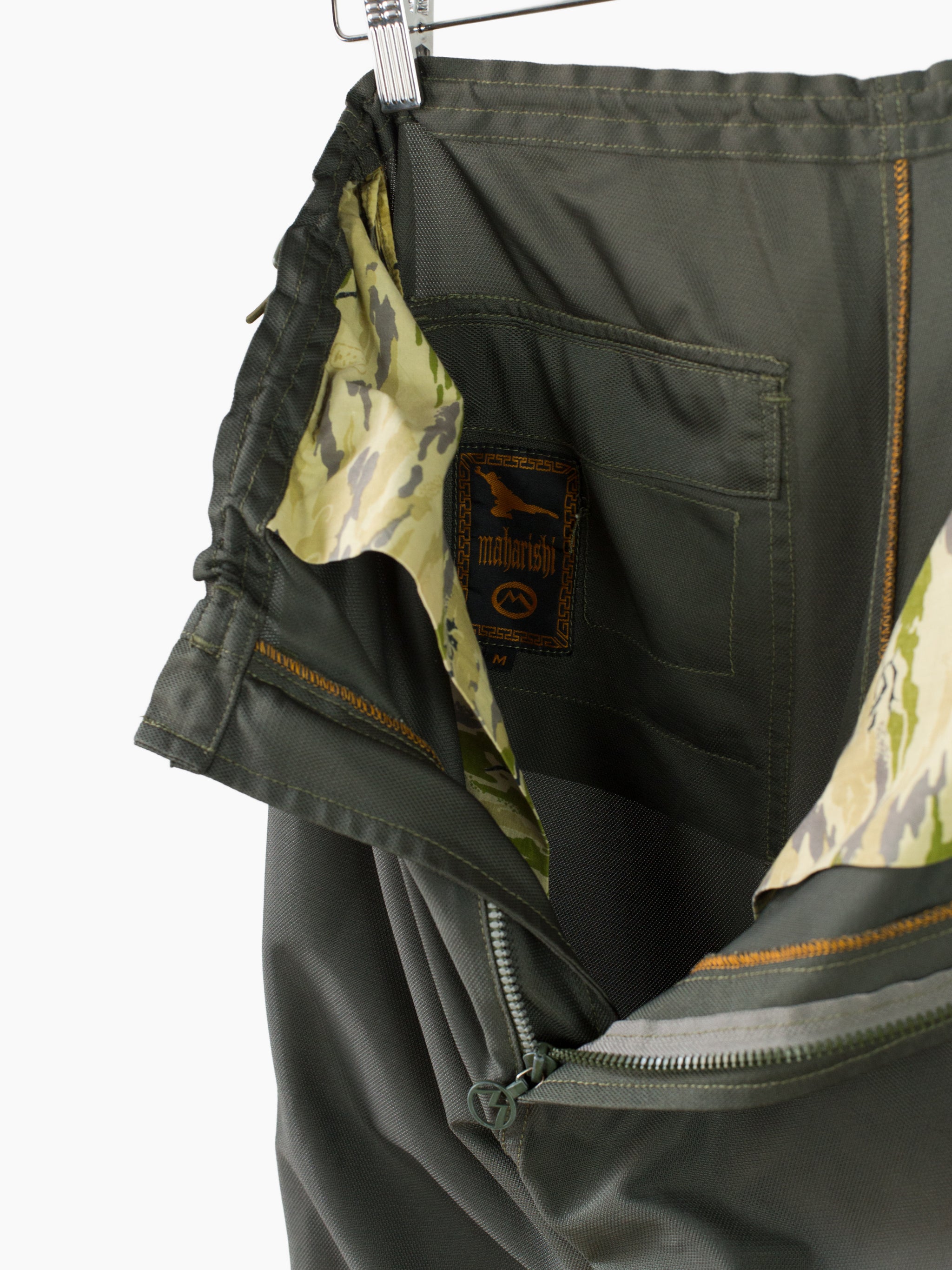Classic 90s Maharishi snopant in warm-weather optimized coolmax polyester, which is incredibly open and textured for maximum breathability/airflow and falls with a flattering, fluid drape. Includes the classic 90s snopant features, including key clip at wearer's right waist, shockcord cinch waistband, loop-button flap closed waist pockets, single detached bottom back patch pocket, and shockcord hem cinch. Also includes interior strap system to ruche the lower leg and convert from full length to 3/4 length pant or knee-length short.
