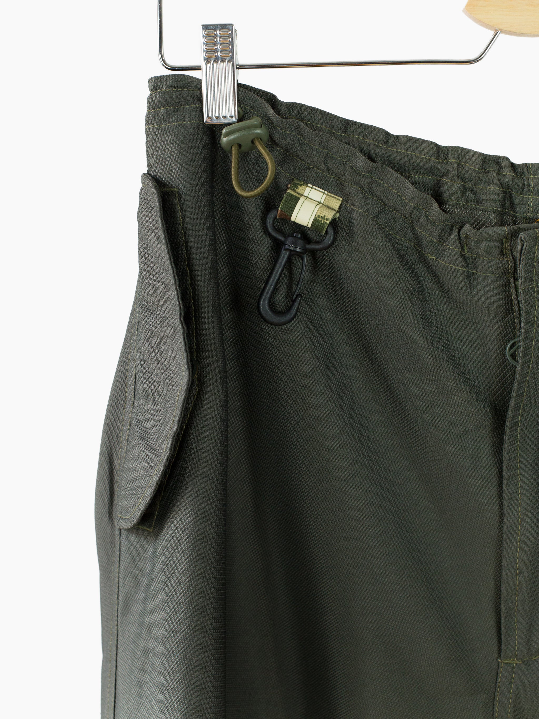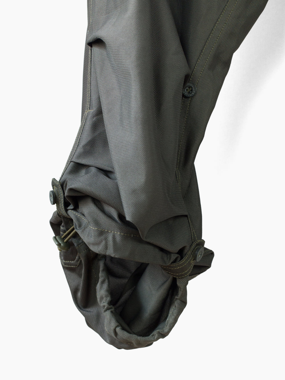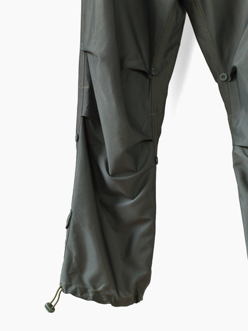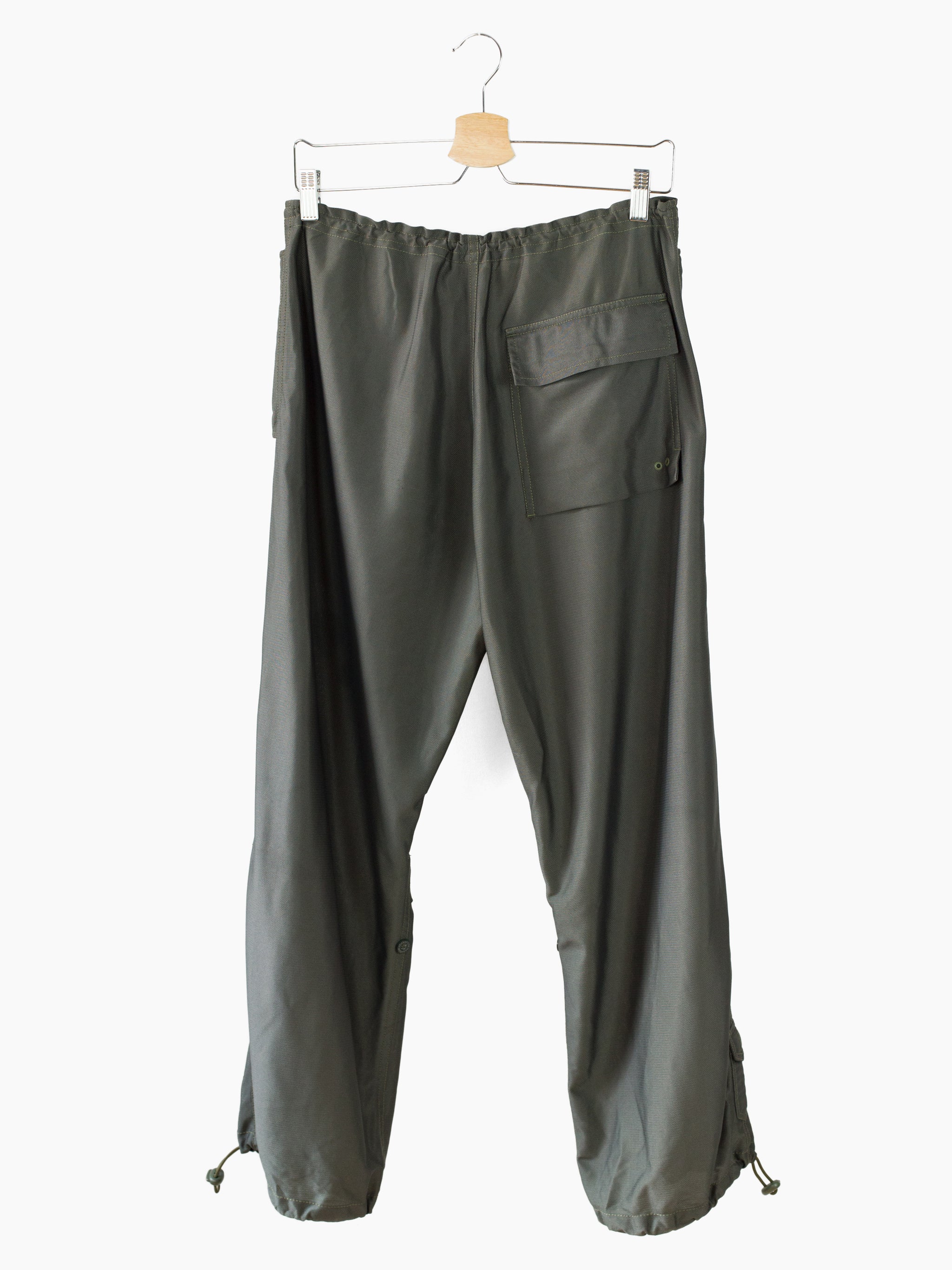 Classic 90s Maharishi snopant in warm-weather optimized coolmax polyester, which is incredibly open and textured for maximum breathability/airflow and falls with a flattering, fluid drape. Includes the classic 90s snopant features, including key clip at wearer's right waist, shockcord cinch waistband, loop-button flap closed waist pockets, single detached bottom back patch pocket, and shockcord hem cinch. Also includes interior strap system to ruche the lower leg and convert from full length to 3/4 length pant or knee-length short.