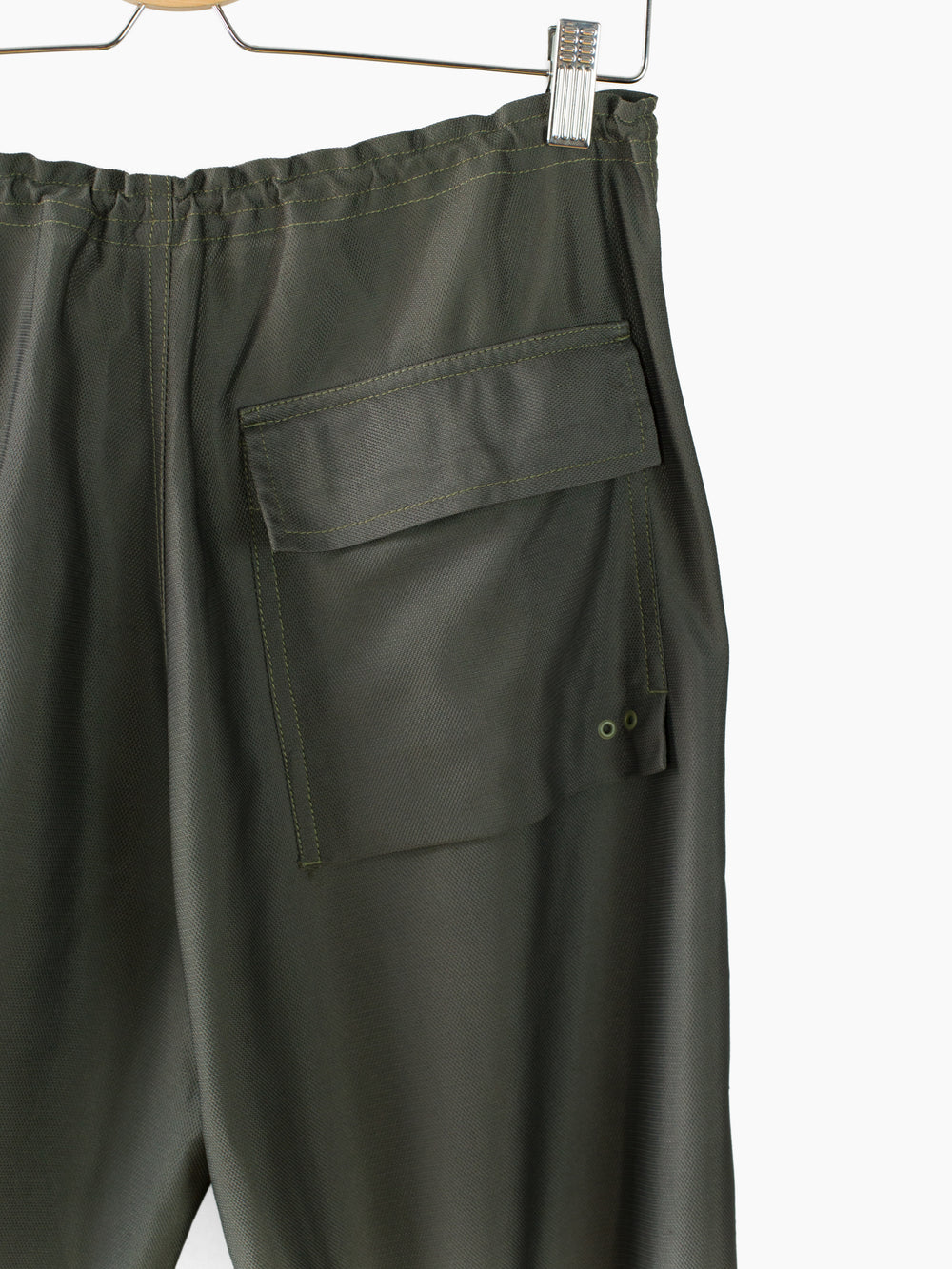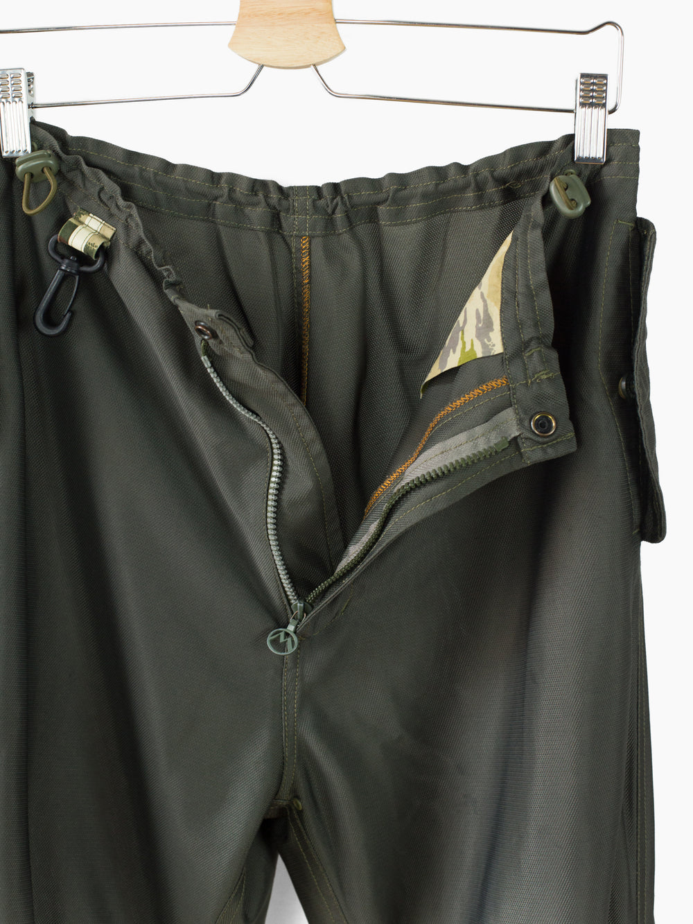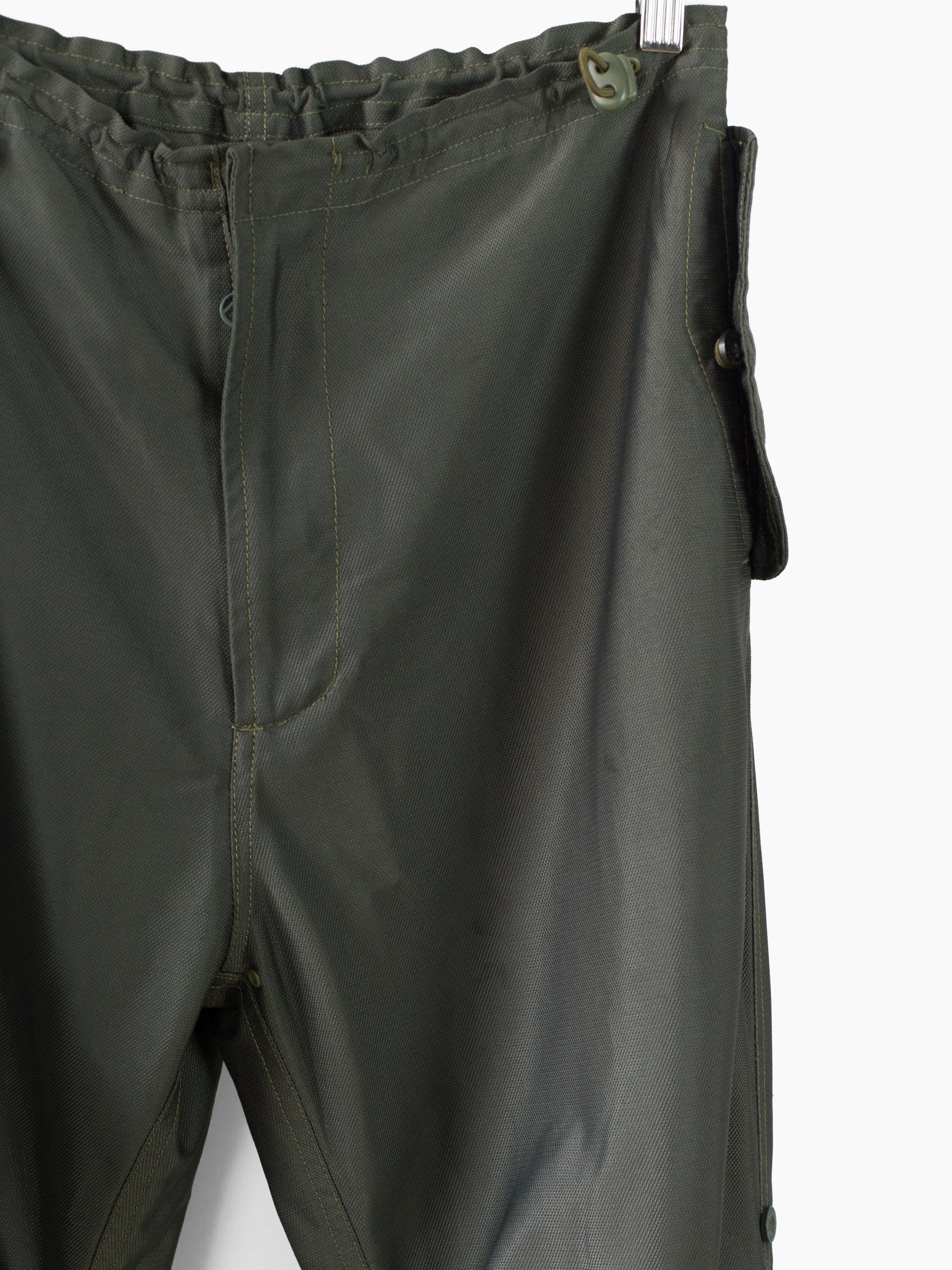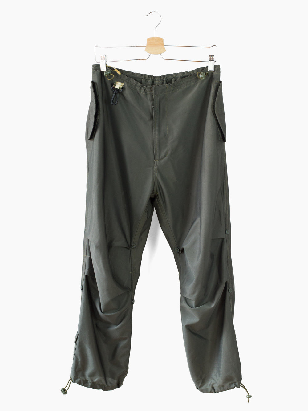 Classic 90s Maharishi snopant in warm-weather optimized coolmax polyester, which is incredibly open and textured for maximum breathability/airflow and falls with a flattering, fluid drape. Includes the classic 90s snopant features, including key clip at wearer's right waist, shockcord cinch waistband, loop-button flap closed waist pockets, single detached bottom back patch pocket, and shockcord hem cinch. Also includes interior strap system to ruche the lower leg and convert from full length to 3/4 length pant or knee-length short.