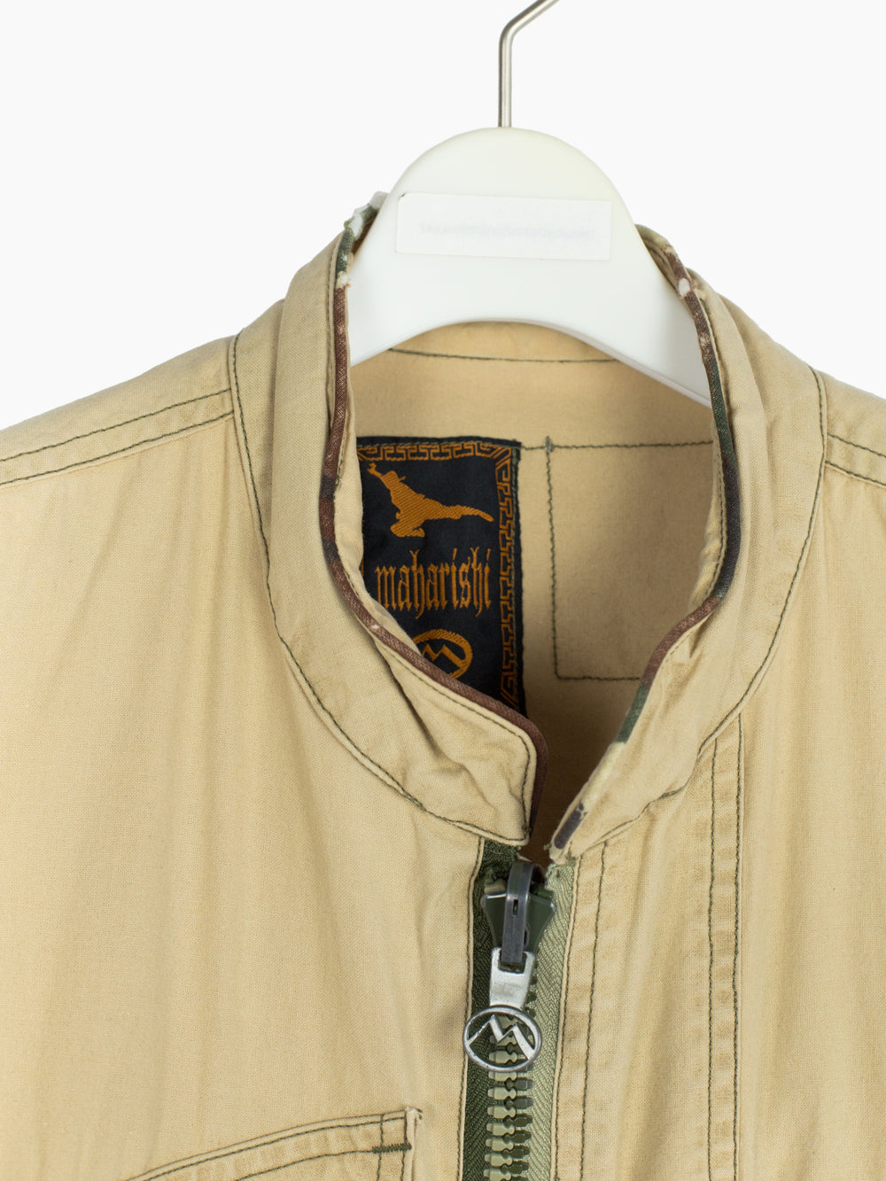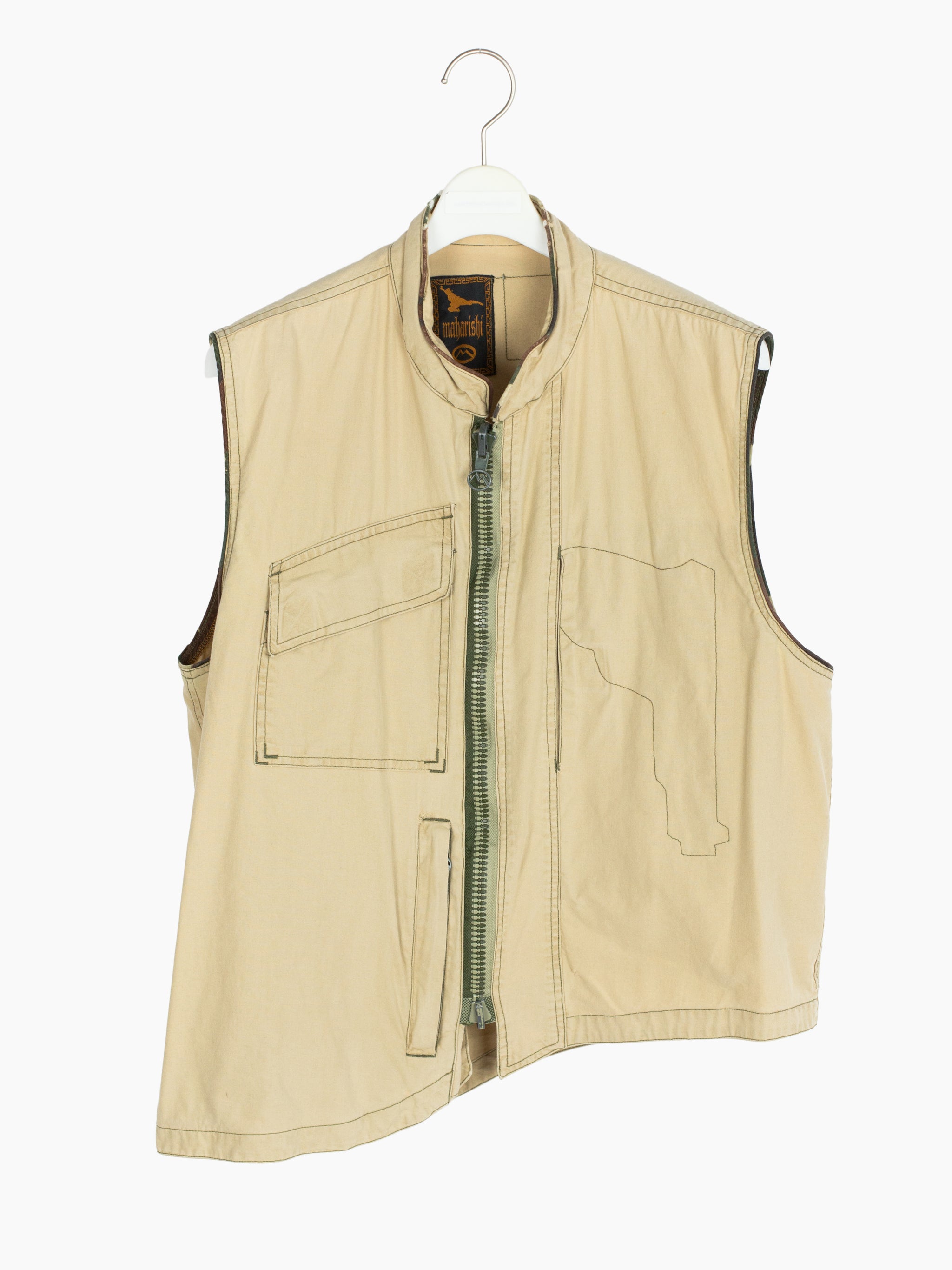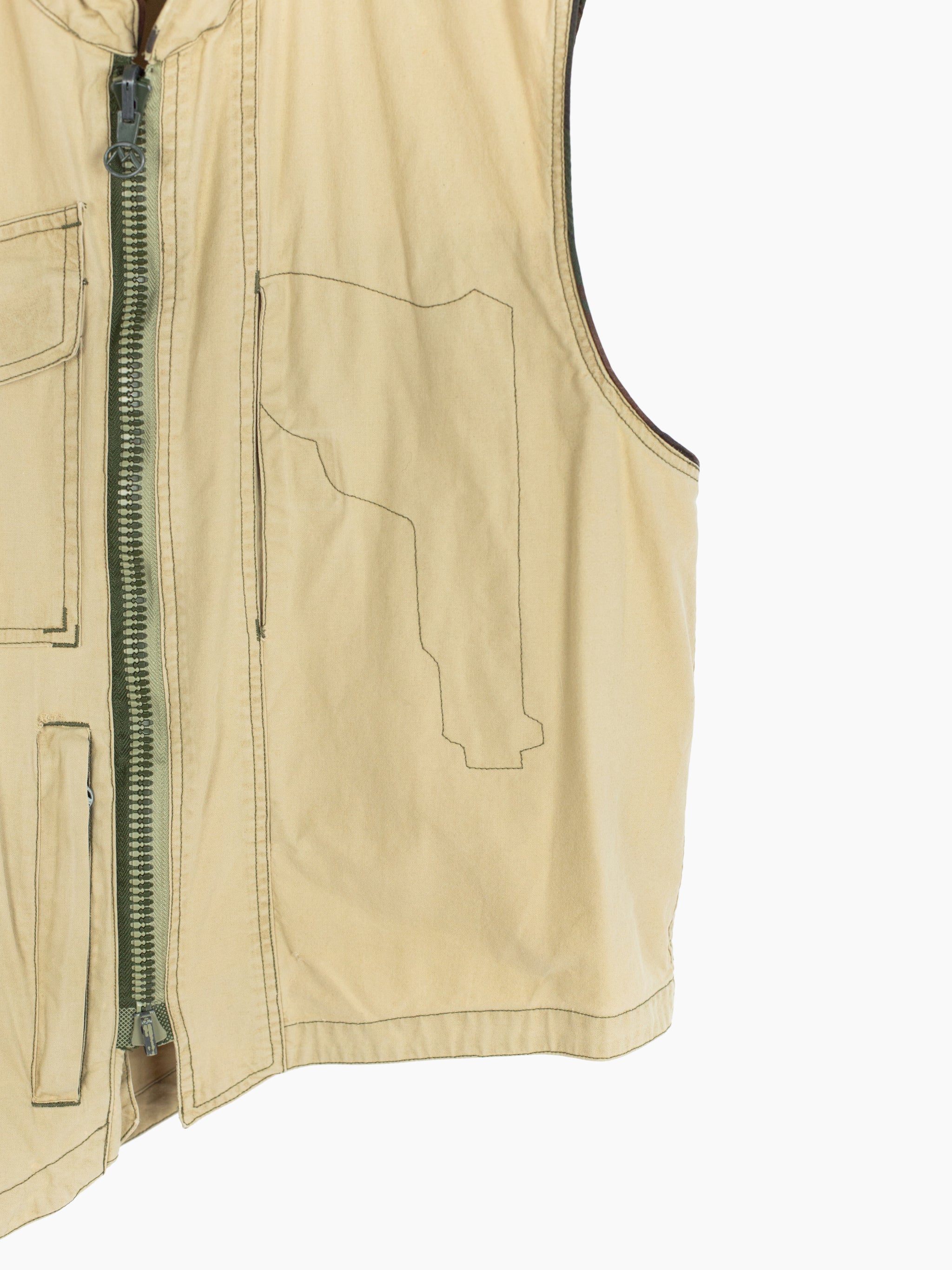 Asymmetrical Flak vest from 90s Maharishi featuring a stitched gun silhouette on the wearer's left napoleon chest pocket. Features classic Maharishi detailing like asymmetrical hemline, two-tone center front zip, and camouflage piping.