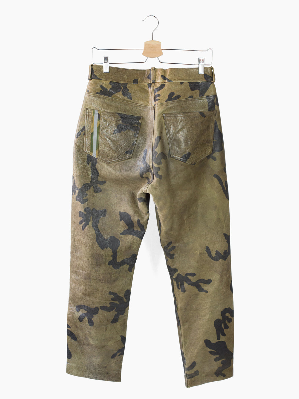 Rare full leather 'jean' from 90s Maharishi, cut in a thick cowhide that's been painted with a custom brown/olive/black camouflage. Features 5 pocket design, star-decorated vintage-style copper shanks, and Maharishi signature 3M stripe detail at wearer's left back patch pocket. 3/4 lined in a durable nylon/cotton blend fabric for next to skin comfort.