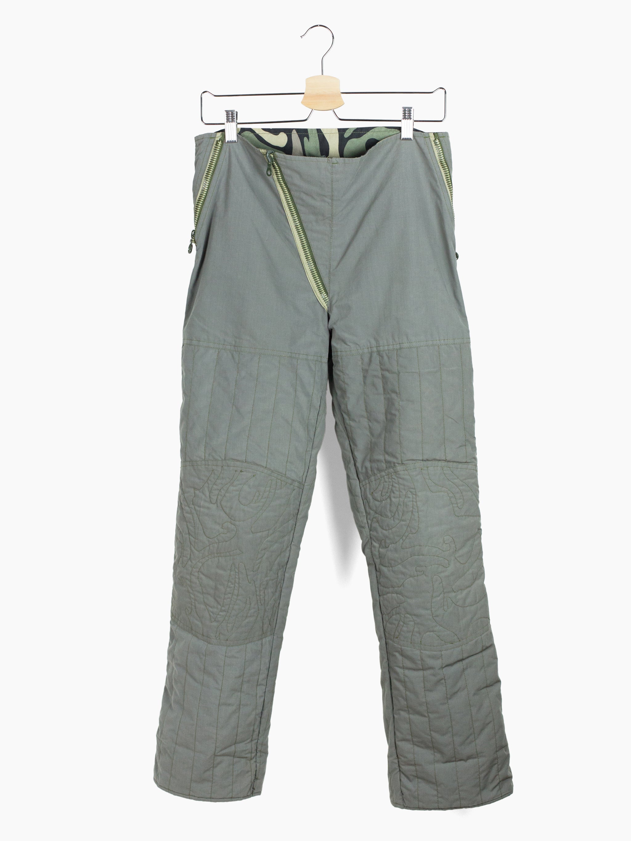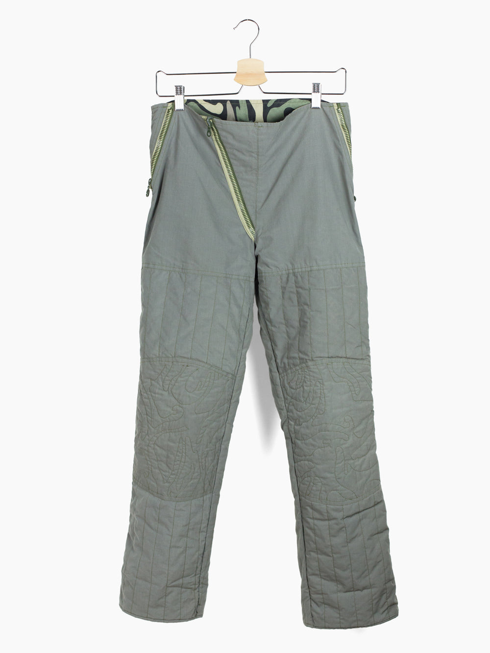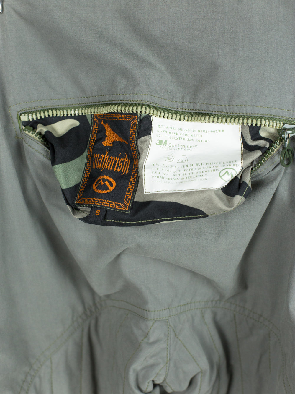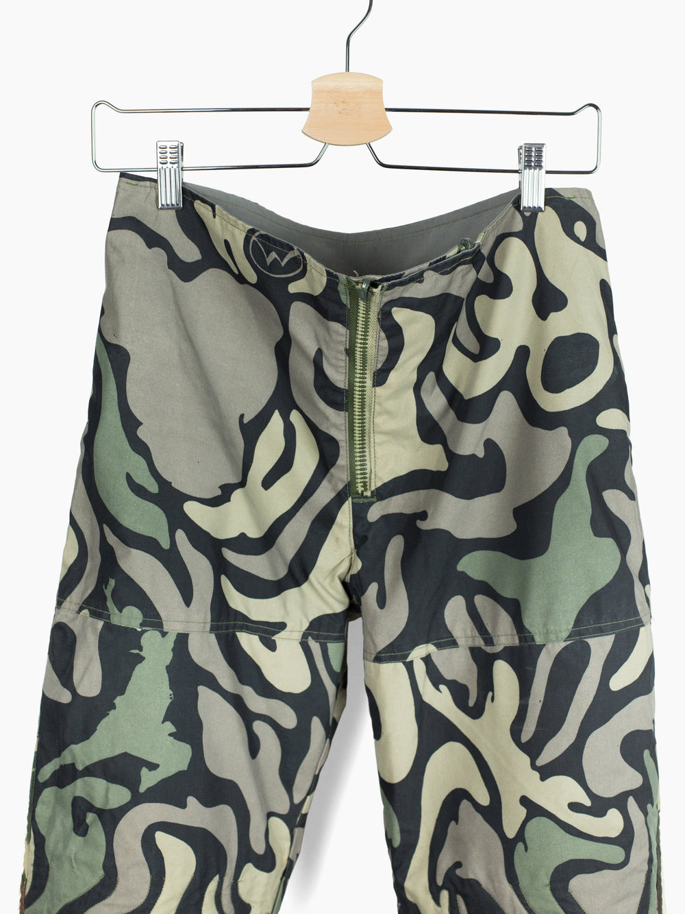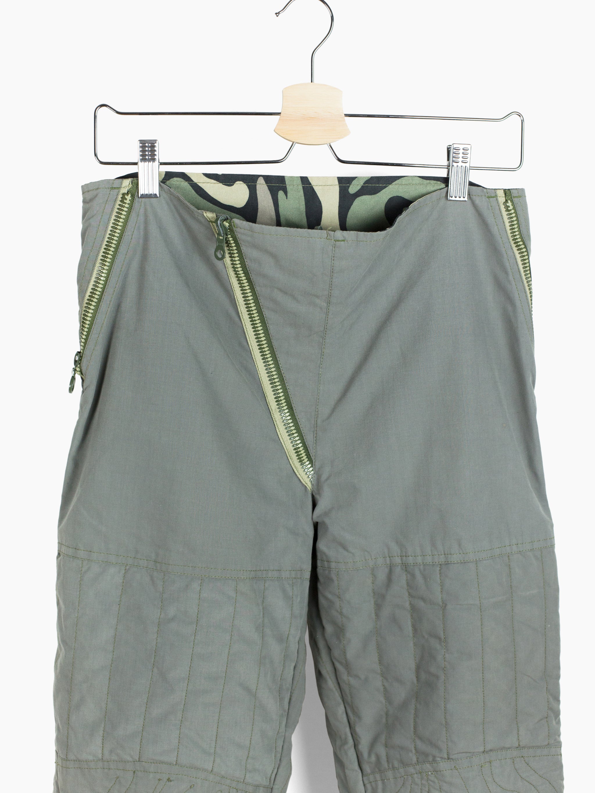 Fully reversible dual-layer quilted moto trousers from Maharishi. The grey side features a full set of functional details, such as zippered entry waist pockets and two-way openable back dump pocket. The quilt stitch used around the knees matches the camouflage pattern of the backside perfectly, projecting the graphic outwards towards the other side in a beautiful aesthetic touch. Double layer fly closed with two reversible zips means the crotch is openable from either side. Camouflage backside features a custom Maharishi DPM pattern with hidden 'M' Lettermark, ninjas, and Maharishi Script. Detailed with reflective + camouflage tape on the outseam.