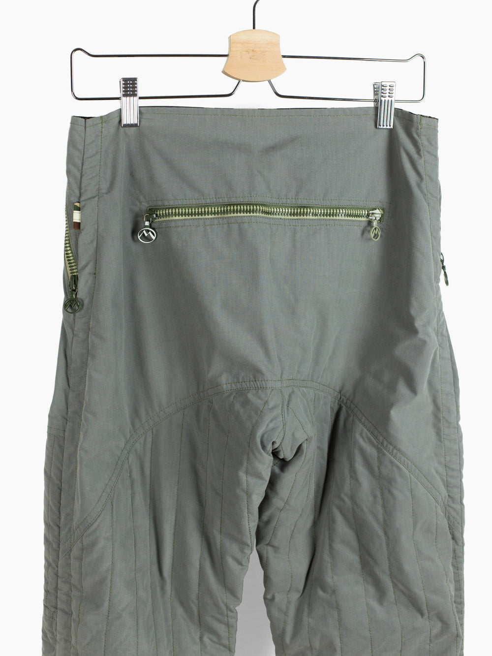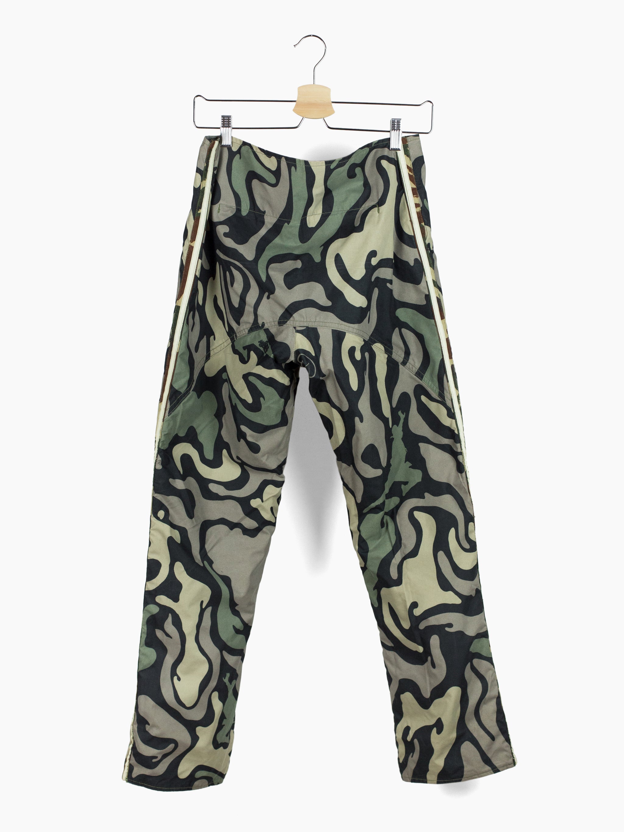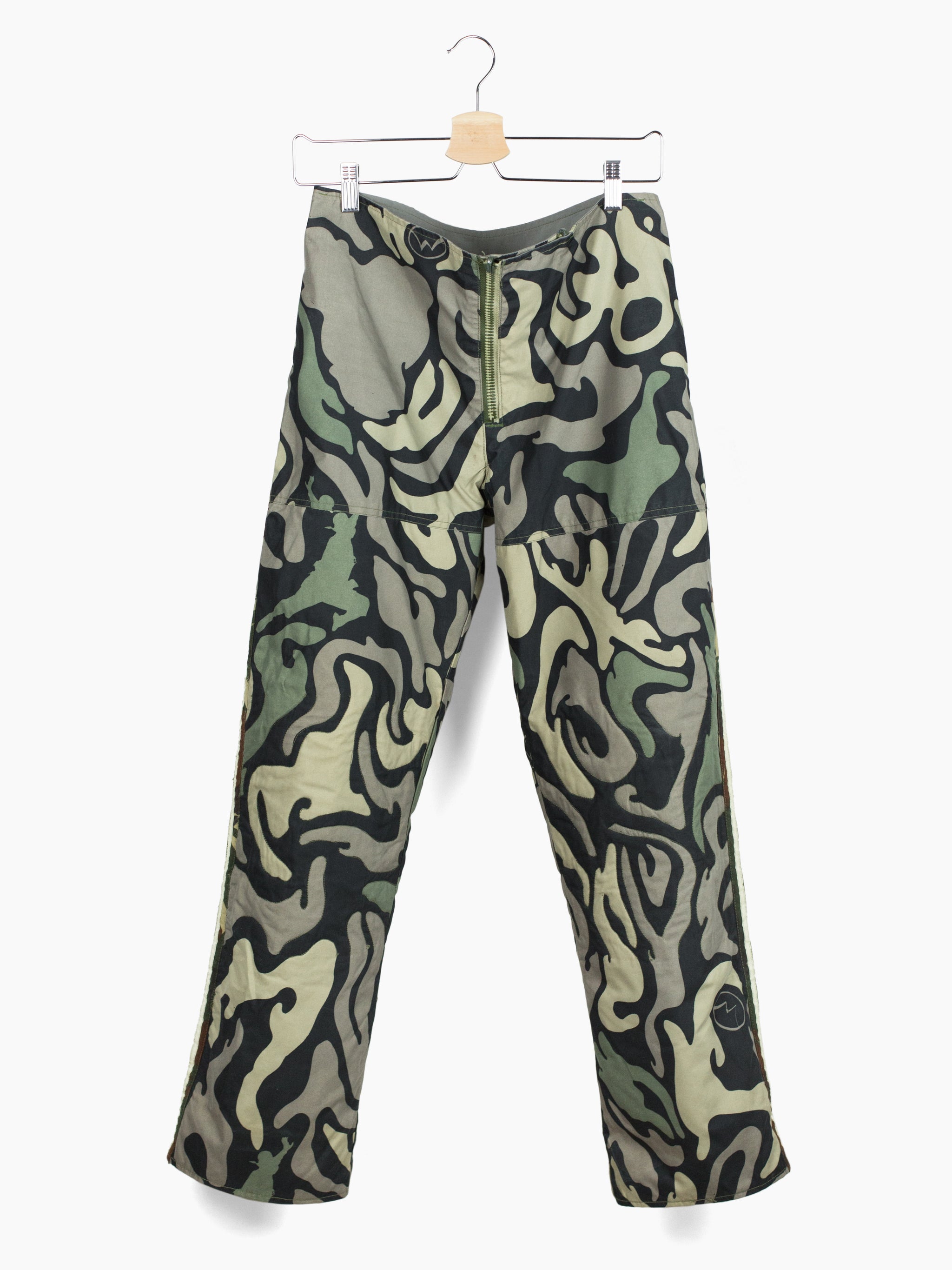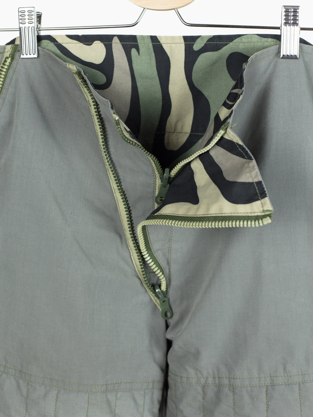Fully reversible dual-layer quilted moto trousers from Maharishi. The grey side features a full set of functional details, such as zippered entry waist pockets and two-way openable back dump pocket. The quilt stitch used around the knees matches the camouflage pattern of the backside perfectly, projecting the graphic outwards towards the other side in a beautiful aesthetic touch. Double layer fly closed with two reversible zips means the crotch is openable from either side. Camouflage backside features a custom Maharishi DPM pattern with hidden 'M' Lettermark, ninjas, and Maharishi Script. Detailed with reflective + camouflage tape on the outseam.