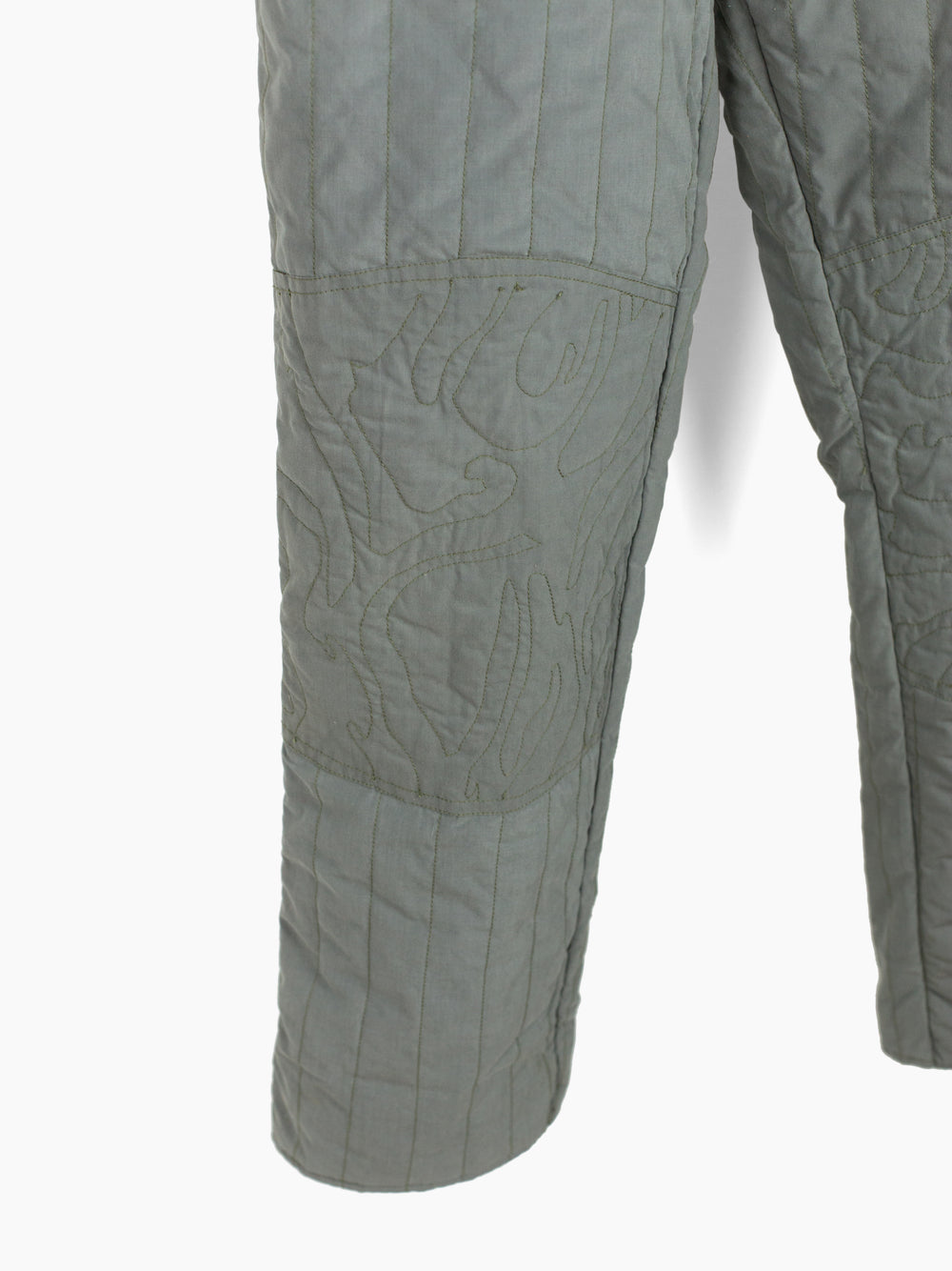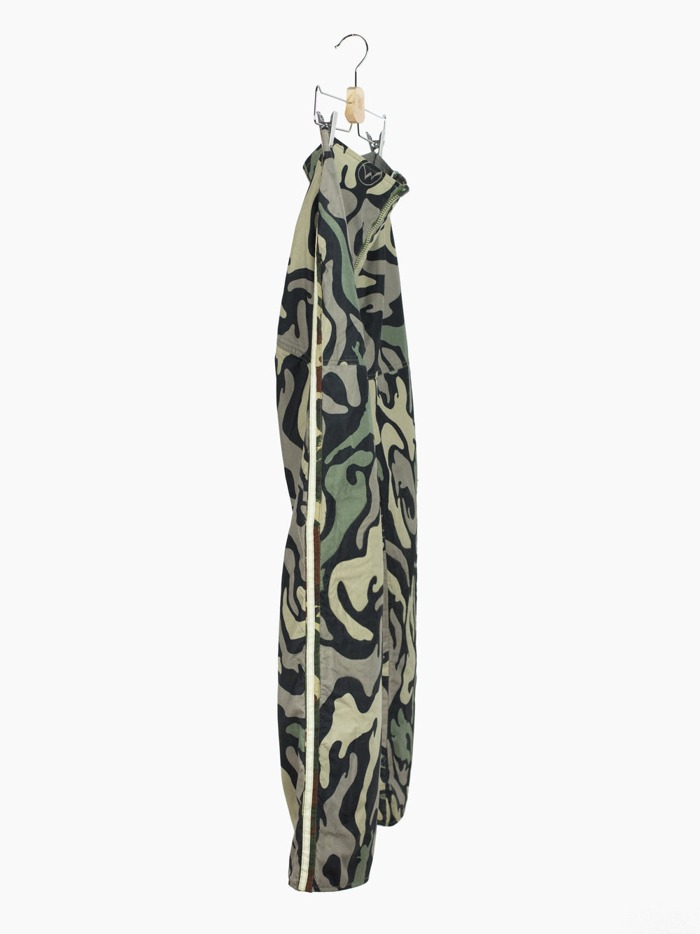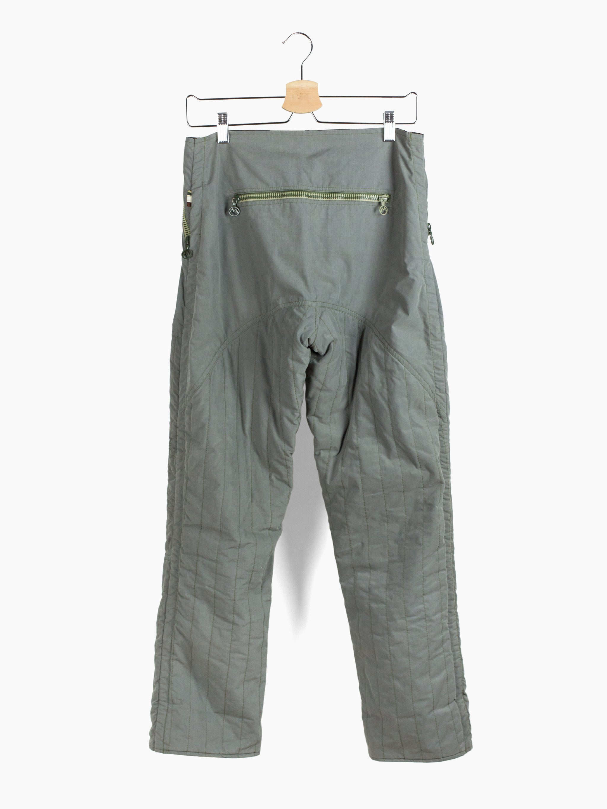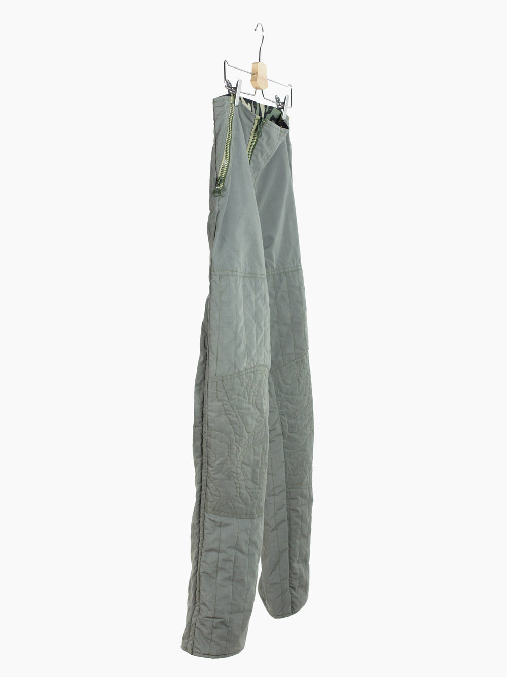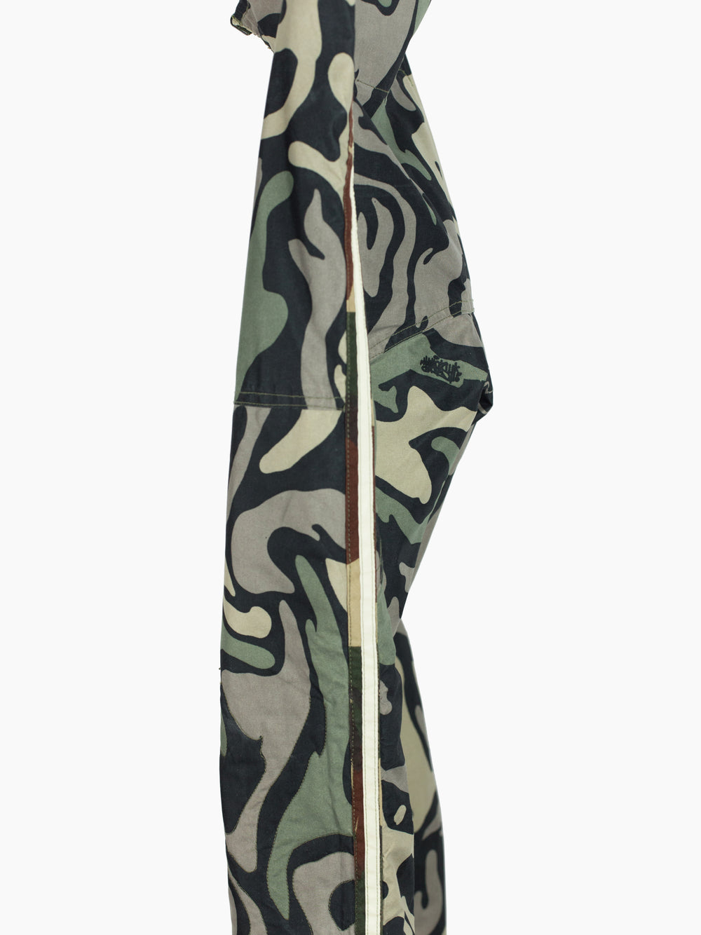 Fully reversible dual-layer quilted moto trousers from Maharishi. The grey side features a full set of functional details, such as zippered entry waist pockets and two-way openable back dump pocket. The quilt stitch used around the knees matches the camouflage pattern of the backside perfectly, projecting the graphic outwards towards the other side in a beautiful aesthetic touch. Double layer fly closed with two reversible zips means the crotch is openable from either side. Camouflage backside features a custom Maharishi DPM pattern with hidden 'M' Lettermark, ninjas, and Maharishi Script. Detailed with reflective + camouflage tape on the outseam.