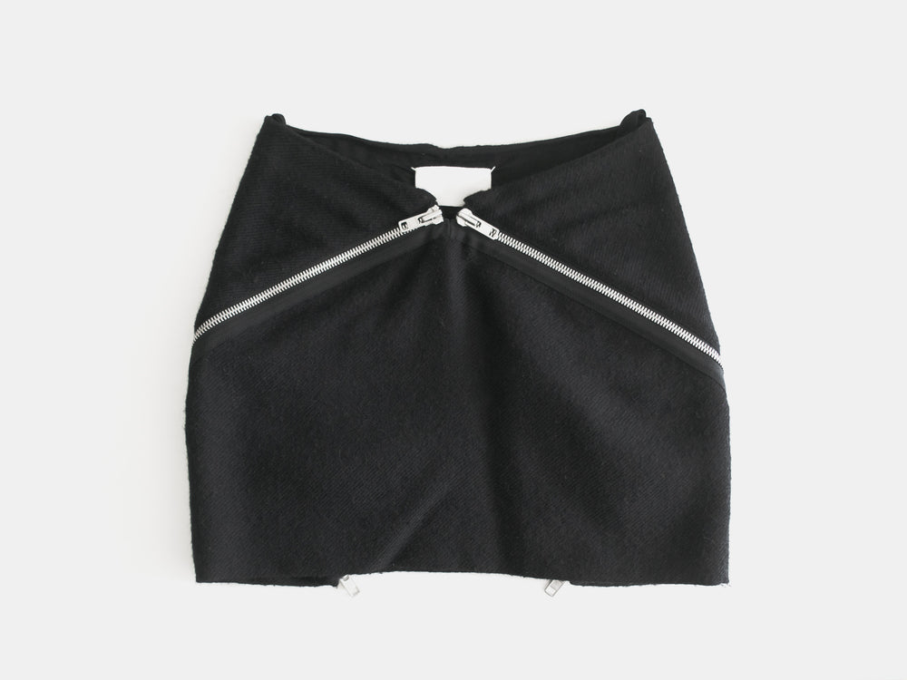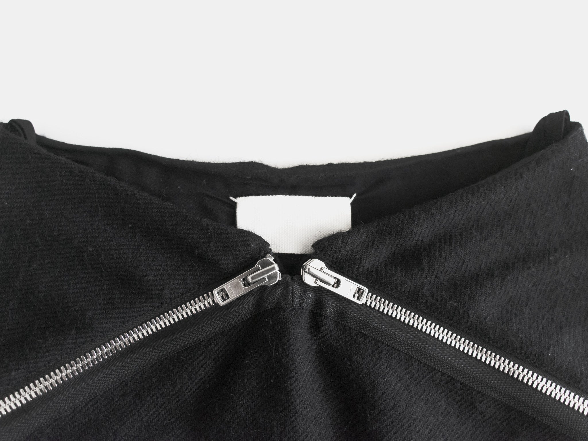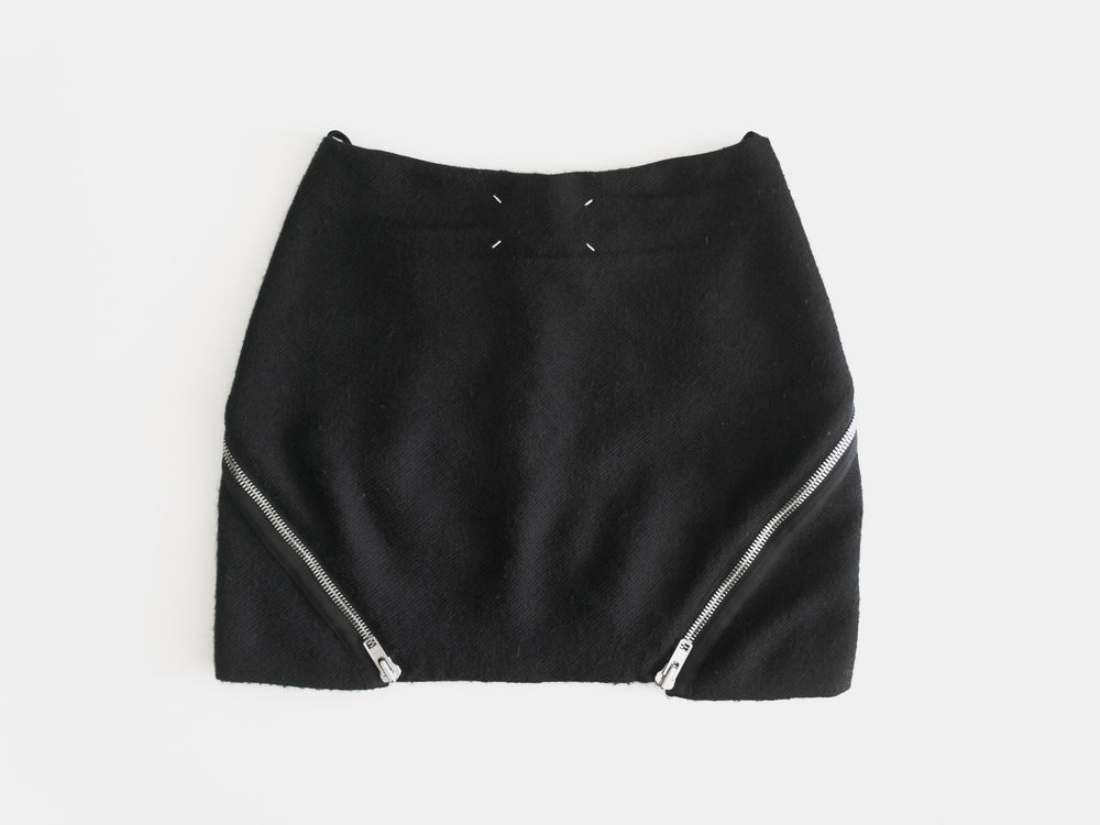 Wonderful skirt from mainline Maison Martin Margiela Autumn Winter 2008 featuring two two-way zips that wrap around the hips for an adjustable fit and edgy look with optional slits. 8/10 condition, minor pilling on the surface. Retails for $700. Made in Italy. 100% wool with a 100% cotton liner.
