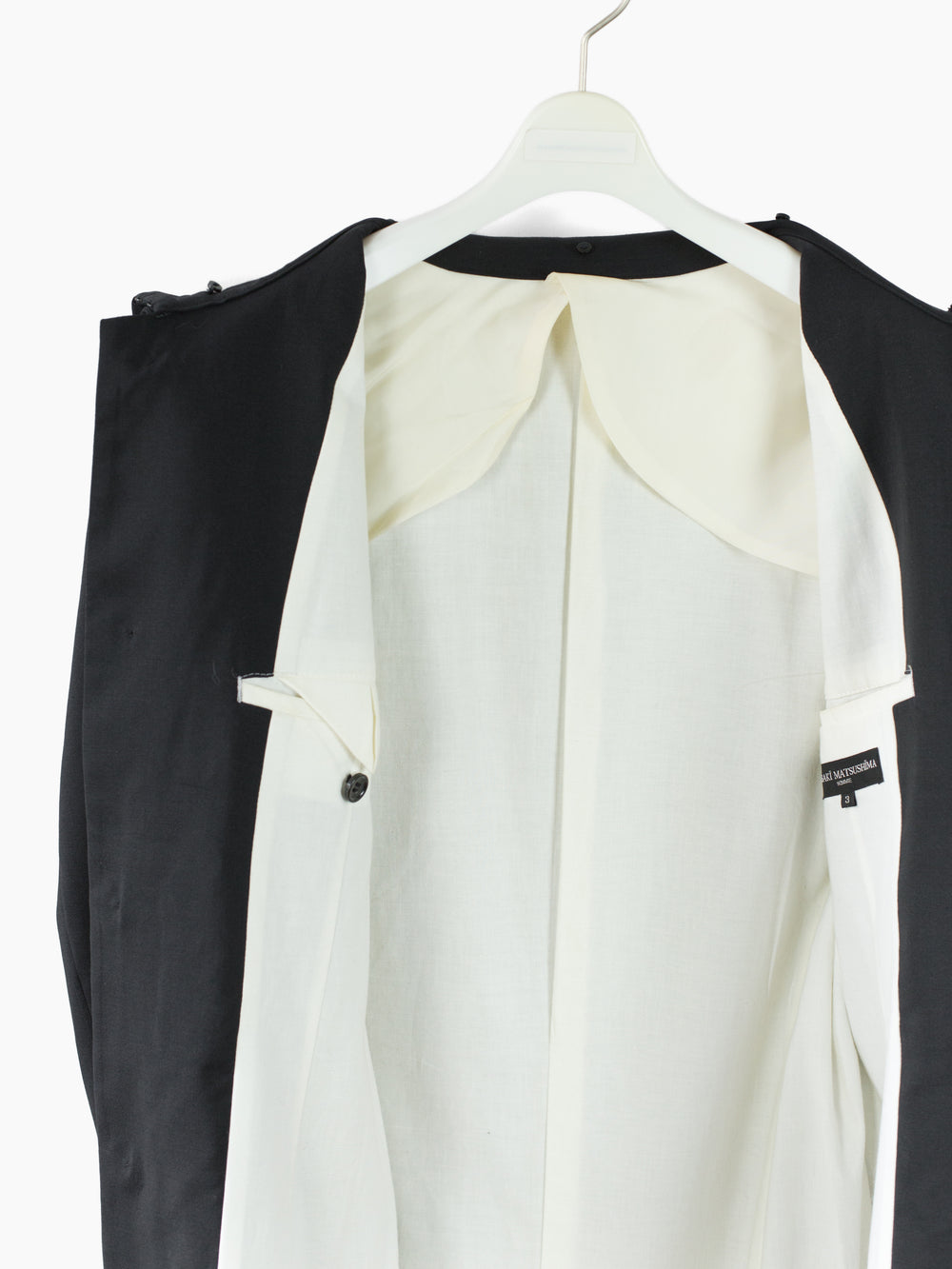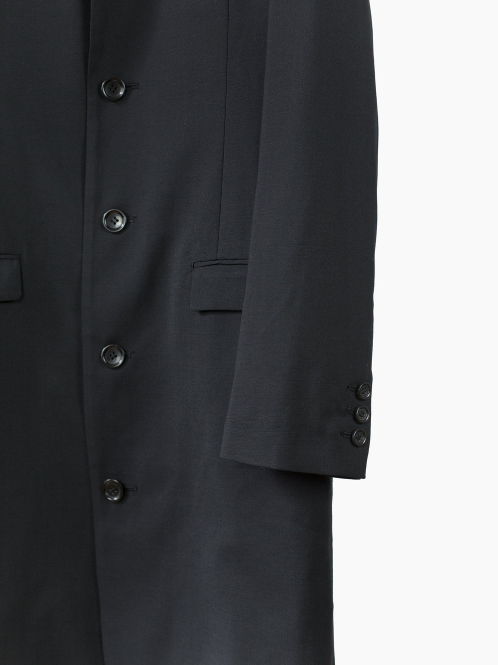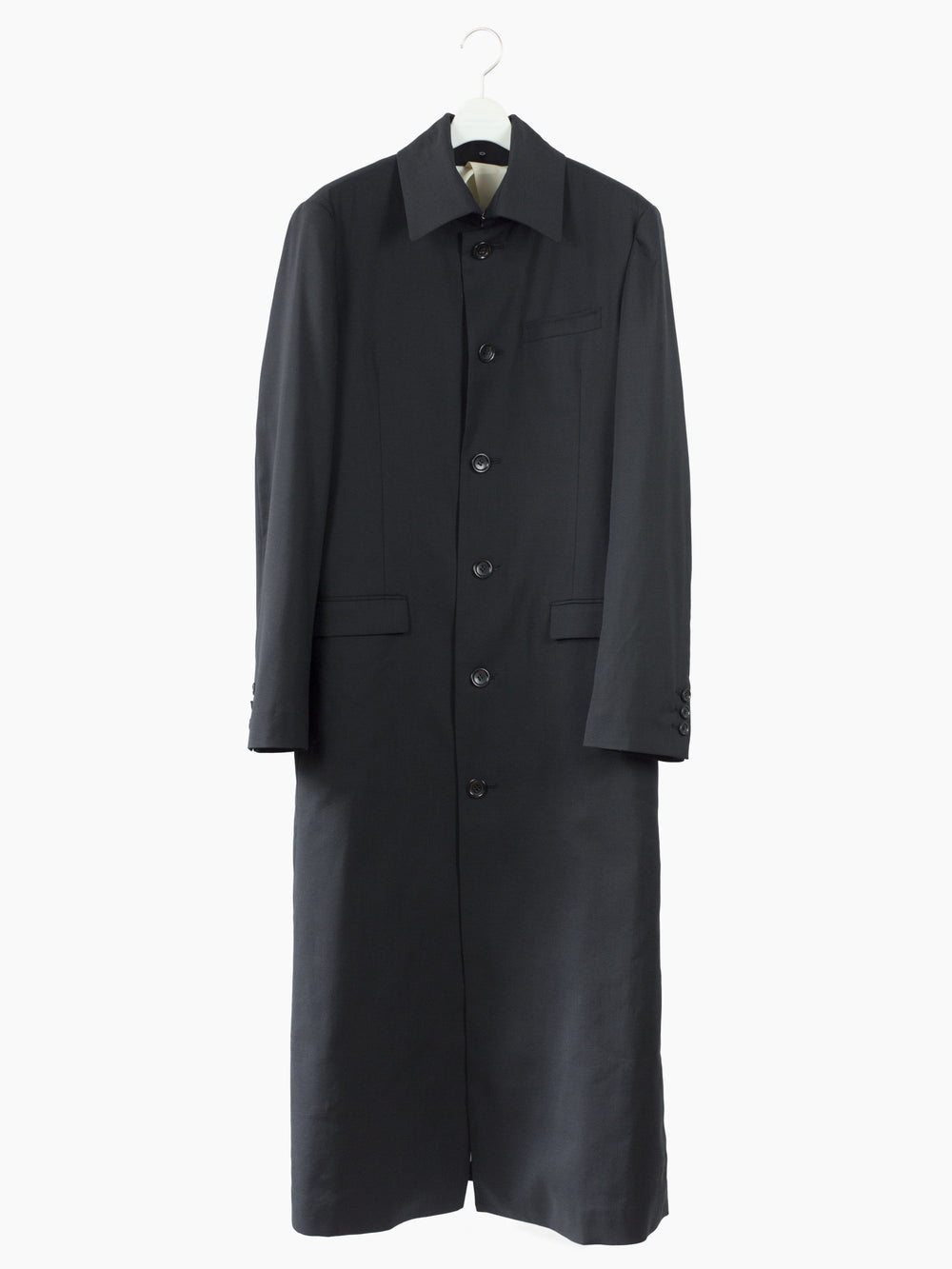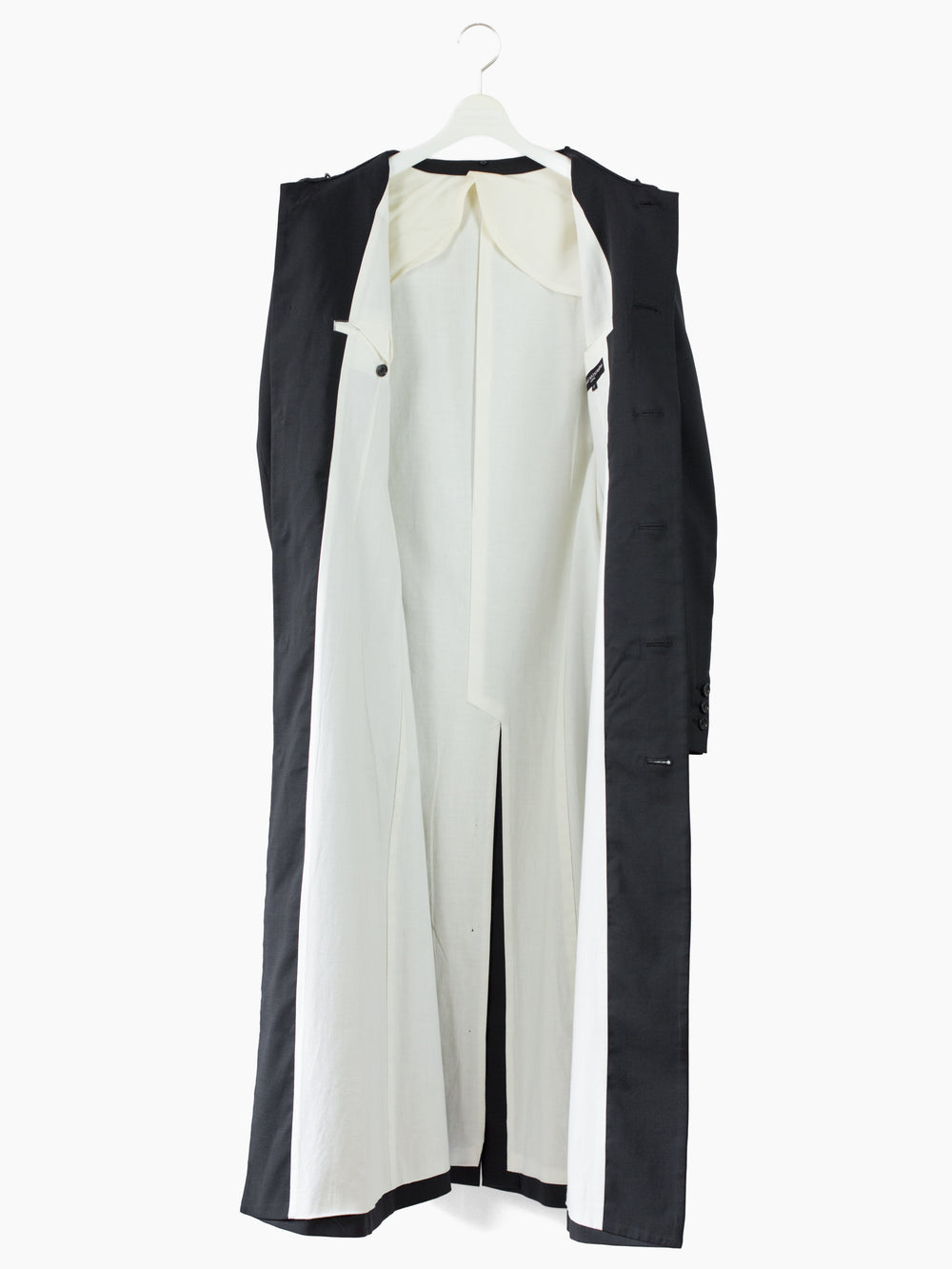 Ankle length Maxi coat from 90s Japanese deconstructionist designer Masaki Matsushima. Cut in superfine suiting wool canvas and lined in cotton/cupro in body/sleeves respectively. Dramatic tailored shape with sculpted waistline and adjustable high back vent. High double hook and bar collar closure with dramatic oversize sharp collar channel clergy formality.
