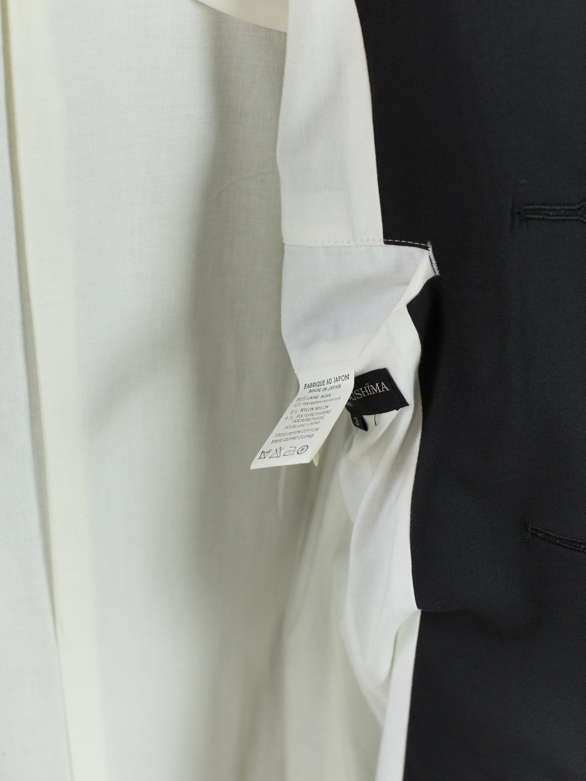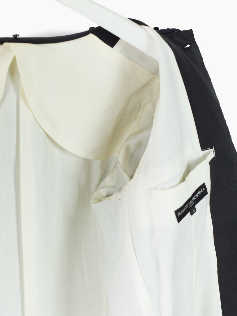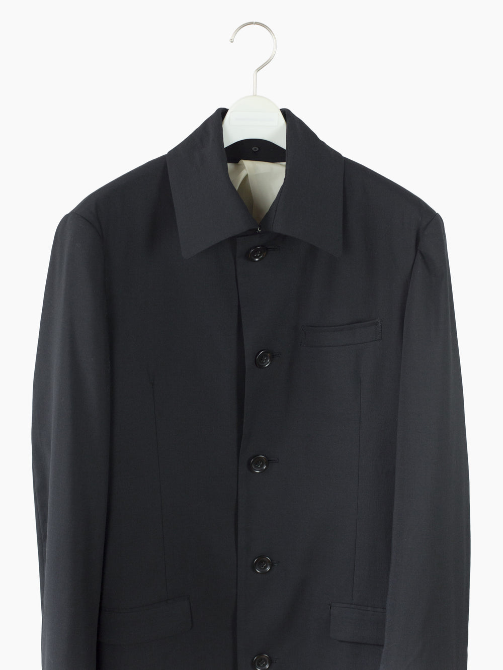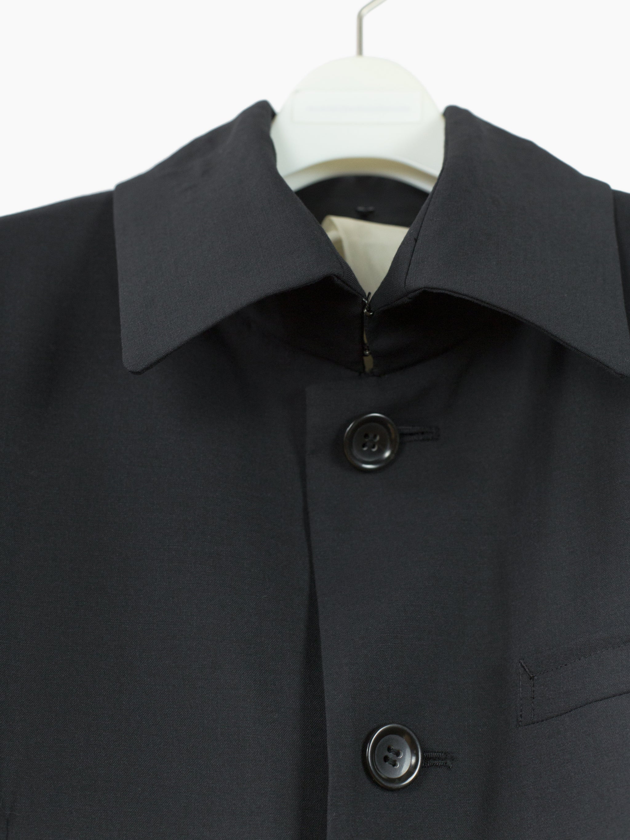 Ankle length Maxi coat from 90s Japanese deconstructionist designer Masaki Matsushima. Cut in superfine suiting wool canvas and lined in cotton/cupro in body/sleeves respectively. Dramatic tailored shape with sculpted waistline and adjustable high back vent. High double hook and bar collar closure with dramatic oversize sharp collar channel clergy formality.