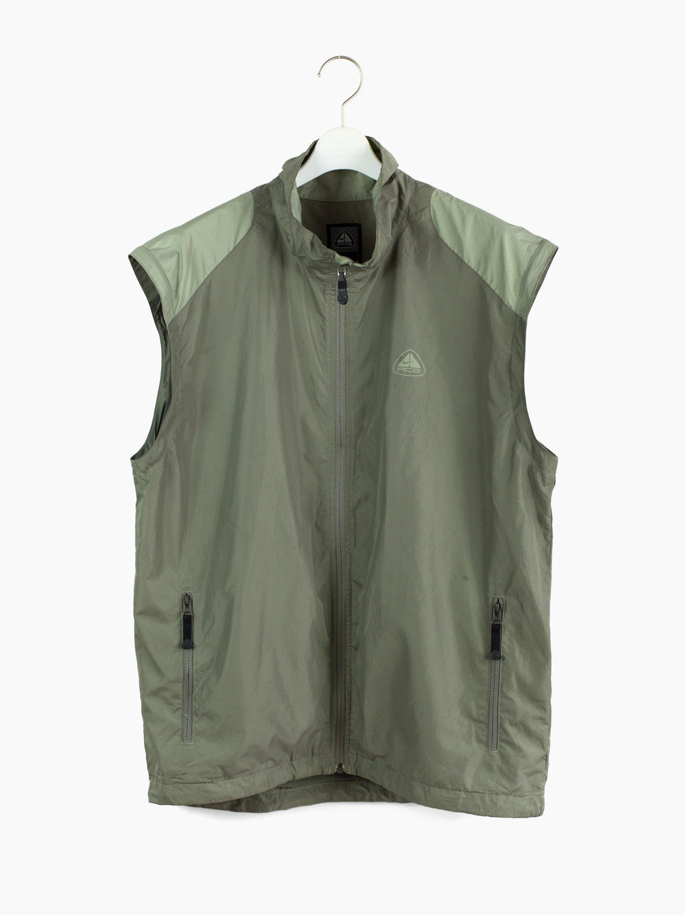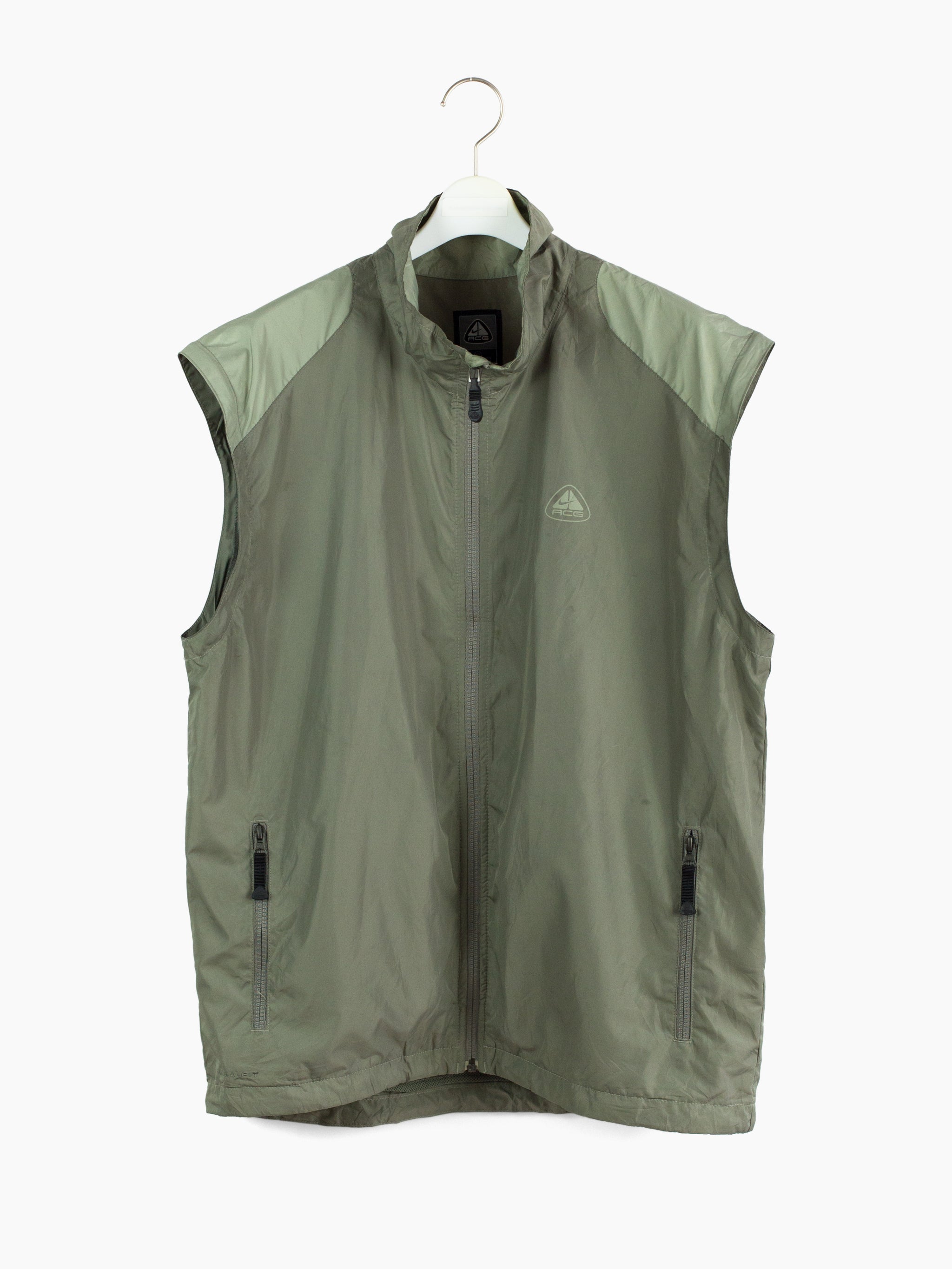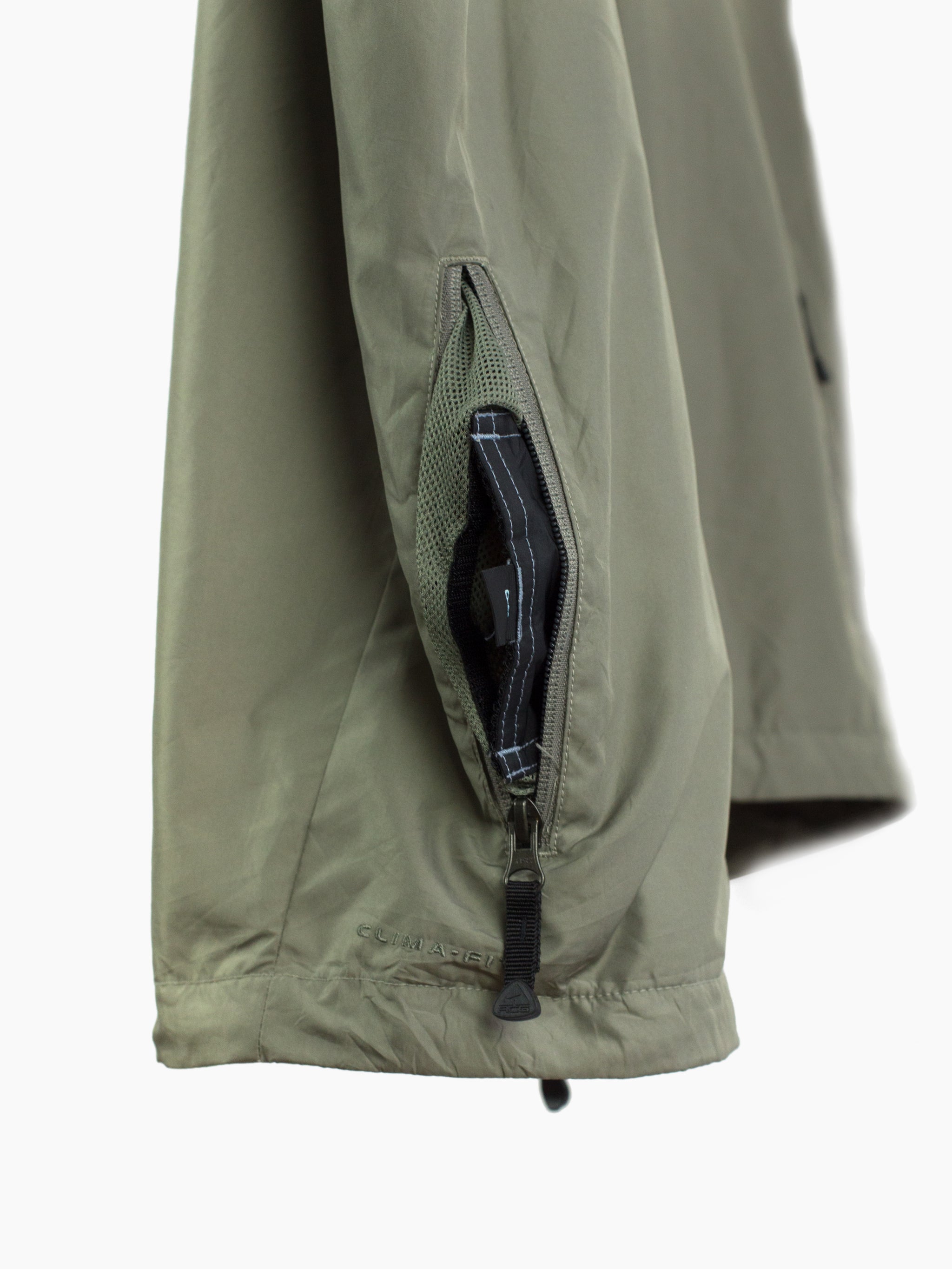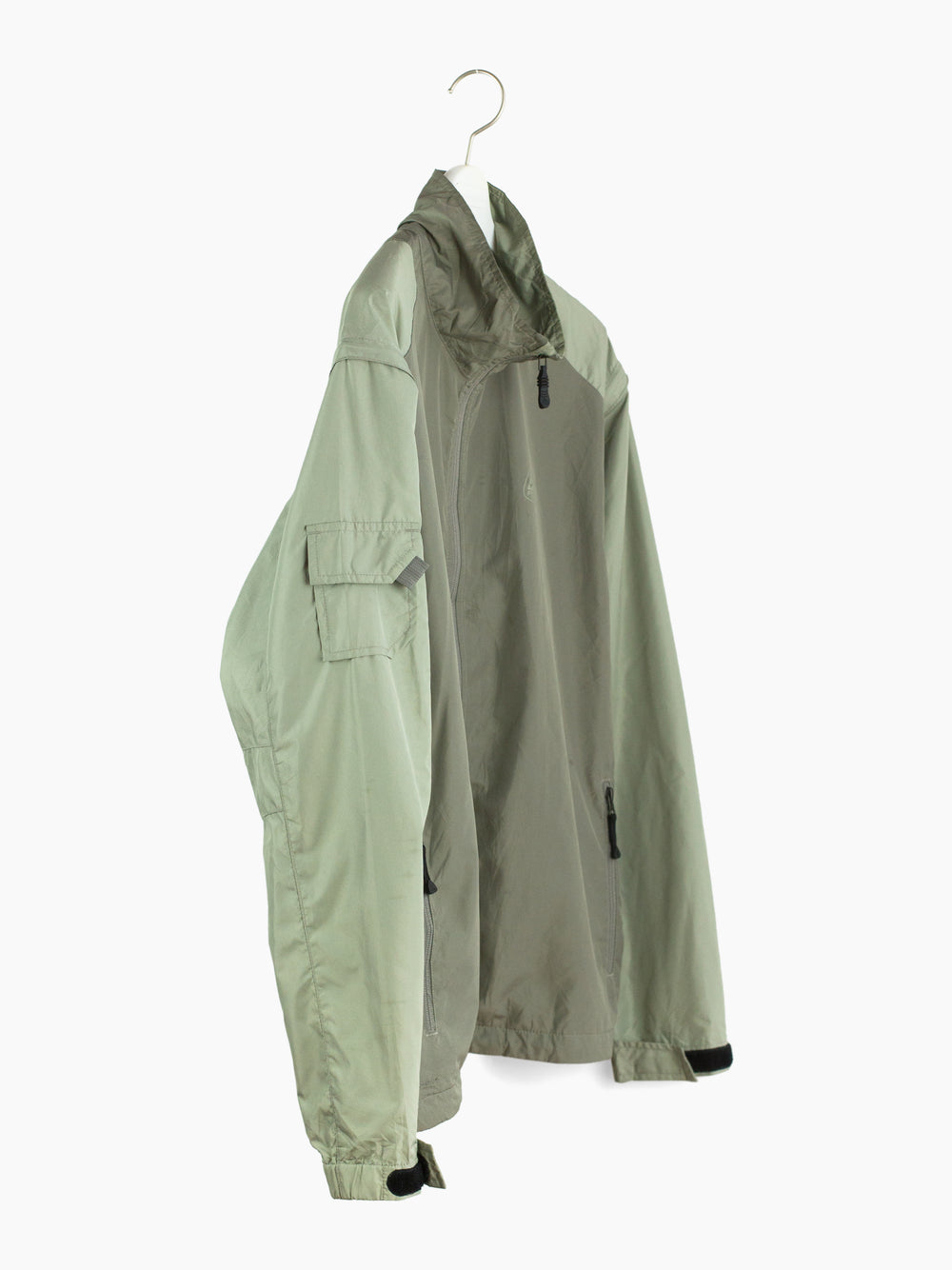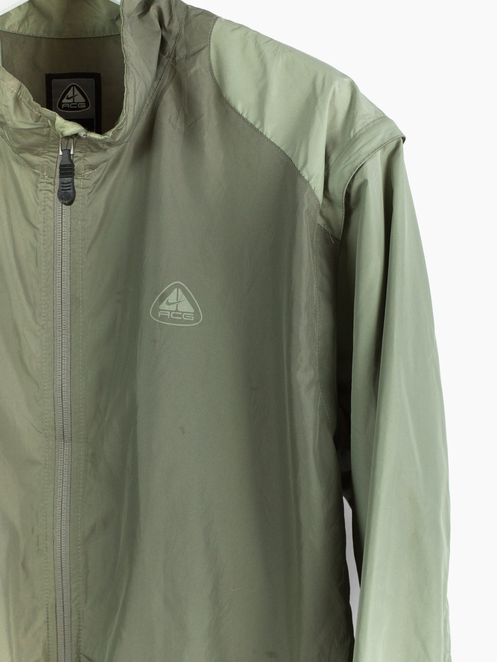 Technical 90s Nike ACG nylon shell with elegantly curved earth-toned colorblocking at the shoulder and zip-off contrast sleeves. Versatile in shape and color with multiple ways of wearing opening up both functional and creative possibilities. Sleeves feature inner-facing elbow articulation for mobility. Finished with center front zip, stand collar, two mesh-lined zippered waist pockets with shockcord waist cinch adjustment inside, single arm pocket, and zippered back stow pocket. Wearer's right zippered waist pocket also features velcro-closed secure key pocket.