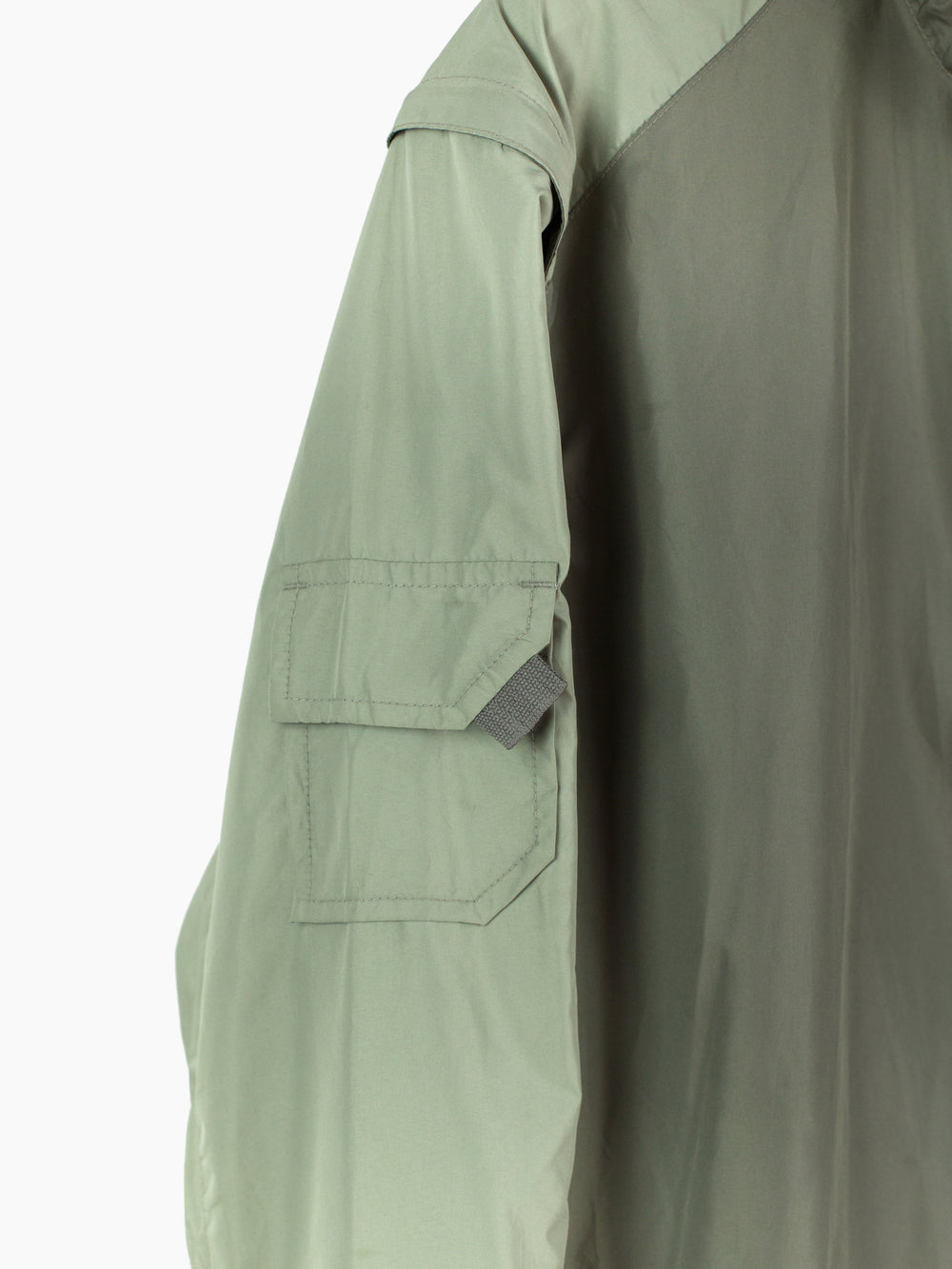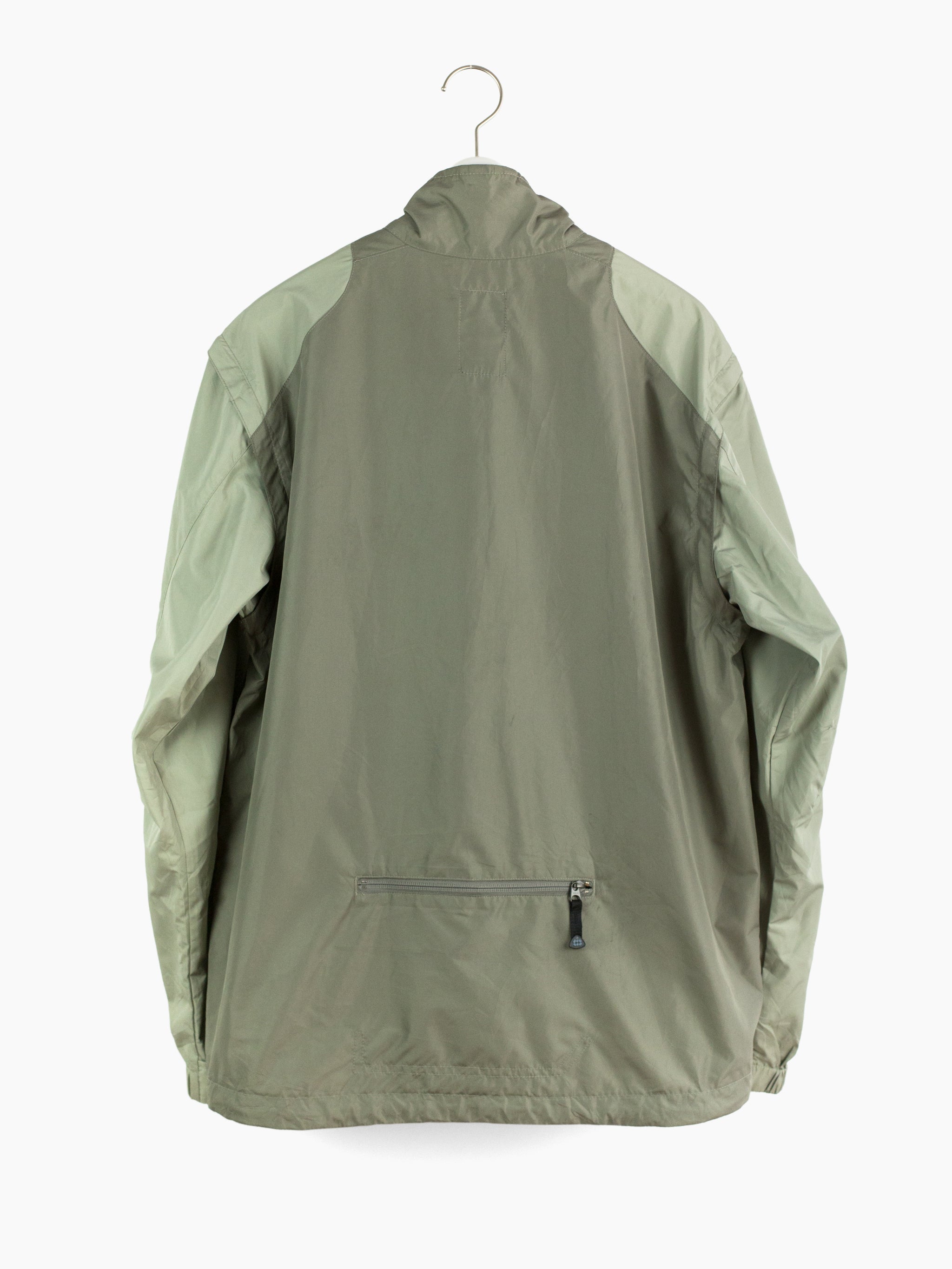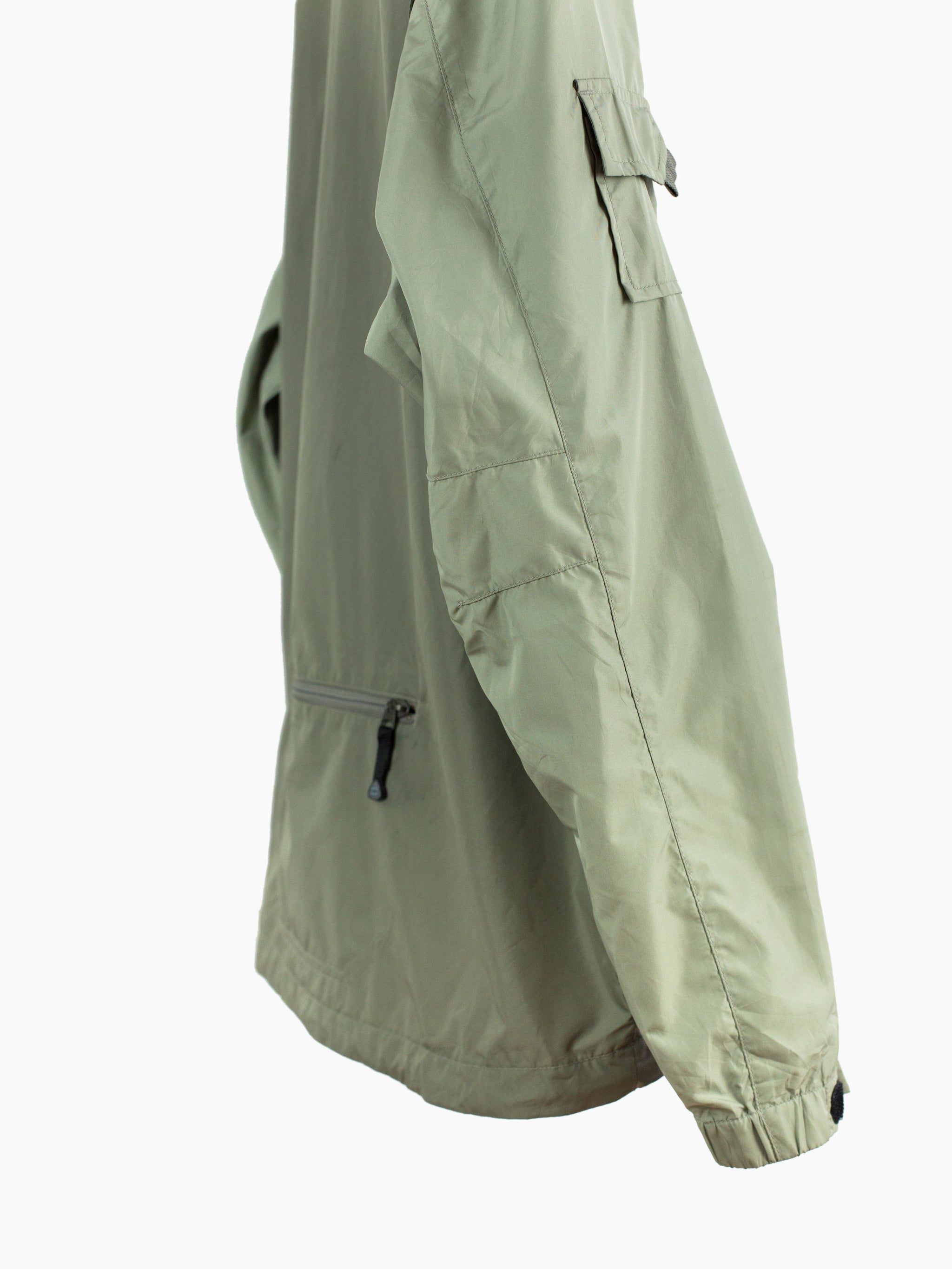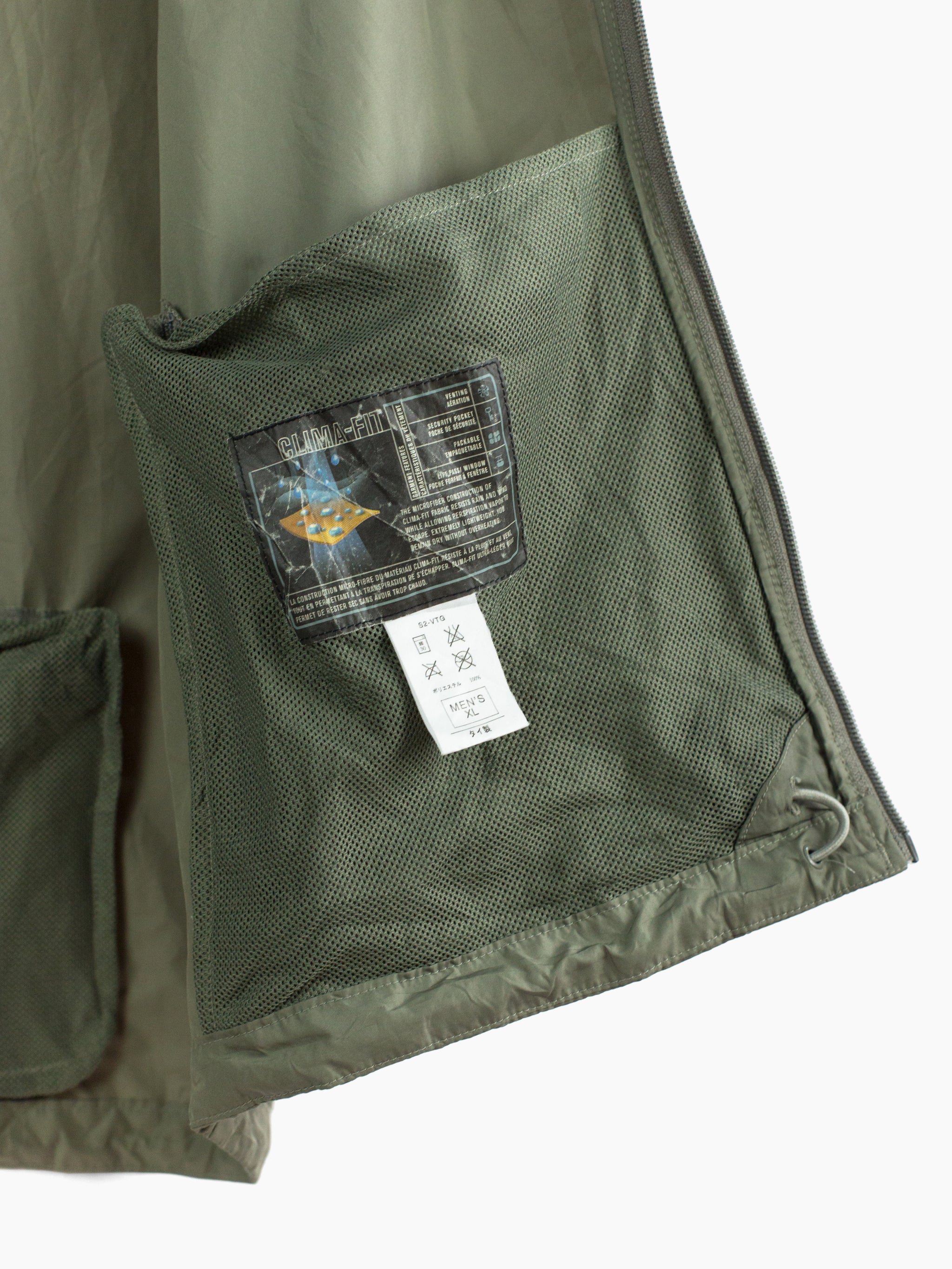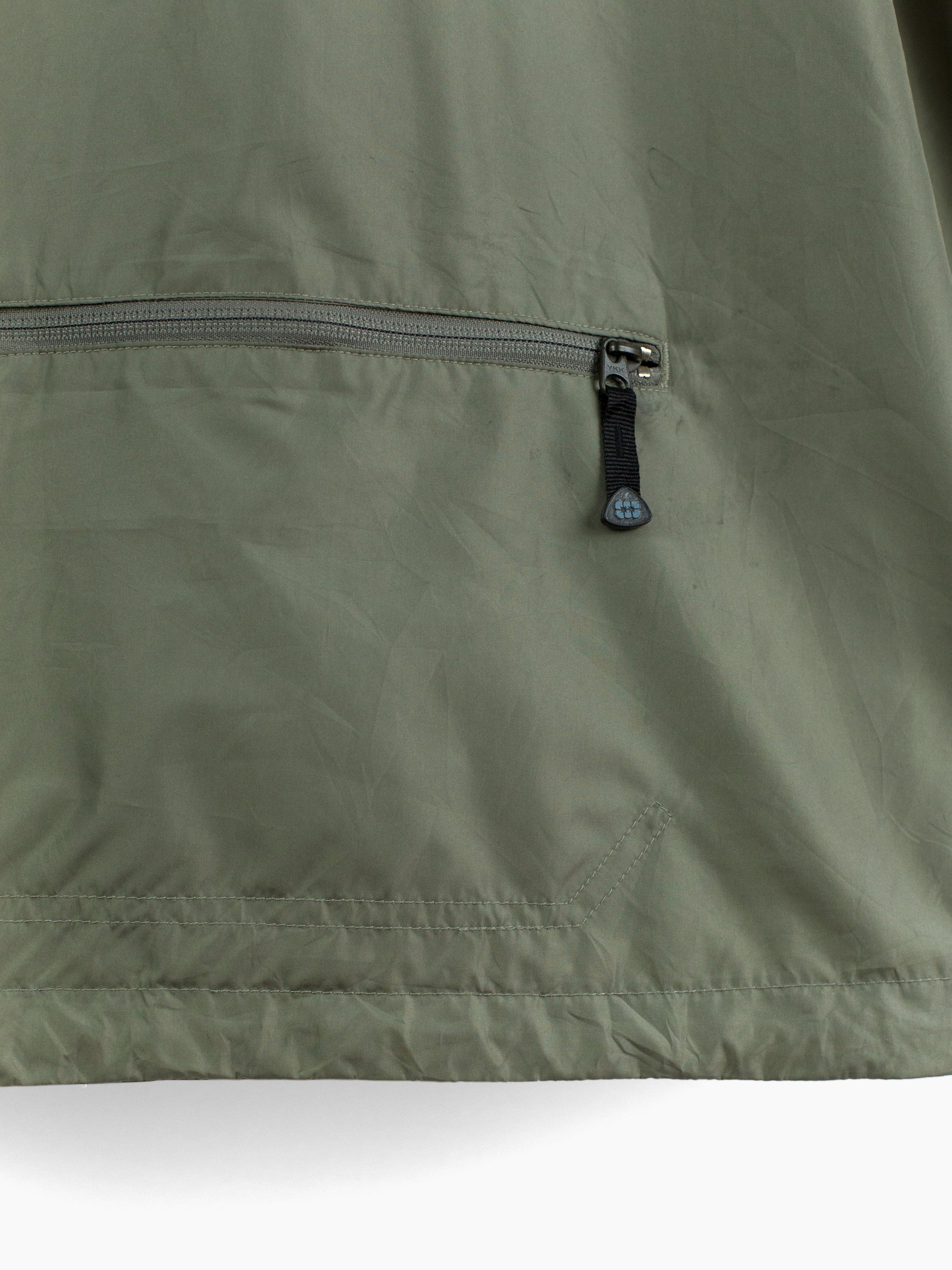 Technical 90s Nike ACG nylon shell with elegantly curved earth-toned colorblocking at the shoulder and zip-off contrast sleeves. Versatile in shape and color with multiple ways of wearing opening up both functional and creative possibilities. Sleeves feature inner-facing elbow articulation for mobility. Finished with center front zip, stand collar, two mesh-lined zippered waist pockets with shockcord waist cinch adjustment inside, single arm pocket, and zippered back stow pocket. Wearer's right zippered waist pocket also features velcro-closed secure key pocket.