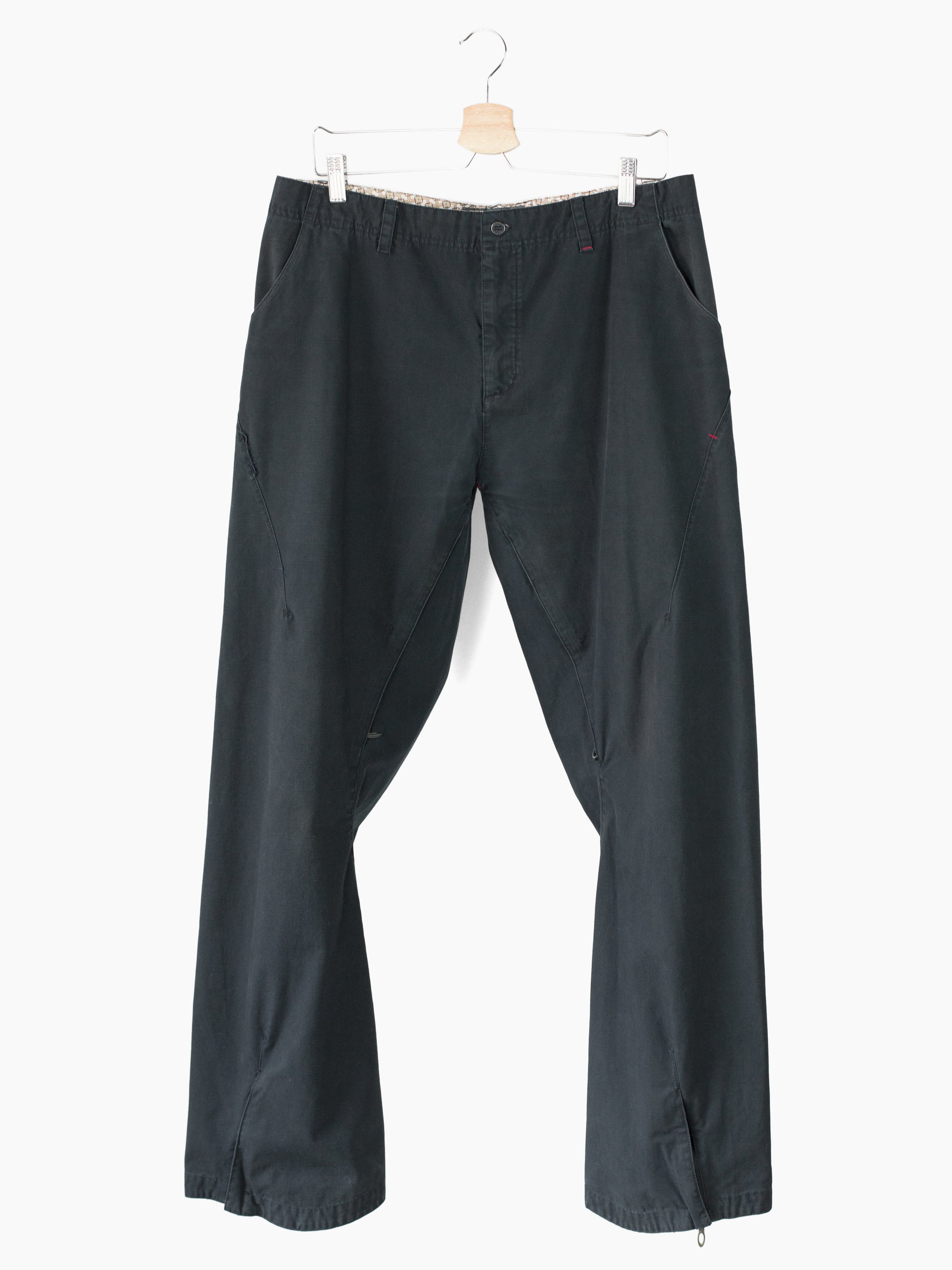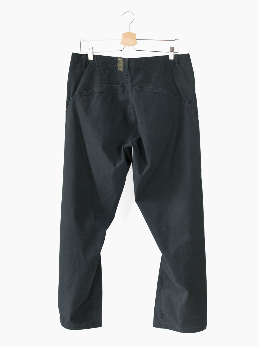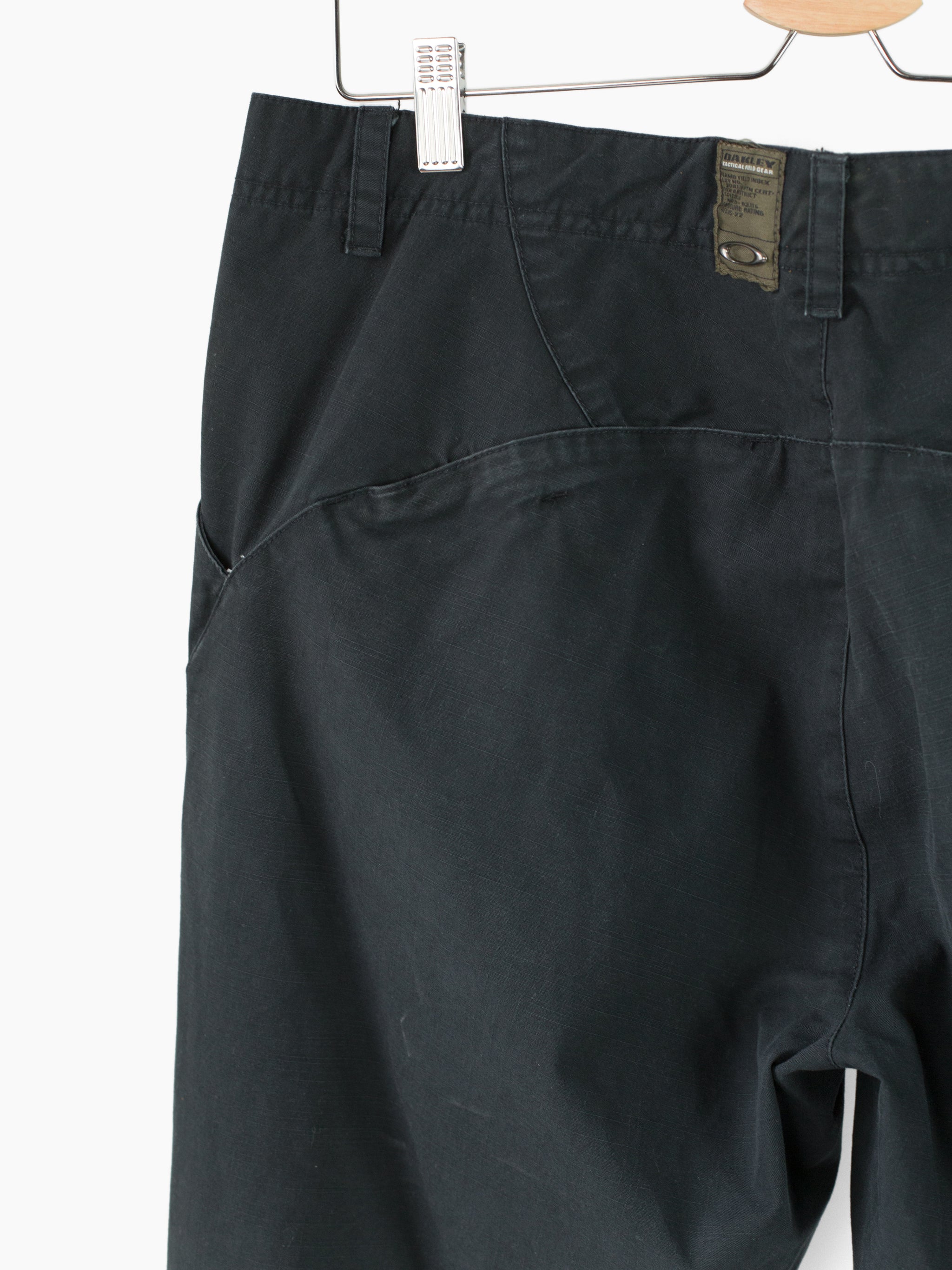 Black straight leg trousers from Oakley with intricate darting and curved panel construction, sculpting a subtlely articulated leg with a slight flared hem. The midweight textured cotton fabric features an interior resinated coating for wind/weatherproofing while maintaining a comfortable, natural hand.