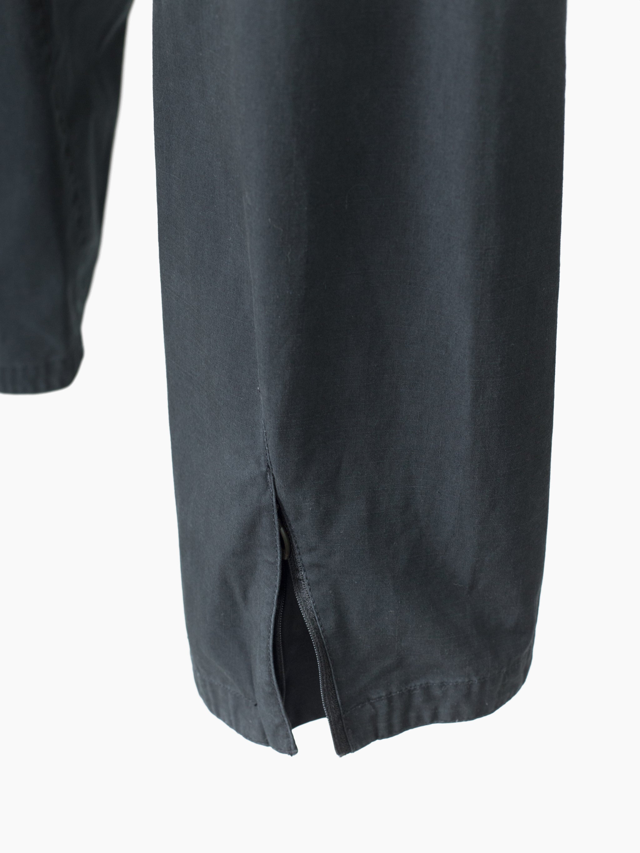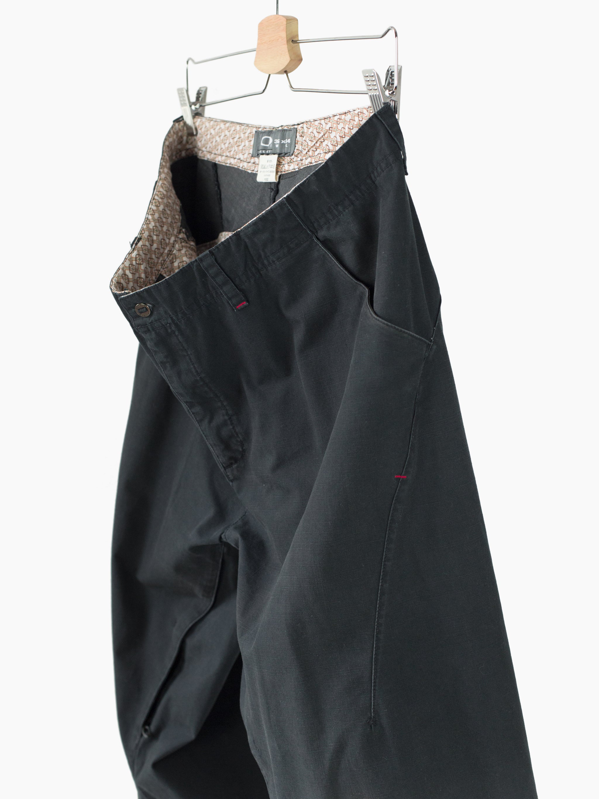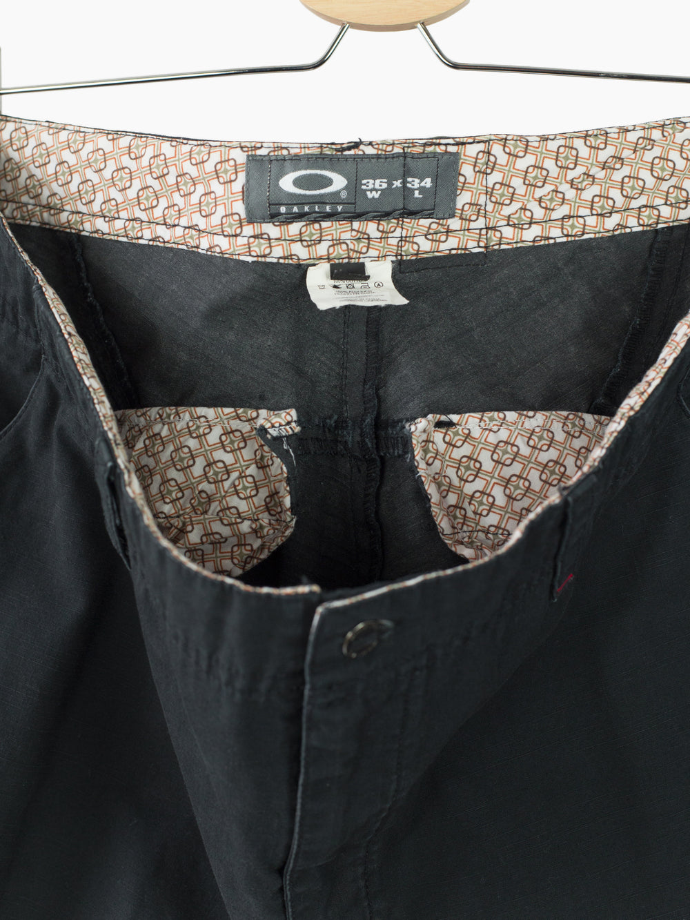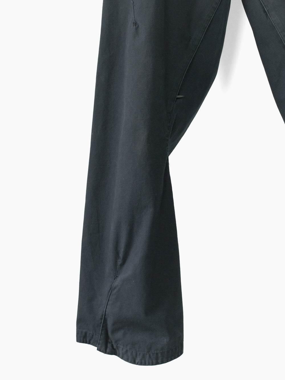 Black straight leg trousers from Oakley with intricate darting and curved panel construction, sculpting a subtlely articulated leg with a slight flared hem. The midweight textured cotton fabric features an interior resinated coating for wind/weatherproofing while maintaining a comfortable, natural hand.