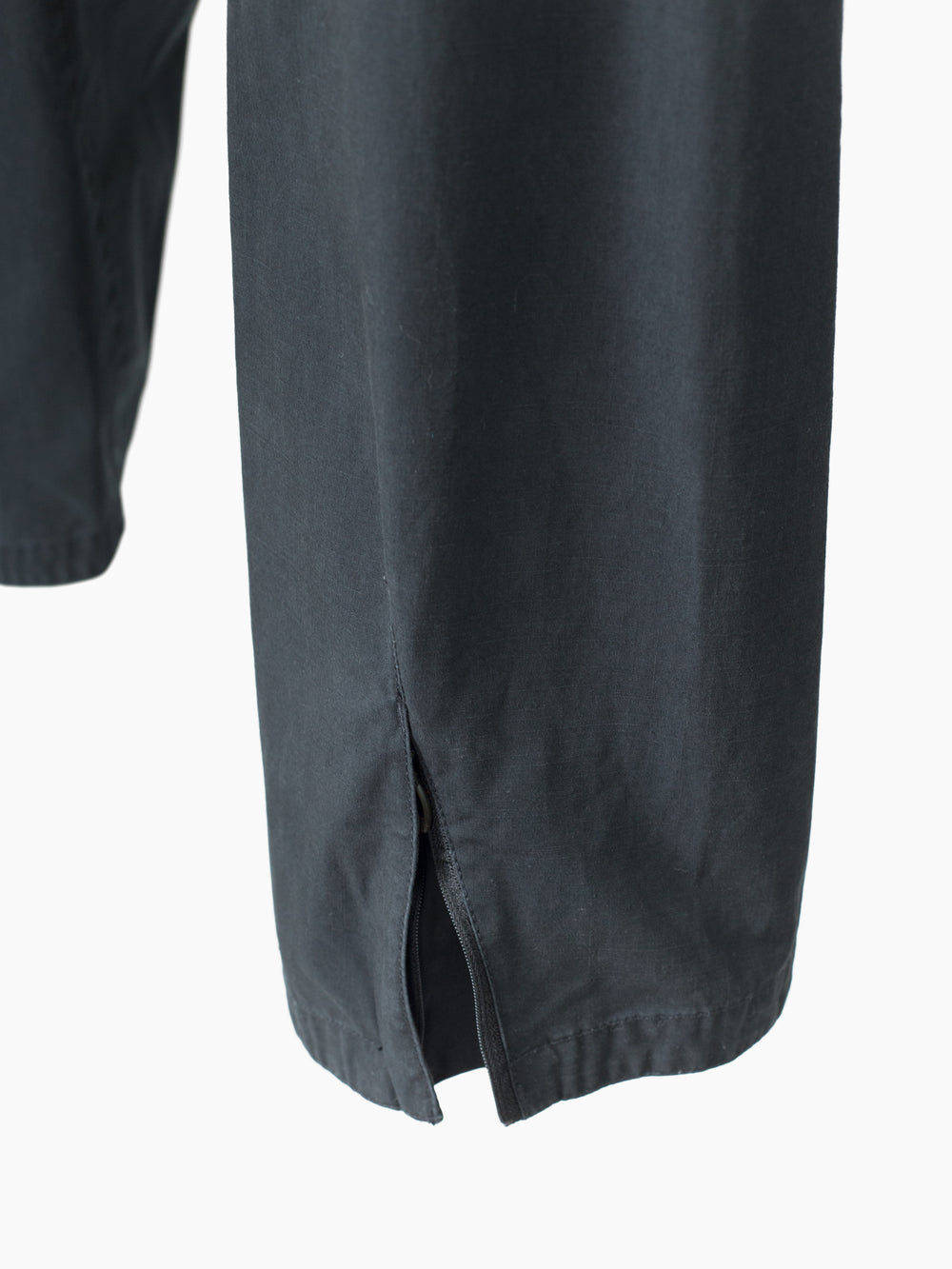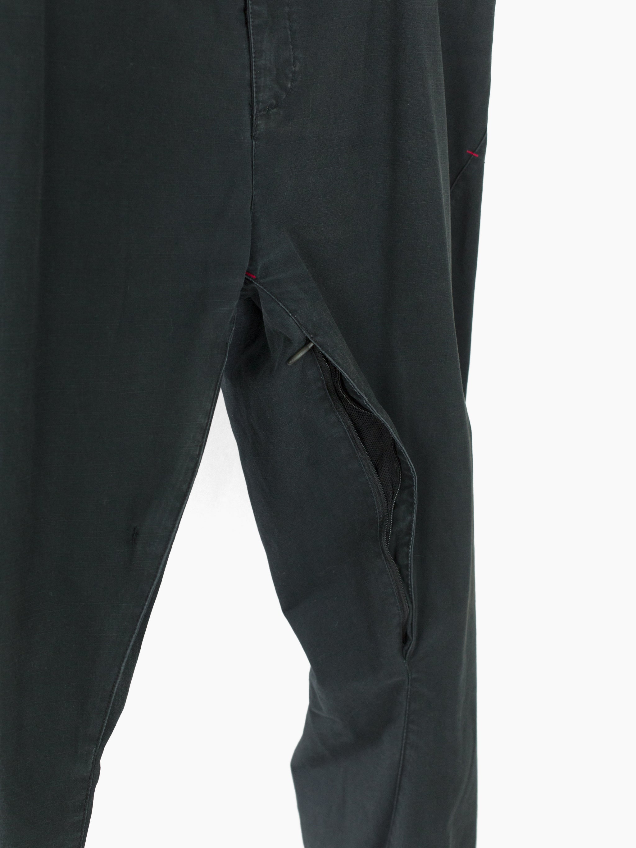 Finished with webbing slotted button waist closure and zipper fly, two slash waist pockets and two zippered back top entry pockets, mesh-lined vents at inner leg, and zipper-expandable hem.