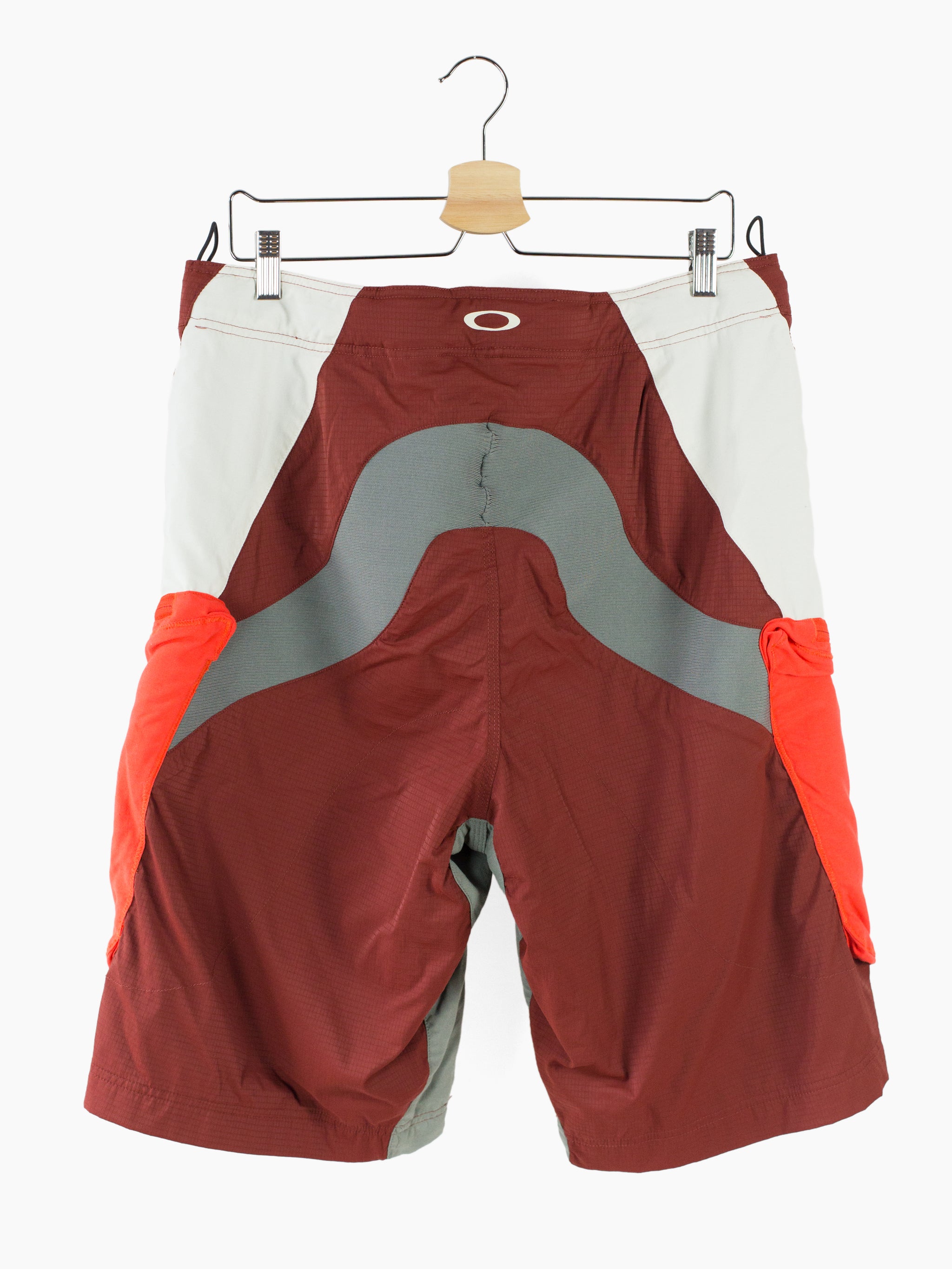 Mountain biking/Motocross Cargo shorts from early 2000s Oakley, featuring an elliptical composite design with two different types of mesh, nylon ripstop, and ribbing. Parallel zippers at the front open to reveal crotch vents or to access 3D cargo pockets. Double snap waist closure with shallow, no-closure fly. Has loops at the interior to attach a protective bike short (not included)