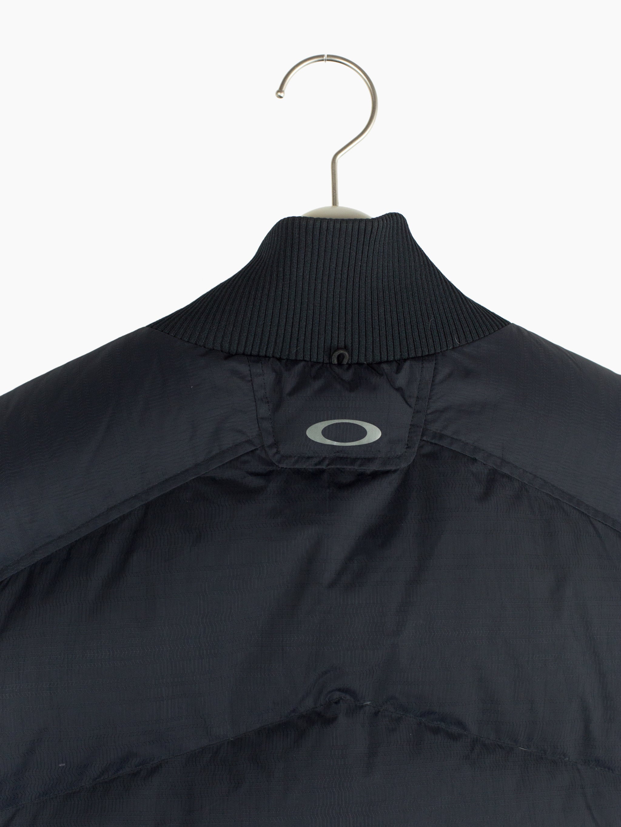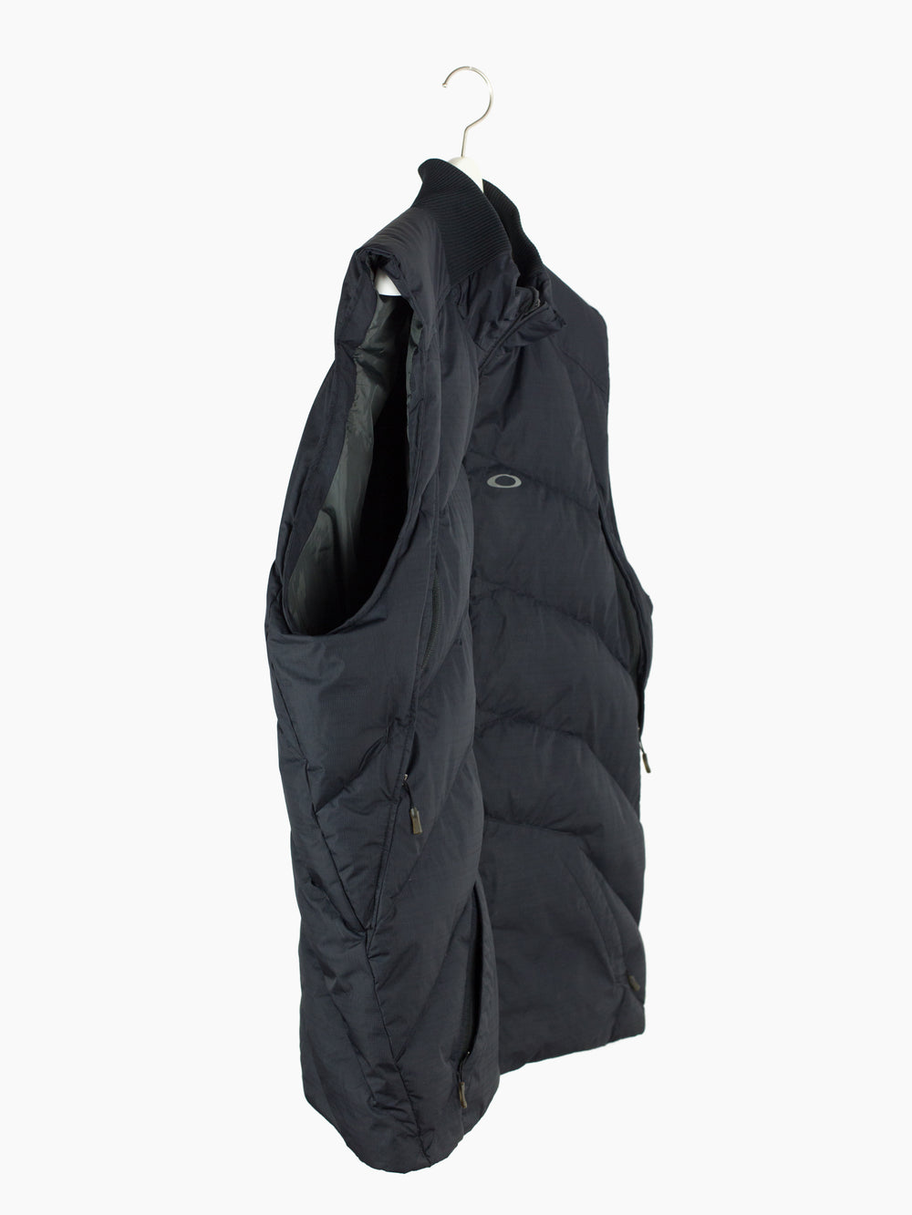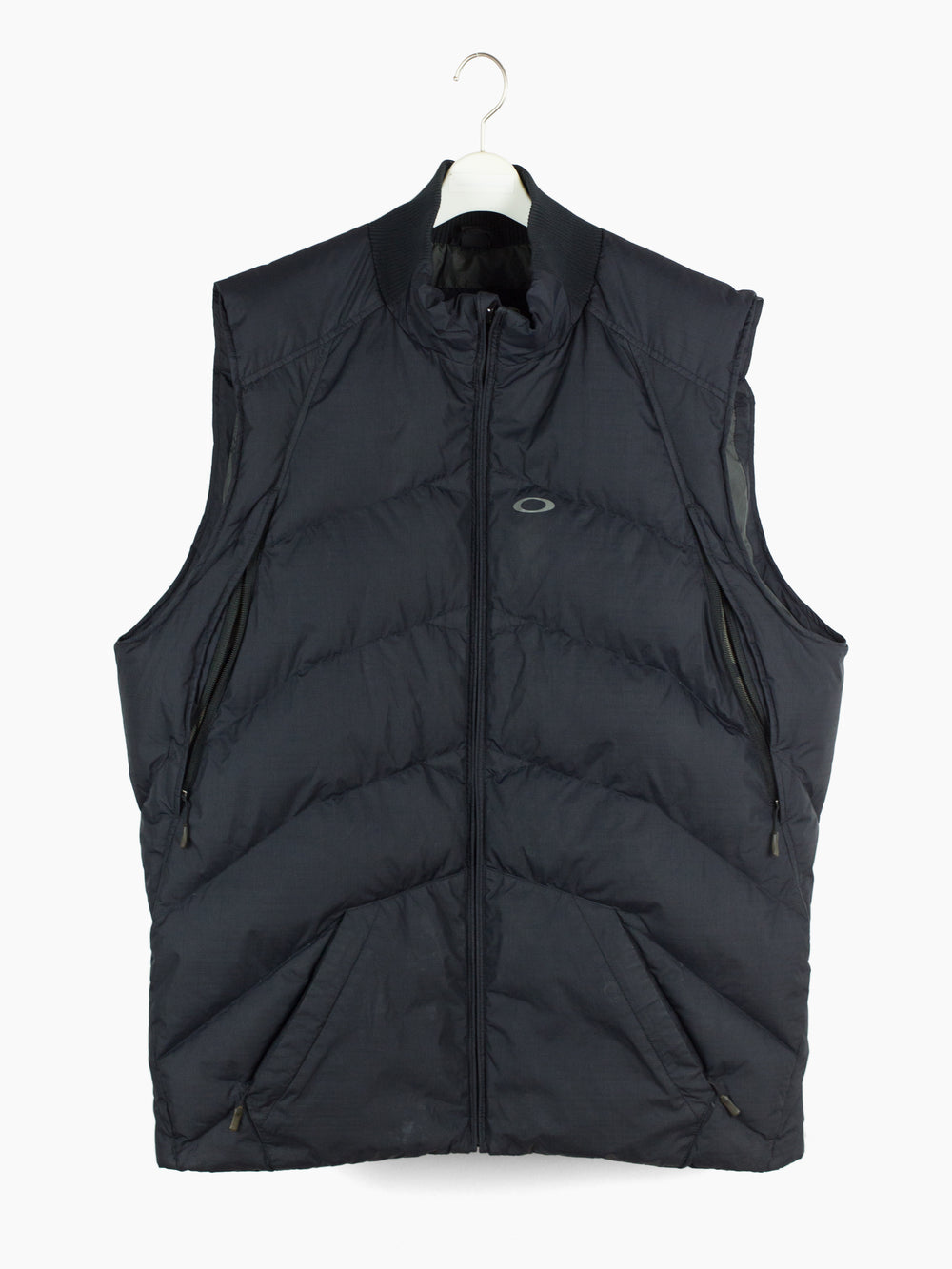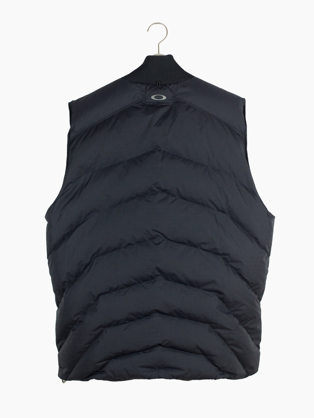 Black down puffer vest from early 2000s Oakley, featuring aggressively angular down baffles and zip-open vents around the underarms. Finished with rib-trimmed stand c collar, lower waist pockets, inner softshell chest pocket, and shockcord hem. Oakley 'O' Insignia throughout.