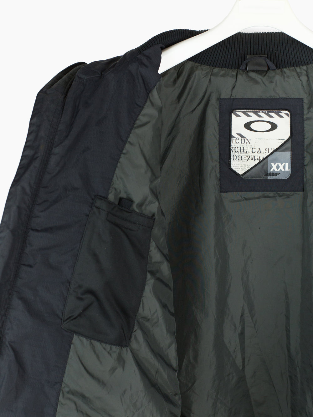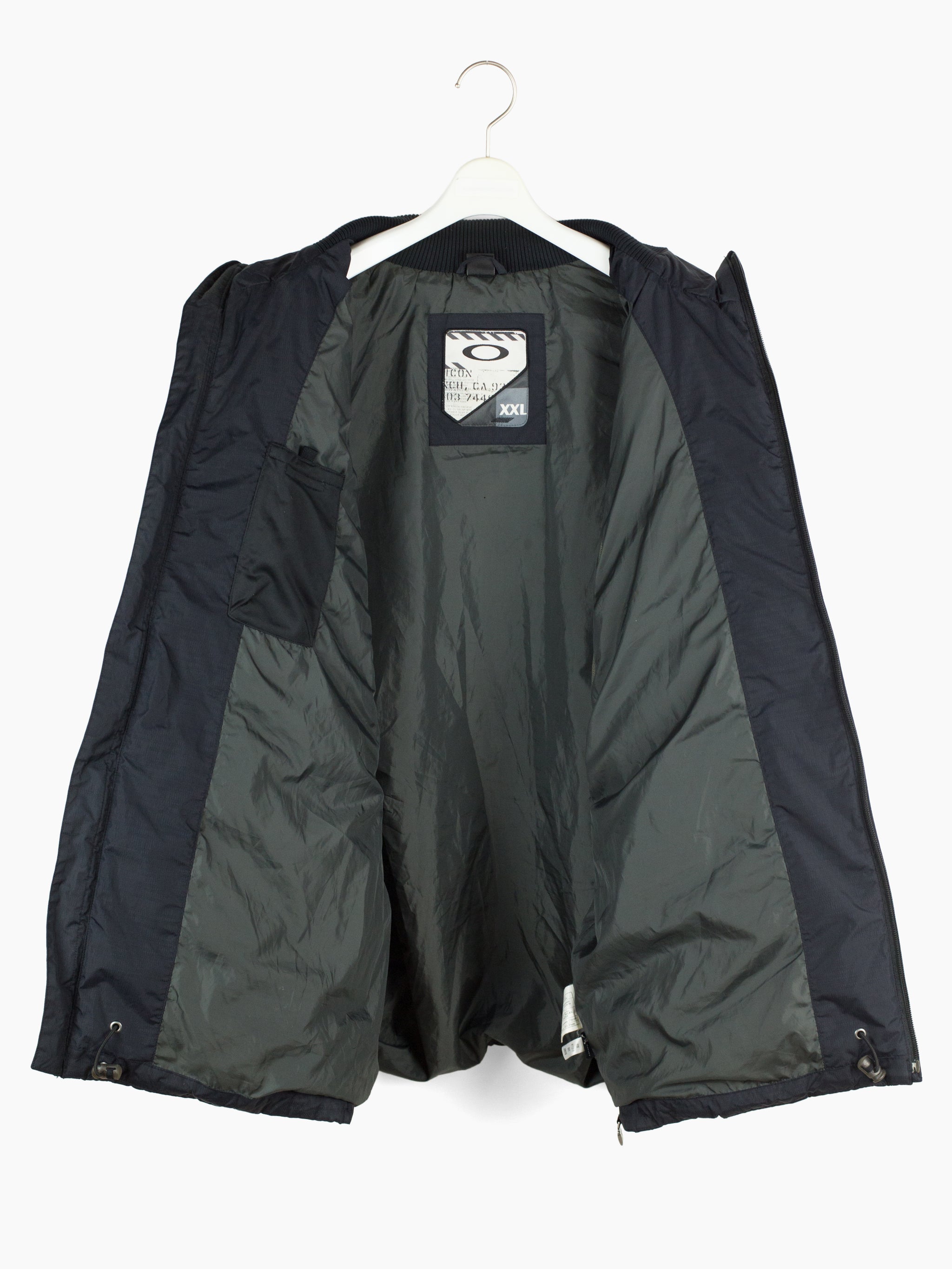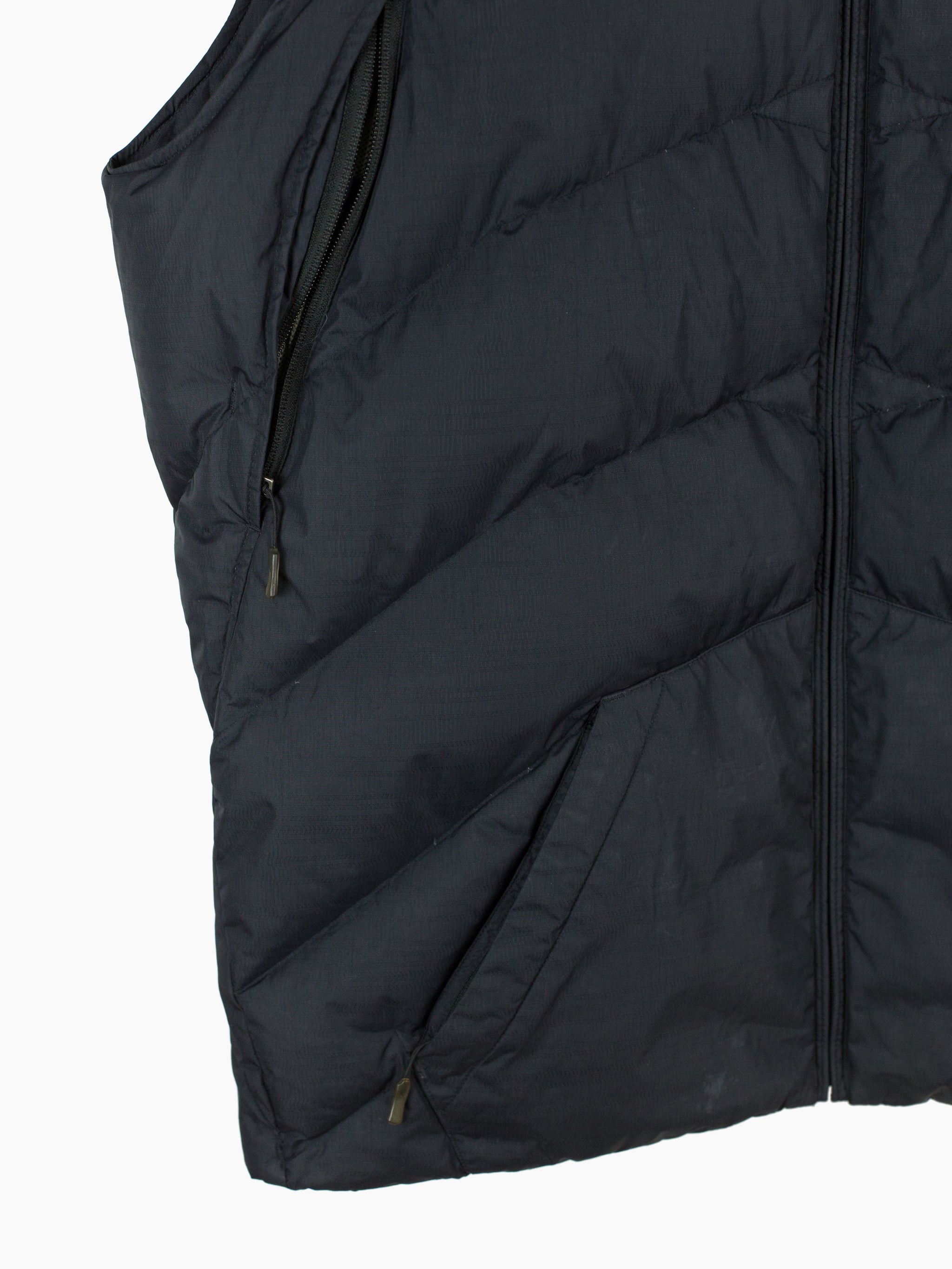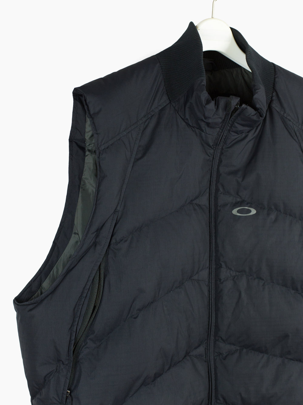 Black down puffer vest from early 2000s Oakley, featuring aggressively angular down baffles and zip-open vents around the underarms. Finished with rib-trimmed stand c collar, lower waist pockets, inner softshell chest pocket, and shockcord hem. Oakley 'O' Insignia throughout.