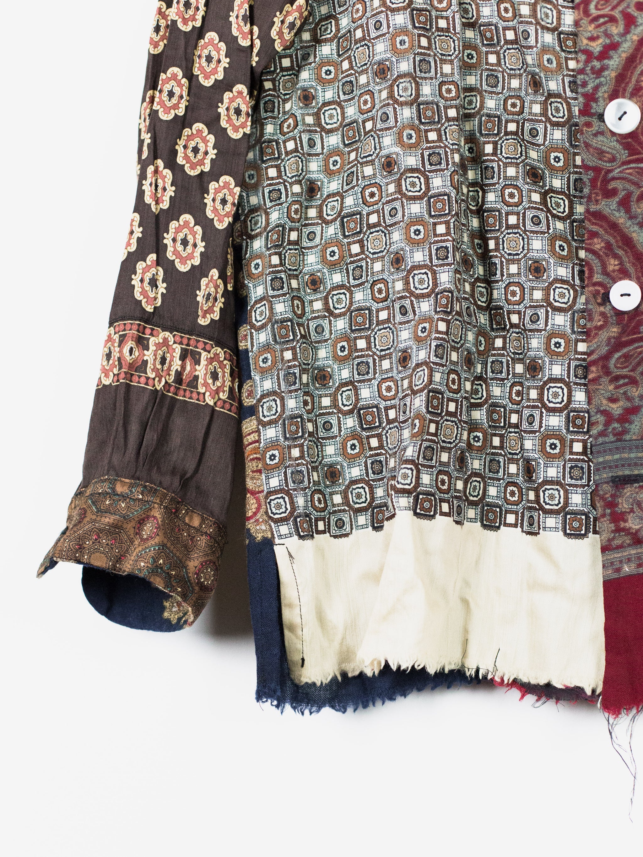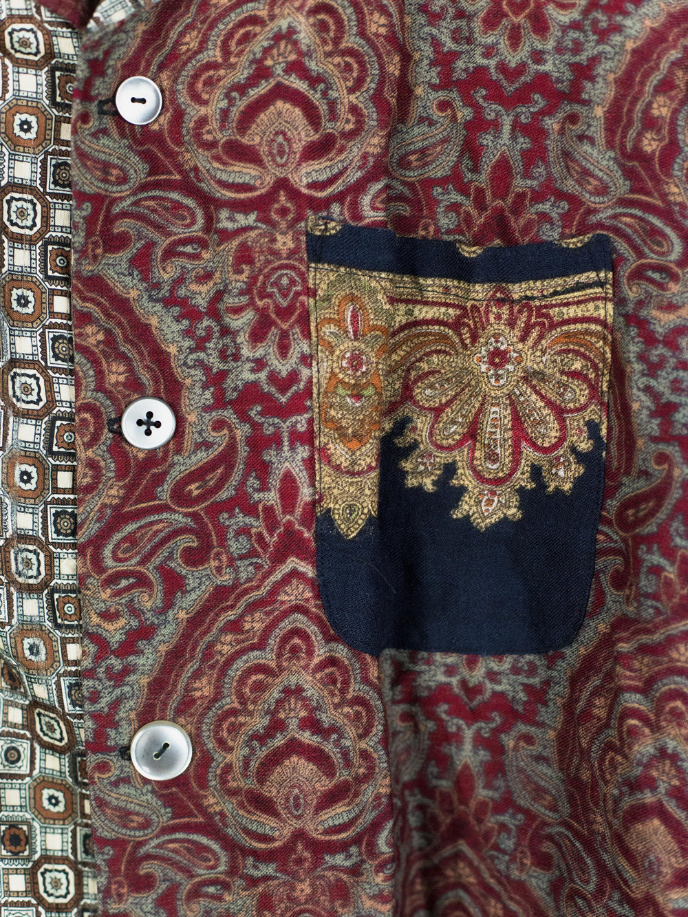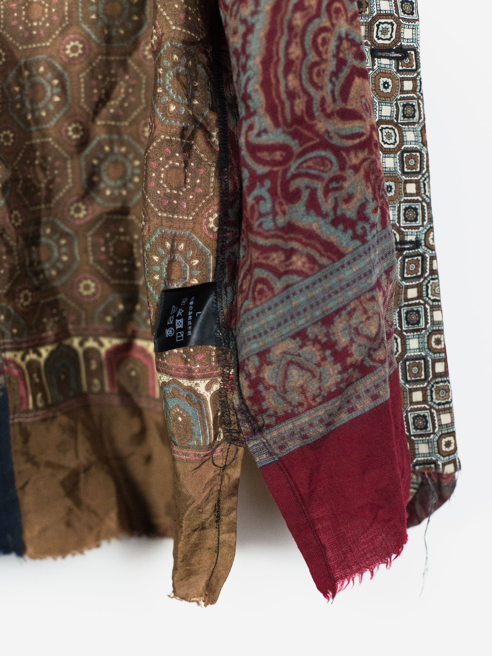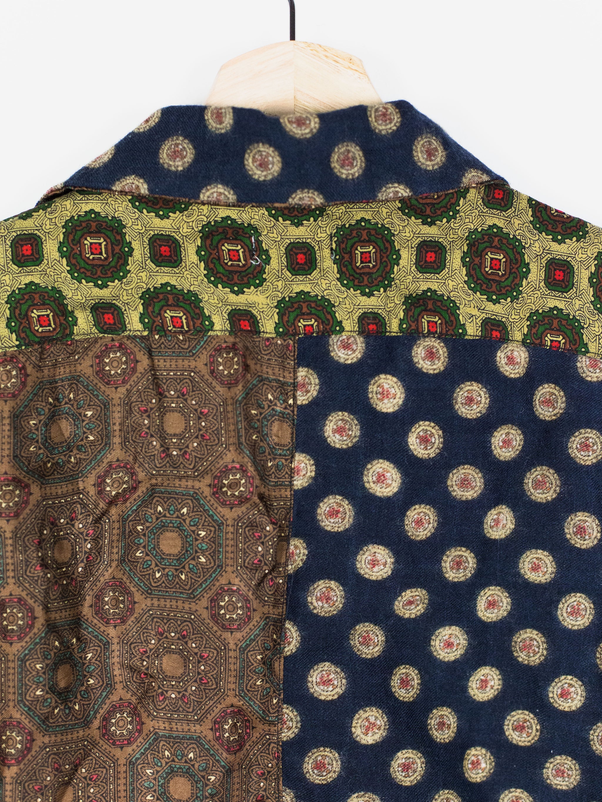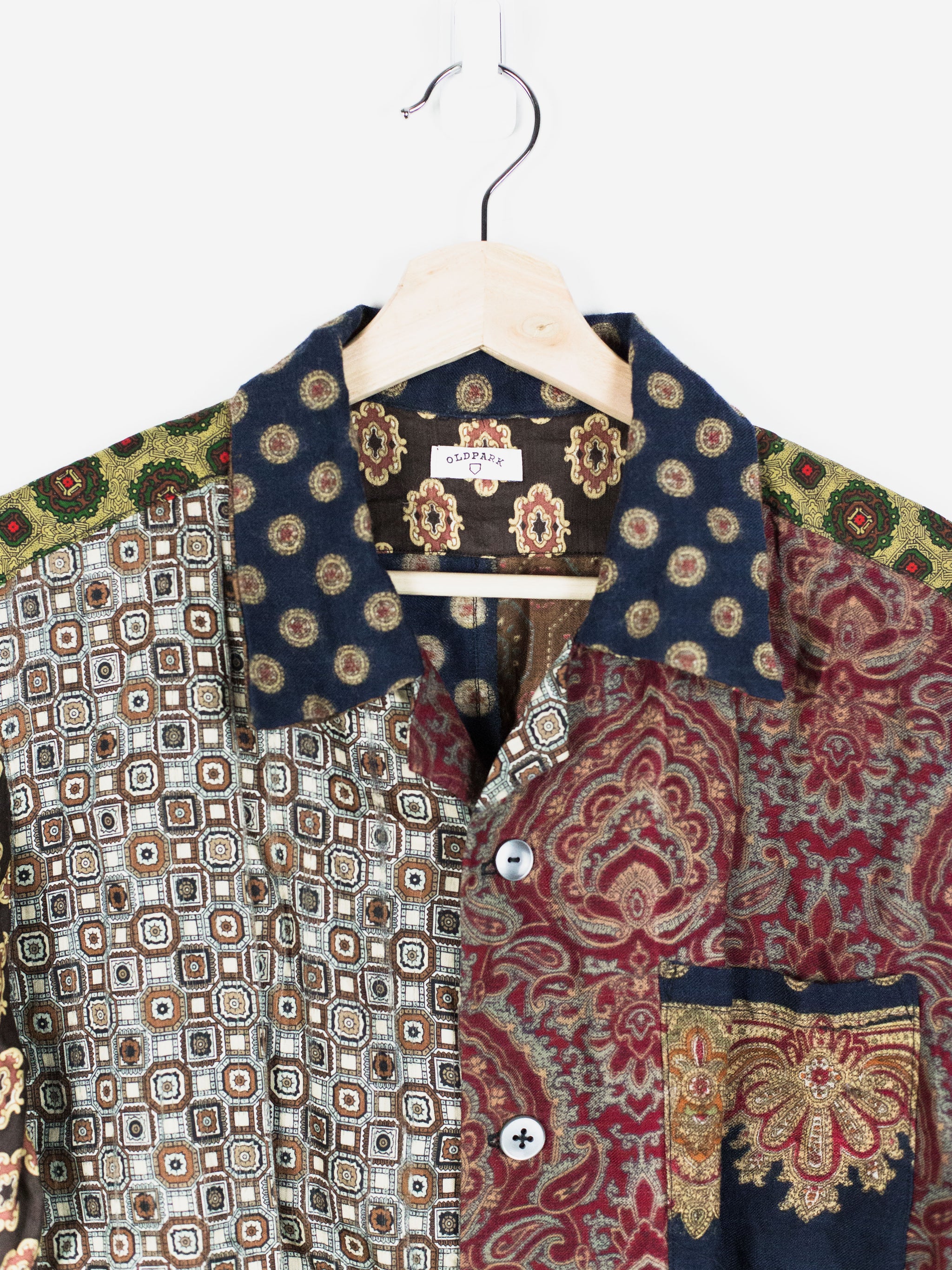 Beautiful patchwork shirt from Old Park that is cut from vintage scarves and bandanas. It features a great mix of rustic, warm tones and a variation of patterns and scales that make a really dynamic piece. Hems are left raw and the pearl buttons are mismatched, giving the piece that real handcrafted DIY vintage aesthetic that old park is known for. Super wearable as a shirt or overshirt thanks to the straight hem and 70s style collar