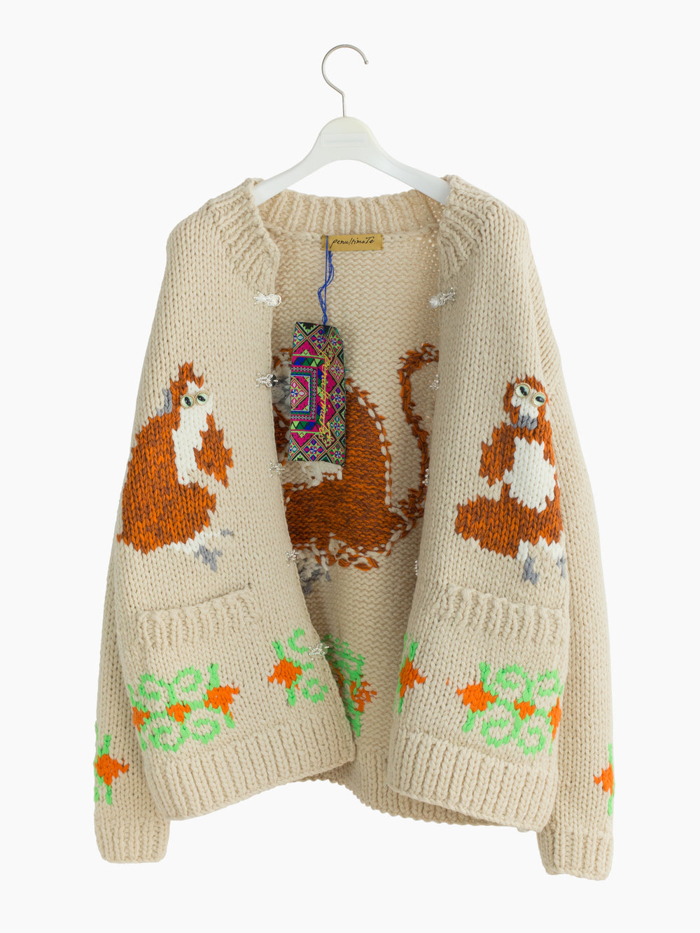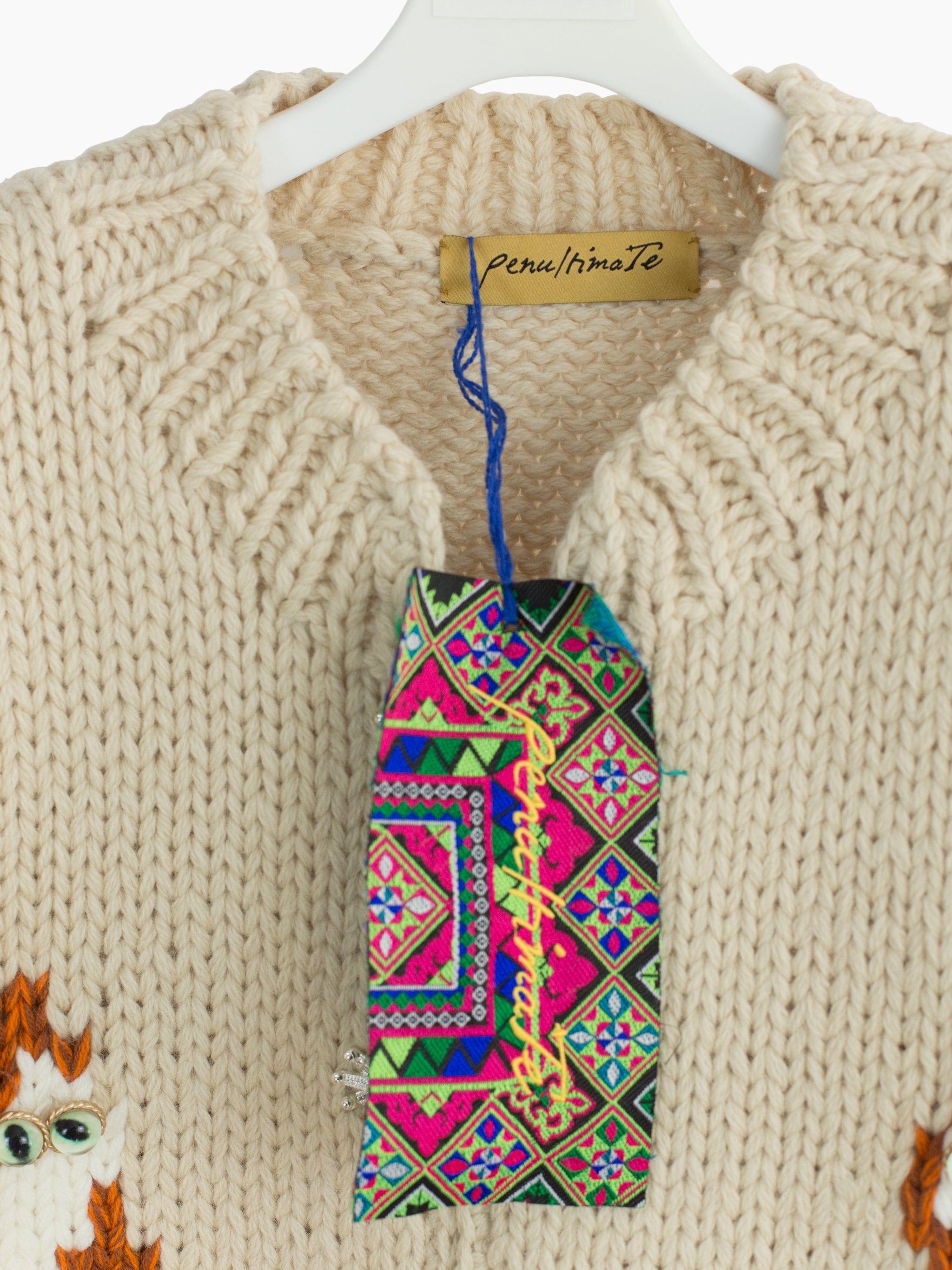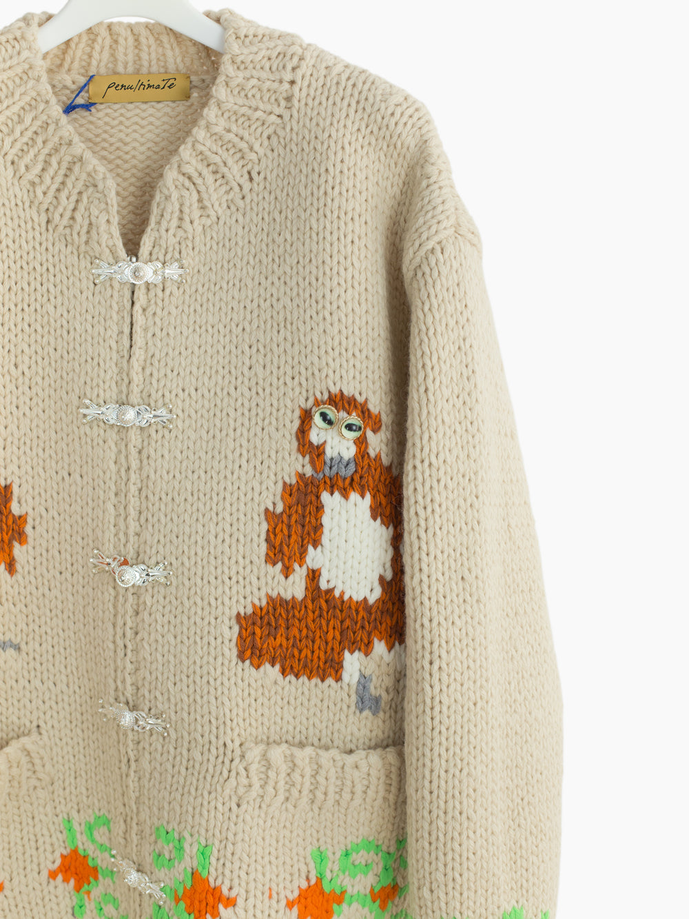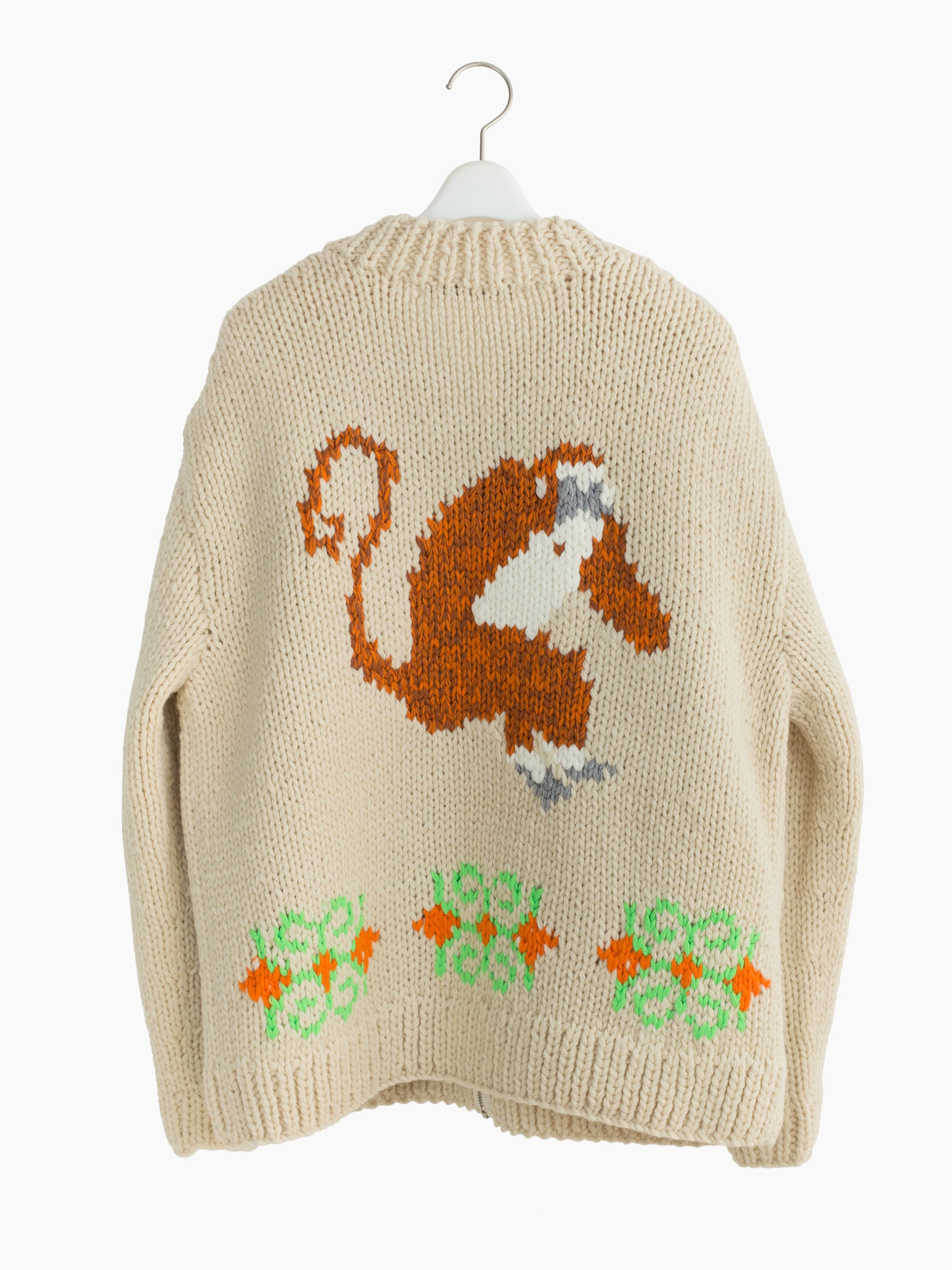 "See no evil, hear no evil, speak no evil," an adage illustrated on this chunky hand-knit Cowichan cardigan. It features a zipper front overlaid with Yi tribe metal parts as a front closure.