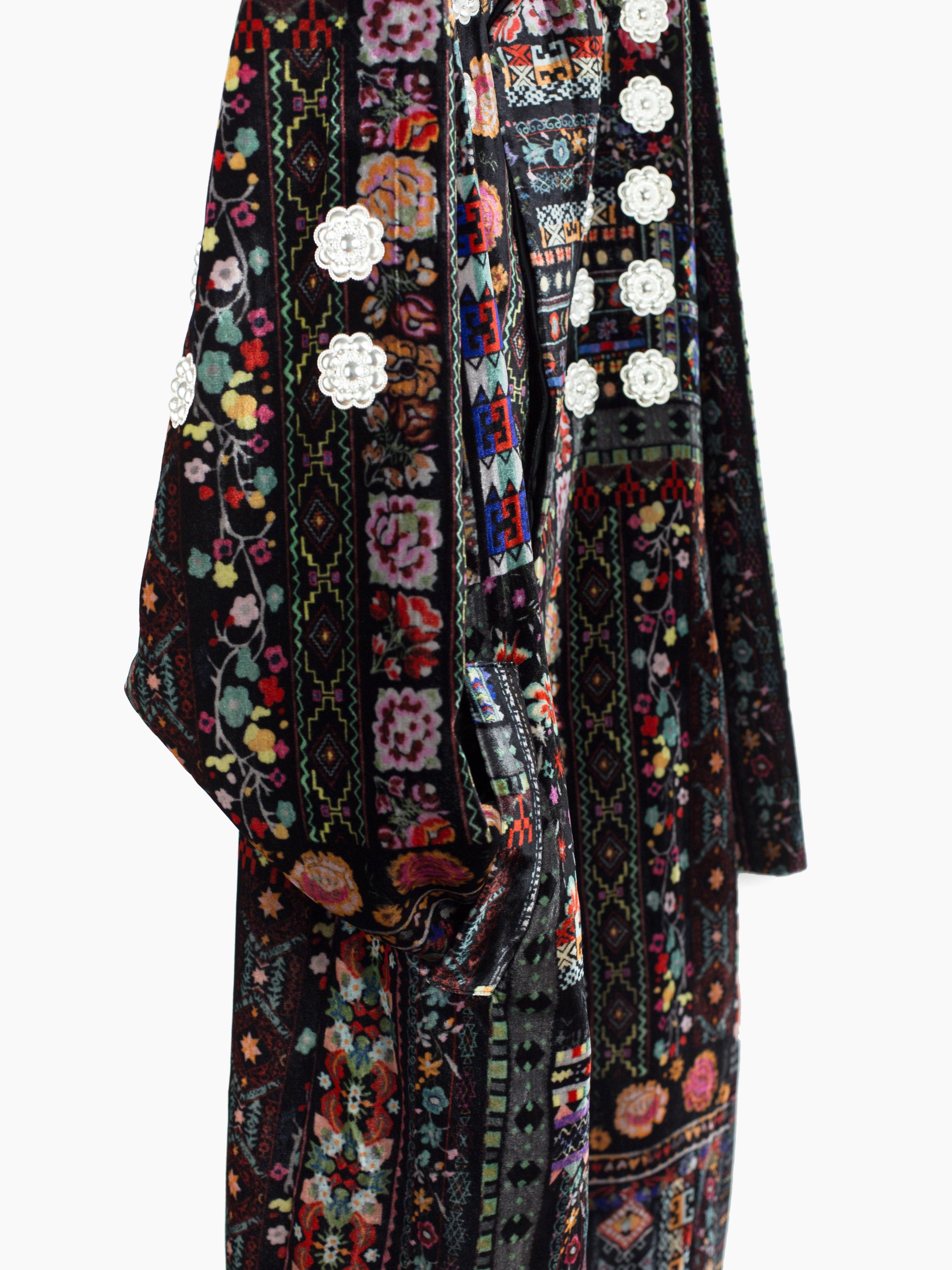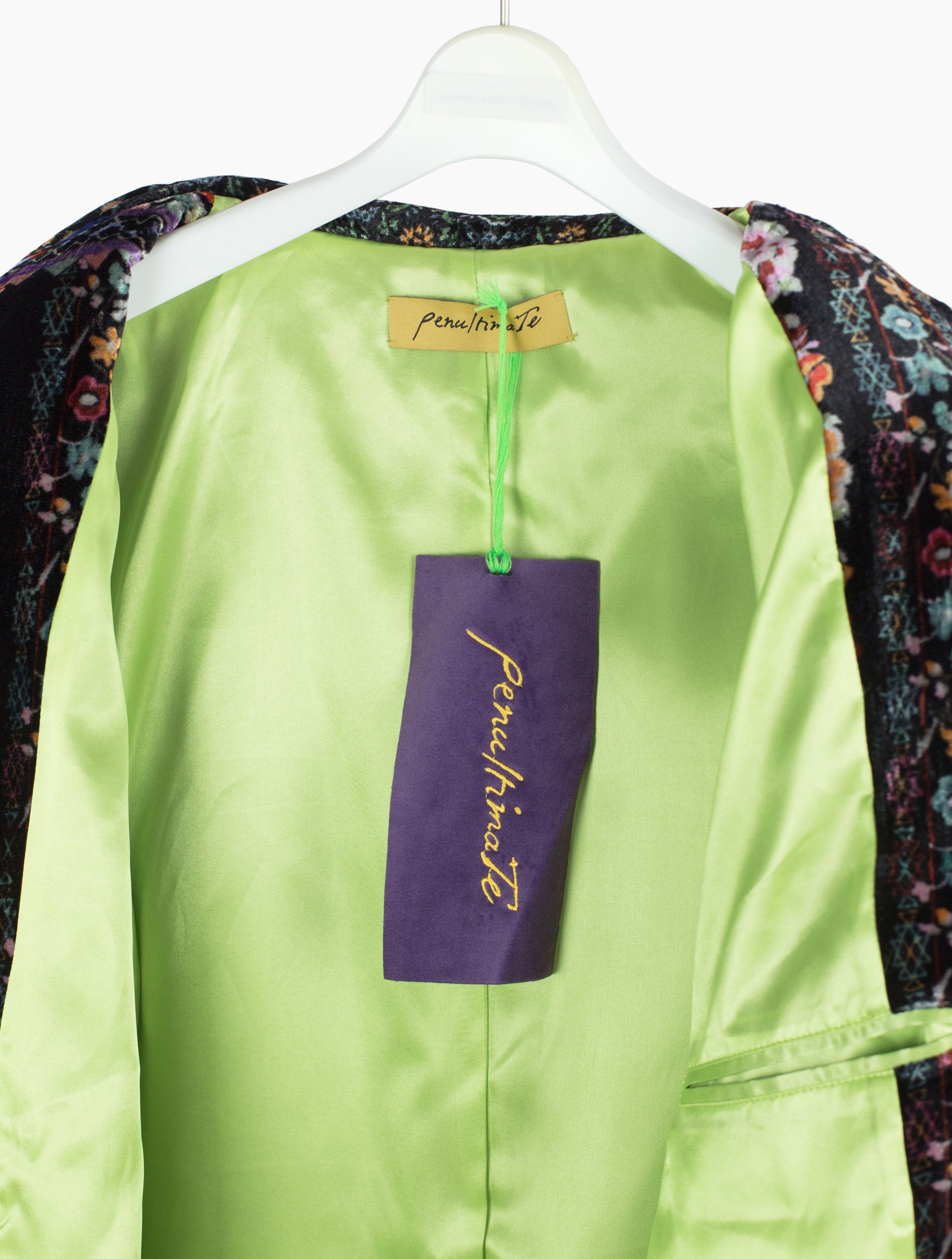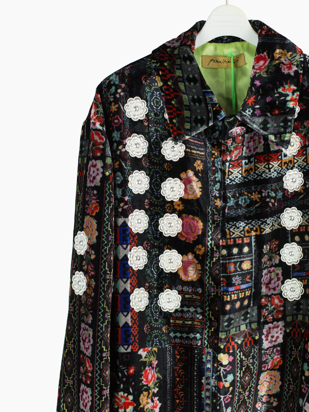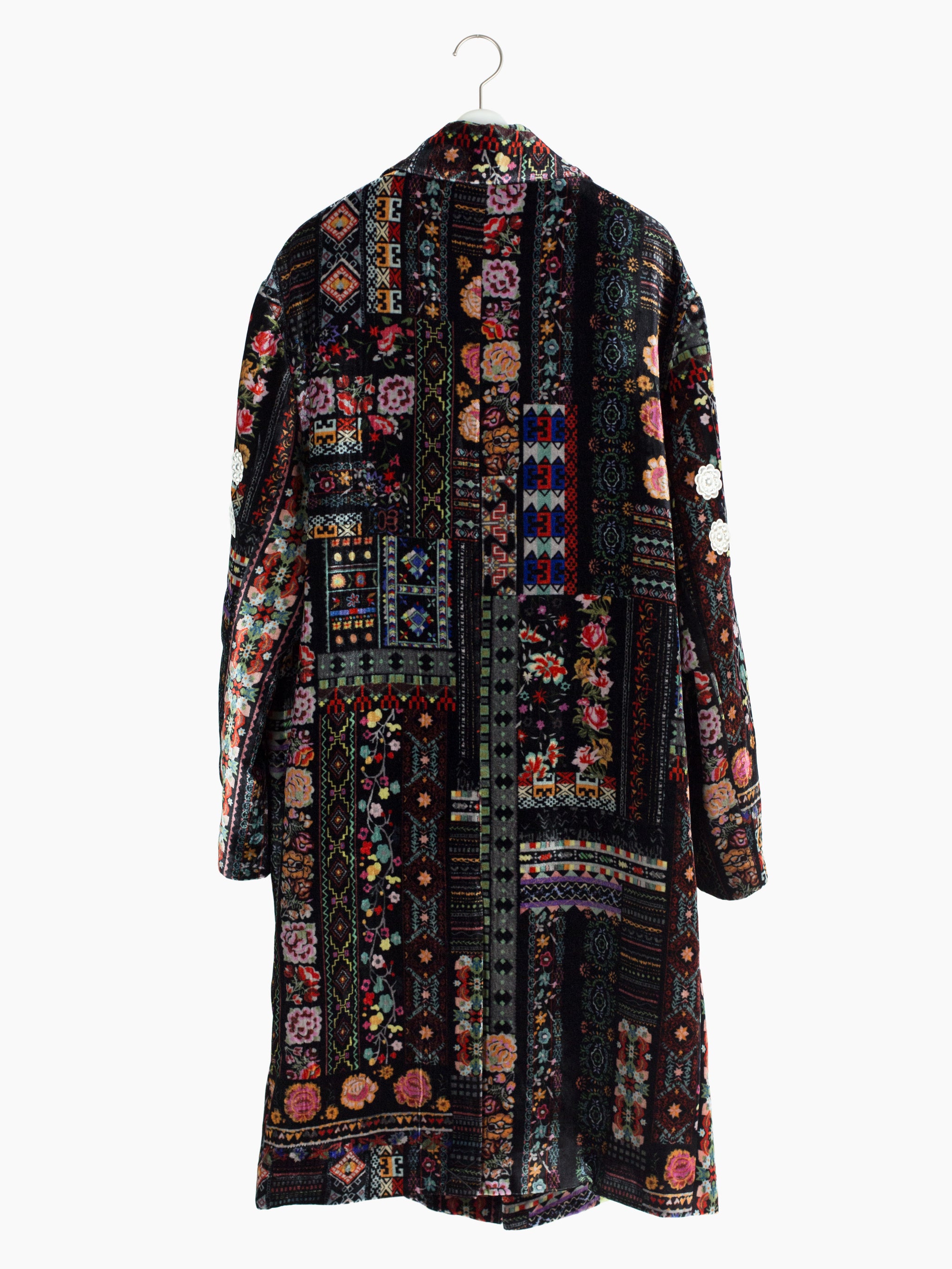 Sweeping long coat with Miao tribe metal plate embellishments, cut in a beautiful, dynamic silk velour with Chinese ethnic patterns that are derived from designer Xiang Gao's extensive visual research. Tradition here is reincarnated, cut in a contemporary mac coat shape with oversize shoulders and a supple, fluid drape. The slight sheen of the pile velour creates a glinting and glowing effect when light hits the coat at different angles, introducing a dynamic quality--almost like the fuzzy speckled glow of a metropolitan city sweeping by through the window of a car or through the eyes of a stumbling, bewildered partygoer. Past meets present in a psychedelic flurry in Penultimate's 'After Party.'