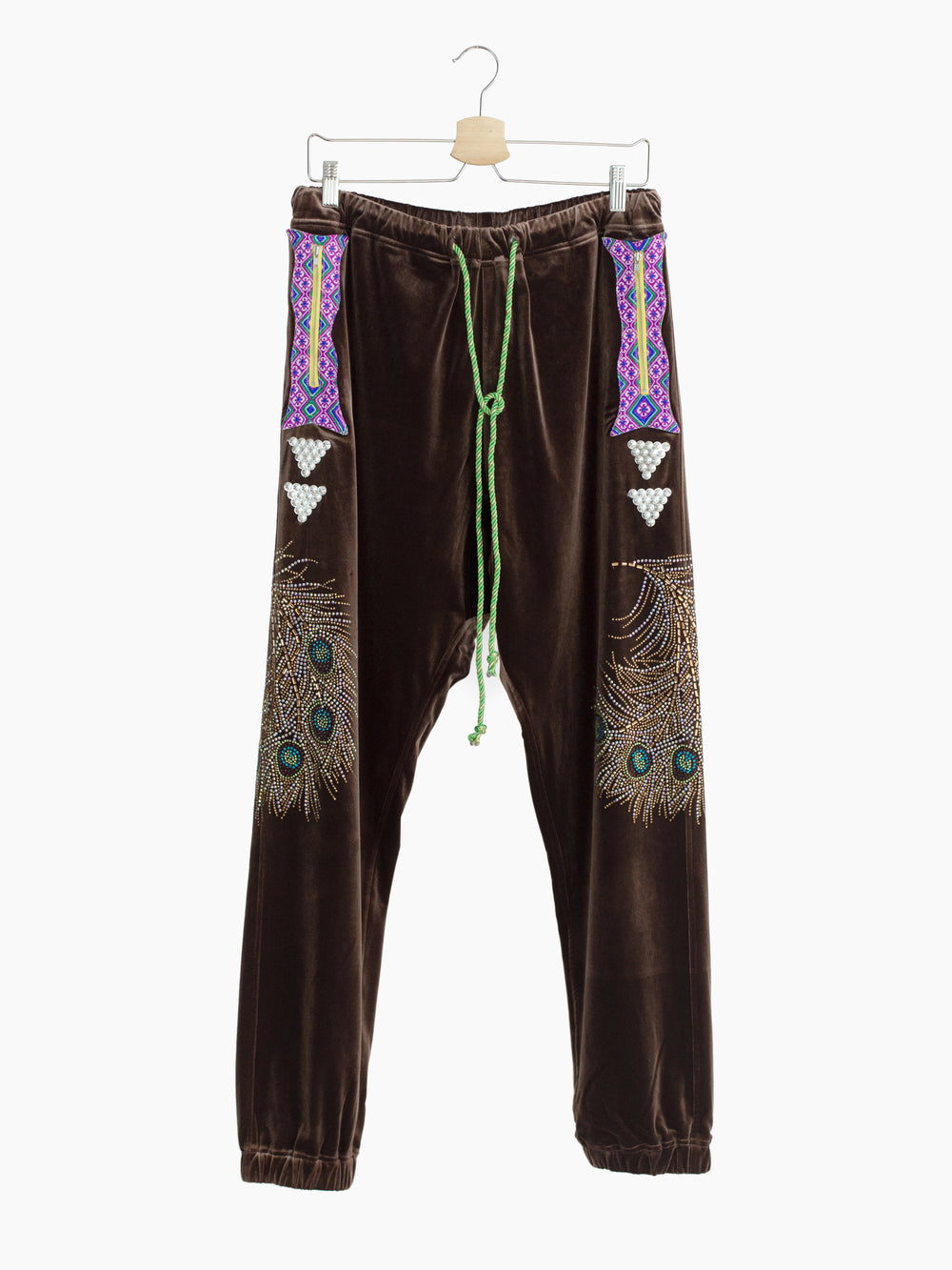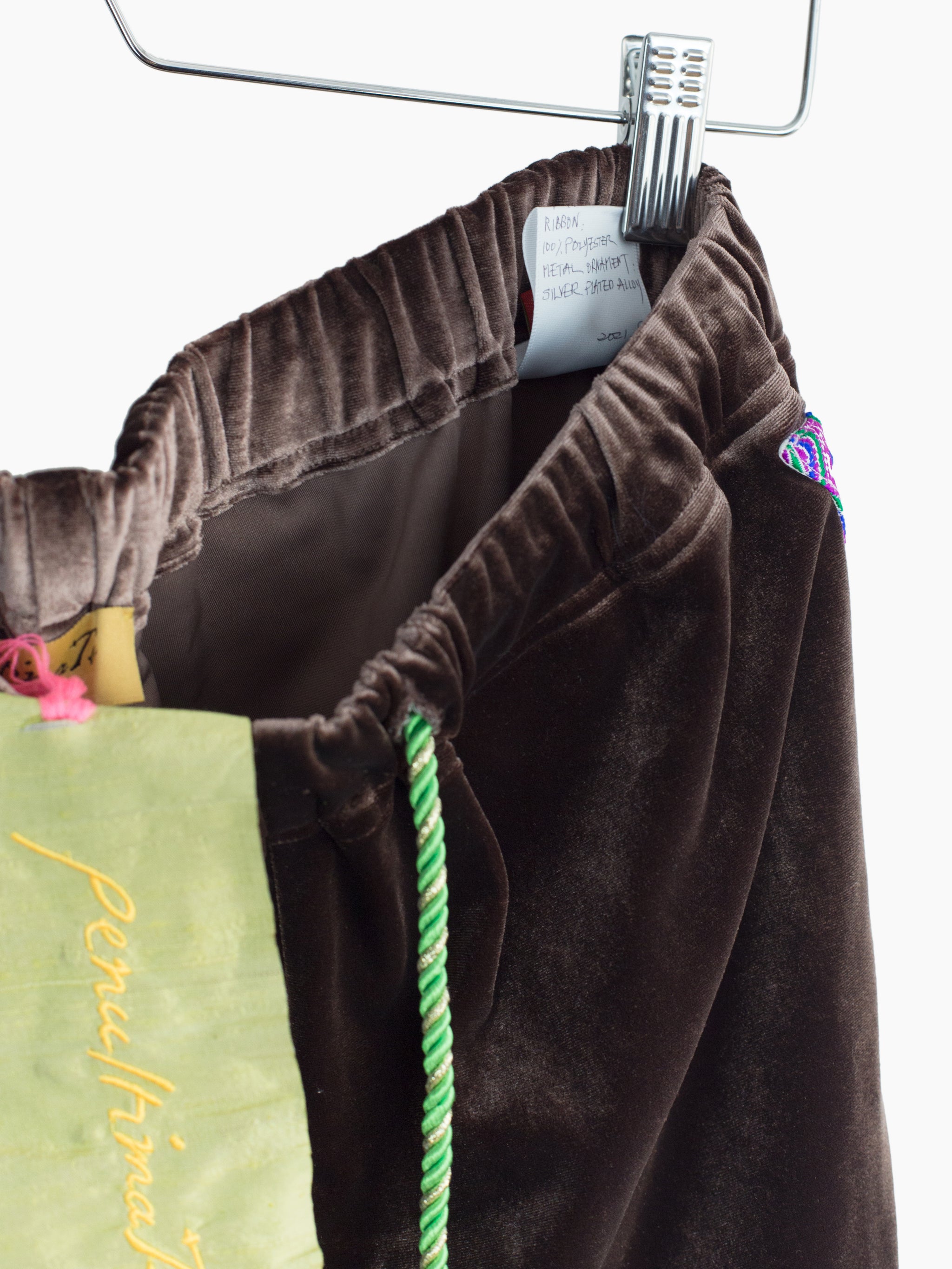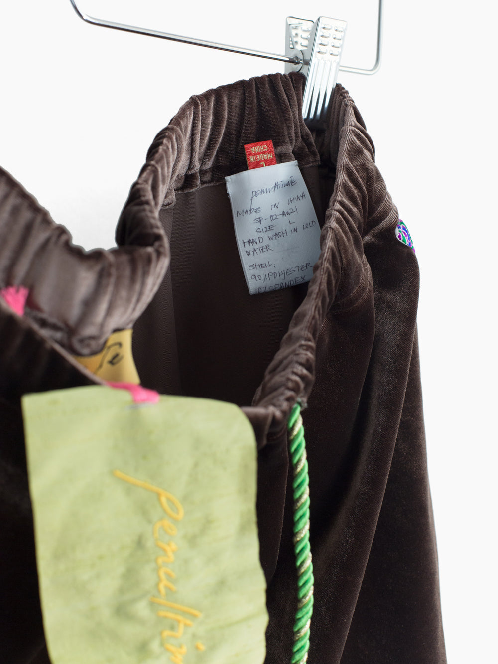 Fluid velour texture points towards both early 2000s Juicy Couture Trashiness and traditional yi tribe ceremonial garb--Penultimate explores this cultural crossover, synthesizing both with extensively researched material, form, and detailing choices to create a contemporary fusion that mixes histories, formalities, and visual cultures into something completely new. Here, the seasonal track pant is cut in a heavy, dense polyester velour that drapes like silk. The interior face has an elastic snap and luxurious, cool hand you would expect from a cupro lining fabric.