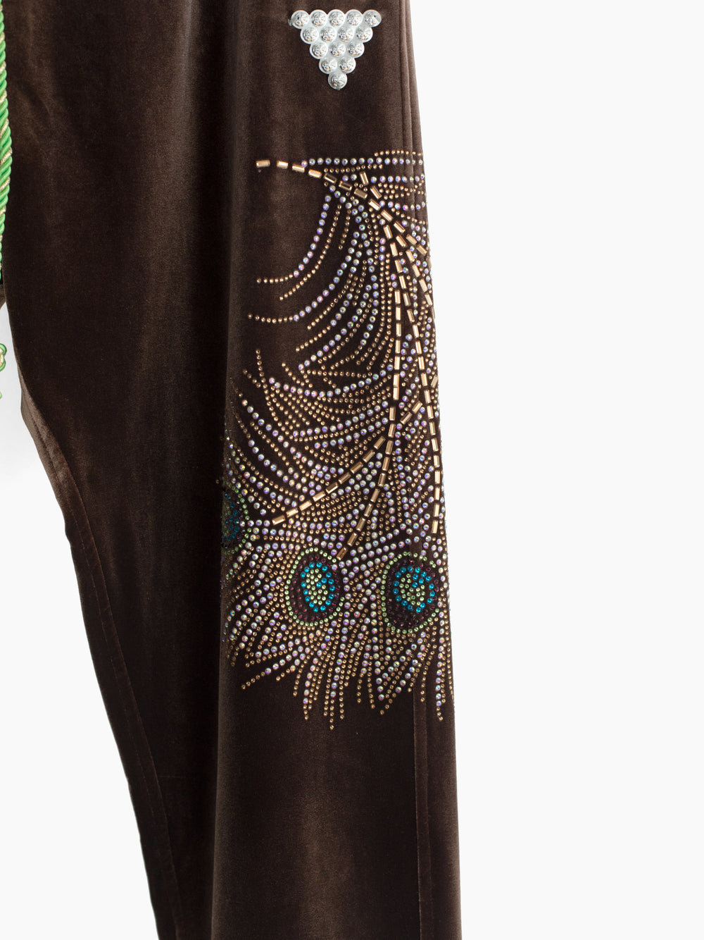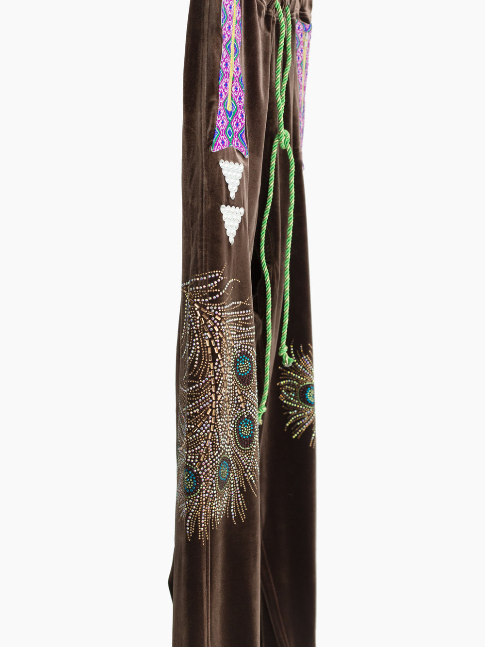 Finished with contrast green drawstring tie, miao tribe metal plate detailing, peacock rhinestone applique, and ethnic ribbon trim at zippered waist pockets.