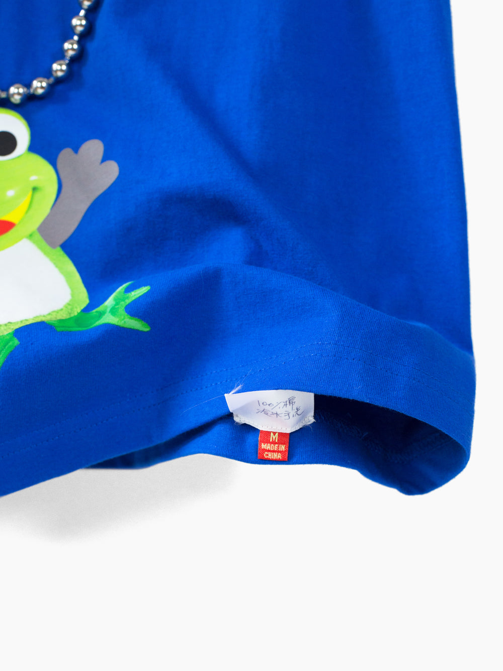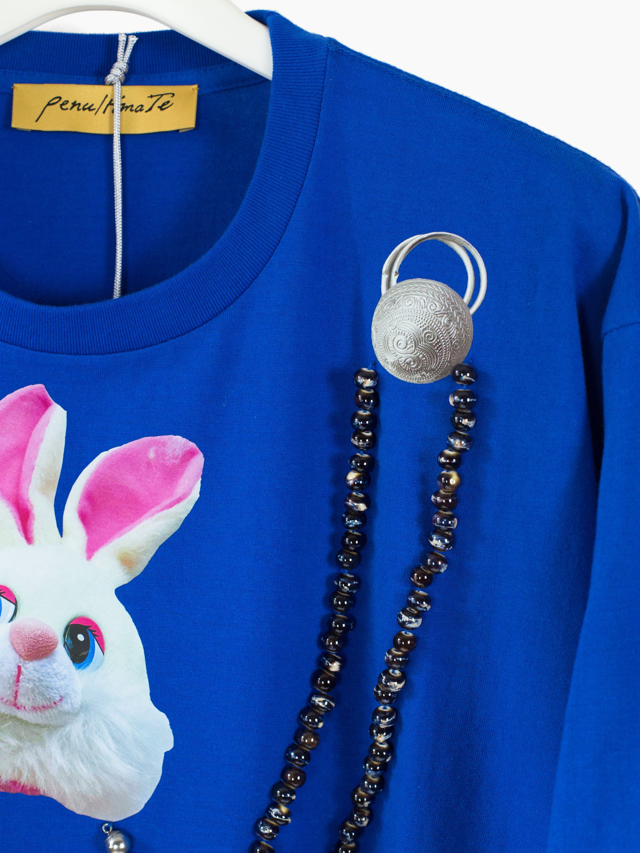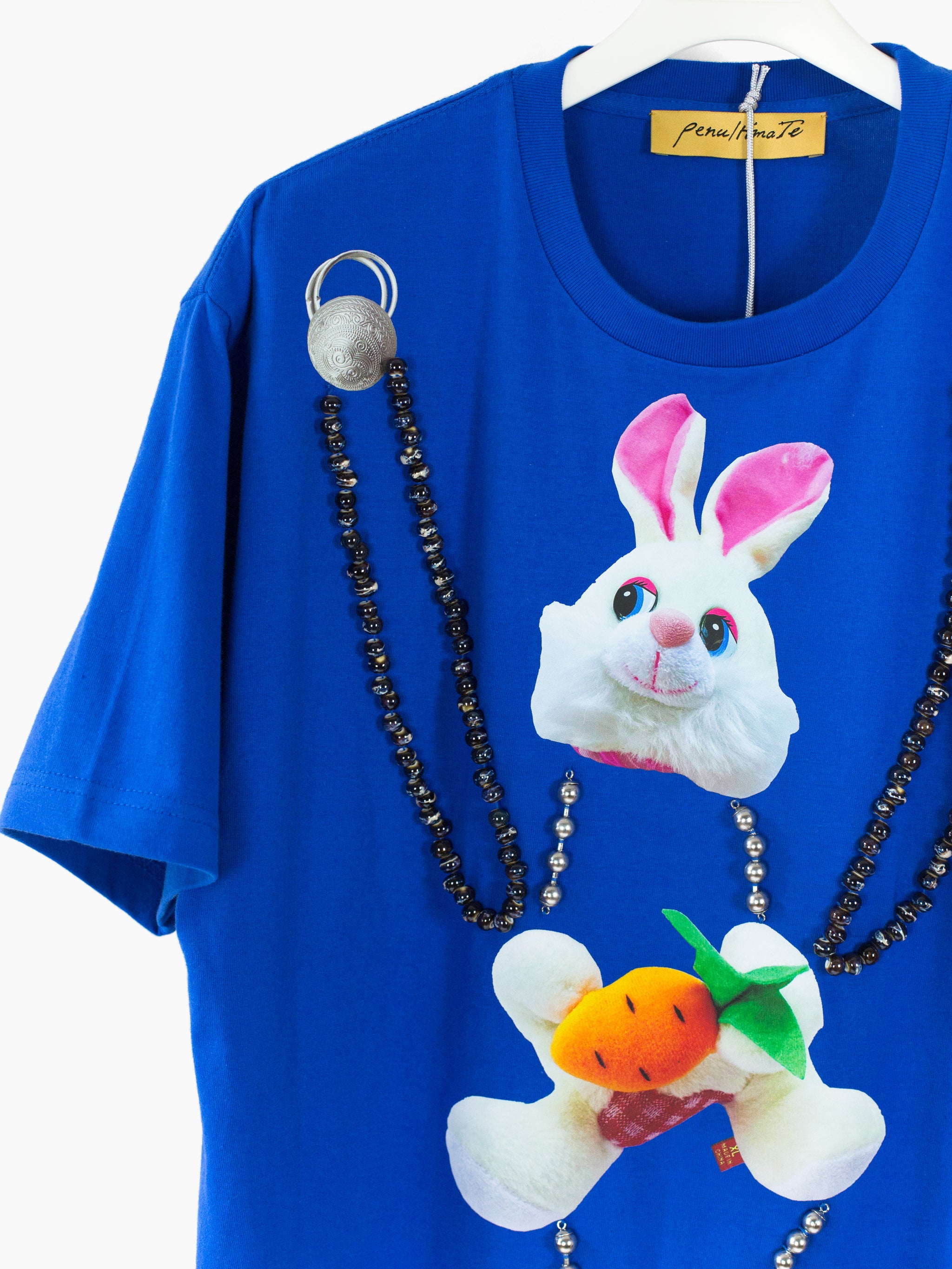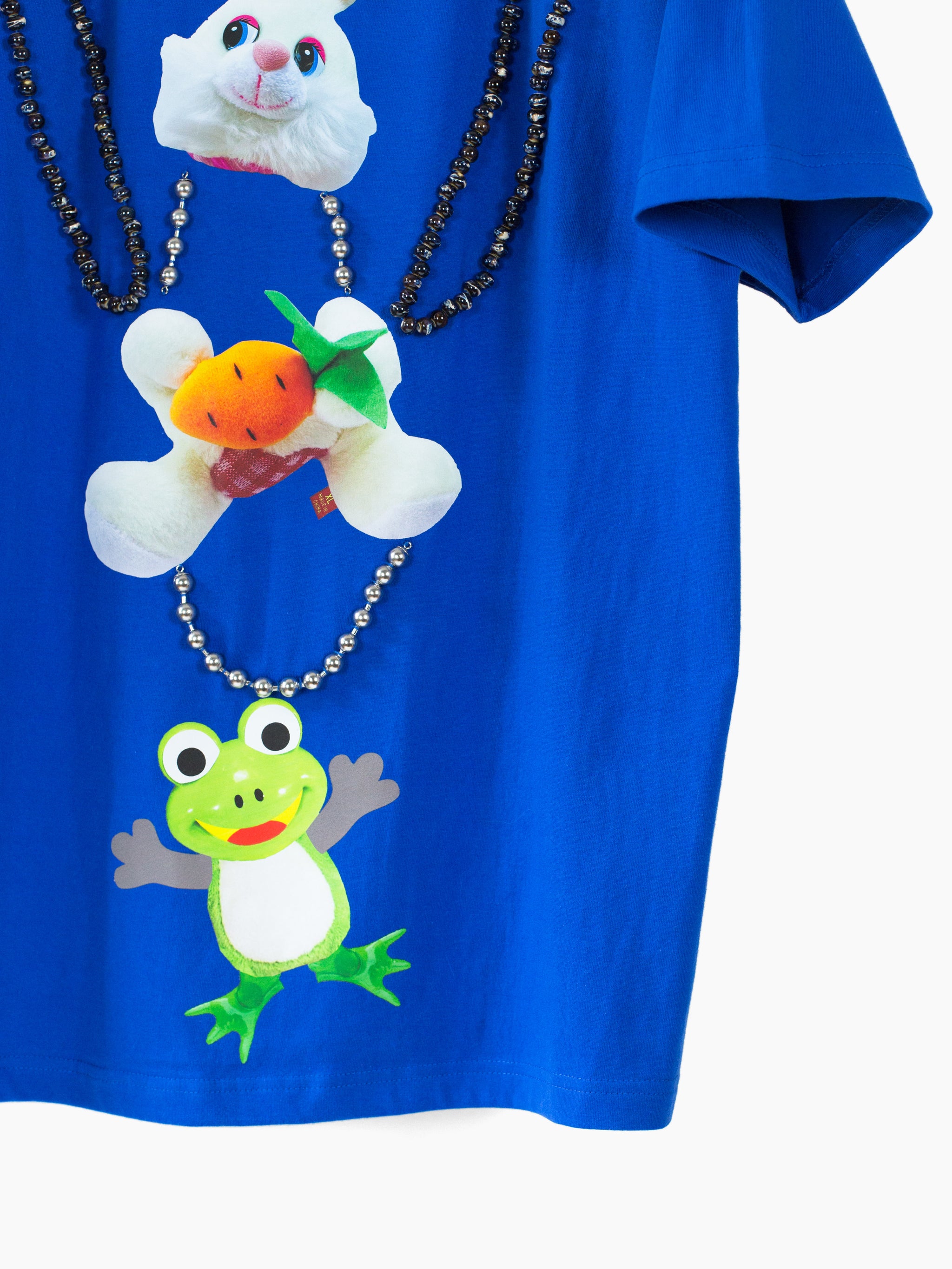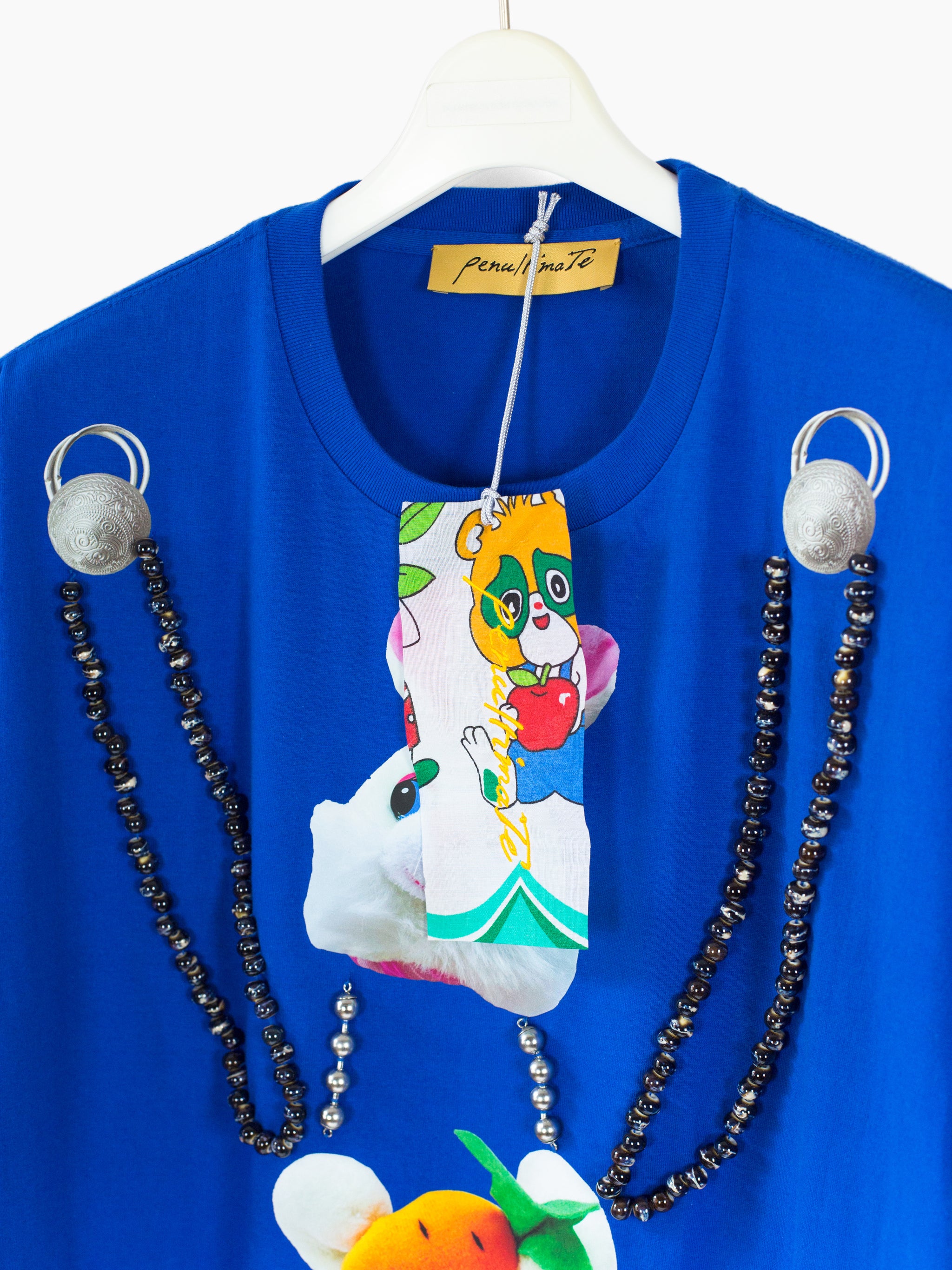 T-shirt with seasonal 'Chinese Toy Story' hand-cut vinyl print graphics, with traditional beaded chains forming a trompe l'oeil 'necklace' that encircles the toys. Composition mimics the actual chandelier toy necklaces that served as centerpieces for the lookbook.